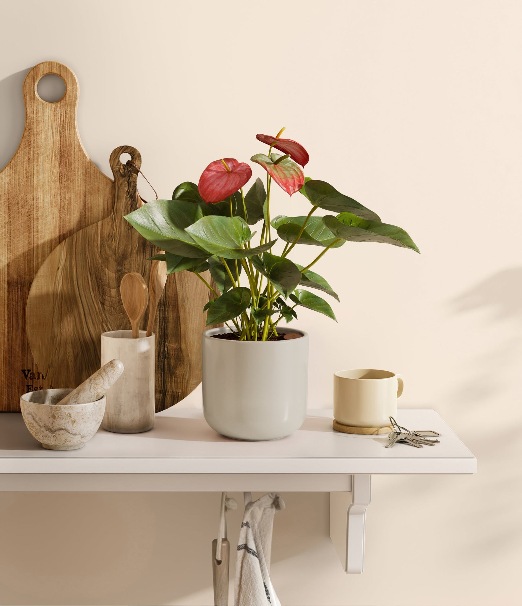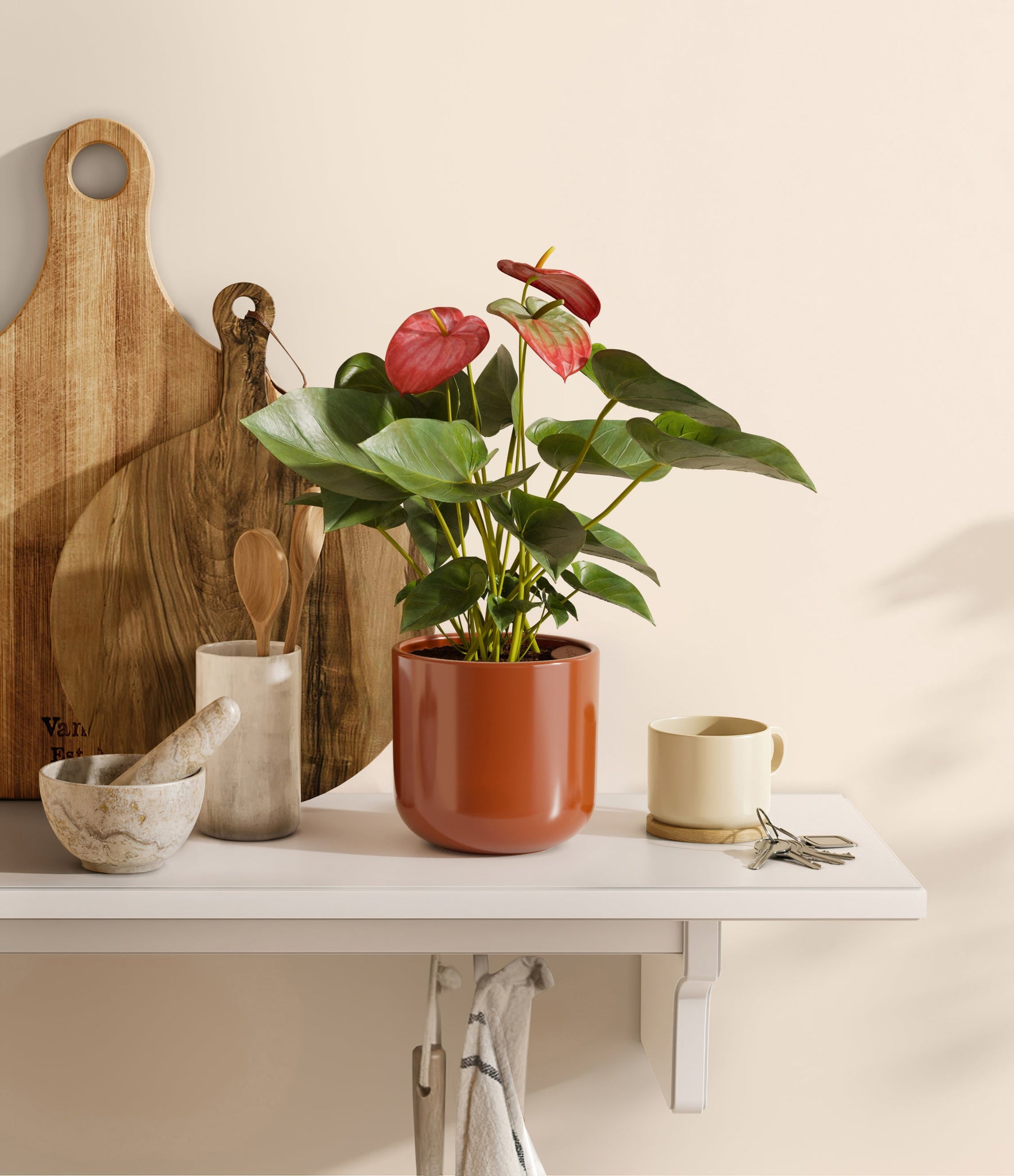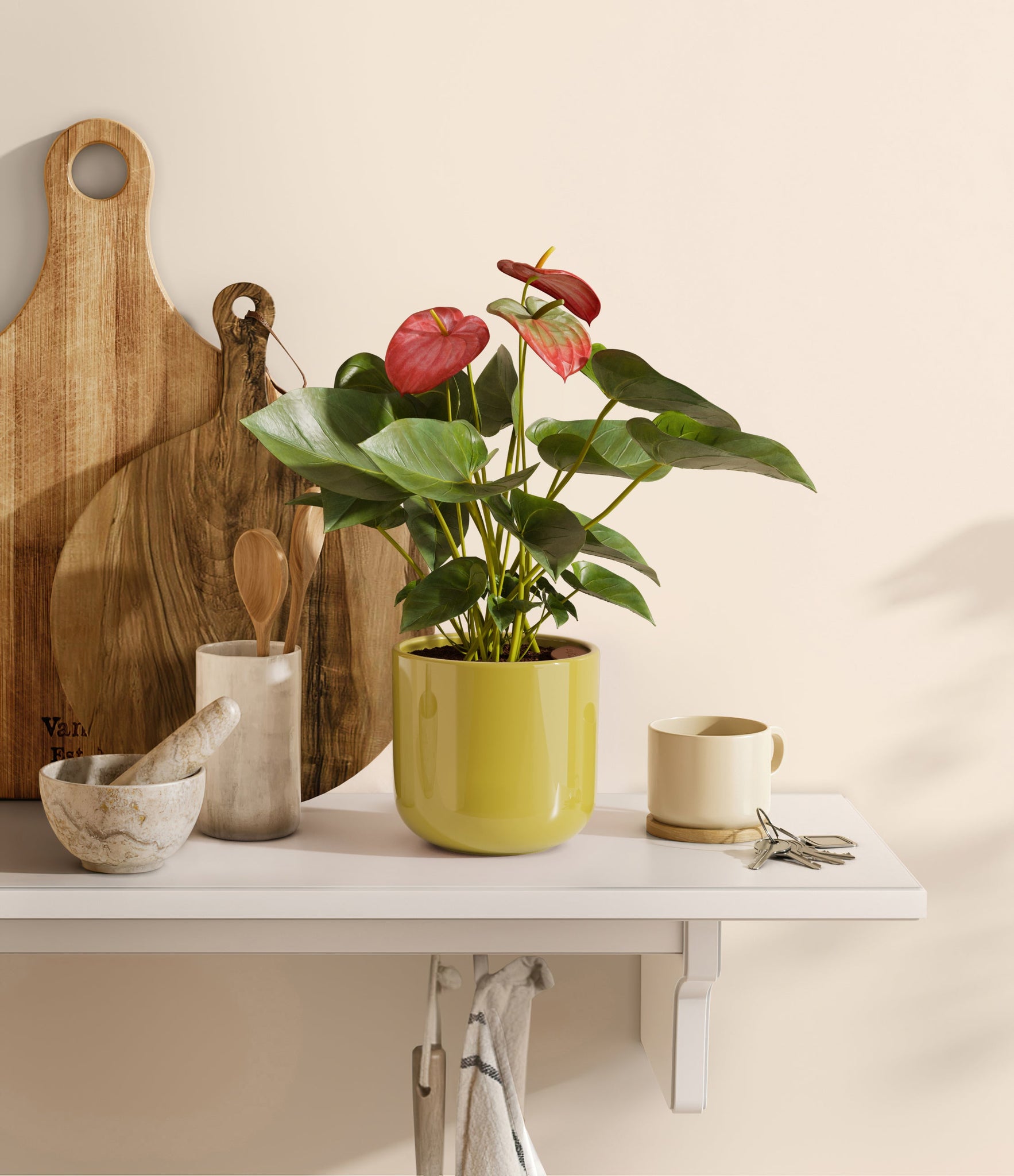 Native to the Americas and Caribbeans, this tropical evergreen beauty brings out the best and brightest in any space it inhabits. The colorful heart-shaped waxy leaves, called spathes, act as protectors for its straight spike, called spadix, where very small flowers grow in its bloom. Thanks to its long-lived, heart-opening charm, Anthurium is the quintessential symbol of generosity and kindness, making it a perfect gift for those you love the most. It is cherished for its long blooms, lasting anywhere from eight to twelve weeks.