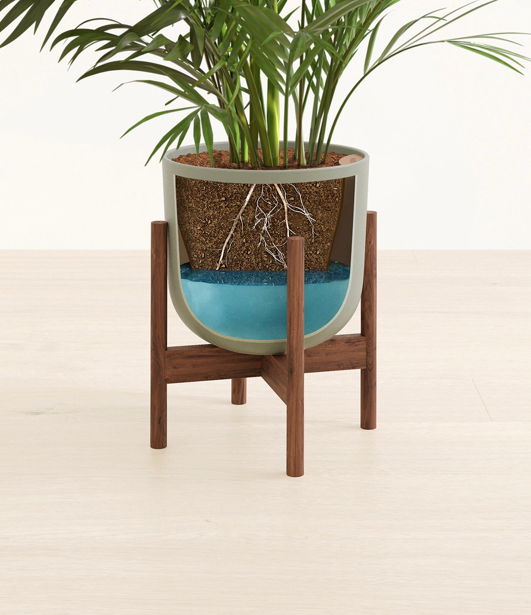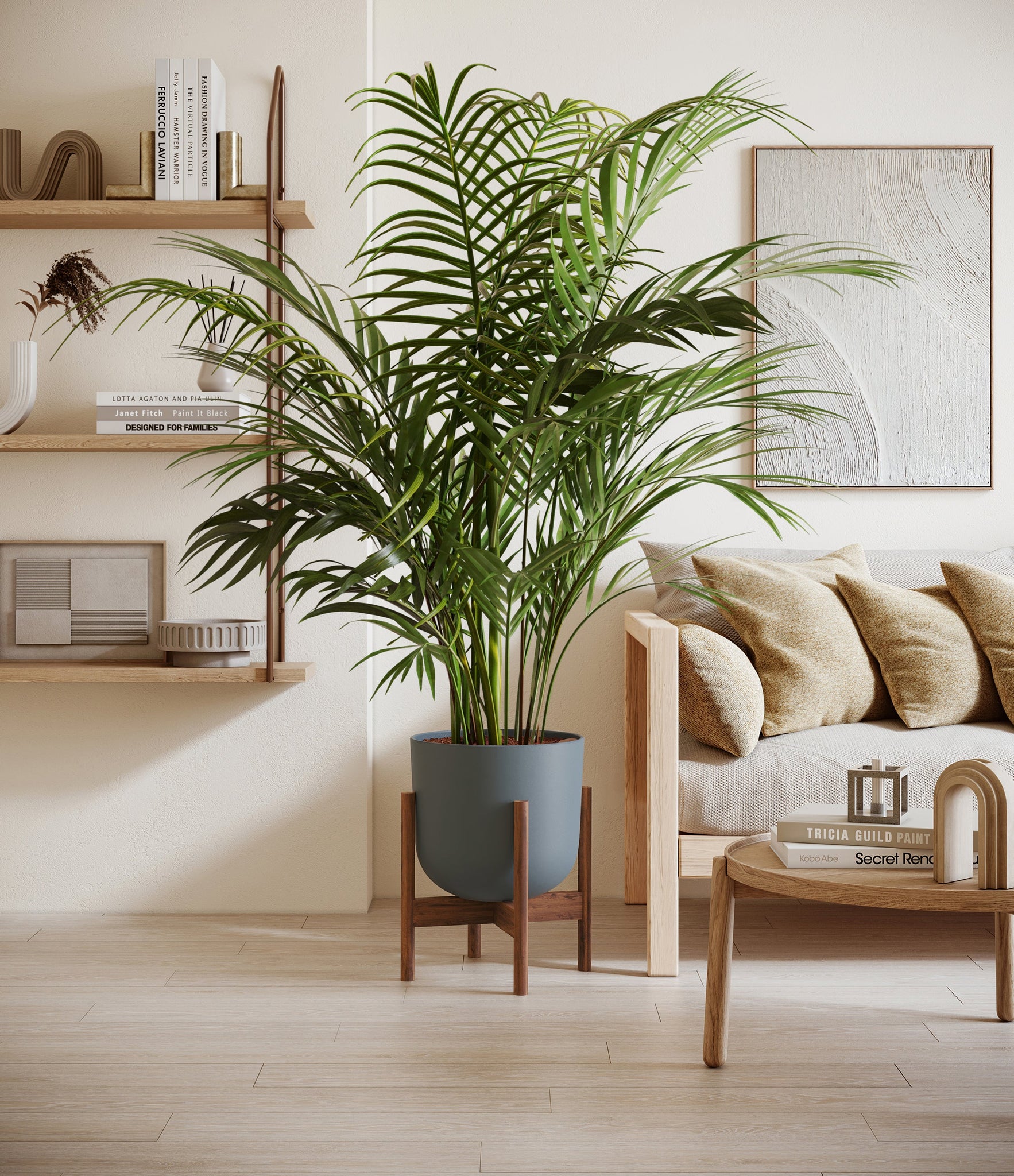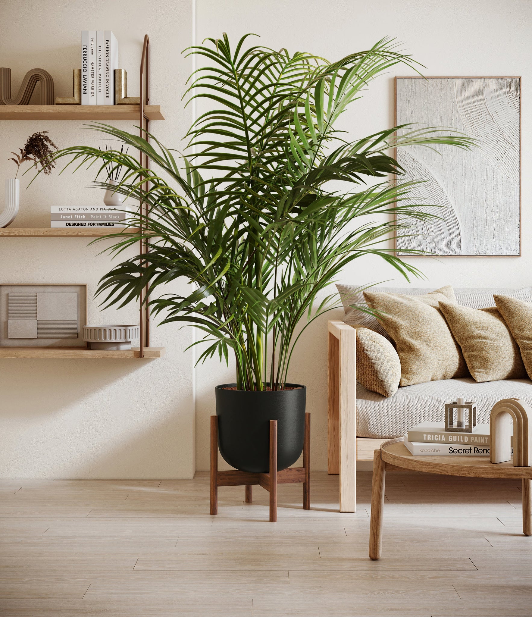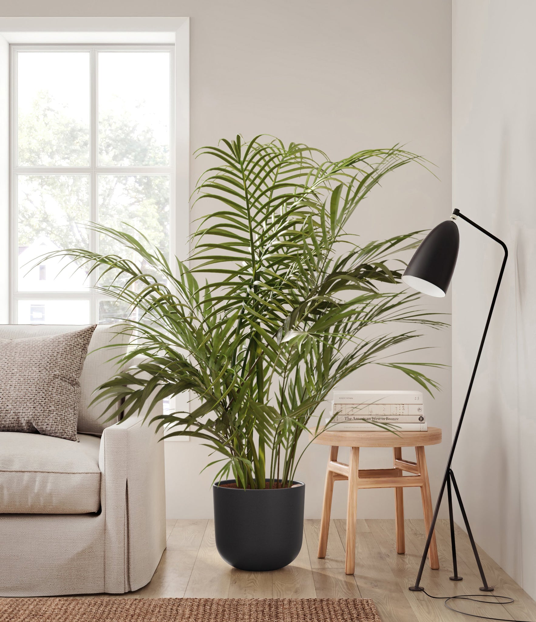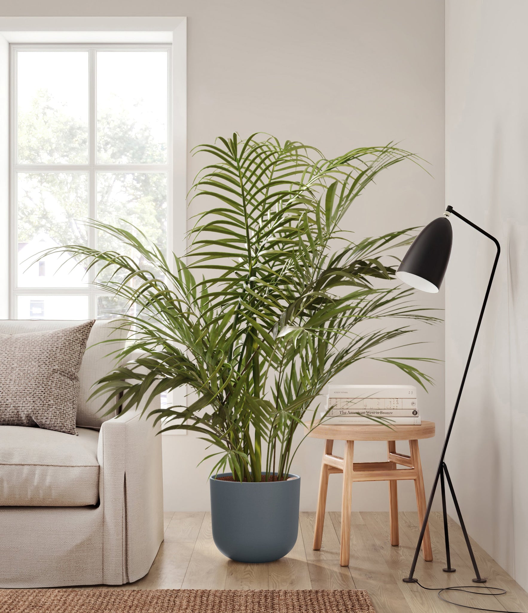 Potted in a premium quality self-watering pot with a soft matte finish, the Areca Palm is a slow to moderate-growing plant that can reach ten feet indoors and up to 35 feet outdoors.