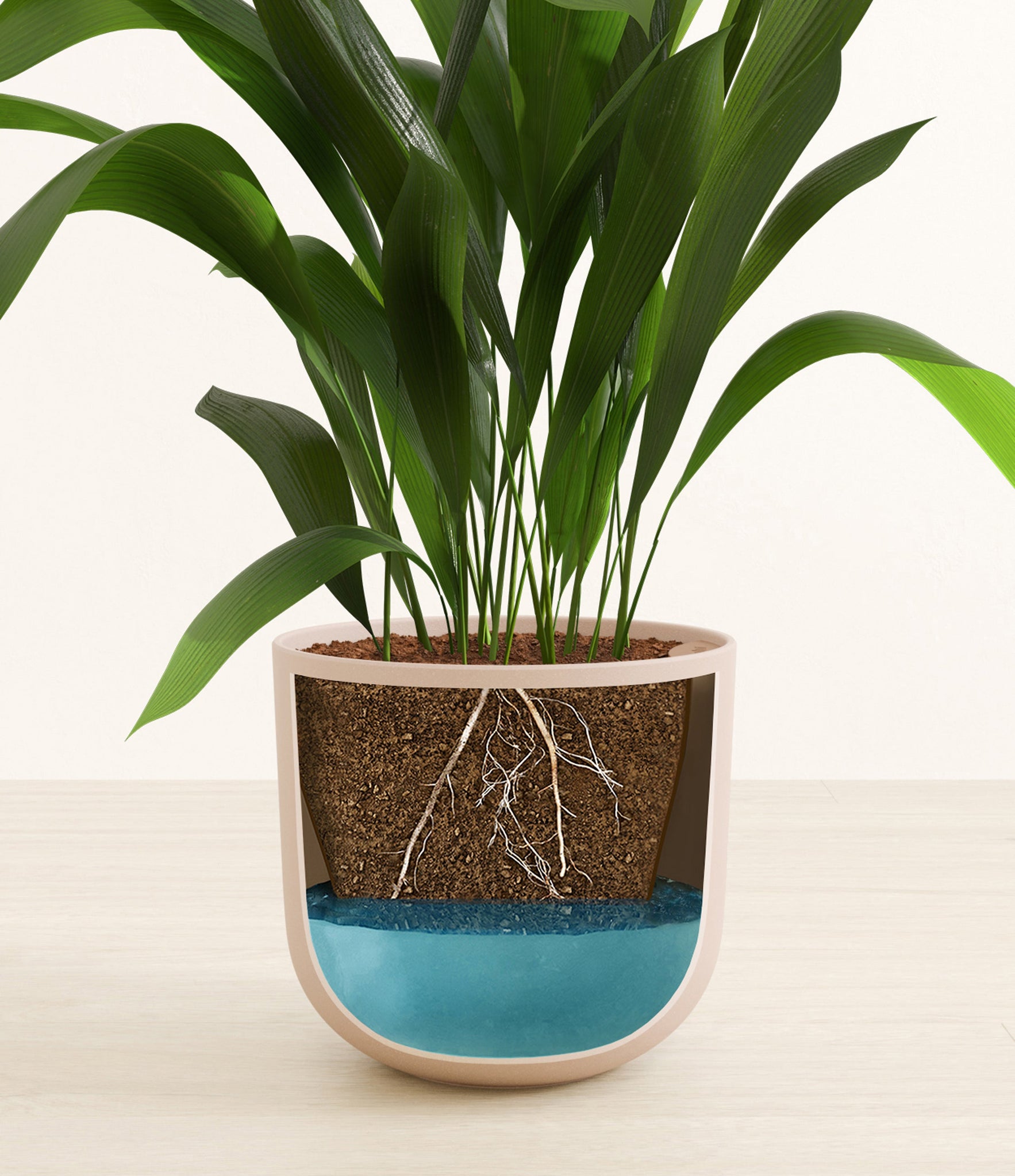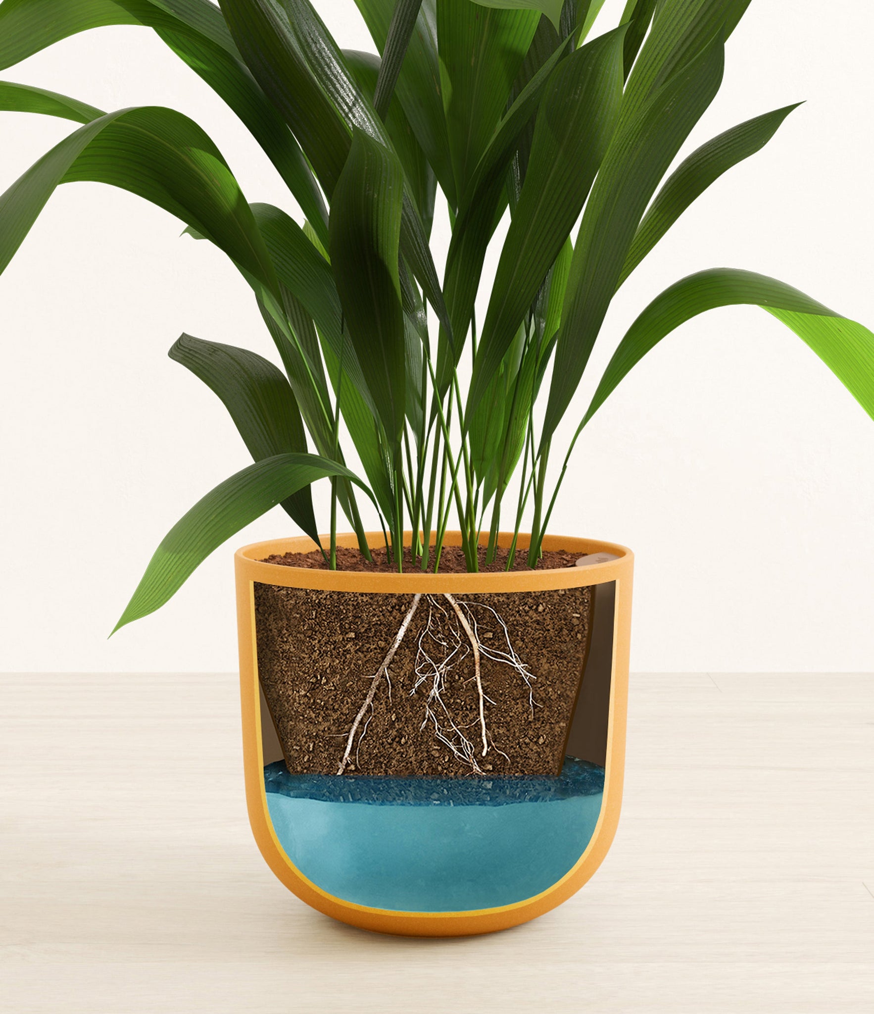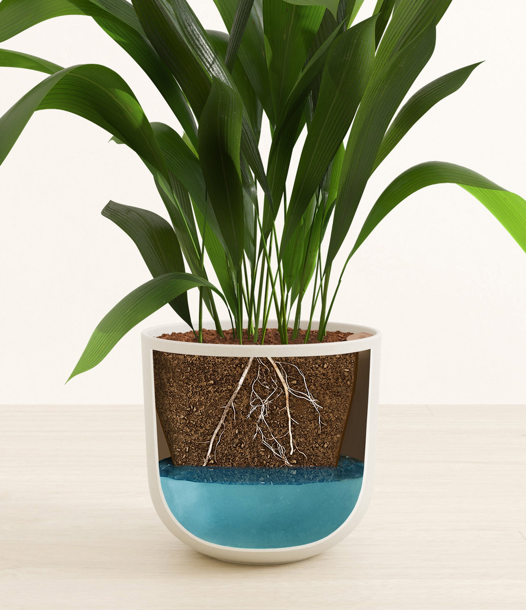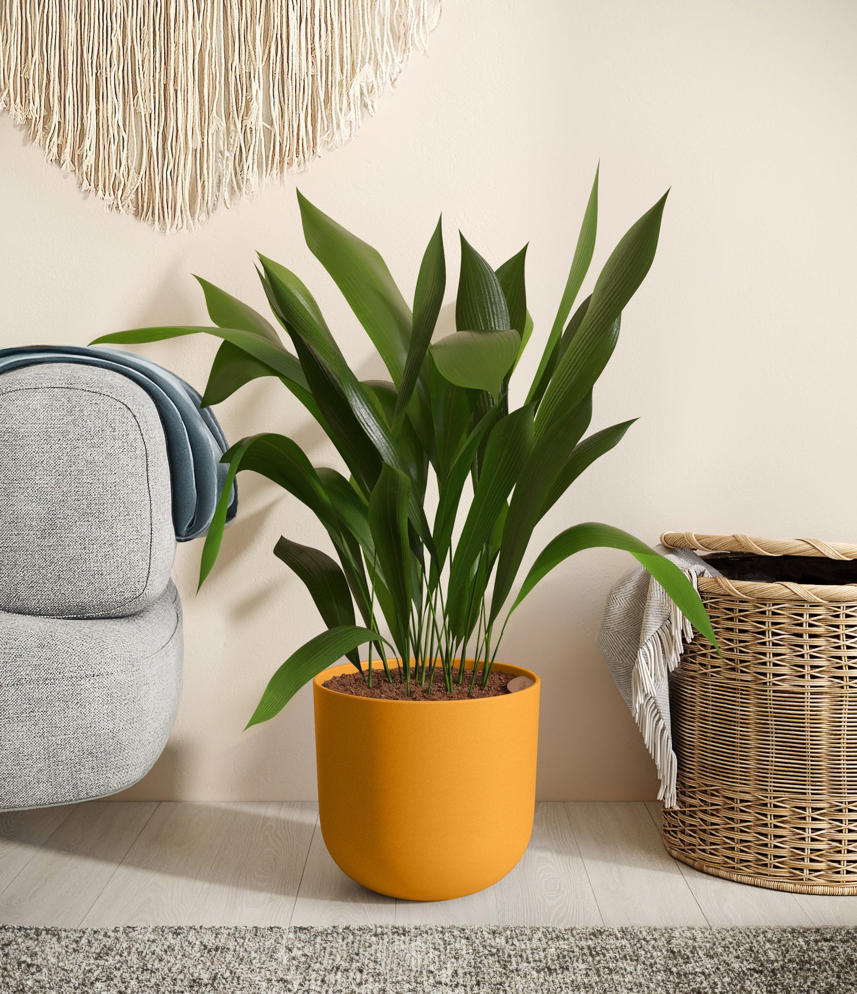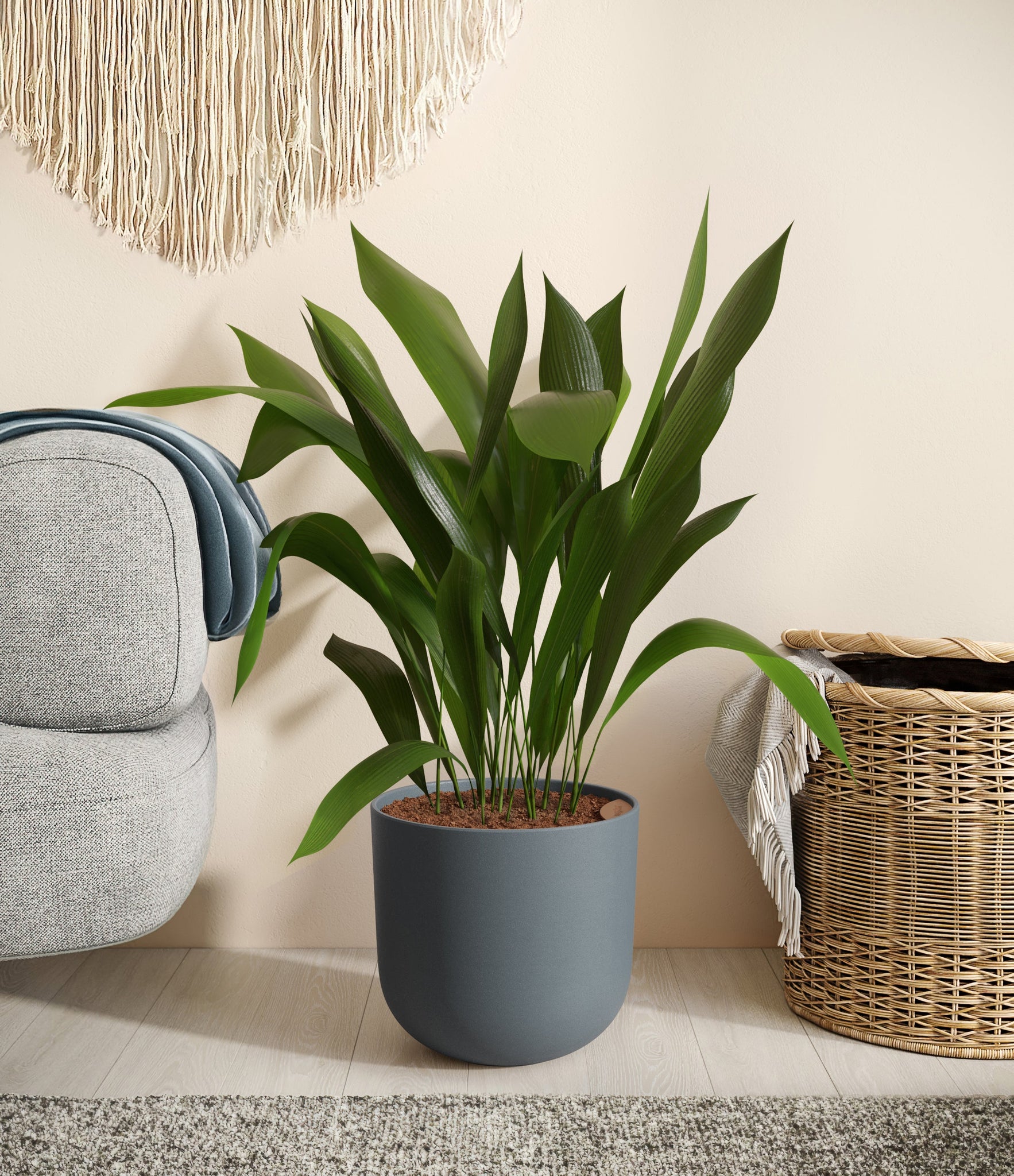 Potted in a premium quality self-watering pot with a soft matte finish, this exquisite plant can grow up to 3 feet tall indoors, and its leaves can reach up to 2 feet long.