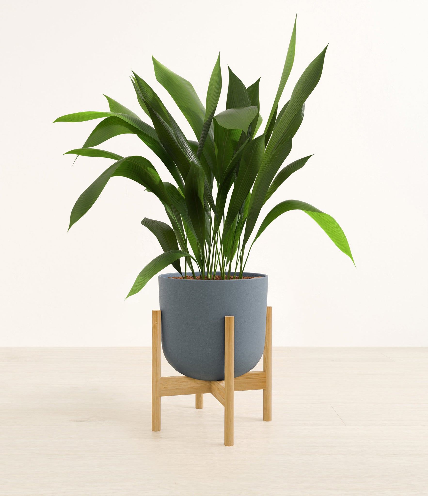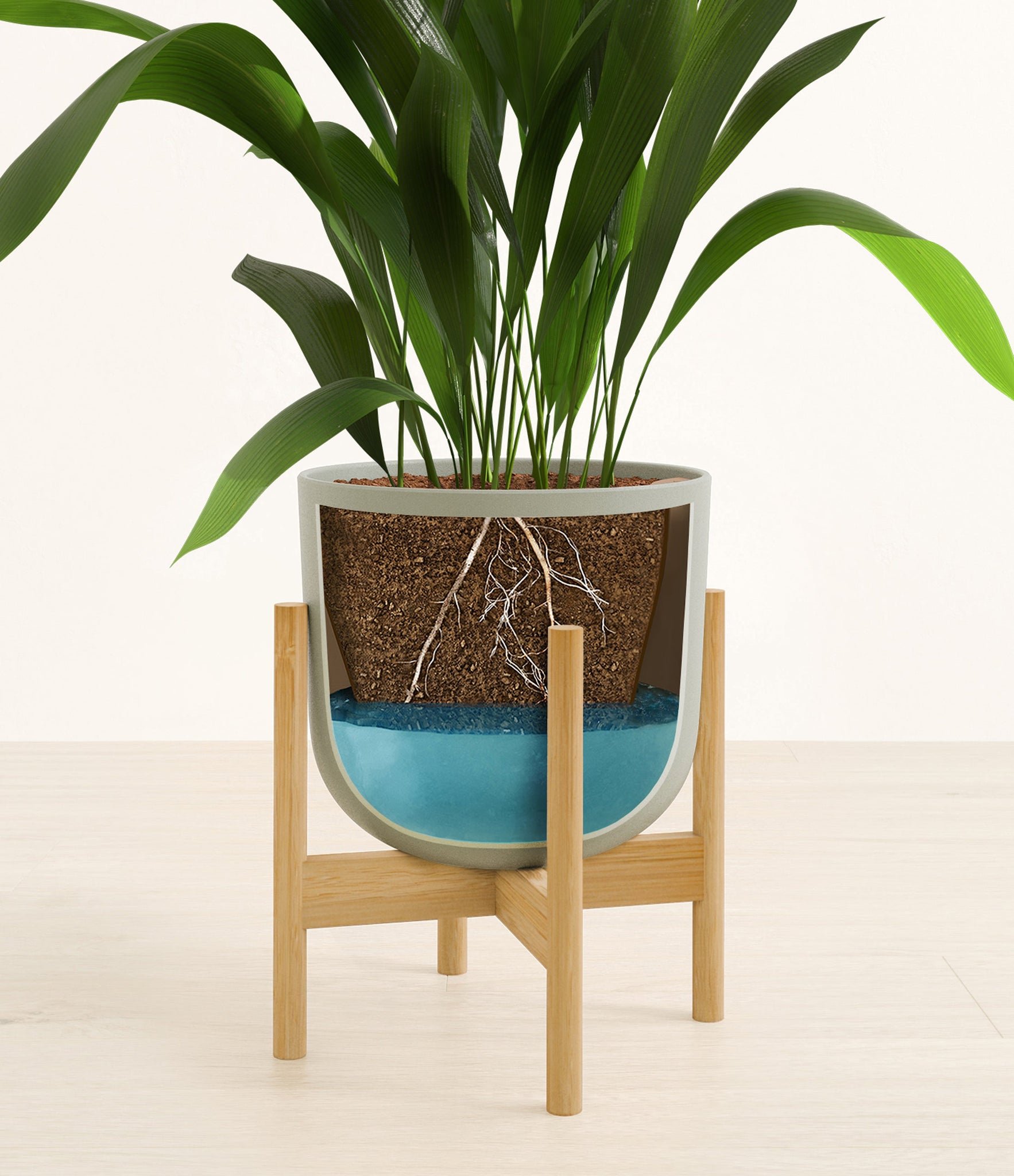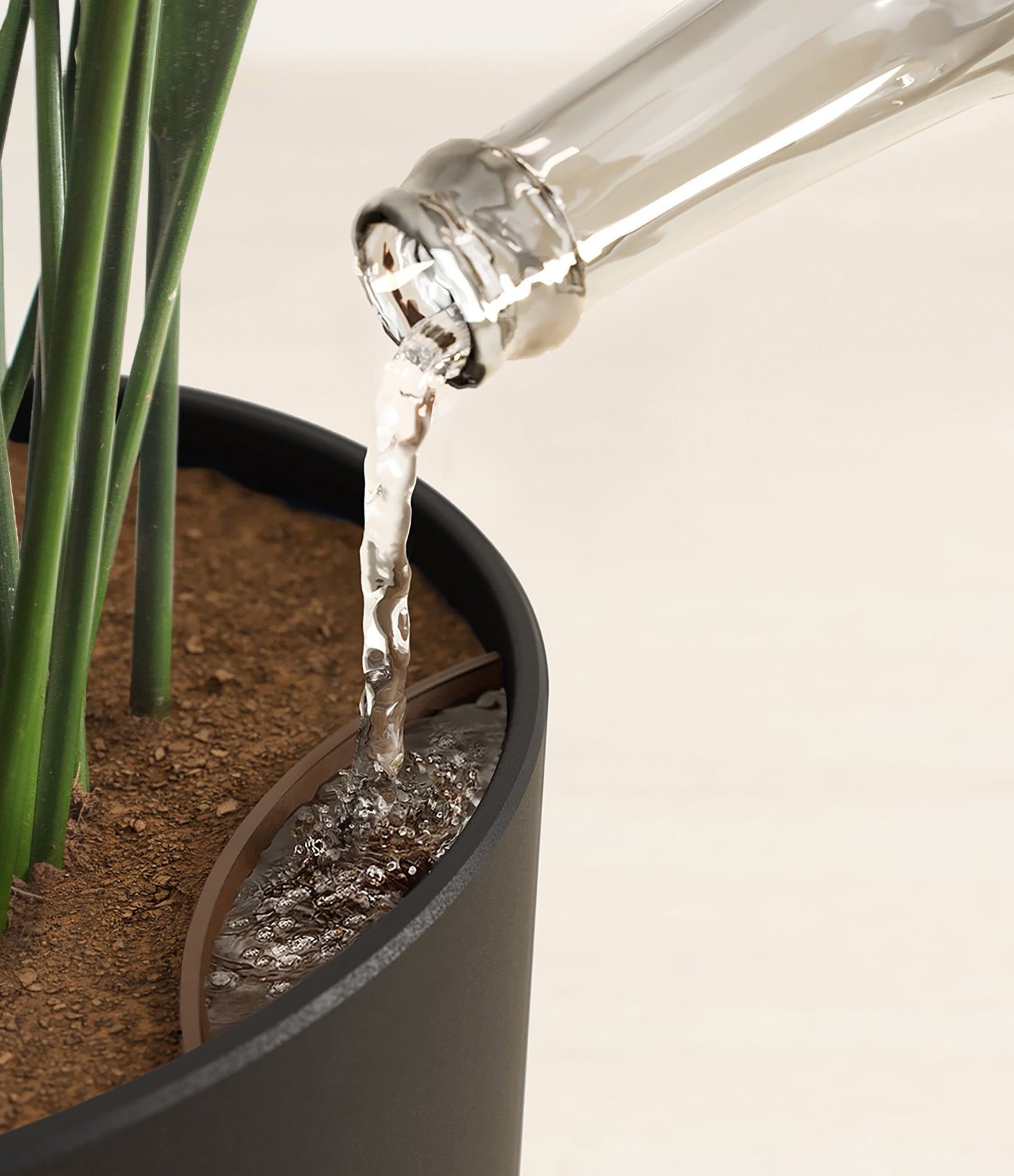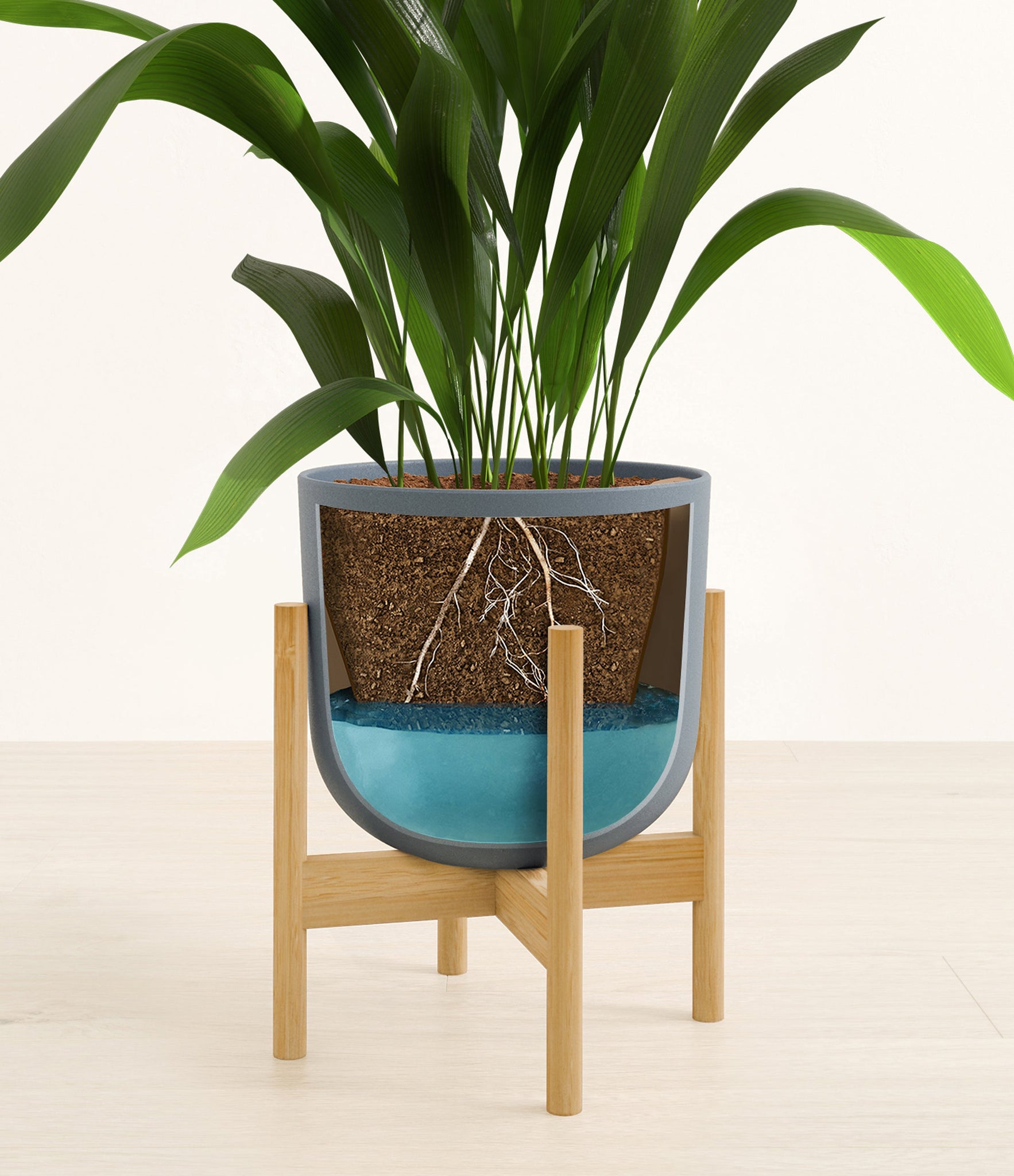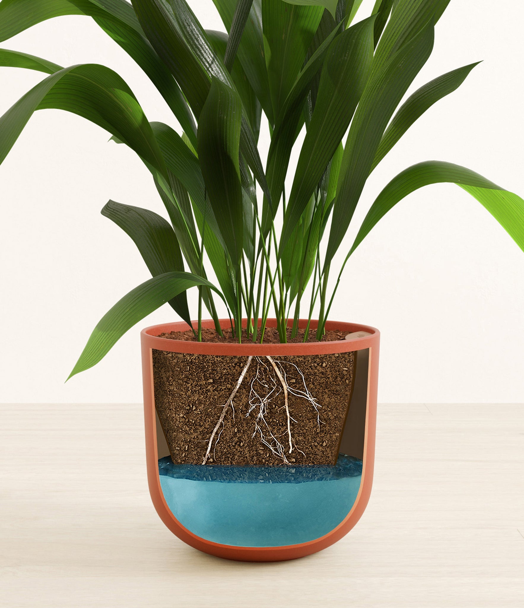 Potted in a premium quality self-watering pot with a soft matte finish, this exquisite plant can grow up to 3 feet tall indoors, and its leaves can reach up to 2 feet long.