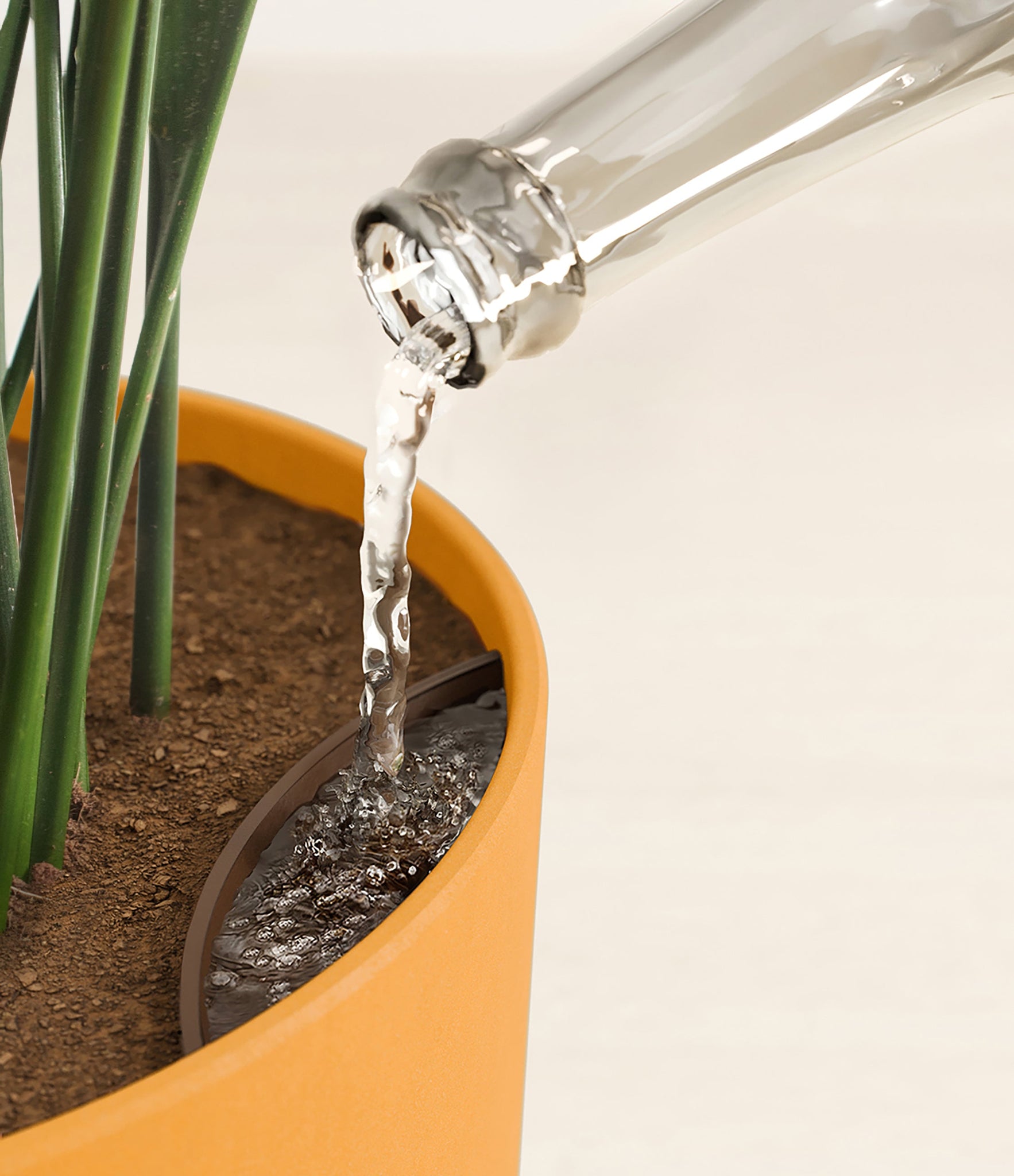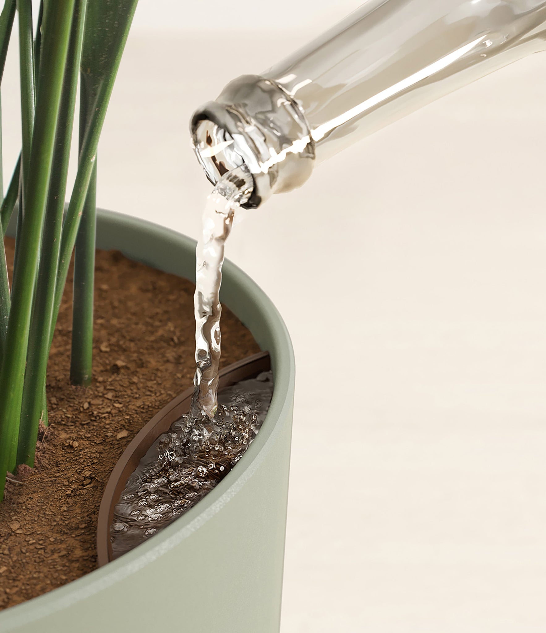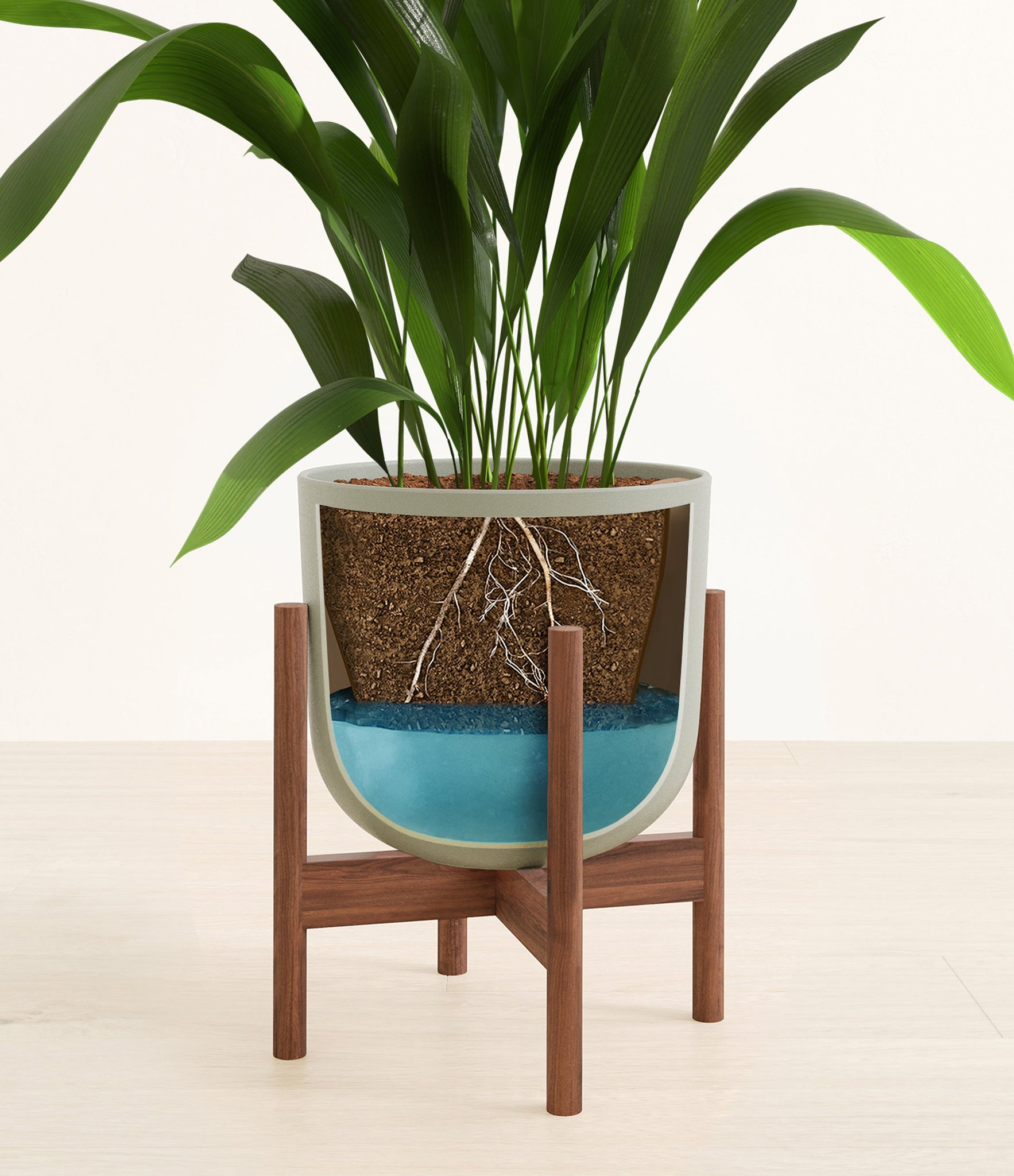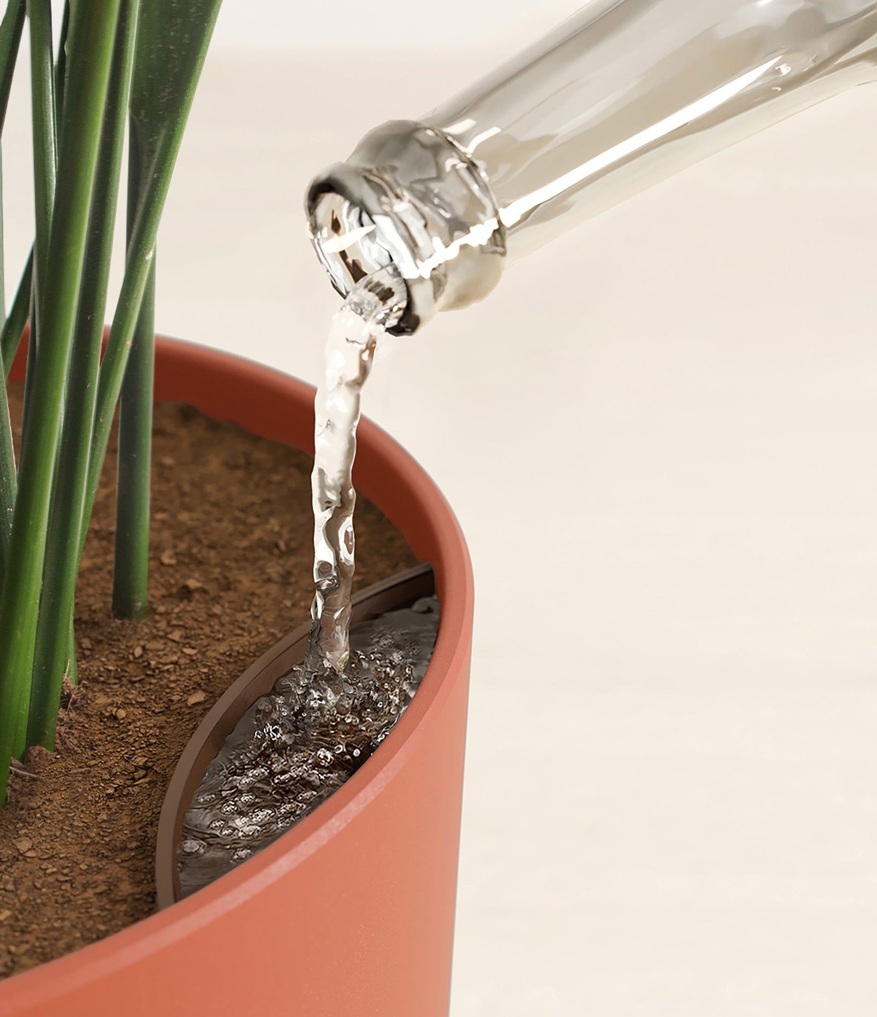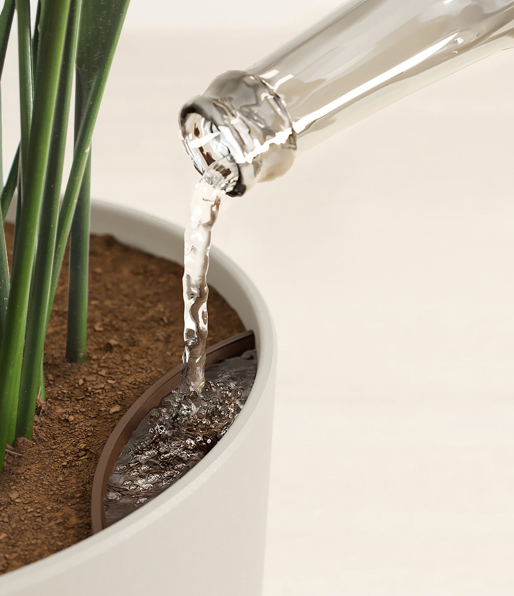 Potted in a premium quality self-watering pot with a soft matte finish, this exquisite plant can grow up to 3 feet tall indoors, and its leaves can reach up to 2 feet long.