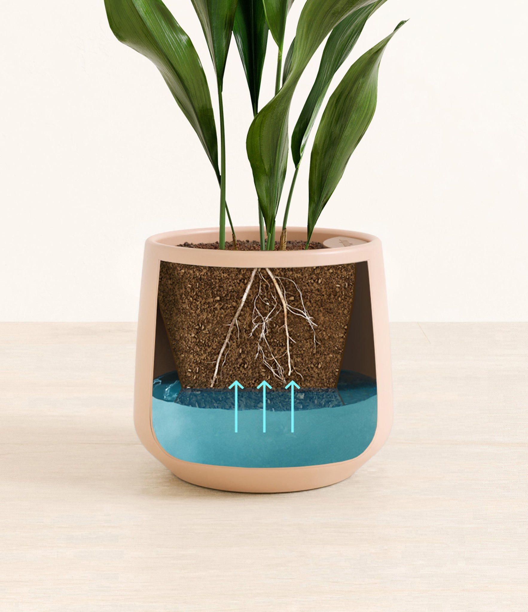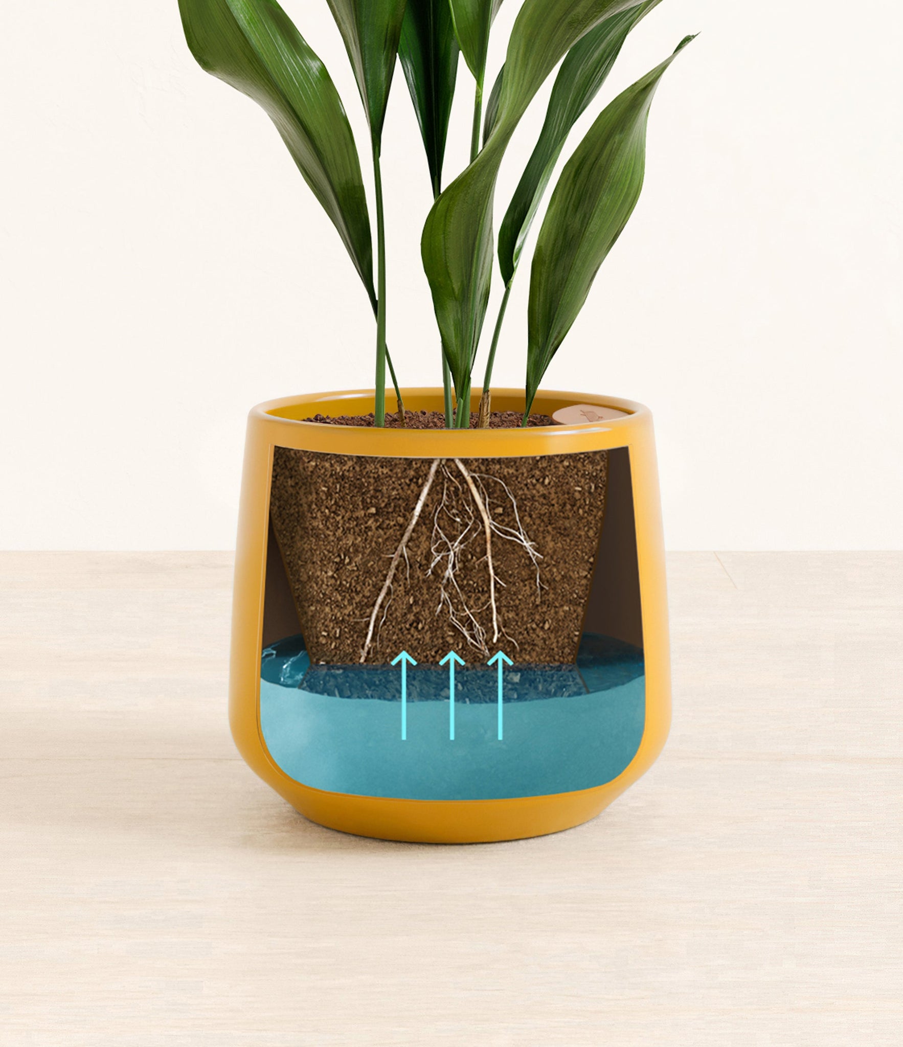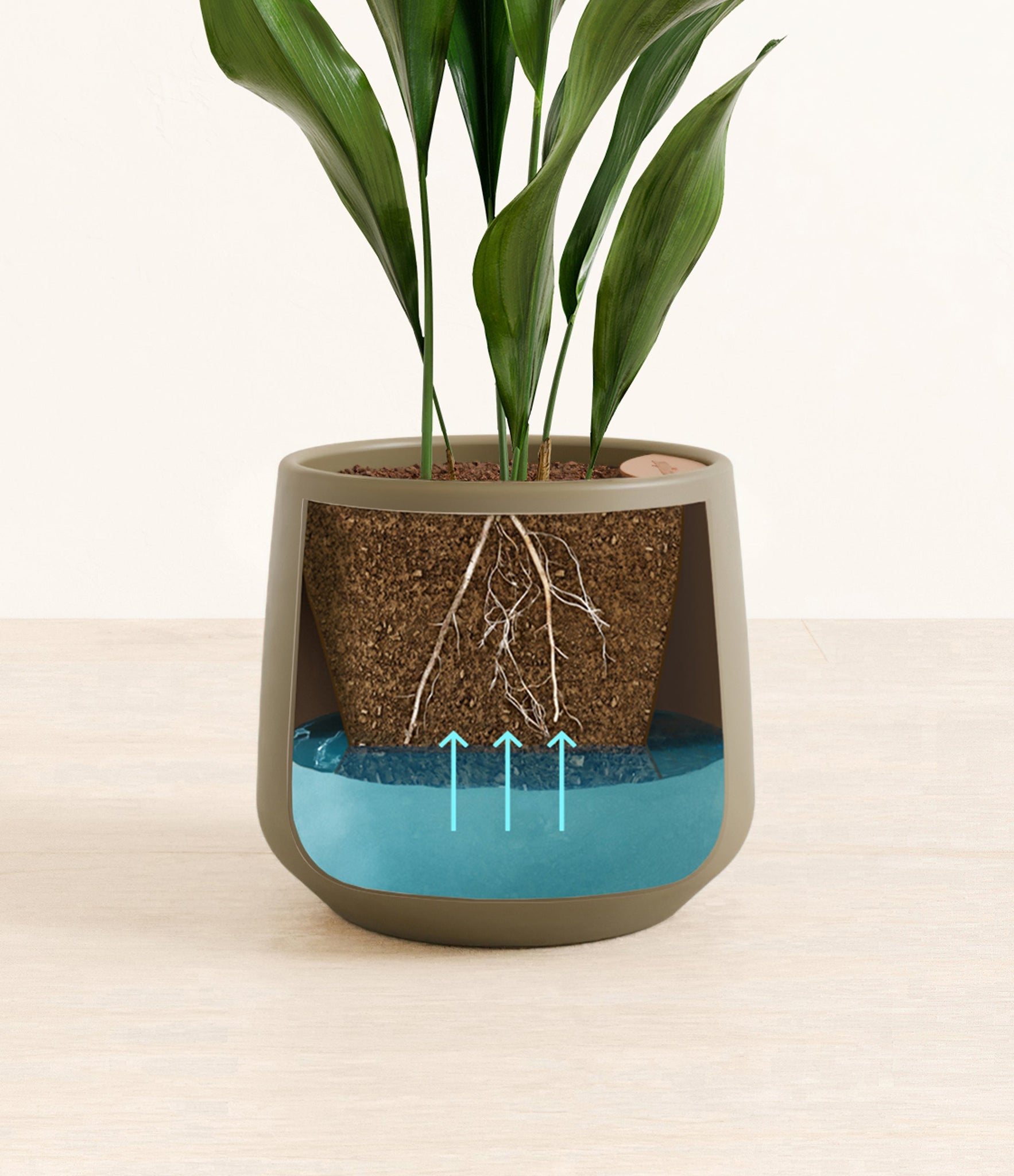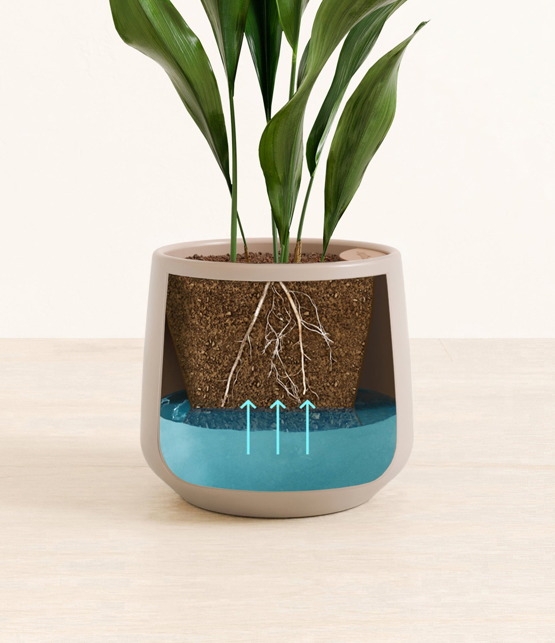 Potted in a premium quality self-watering pot with a soft matte finish, this exquisite plant can grow up to 3 feet tall indoors, and its leaves can reach up to 2 feet long.