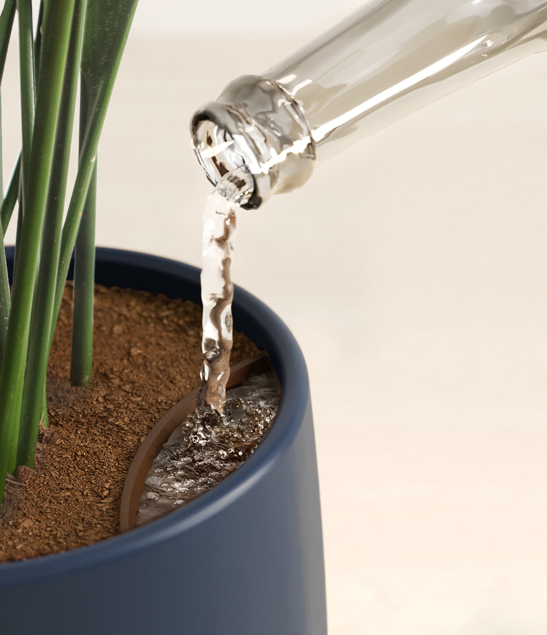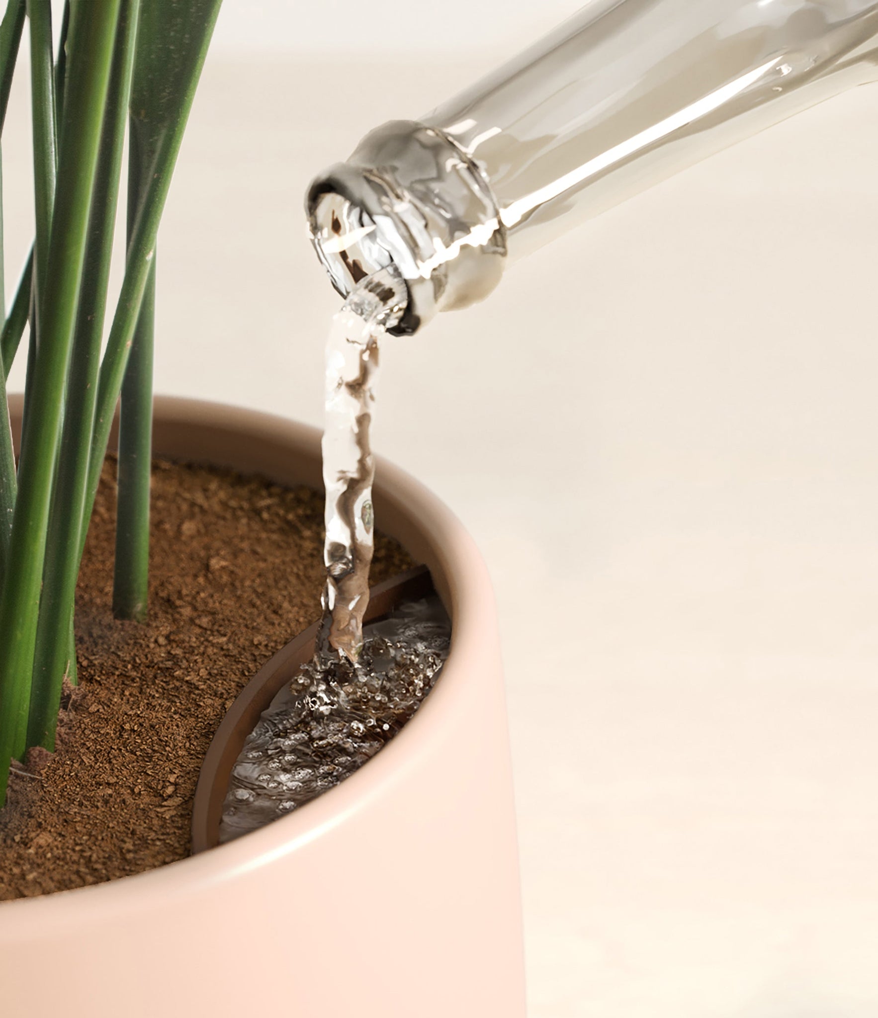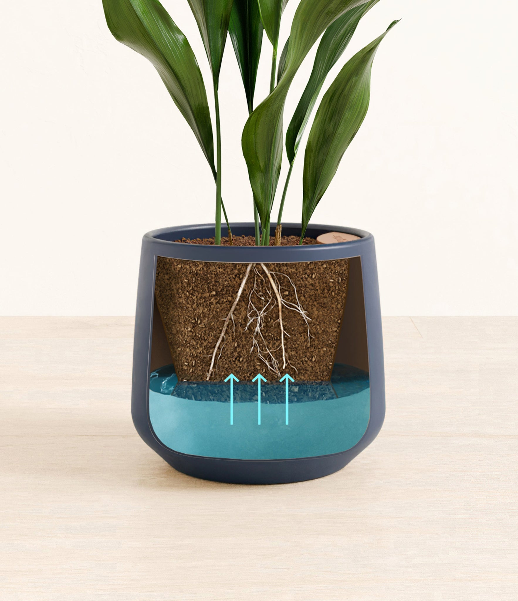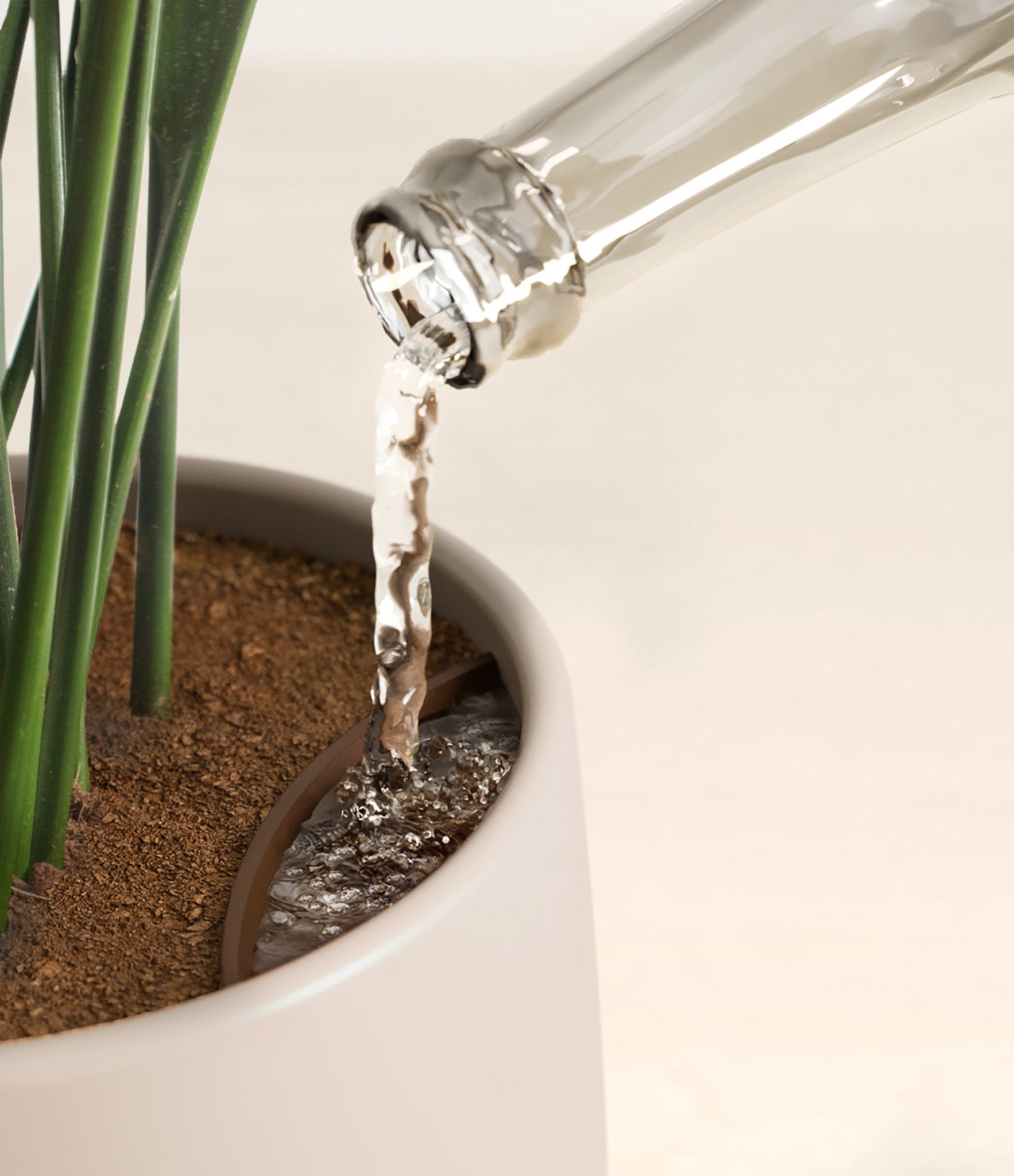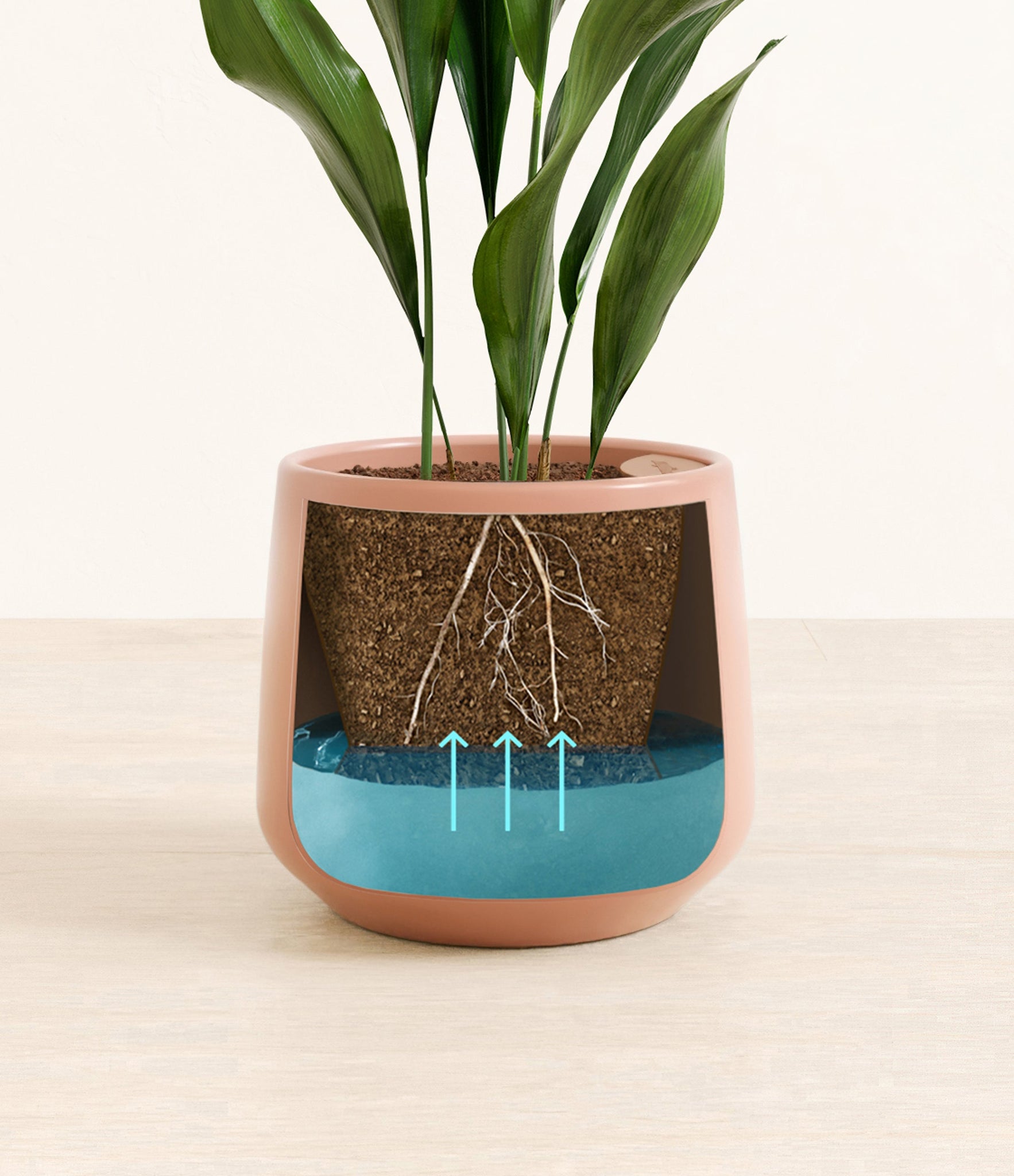 Potted in a premium quality self-watering pot with a soft matte finish, this exquisite plant can grow up to 3 feet tall indoors, and its leaves can reach up to 2 feet long.