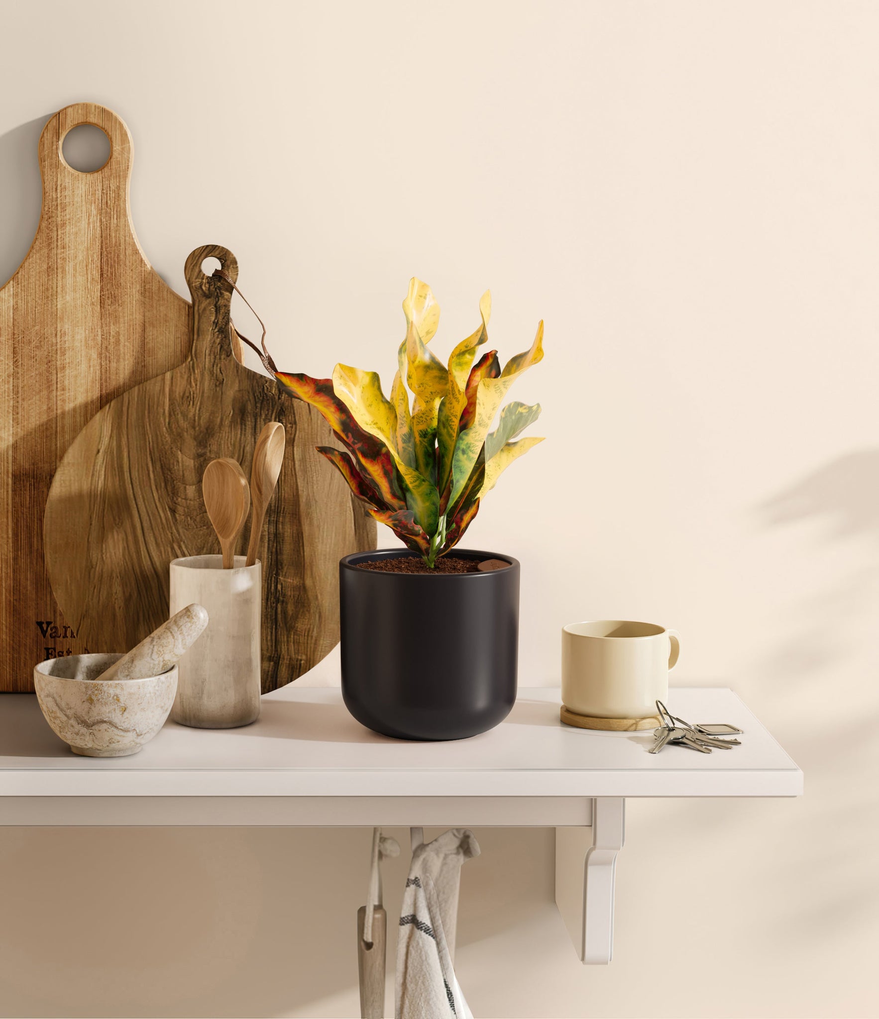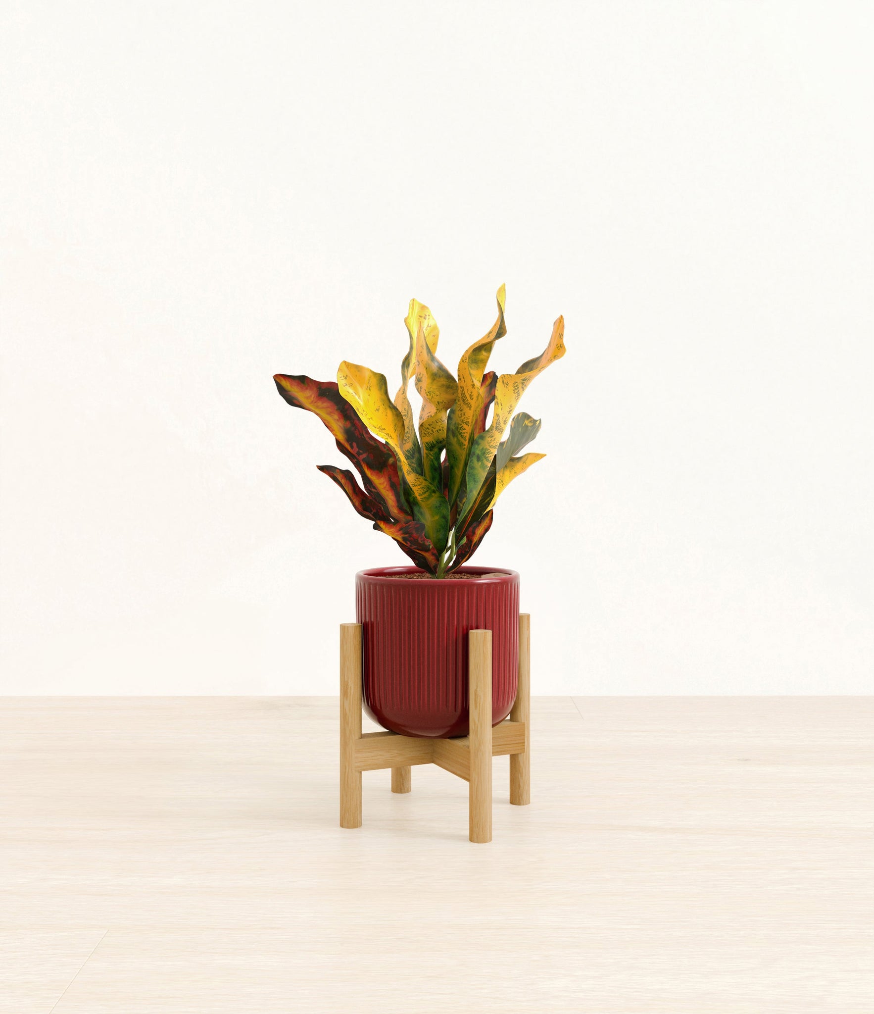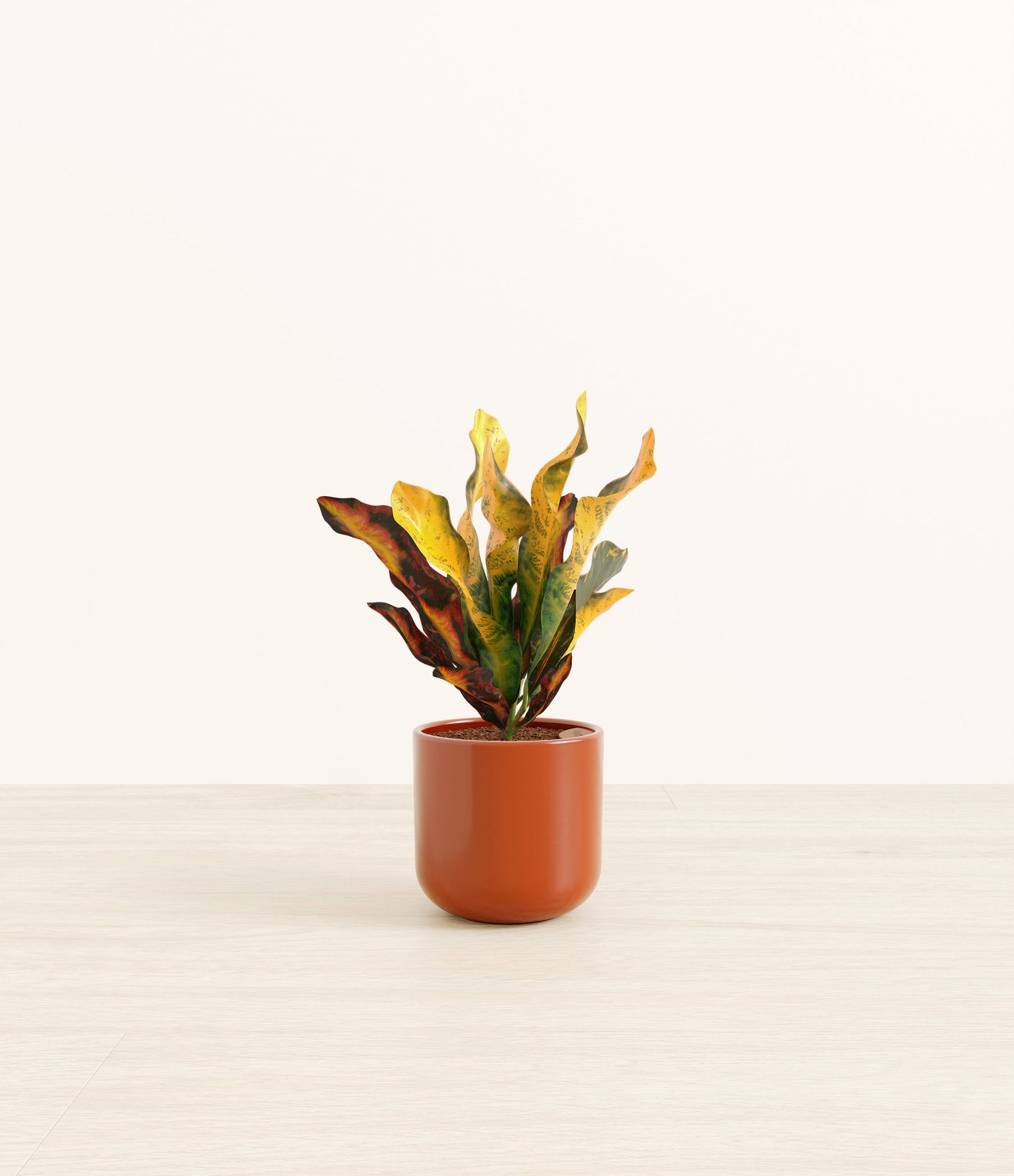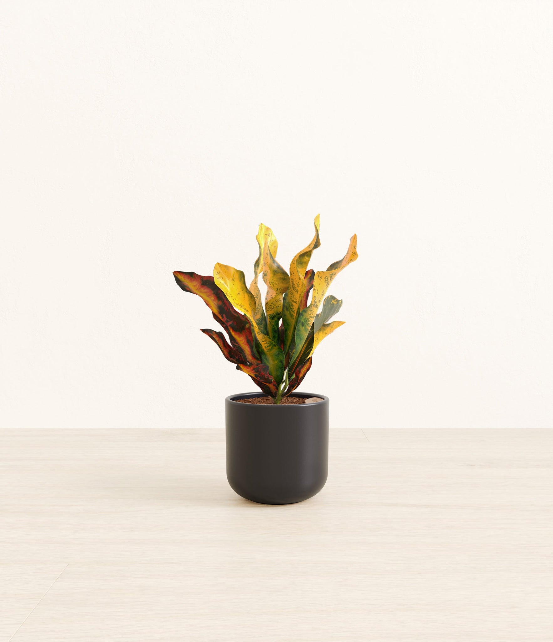 Bold and beautiful, Croton Mammy is by far the most picturesque plant friend. None can compete with its wide range of colors, from deep purples and fiery reds to bright yellows and neon greens - all in the same place at the same time. With such a voluminous presence, it holds first place in bringing a burst of colorful energy to any room. Native to India and Malaysia, it wears a vividly contrasting pattern on its plentiful narrow and curling leaves, reminiscent of a lively traditional dance in full ensemble.