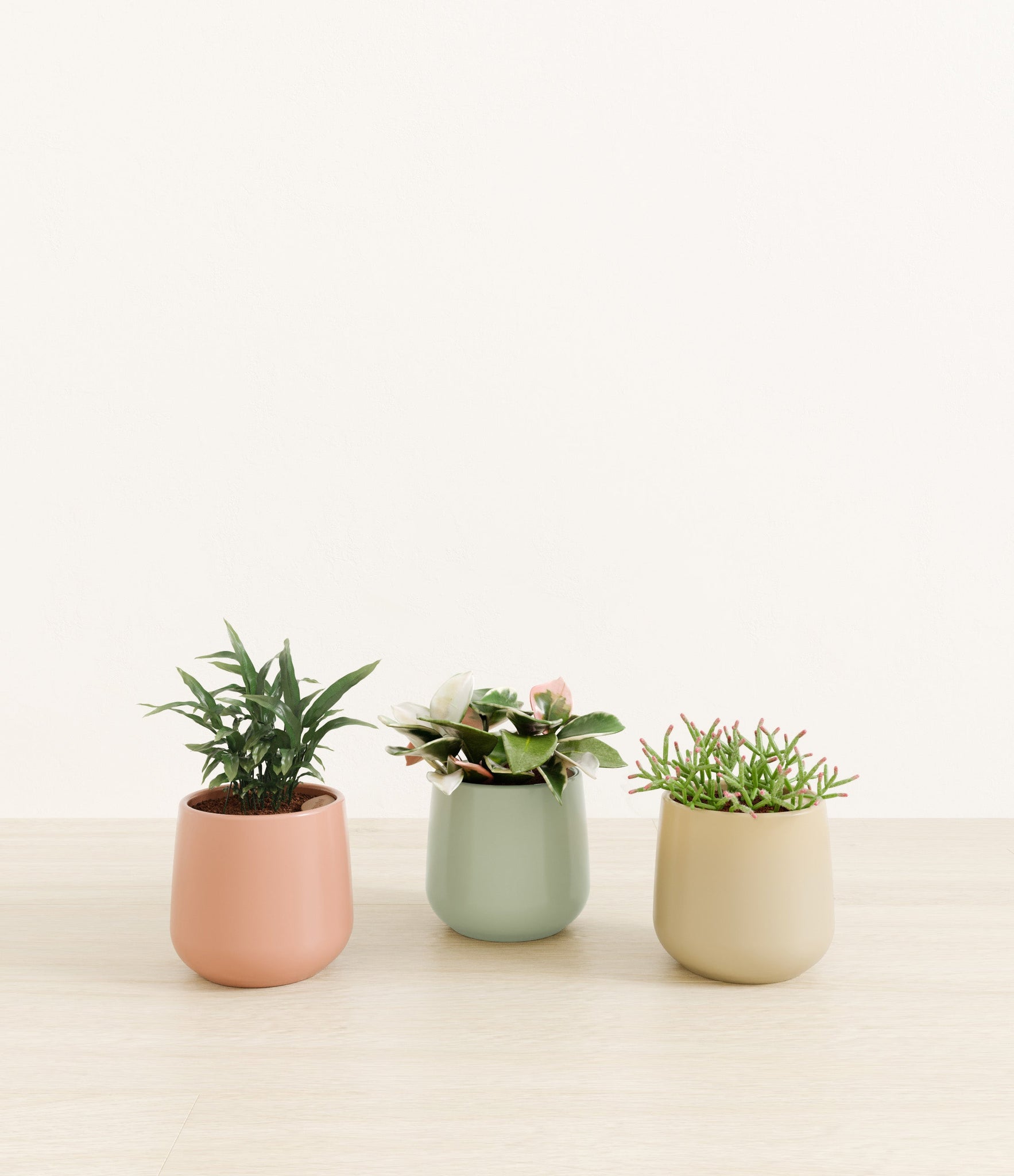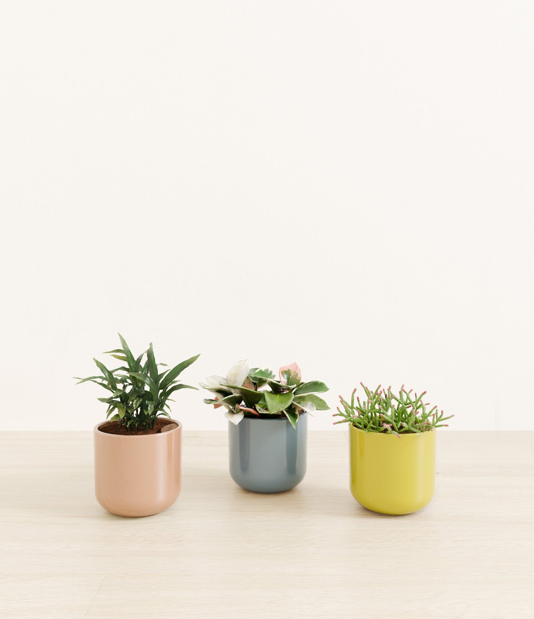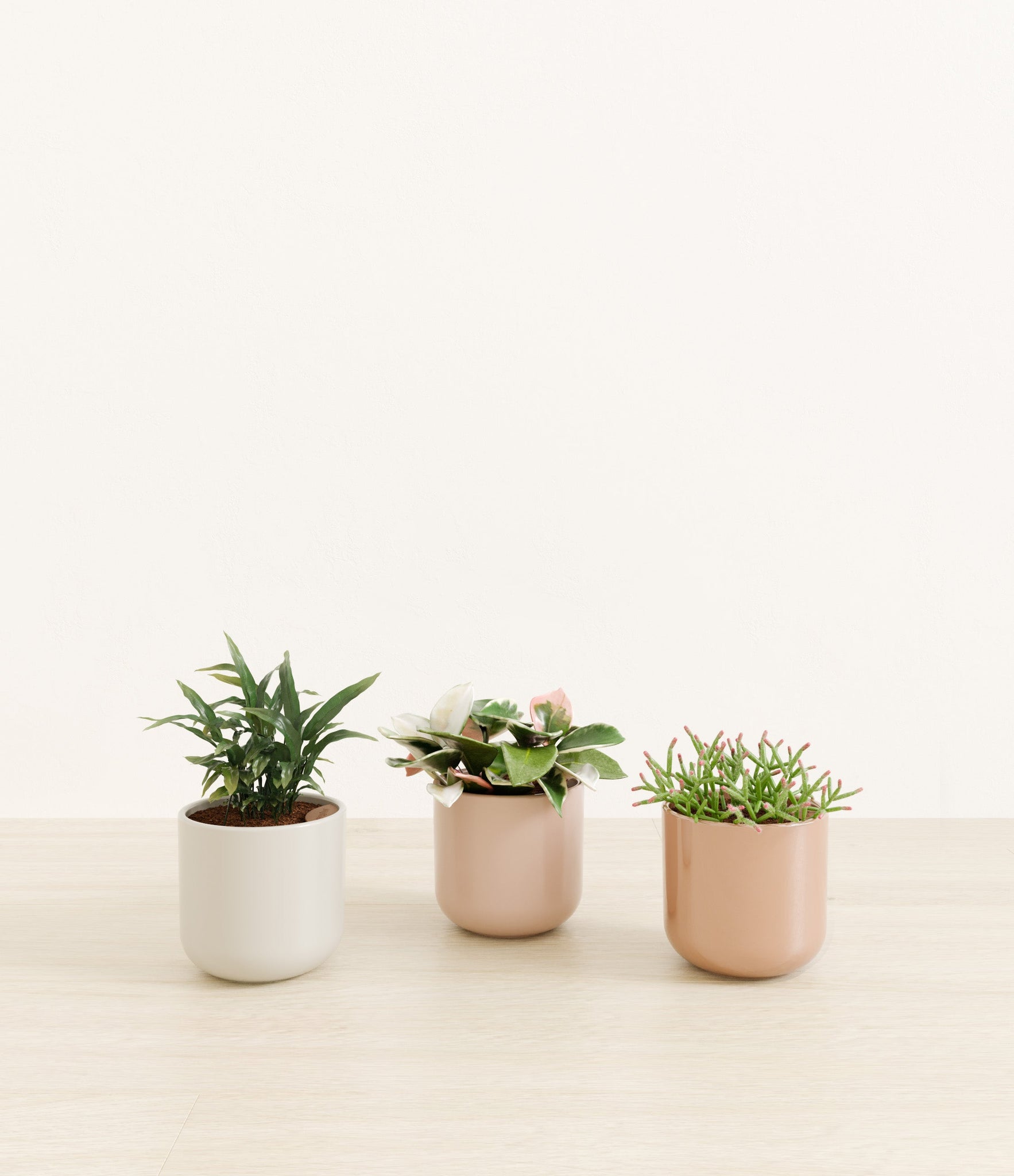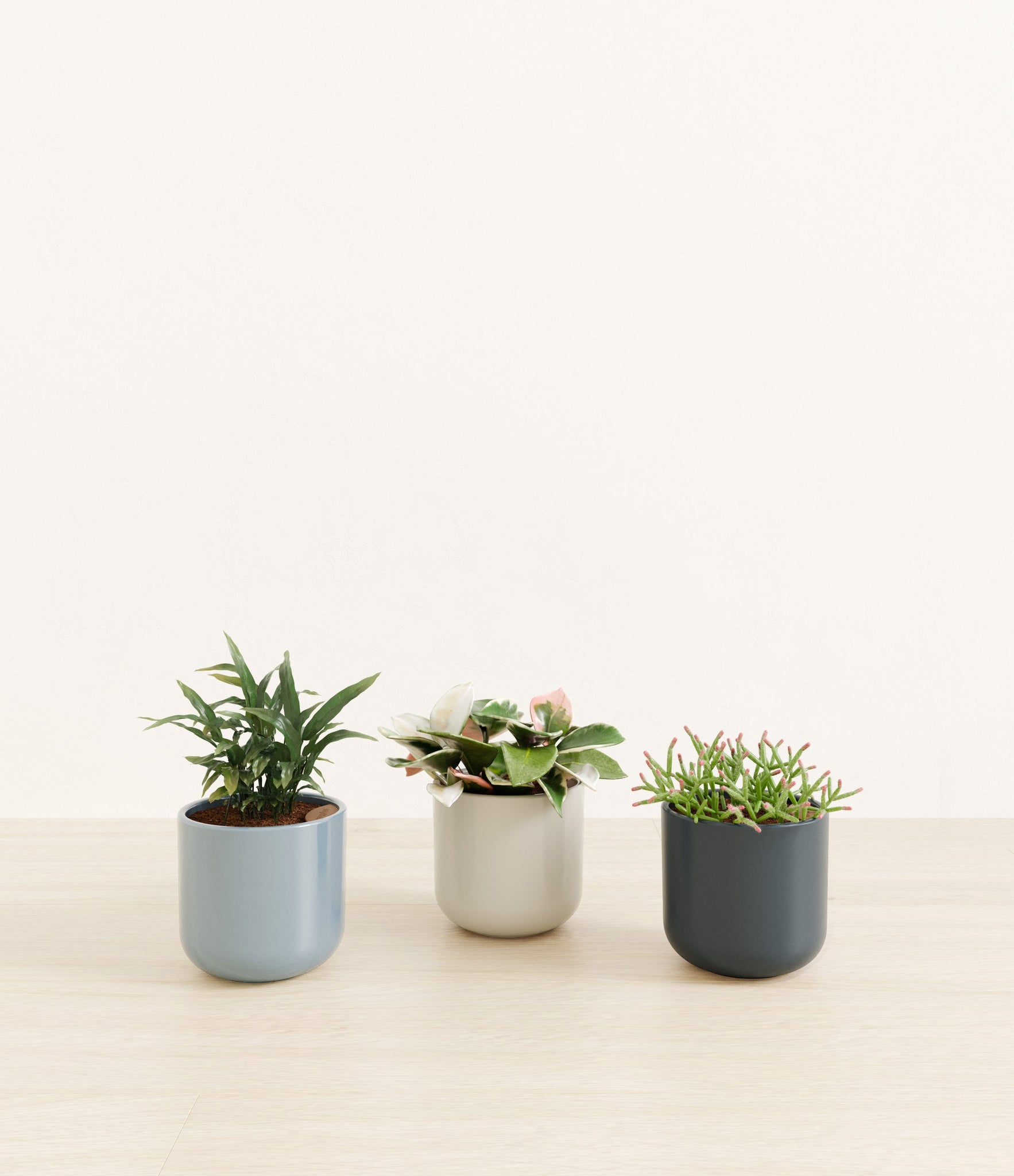 In this set, you'll receive three delightful small houseplants that are the perfect springtime additions to any space. The Mistletoe Cactus is admired for its bright green pencil-thin foliage that effortlessly trails; the Blue Star Fern has blue-green fronds that cascade with a gentle and inviting poise; and the Hoya Tri-Color is a trailing beauty, with variegations of pink and white on its forest green foliage.
