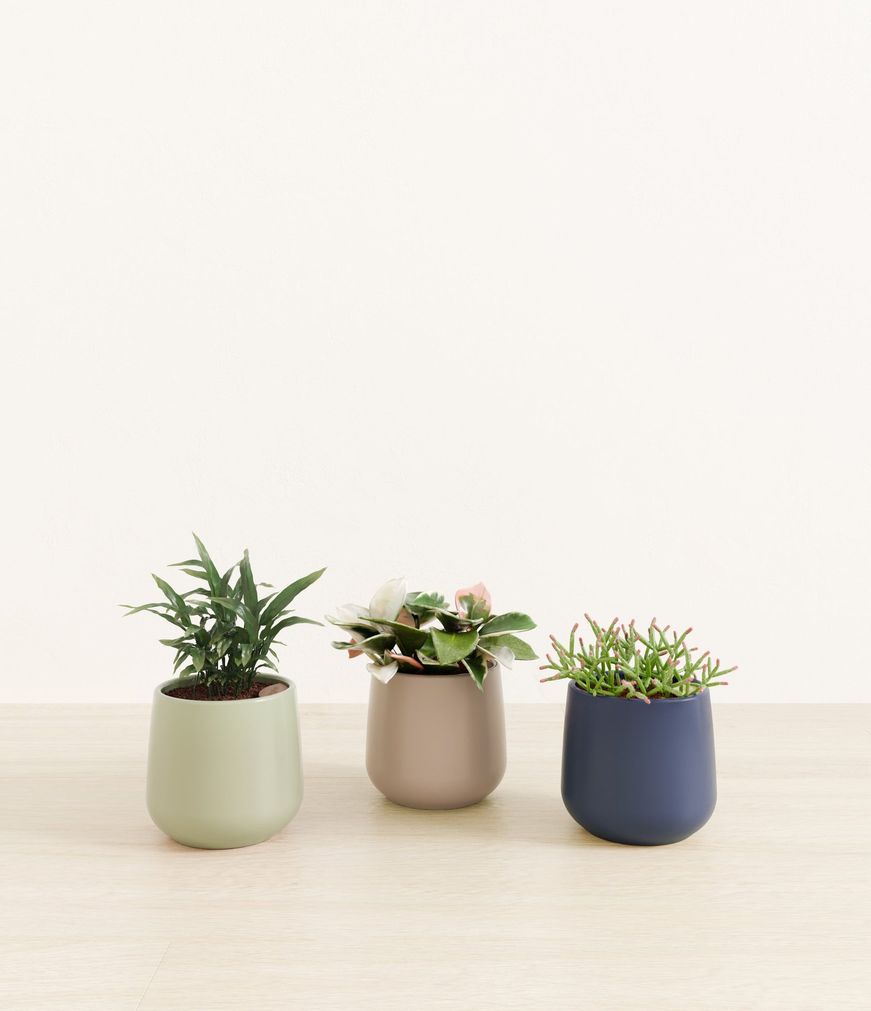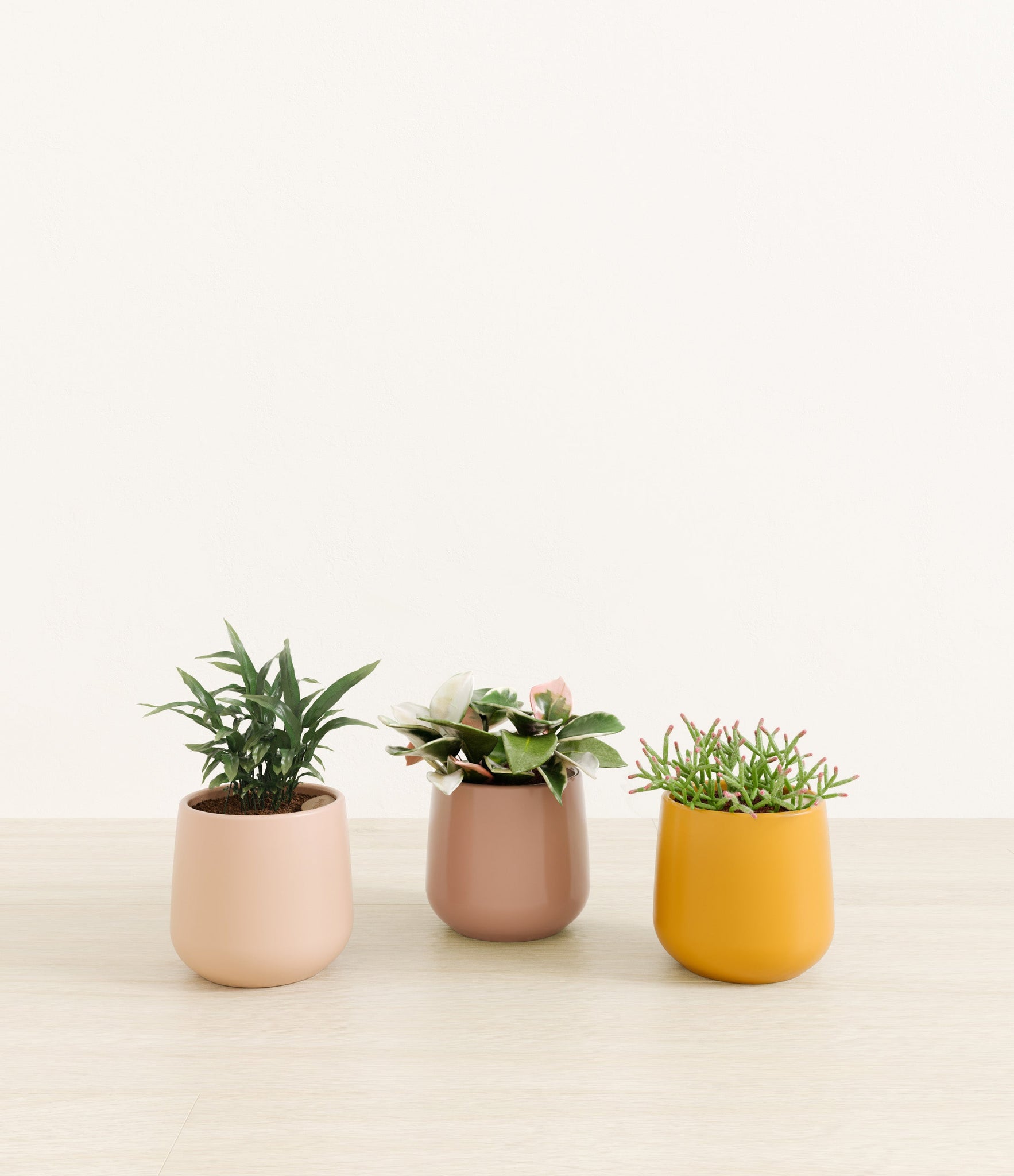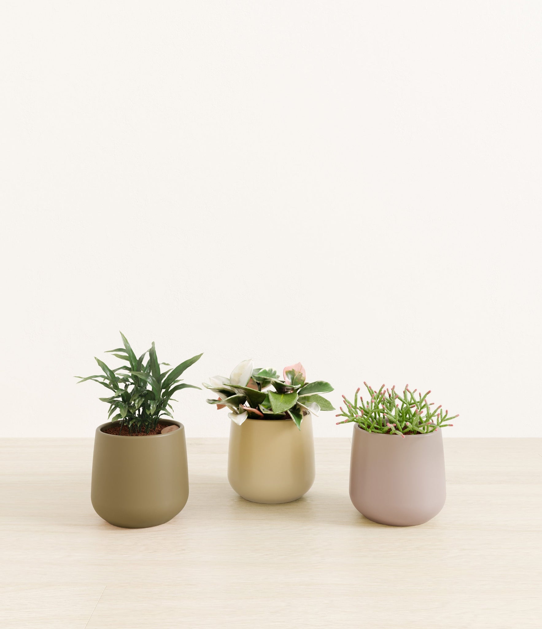 In this set, you'll receive three delightful small houseplants that are the perfect springtime additions to any space. The Mistletoe Cactus is admired for its bright green pencil-thin foliage that effortlessly trails; the Blue Star Fern has blue-green fronds that cascade with a gentle and inviting poise; and the Hoya Tri-Color is a trailing beauty, with variegations of pink and white on its forest green foliage.