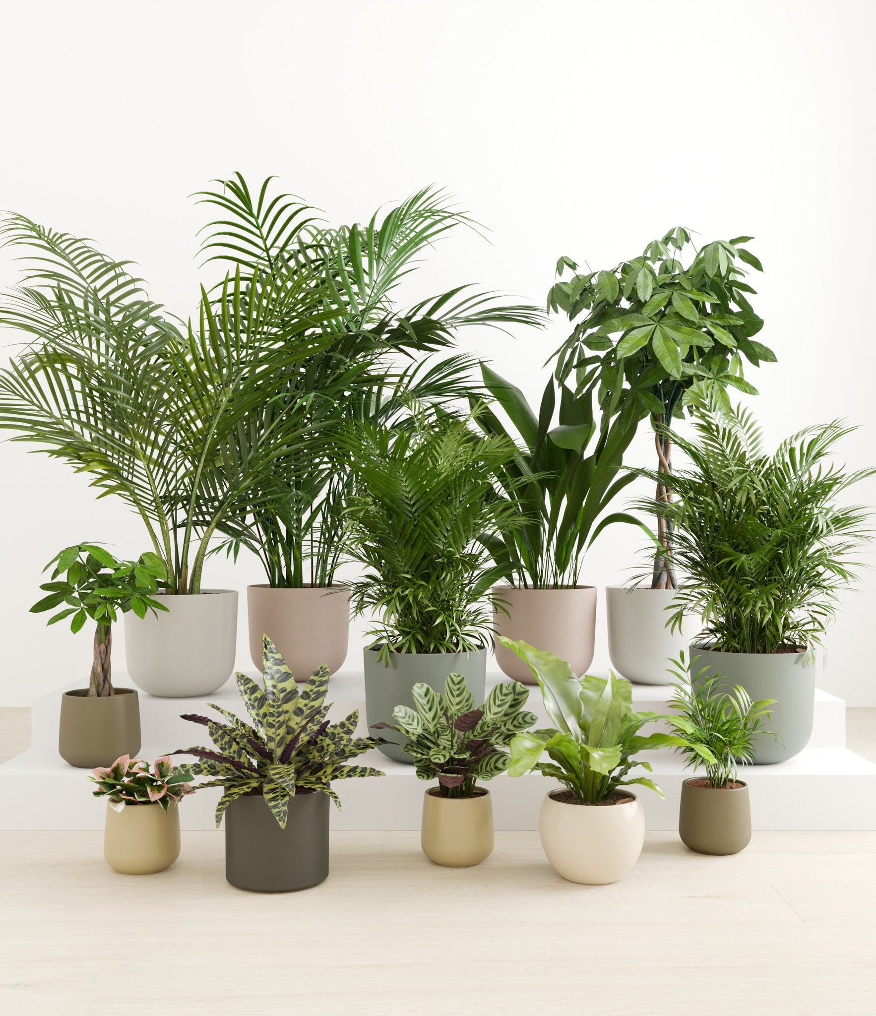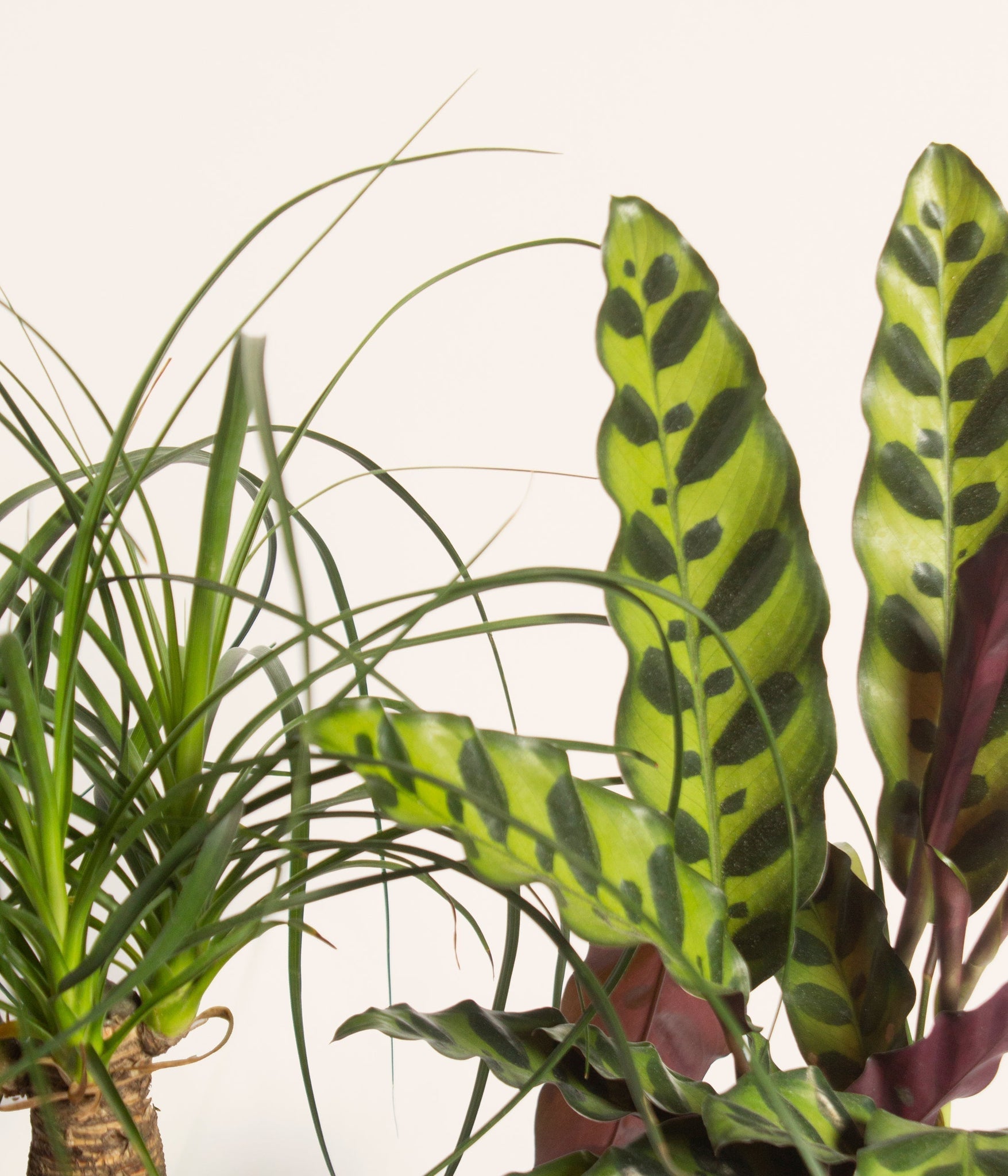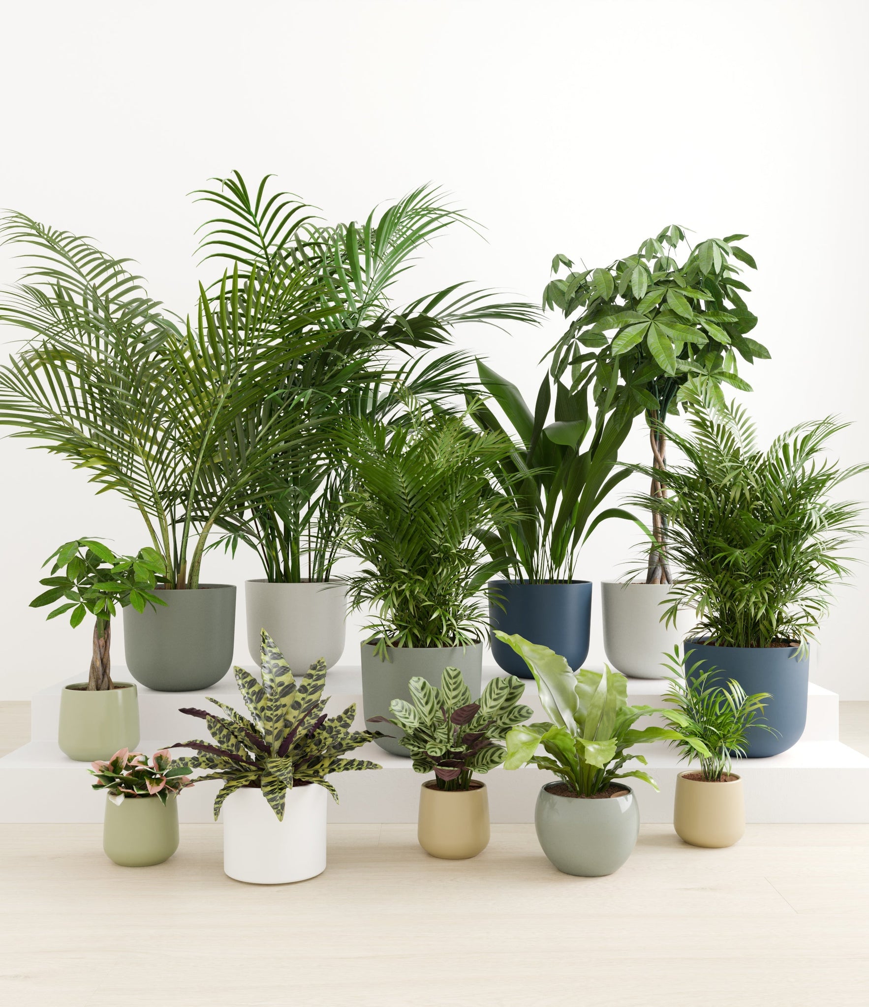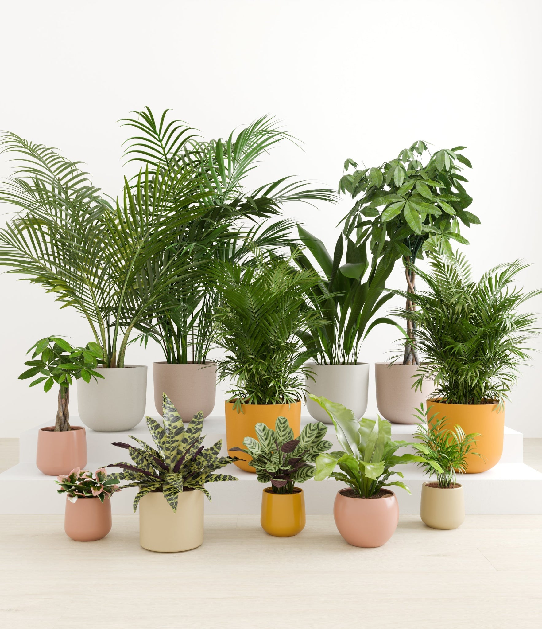 In this collection, you'll receive 12 stunning, pet-friendly houseplants that effortlessly transform any space into a lush, green indoor jungle. The set includes a small Hoya Tri Color, showcasing marvelous pink and white variegation; a small Marxii Calathea, with striking emblem-shaped leaves; and a small Parlor Palm, perfect for brightening shelves and smaller spaces. For medium plants, you'll enjoy a Bird’s Nest Fern, full of wavy fronds; a Rattlesnake Calathea, wearing its signature reptilian pattern; and a Money Tree, symbolizing good fortune and prosperity. The large selection includes two Parlor Palms, timeless favorites for low-light corners; and a Cast Iron Plant, with arching, glossy green foliage. And finally, for the grand statement pieces, you'll receive a huge Majesty Palm, a huge Areca Palm with feathery fronds, and a huge Money Tree, bringing height and elegance to any room.
