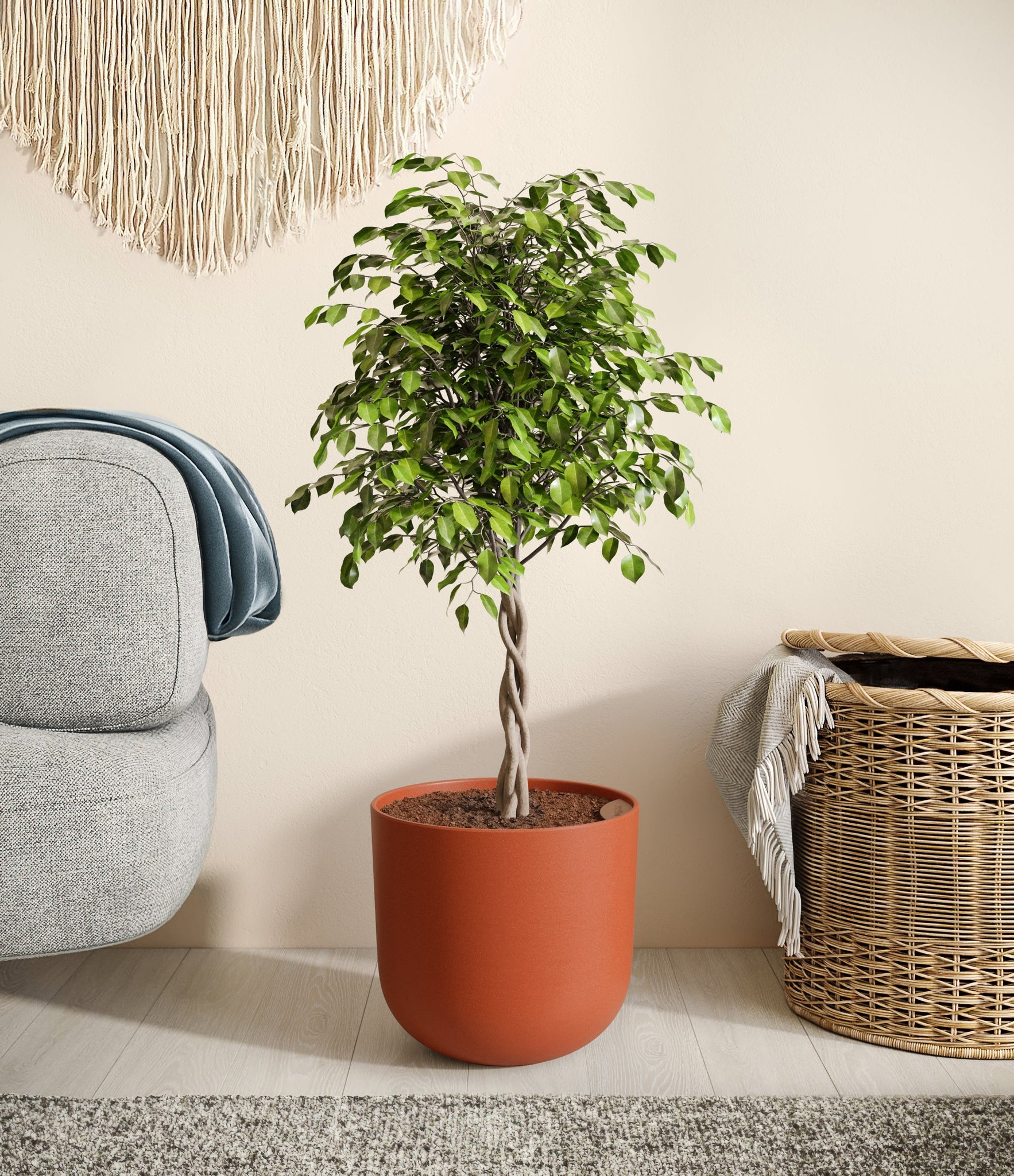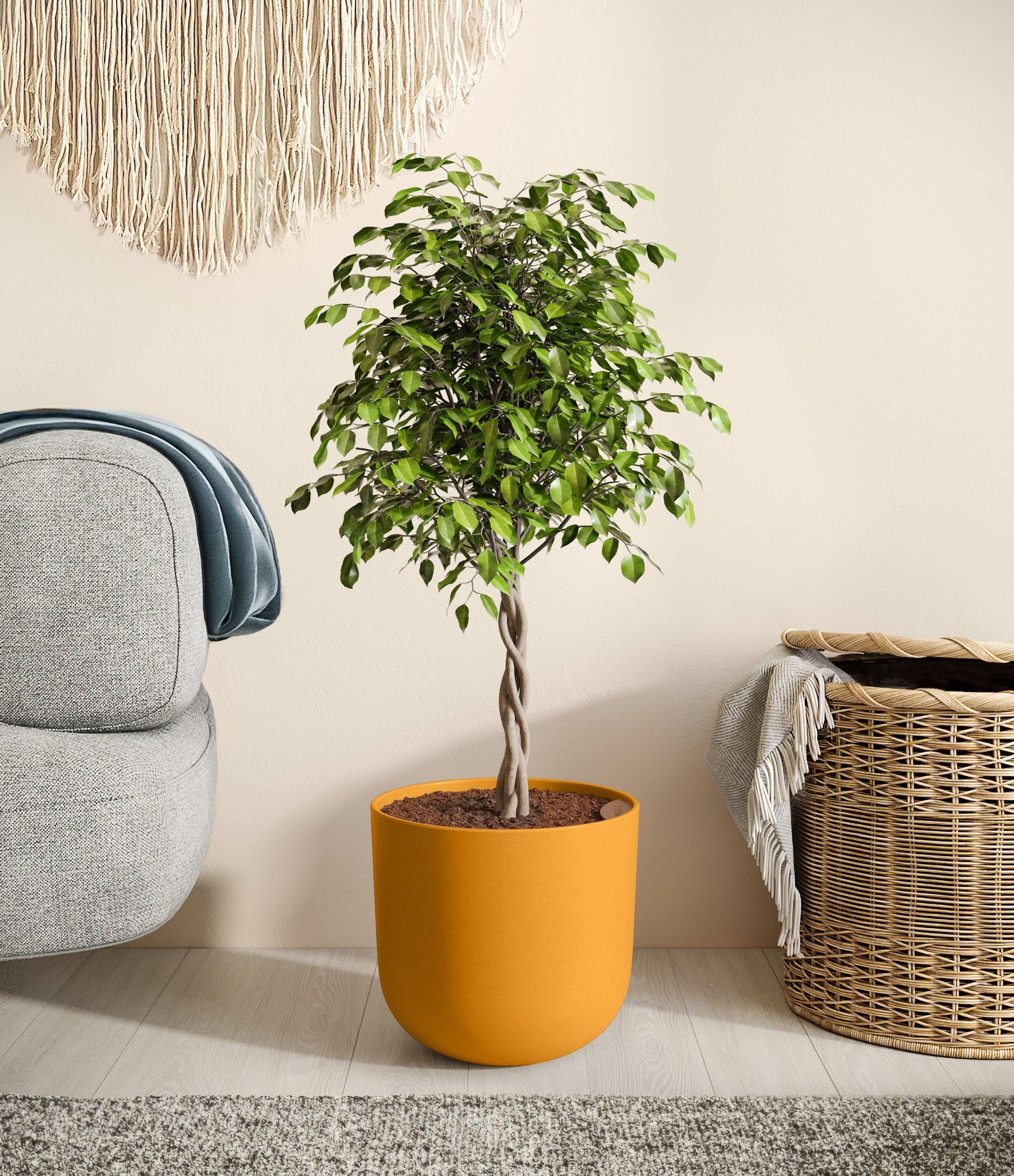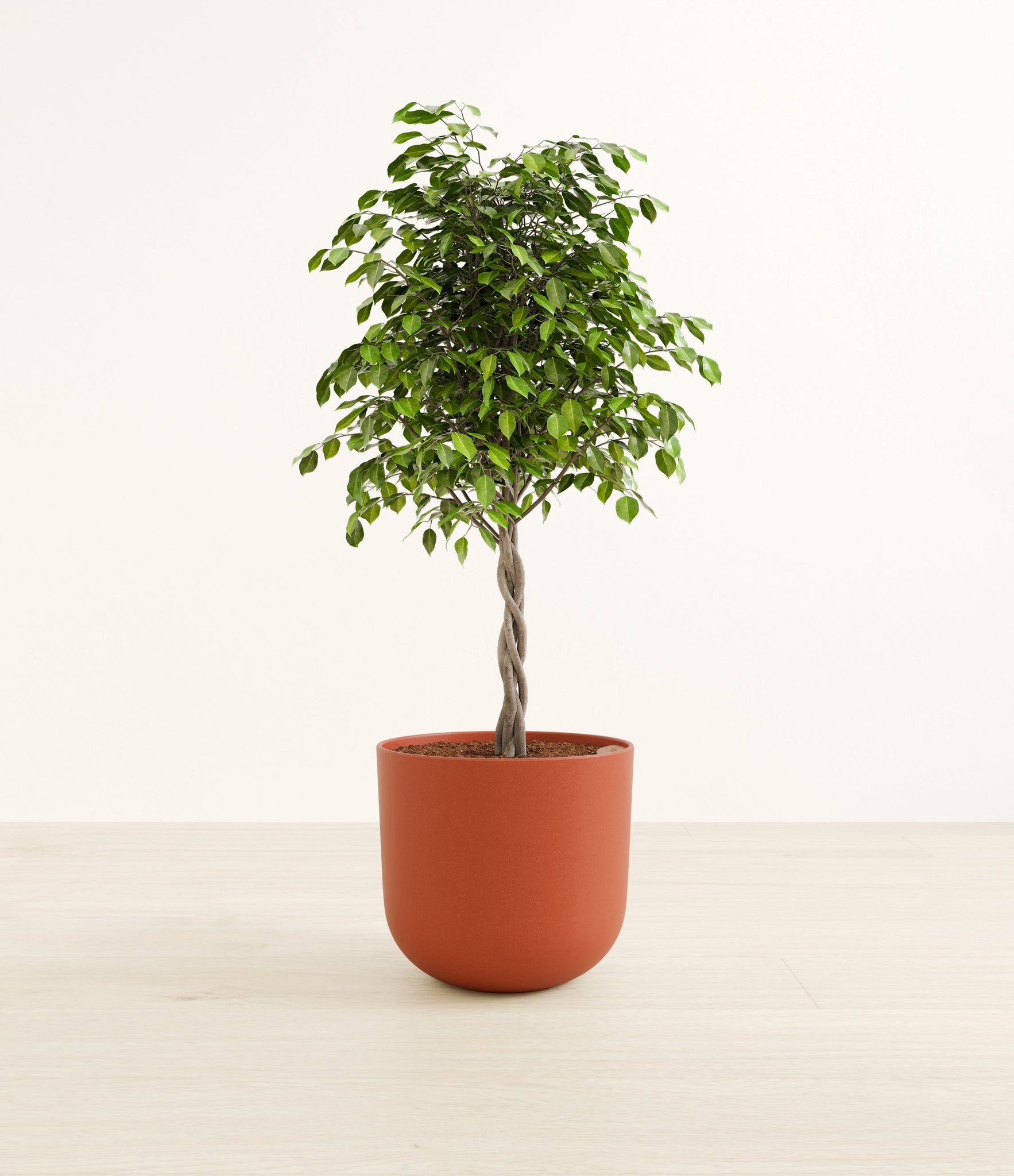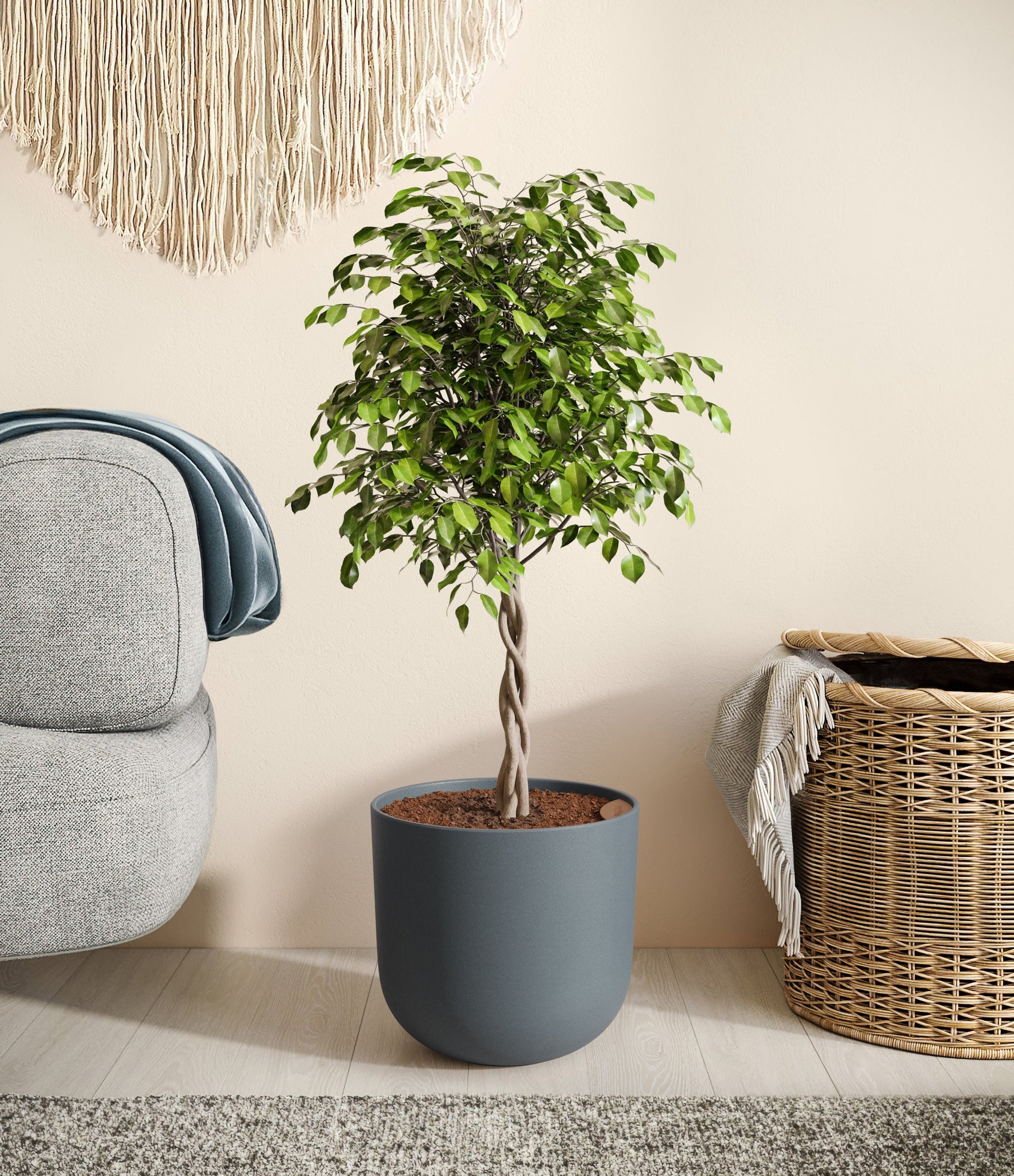 Native to the lush rainforests of Asia and Australia, Ficus Benjamina, also known as the Weeping Fig, is a popular choice for both homes and offices. Its arching branches and glossy, dense leaves create a visually soothing presence that gracefully enhances any space. Renowned not only for its aesthetic appeal but also for its air-purifying capabilities, the Weeping Fig embodies a blend of natural beauty and practicality. This plant offers a touch of tranquility and improves indoor air quality, making it an ideal addition for those seeking a serene yet low-maintenance indoor companion.