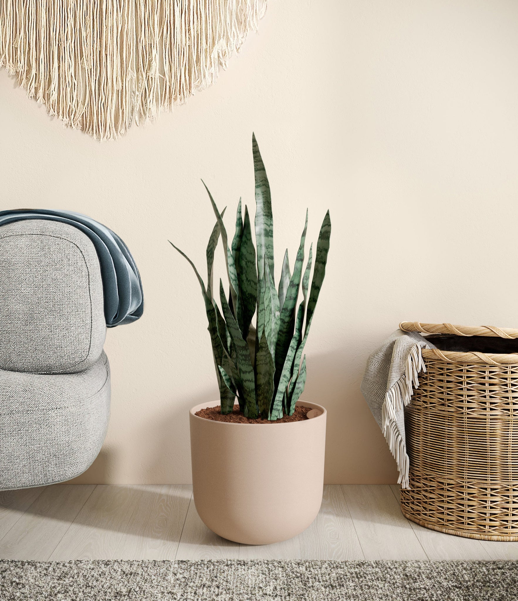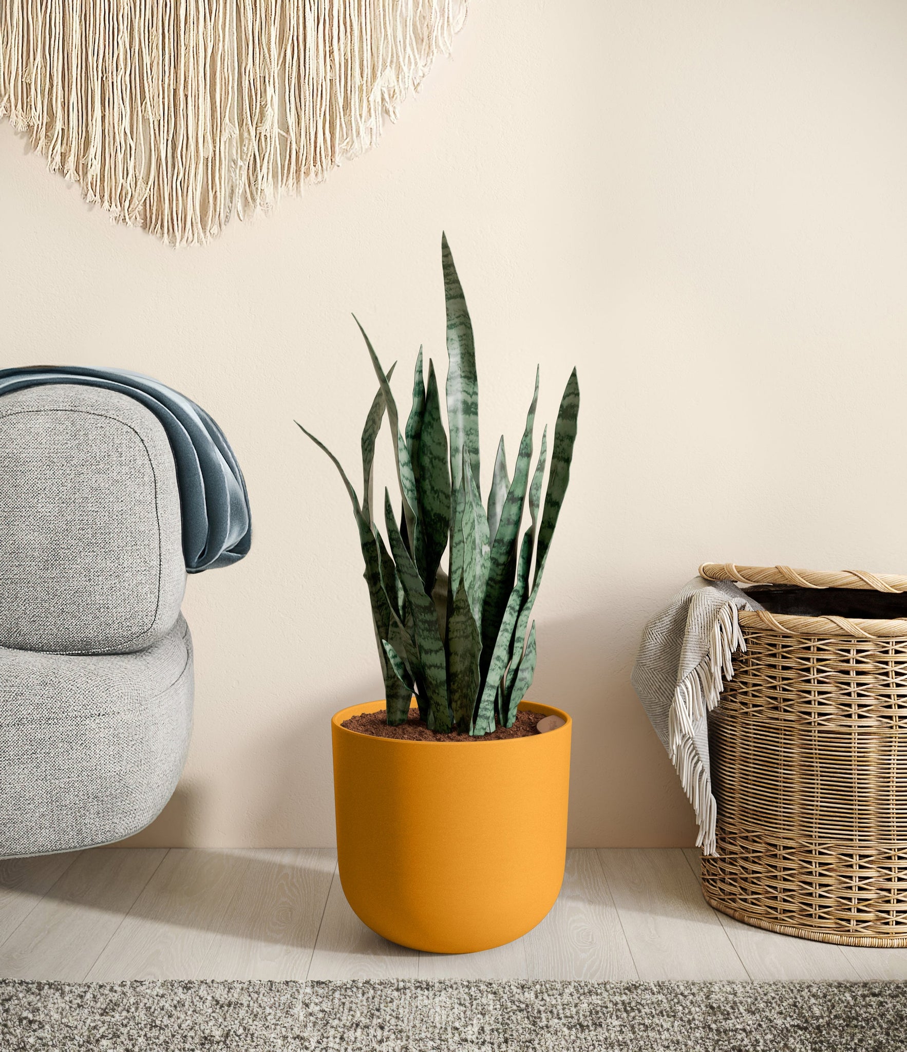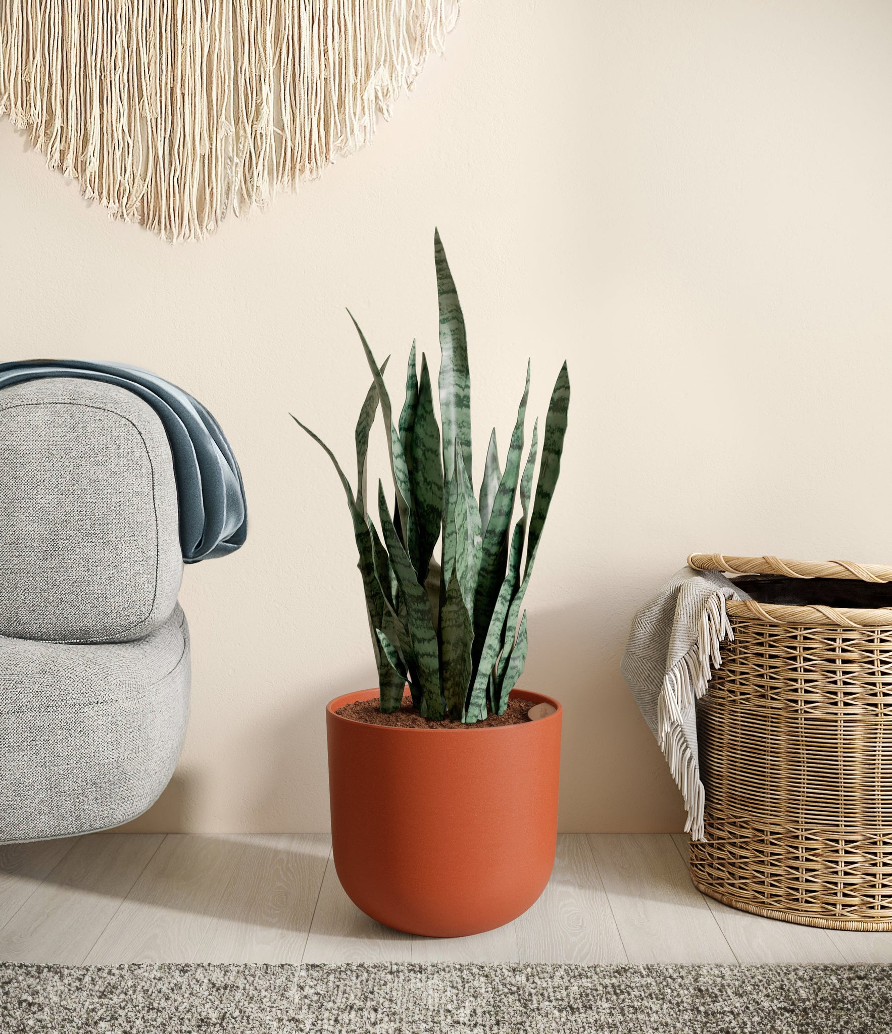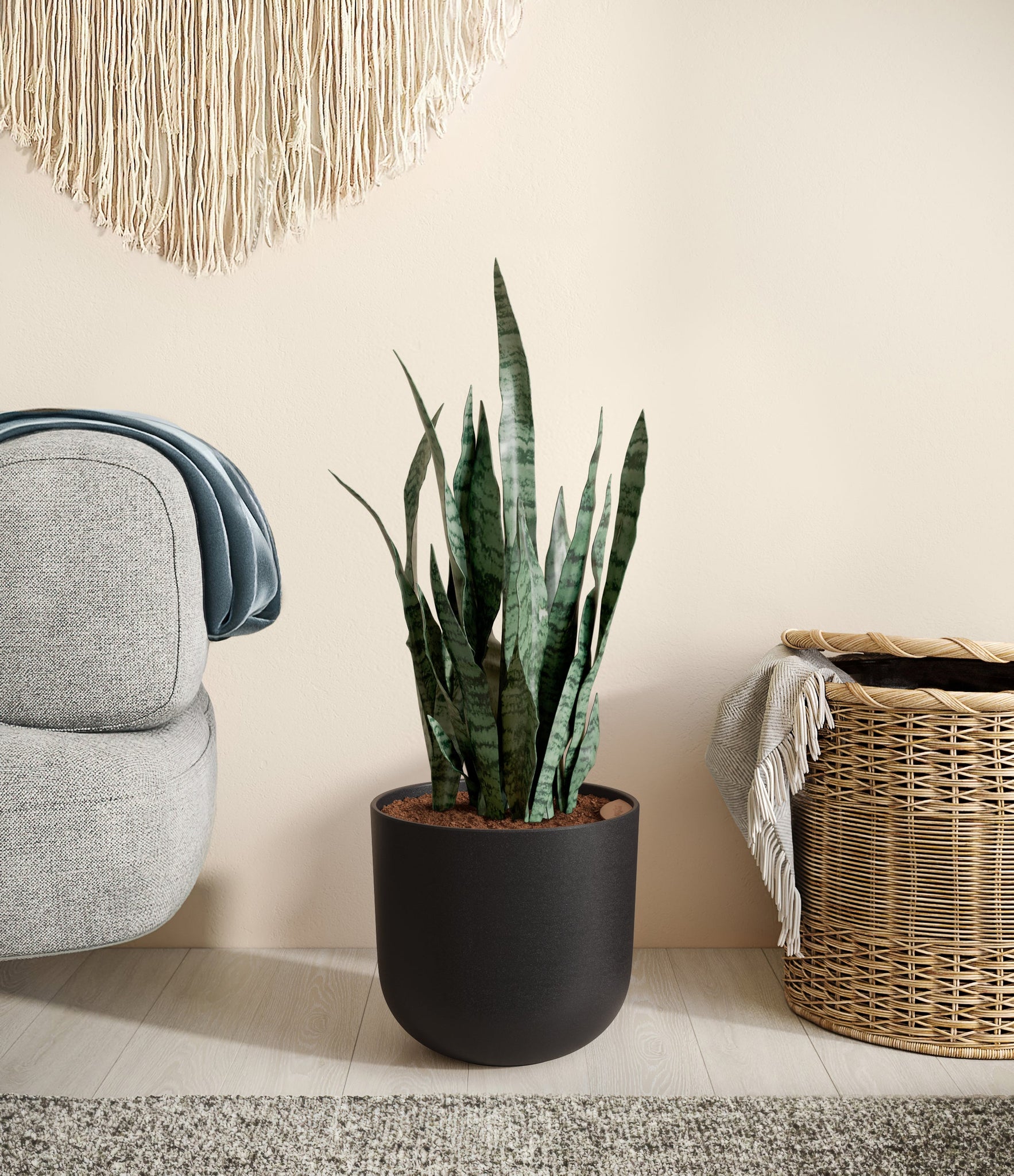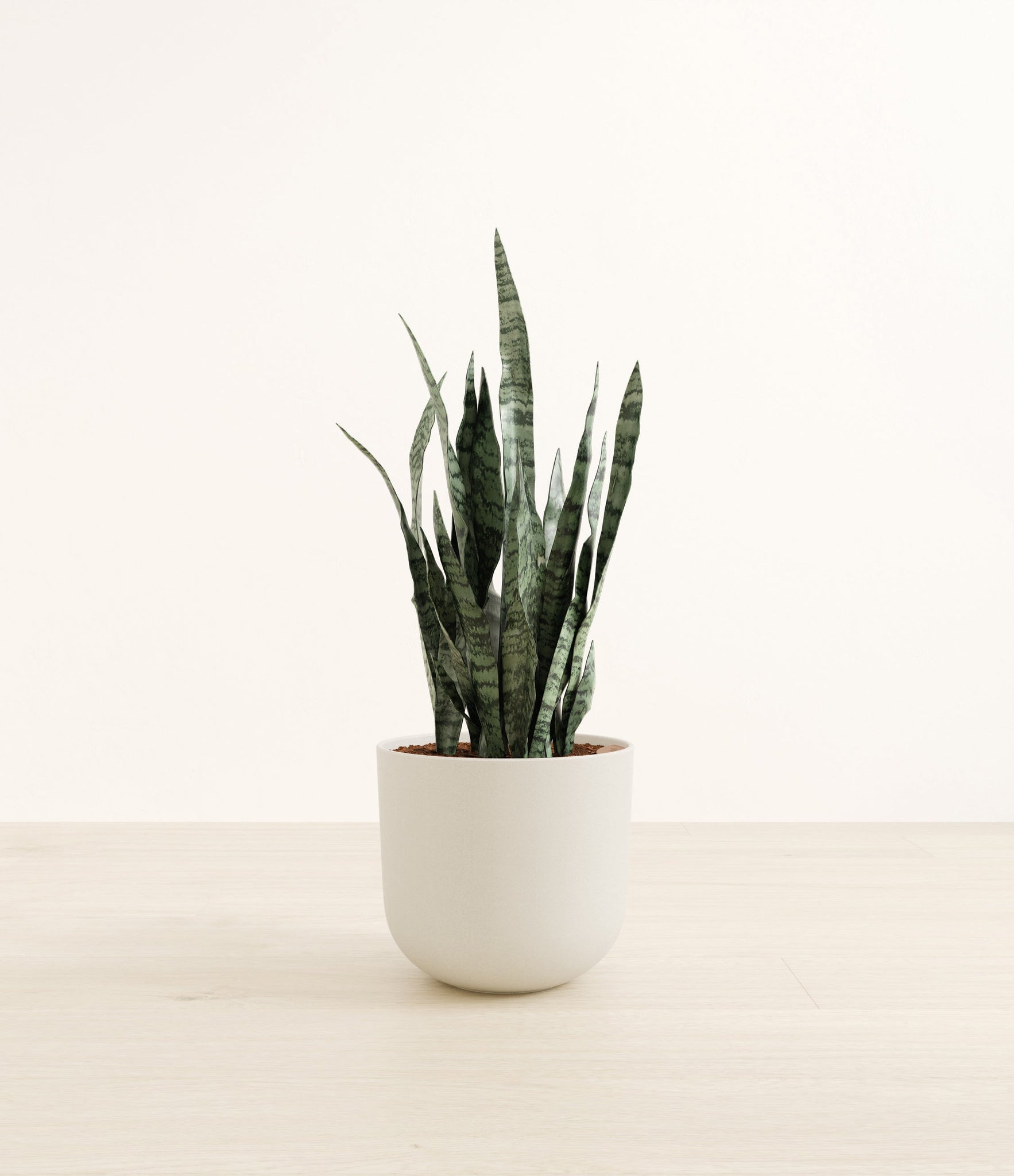 Originating from the desert lands of Africa, Asia, and Madagascar, Snake Plant is the most resilient of all houseplants and thrives under any condition - including the most forgetful of plant lovers. Its tall and narrow sword-shaped leaves wear mesmerizing swatches of silver and sage contrasting against a deep forest green, ever so elegantly stealing the show. Not only is it easy on the eyes, Green Snake Plant is a master air-purifier, removing allergens and toxins from the air we breathe, so keeping it goes a long way for our health.