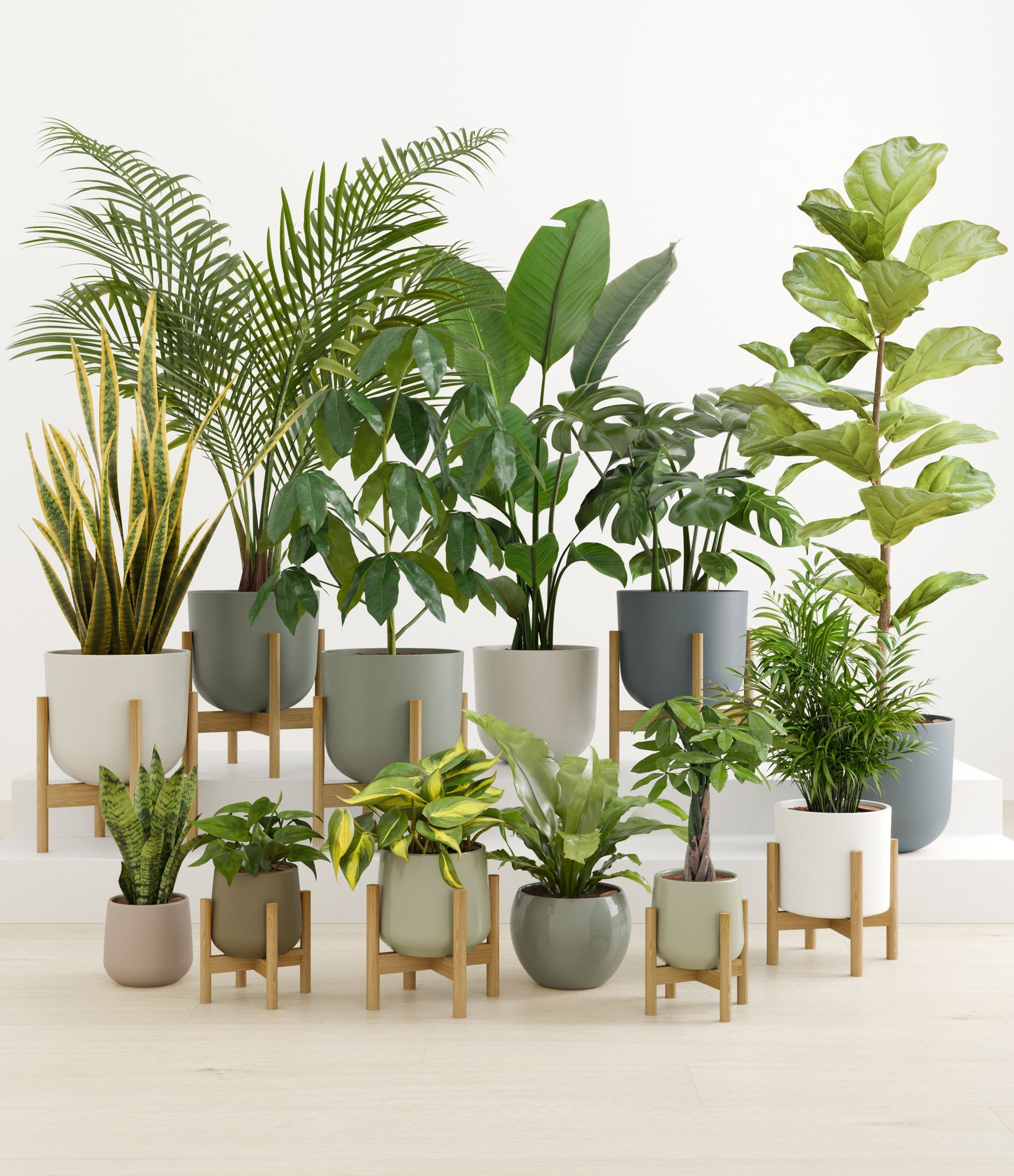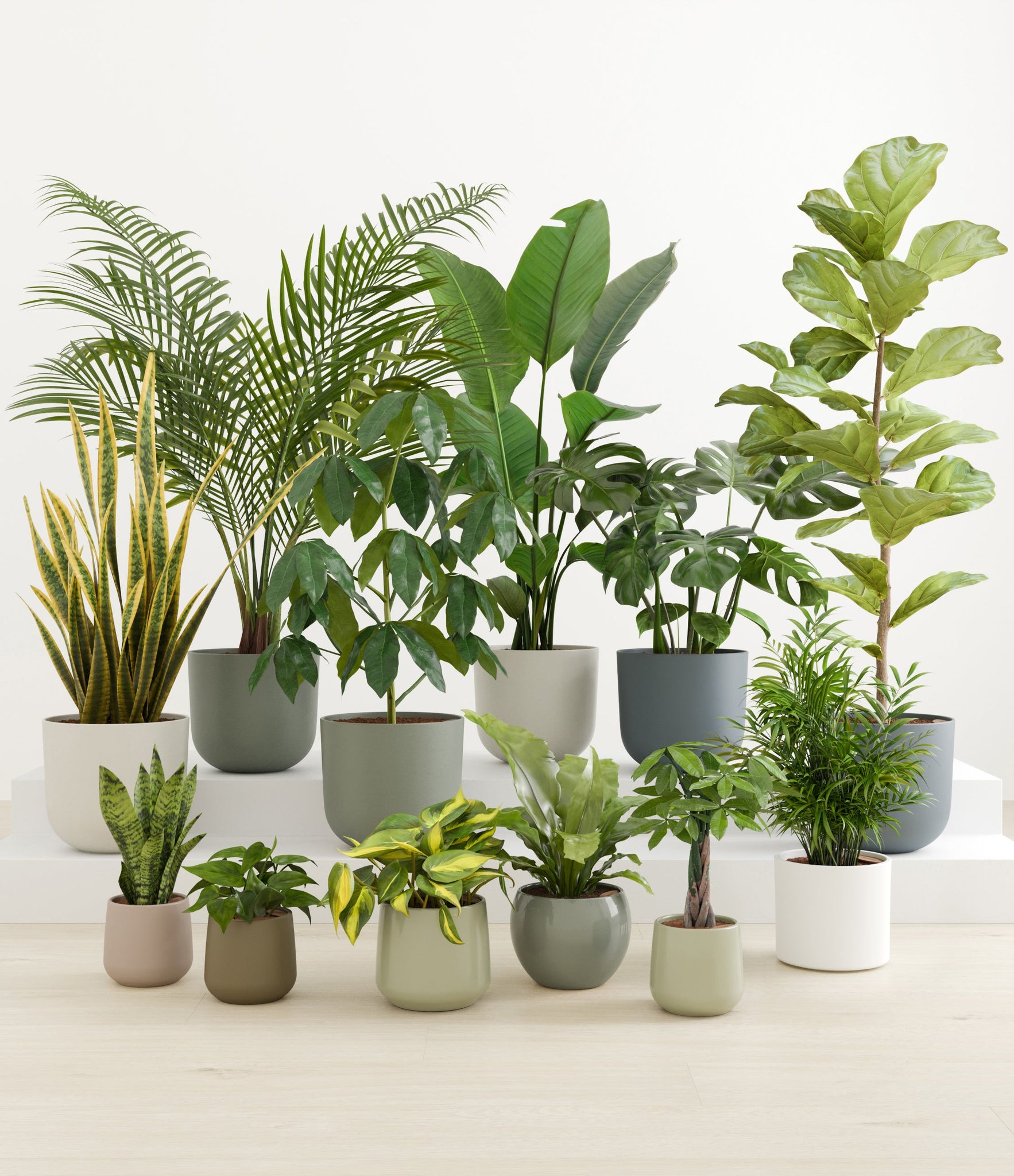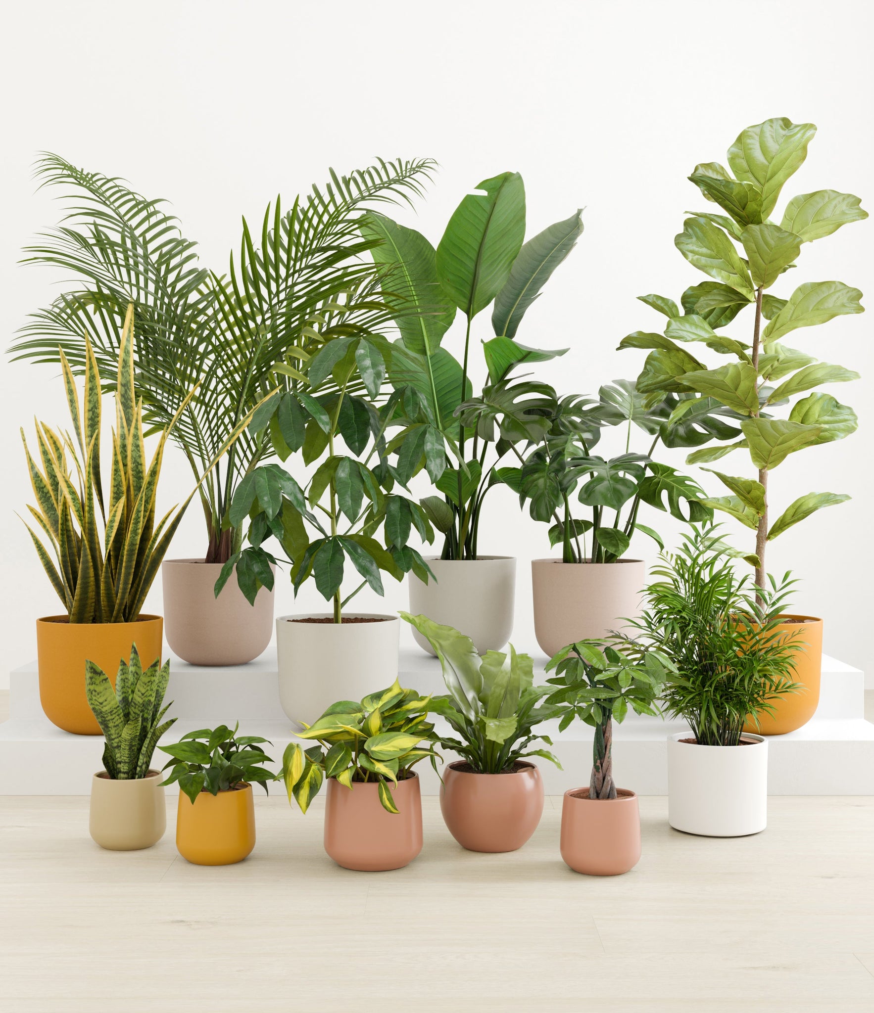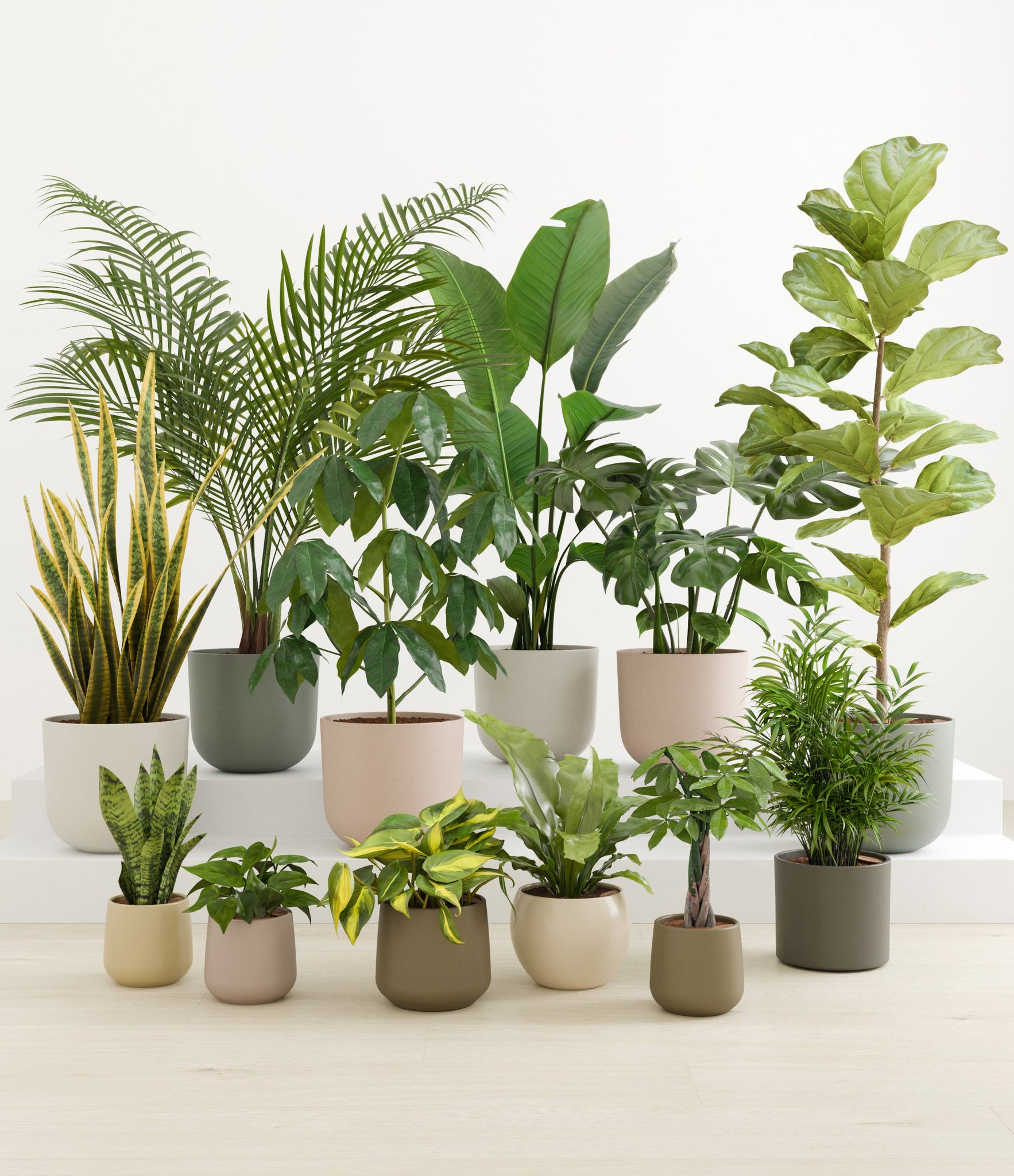 The set includes a small Money Tree symbolizing good fortune and prosperity; a small Heartleaf Philodendron wearing glossy heart-shaped foliage; a small Green Snake plant with mesmerizing swatches of silver and sage; a medium Parlor Palm – a must-have centerpiece; a medium Birds’ Nest Fern bursting with wavy fronds; a medium Philodendron Brazil covered in lime-colored variegation; a large Schefflera Amate that adds a perfect touch of the tropics to any space; a large Golden Snake plant with tall, narrow leaves; a large Monstera Deliciosa with breathtakingly foliage; a huge Majesty Palm with elegant fronds and graceful curves; a huge White Bird of Paradise that playfully hangs like birds in flight; and a huge Fiddle Leaf Fig Bush with massive lyre-shaped leaves.