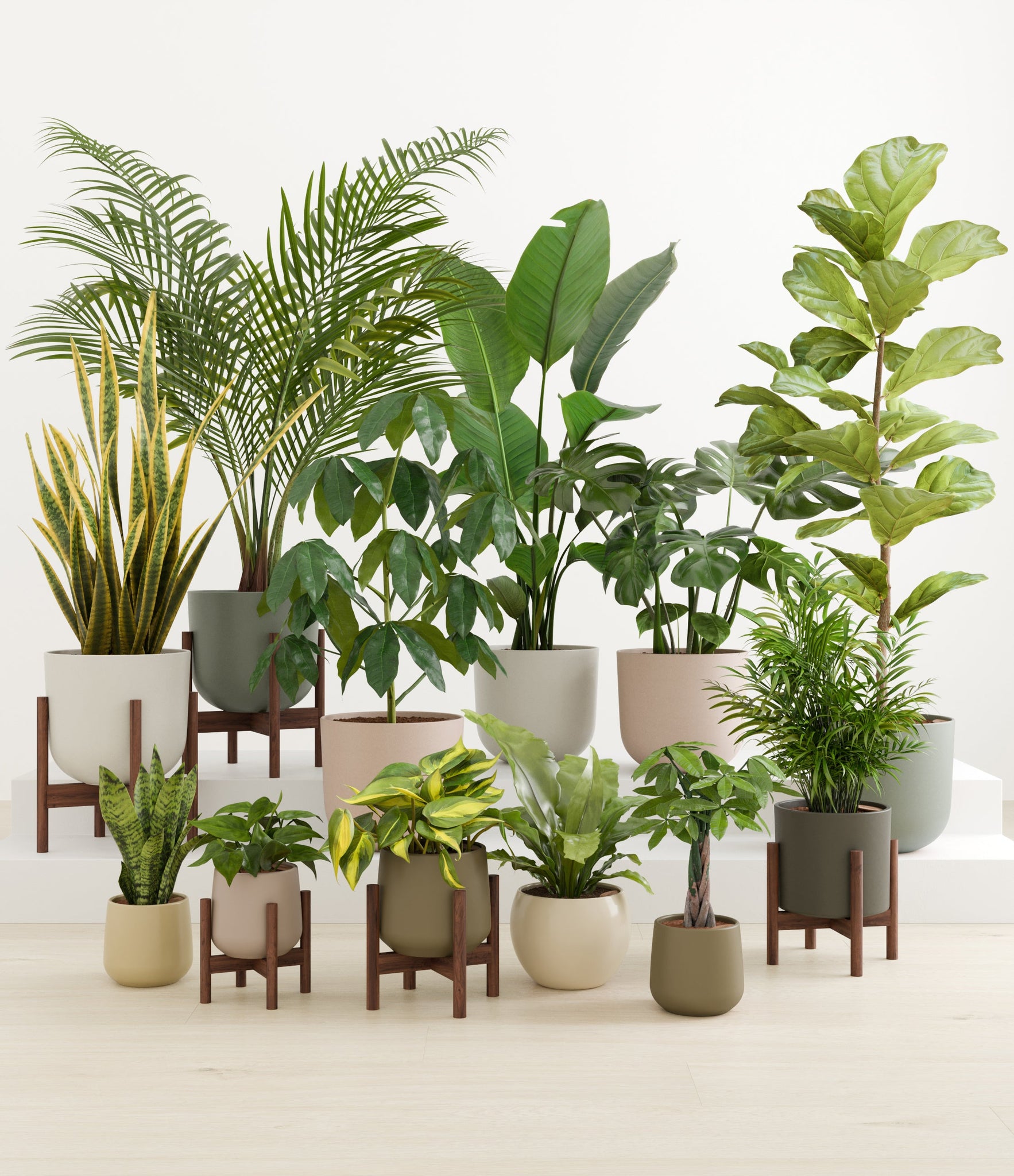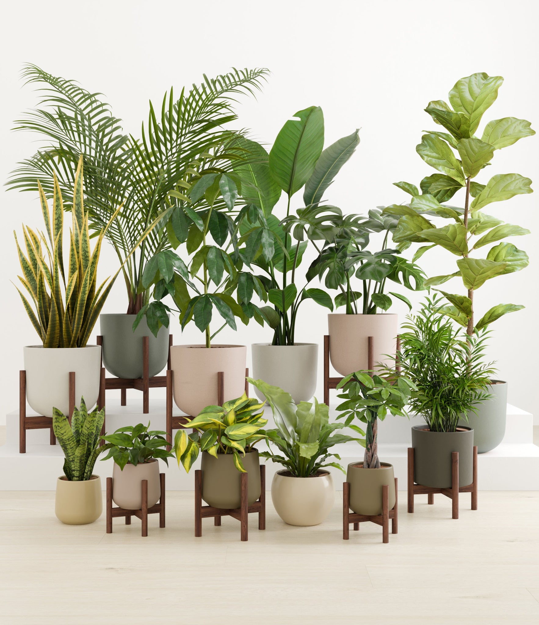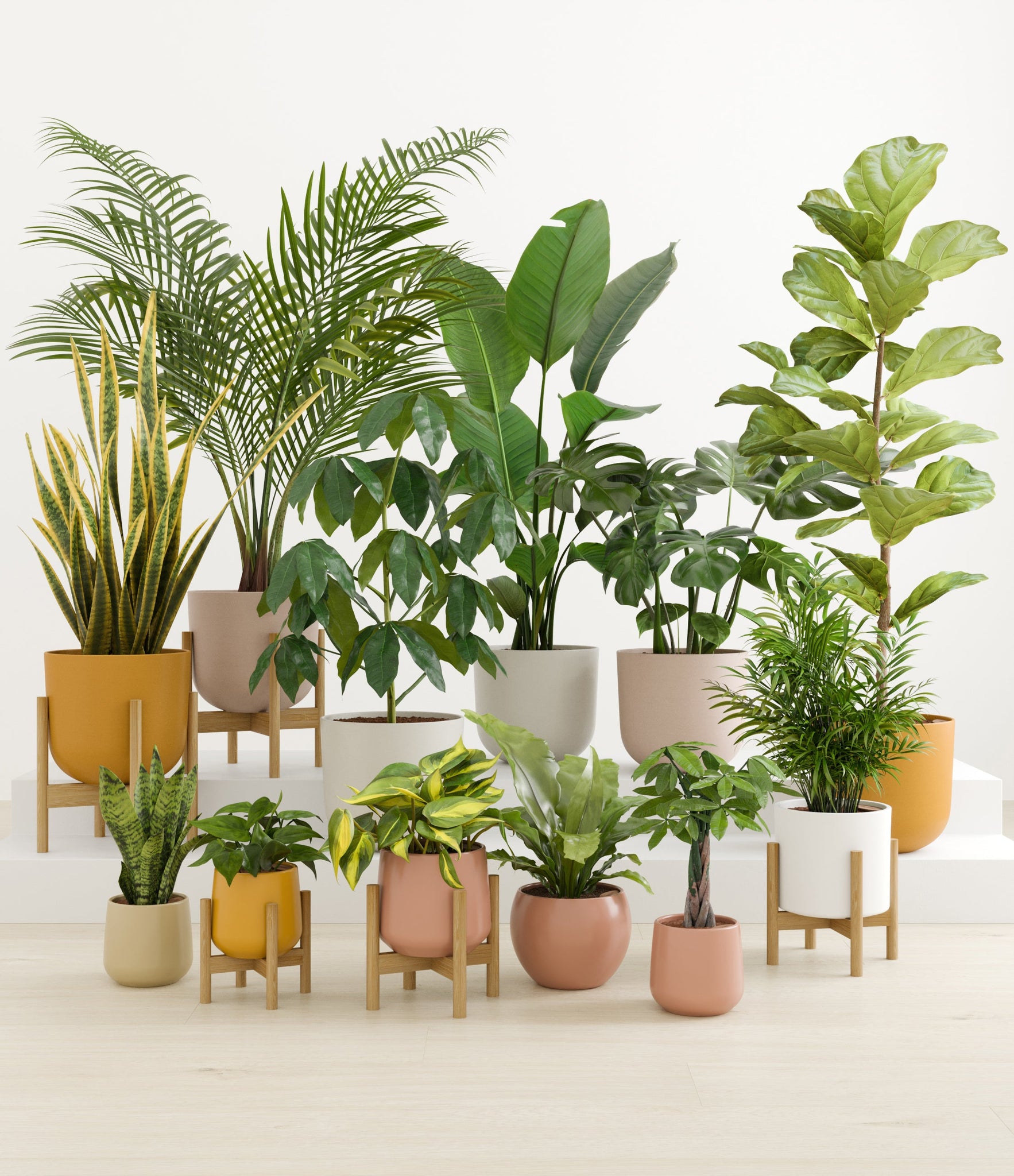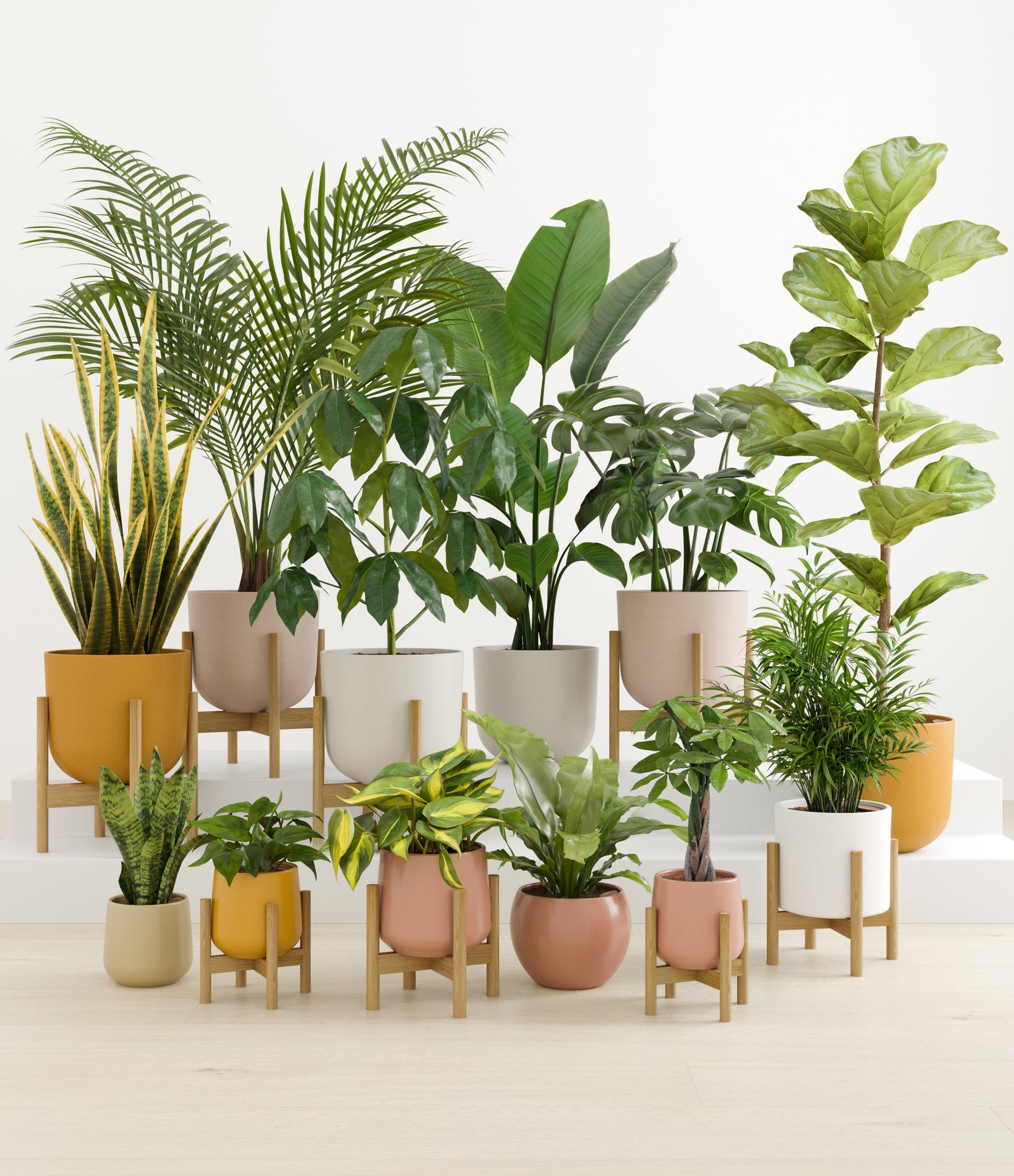 The set includes a small Money Tree symbolizing good fortune and prosperity; a small Heartleaf Philodendron wearing glossy heart-shaped foliage; a small Green Snake plant with mesmerizing swatches of silver and sage; a medium Parlor Palm – a must-have centerpiece; a medium Birds’ Nest Fern bursting with wavy fronds; a medium Philodendron Brazil covered in lime-colored variegation; a large Schefflera Amate that adds a perfect touch of the tropics to any space; a large Golden Snake plant with tall, narrow leaves; a large Monstera Deliciosa with breathtakingly foliage; a huge Majesty Palm with elegant fronds and graceful curves; a huge White Bird of Paradise that playfully hangs like birds in flight; and a huge Fiddle Leaf Fig Bush with massive lyre-shaped leaves.