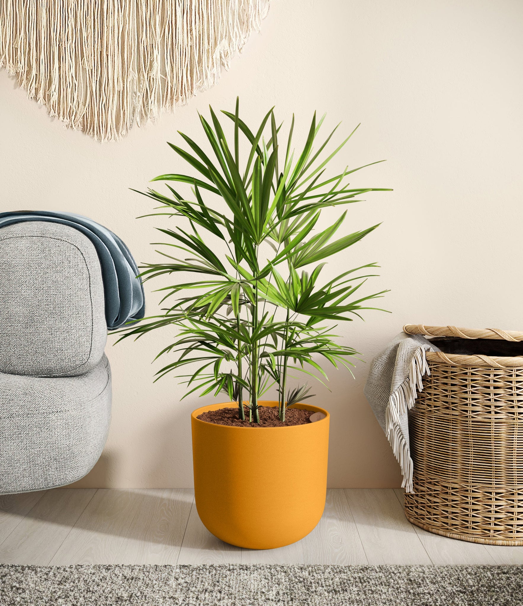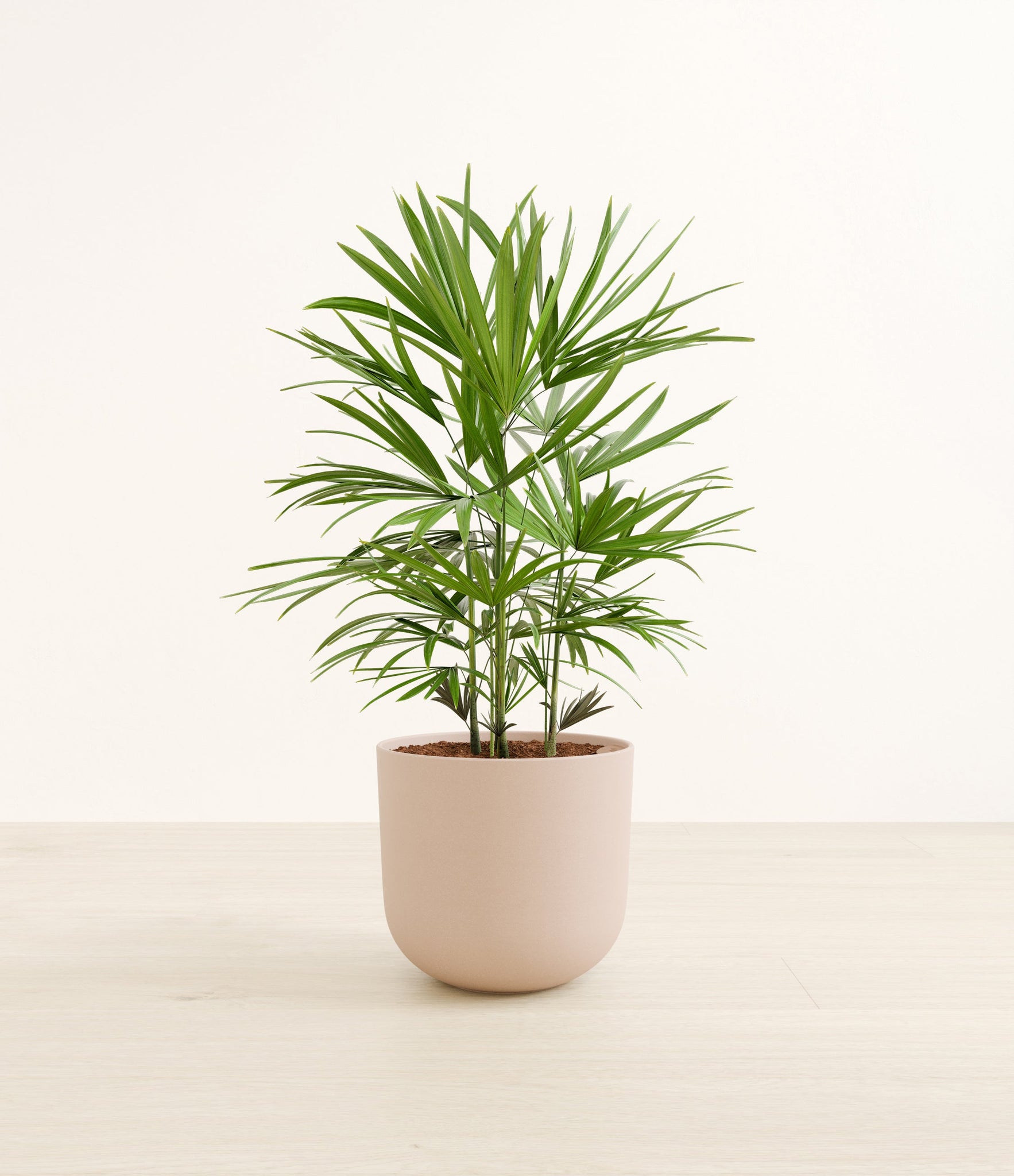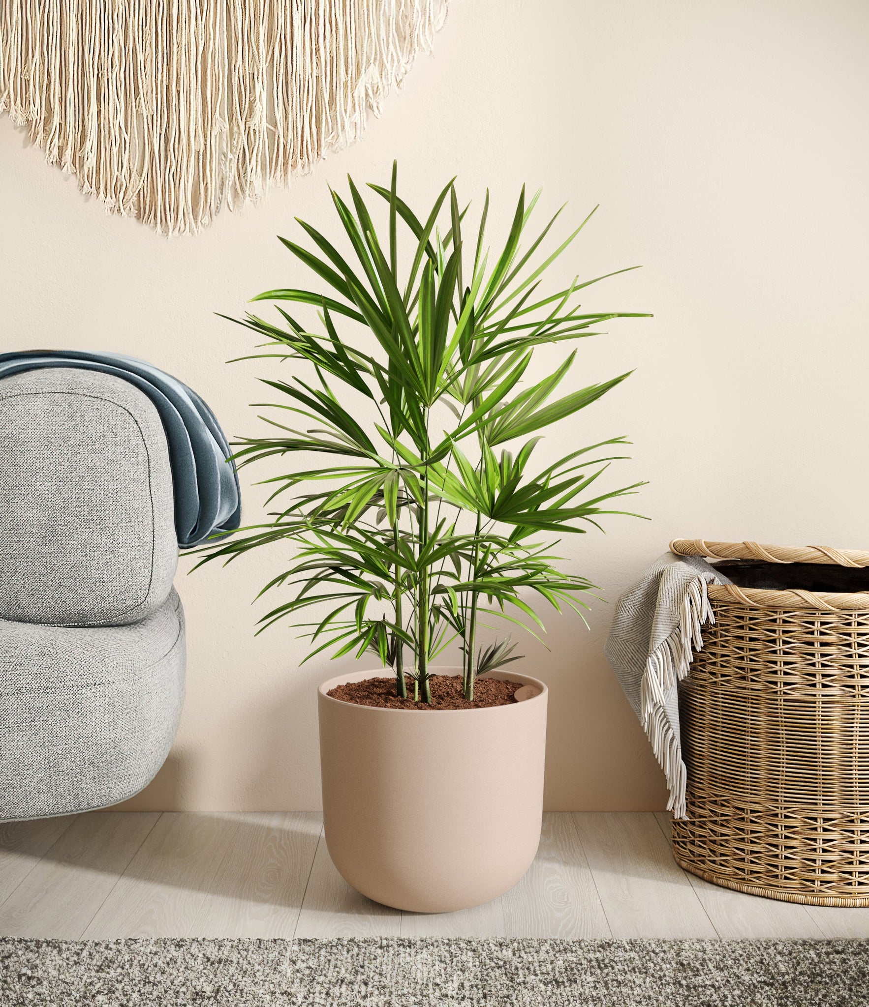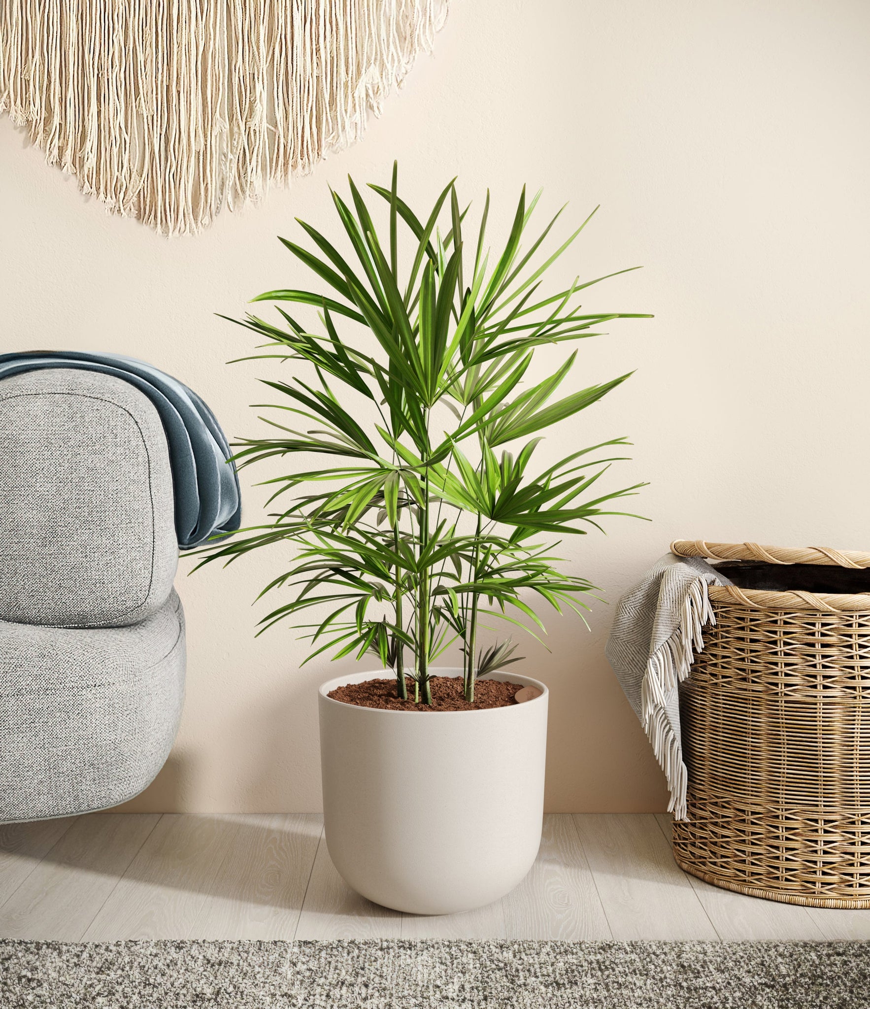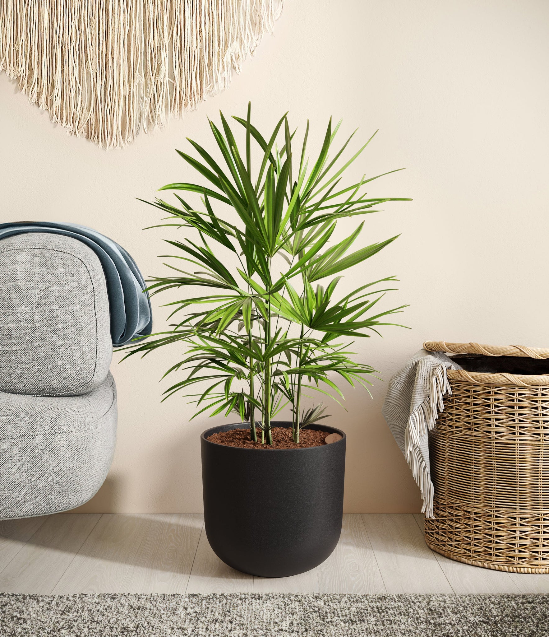 Native to the lush, shaded forests of Asia, the Lady Palm (Rhapis excelsa) is distinguished by its broad, fan-shaped foliage. Celebrated for its adaptability to various indoor environments and its exceptional air-purifying qualities, this palm introduces natural sophistication to home and office settings. Its broad, fan-shaped leaves elegantly adapt to any home or office settings. Each frond is divided into wide, glossy segments that emerge from multiple sturdy canes, creating a dense, lush appearance. This palm not only enhances indoor air quality but also adds a structural element to its surroundings, making it a favored plant among those who appreciate both its beauty and its functional benefits.