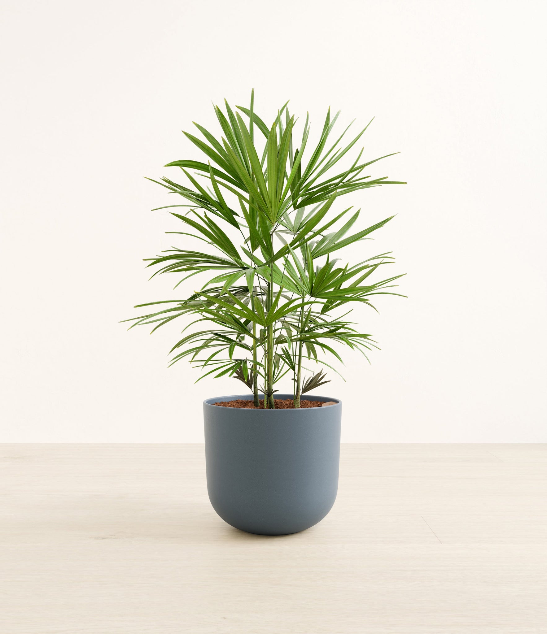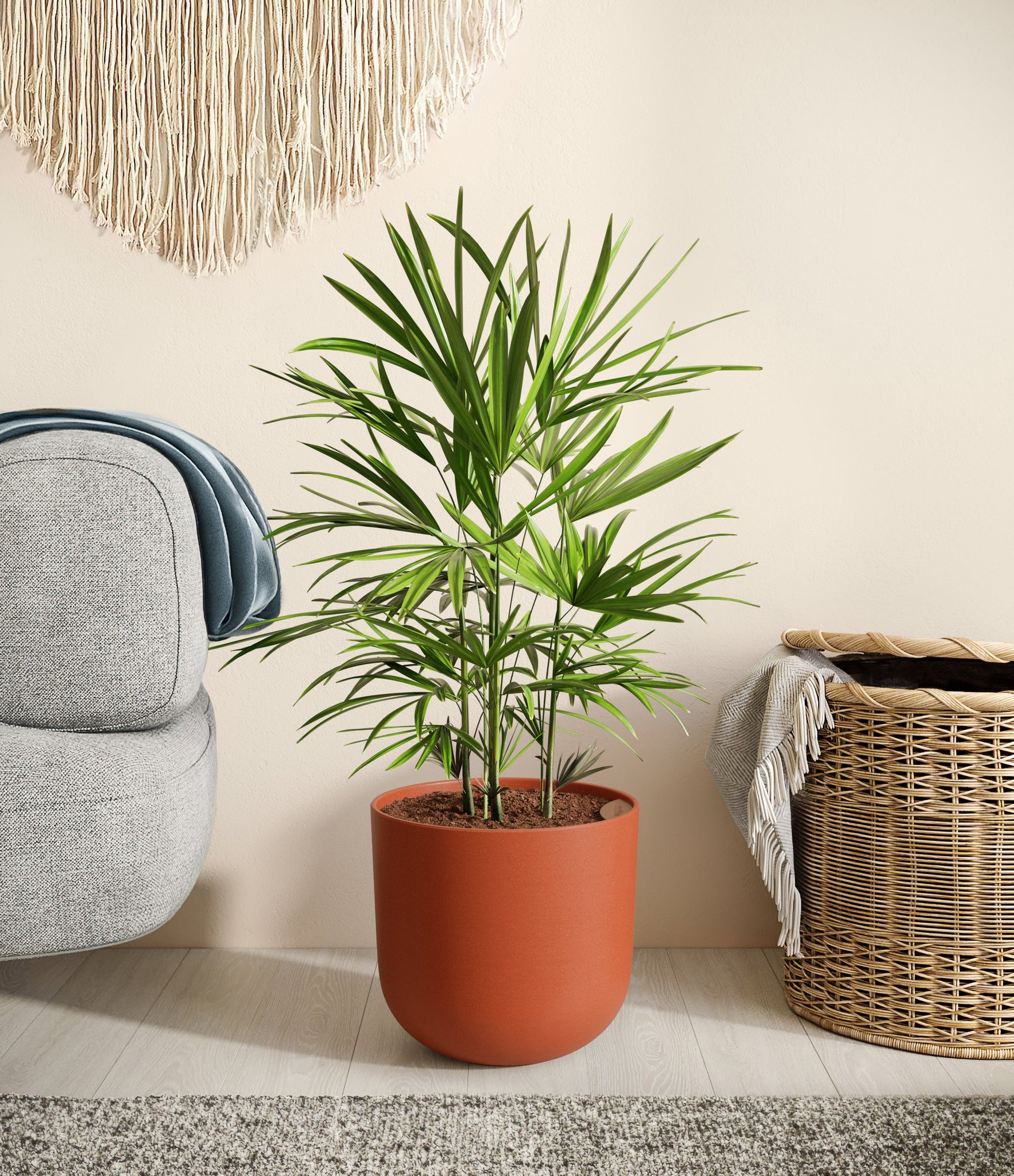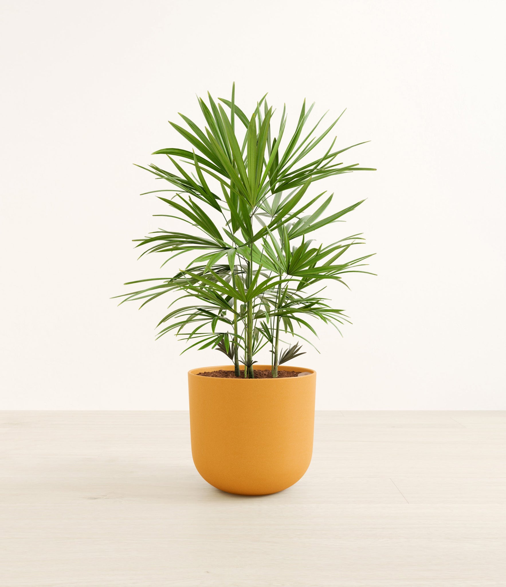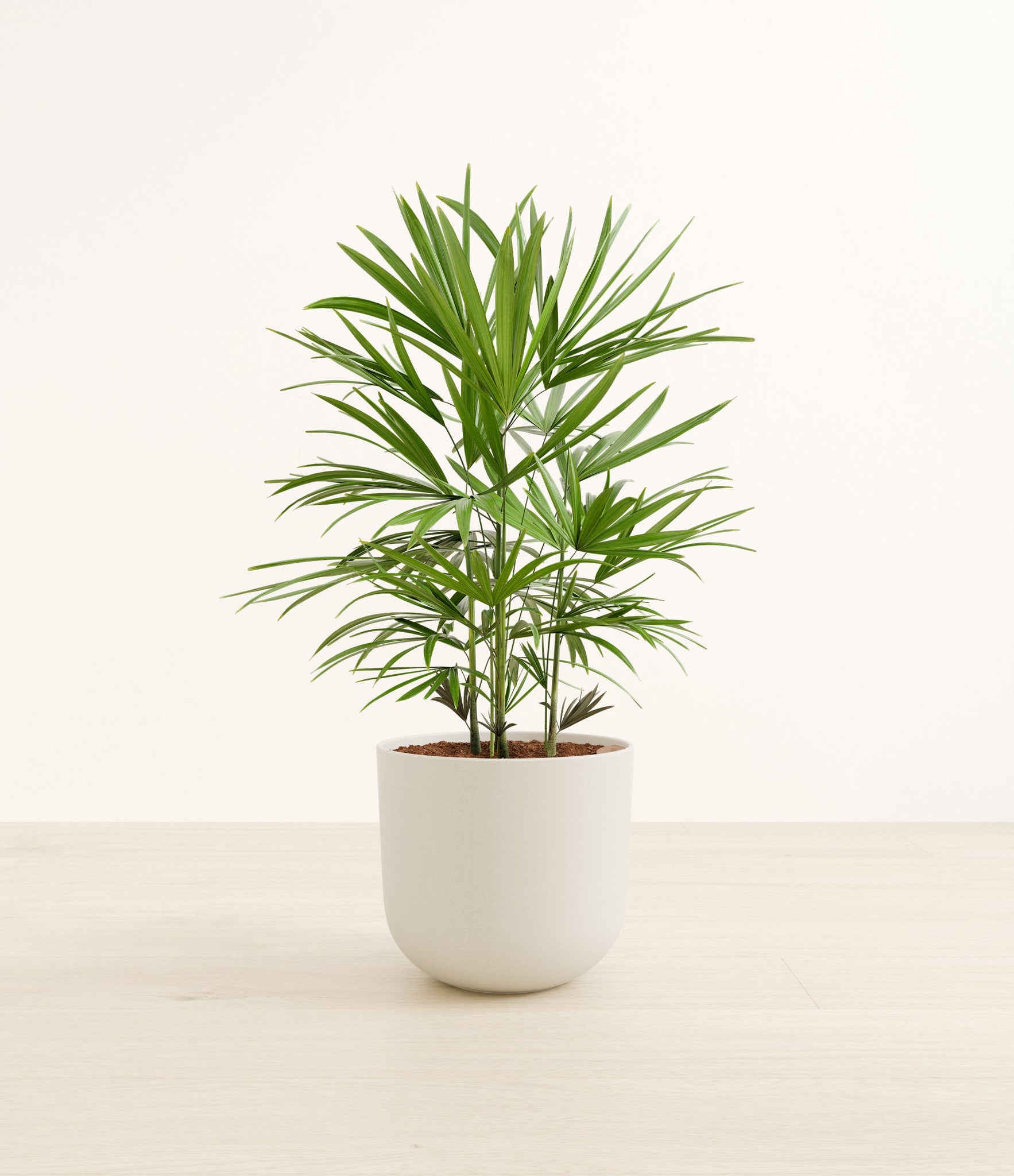 Native to the lush, shaded forests of Asia, the Lady Palm (Rhapis excelsa) is distinguished by its broad, fan-shaped foliage. Celebrated for its adaptability to various indoor environments and its exceptional air-purifying qualities, this palm introduces natural sophistication to home and office settings. Its broad, fan-shaped leaves elegantly adapt to any home or office settings. Each frond is divided into wide, glossy segments that emerge from multiple sturdy canes, creating a dense, lush appearance. This palm not only enhances indoor air quality but also adds a structural element to its surroundings, making it a favored plant among those who appreciate both its beauty and its functional benefits.
