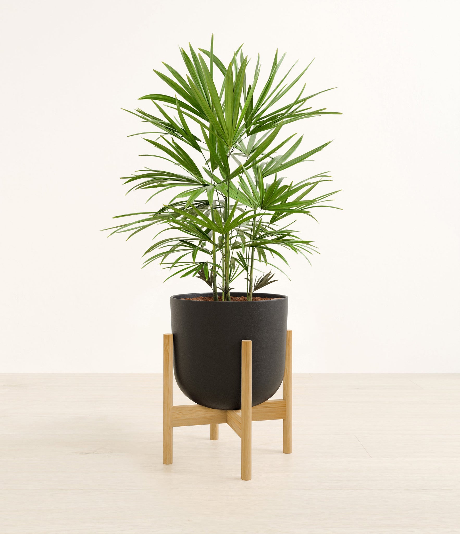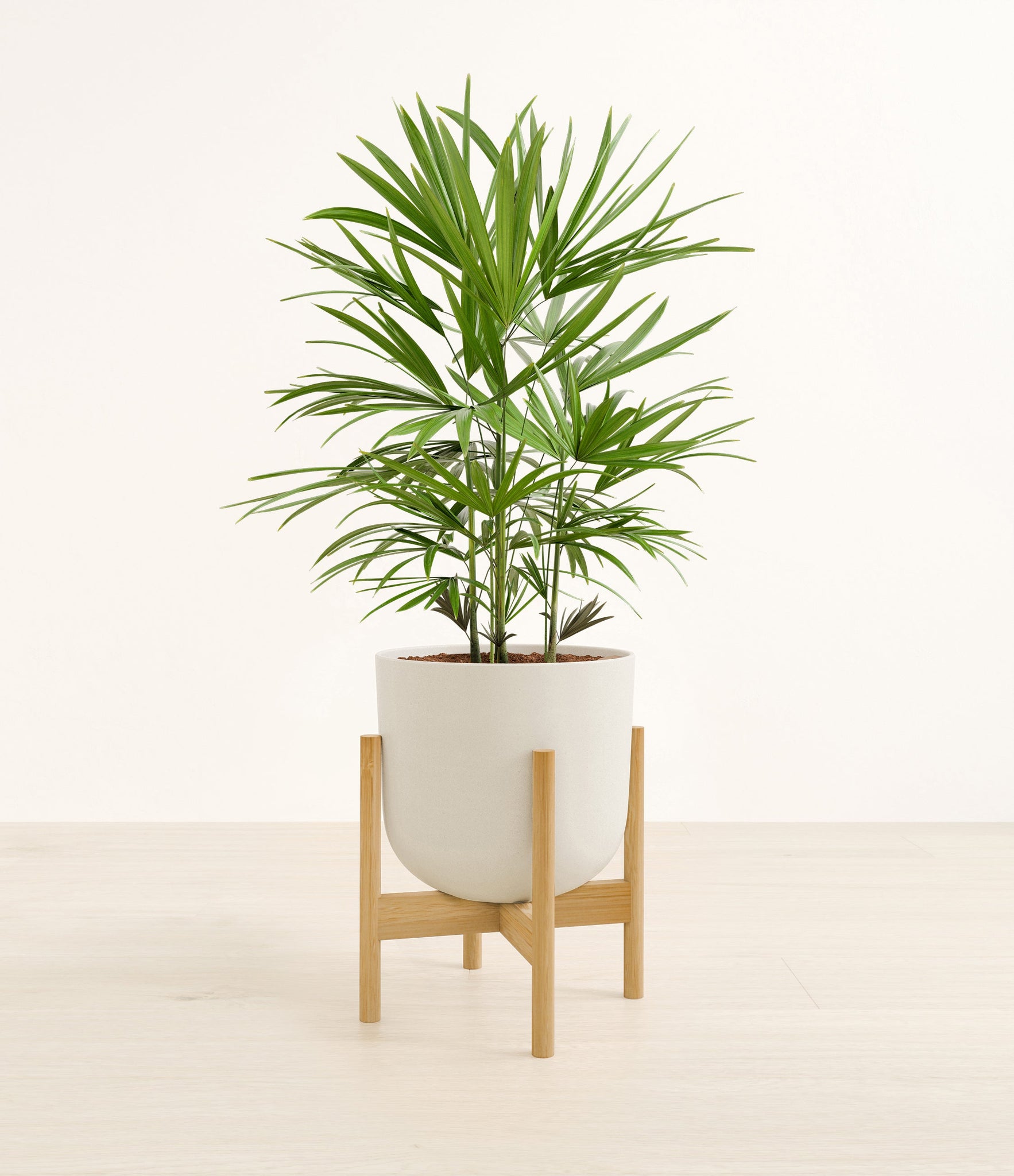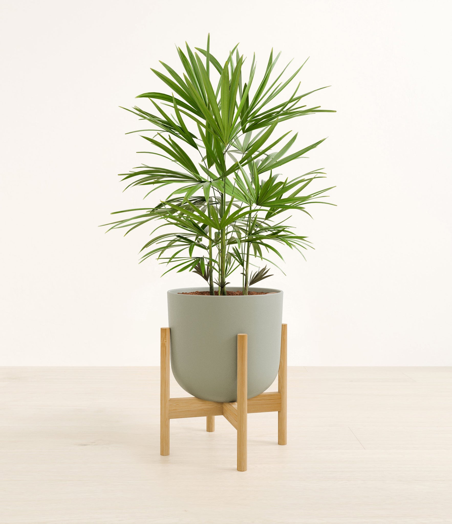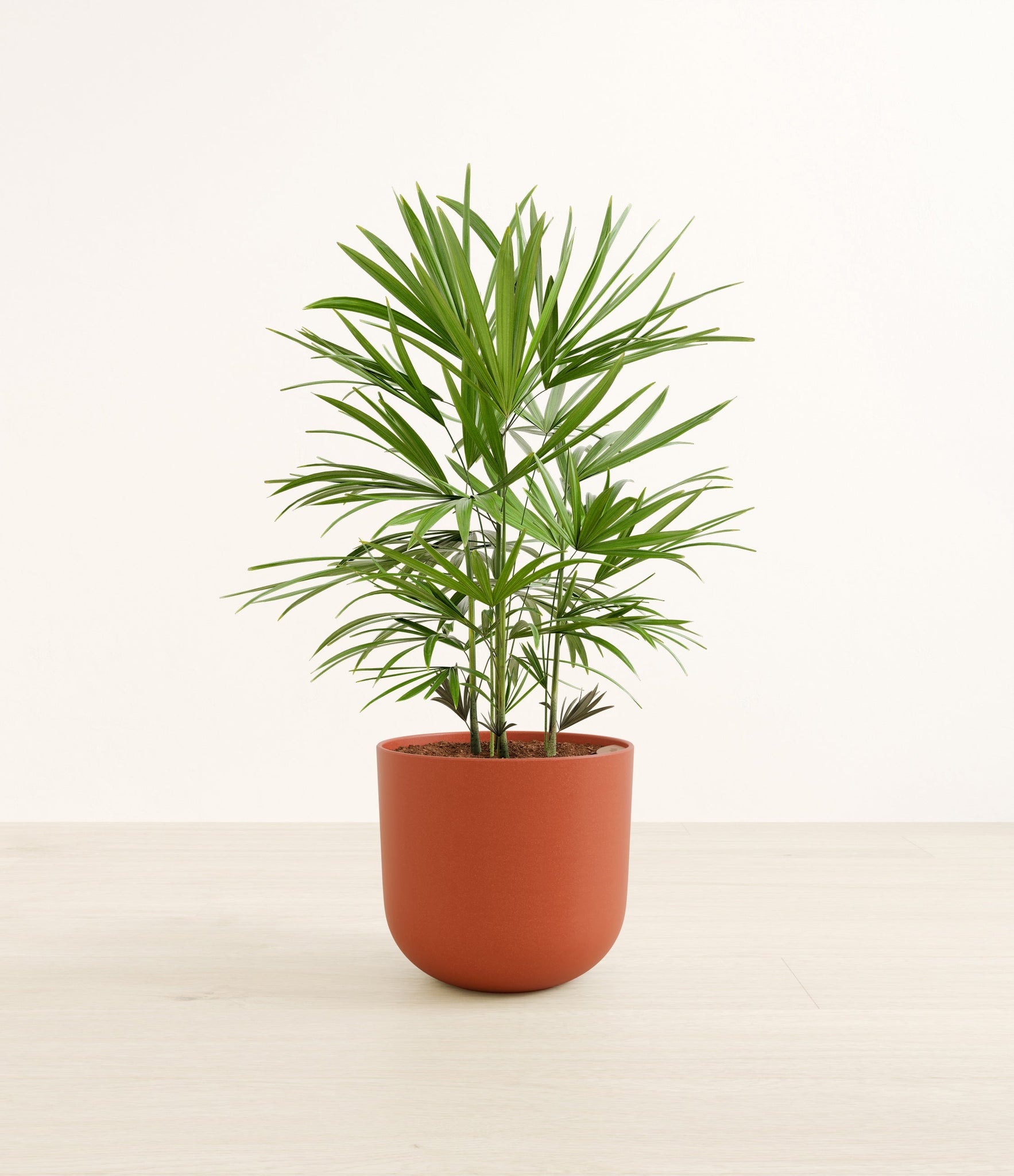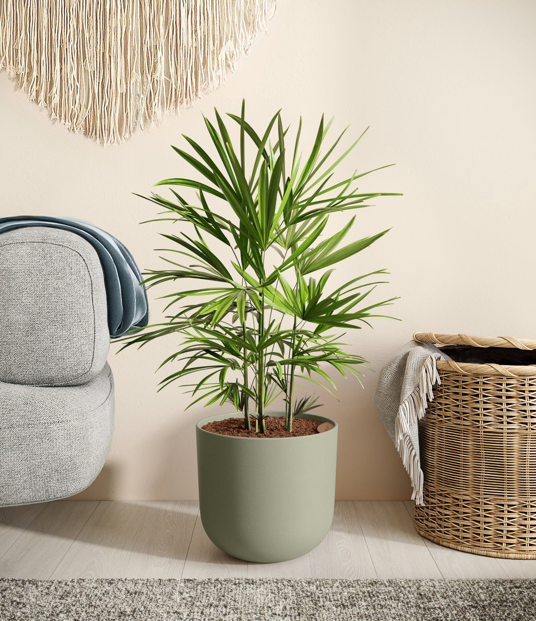 Native to the lush, shaded forests of Asia, the Lady Palm (Rhapis excelsa) is distinguished by its broad, fan-shaped foliage. Celebrated for its adaptability to various indoor environments and its exceptional air-purifying qualities, this palm introduces natural sophistication to home and office settings. Its broad, fan-shaped leaves elegantly adapt to any home or office settings. Each frond is divided into wide, glossy segments that emerge from multiple sturdy canes, creating a dense, lush appearance. This palm not only enhances indoor air quality but also adds a structural element to its surroundings, making it a favored plant among those who appreciate both its beauty and its functional benefits.