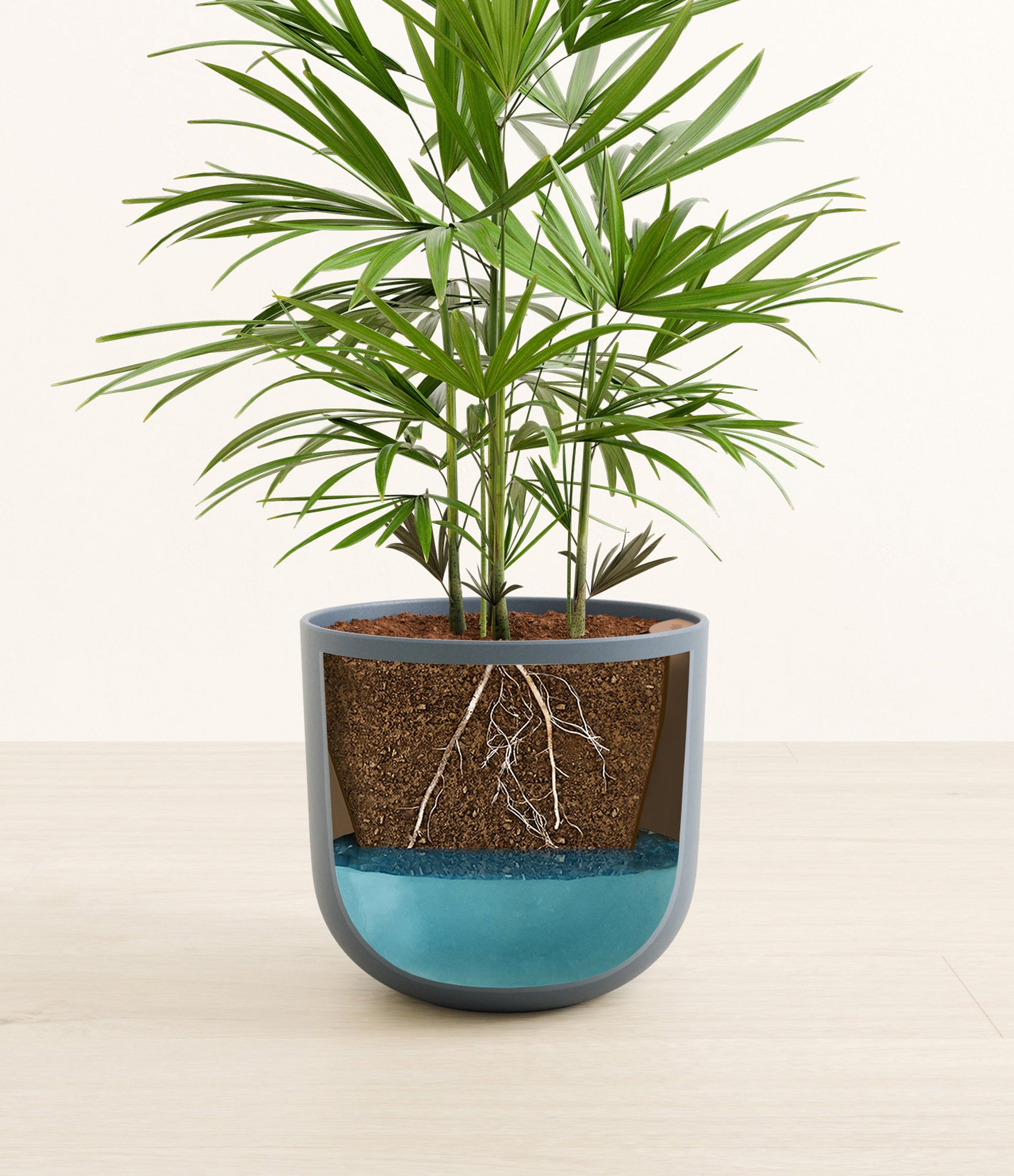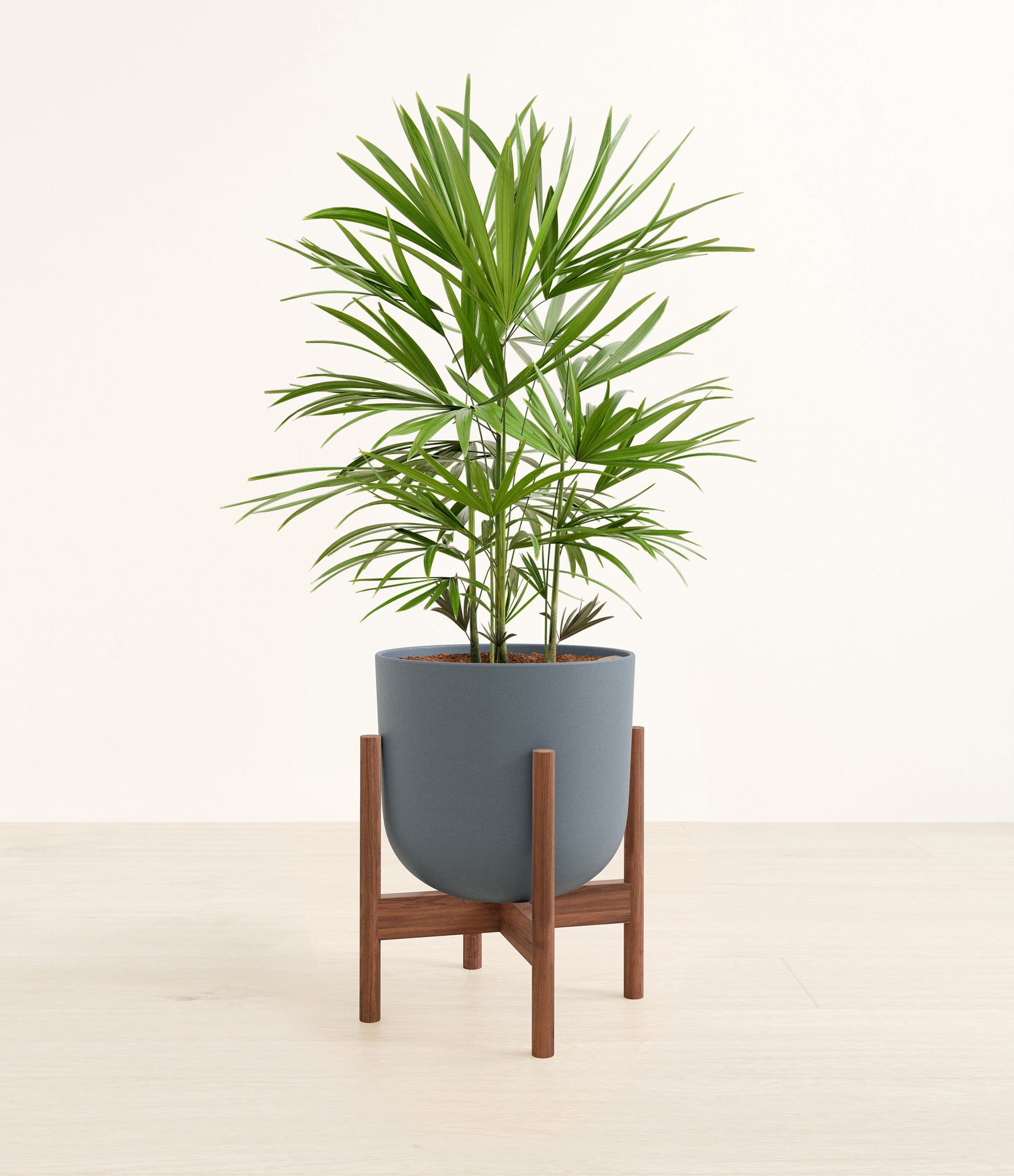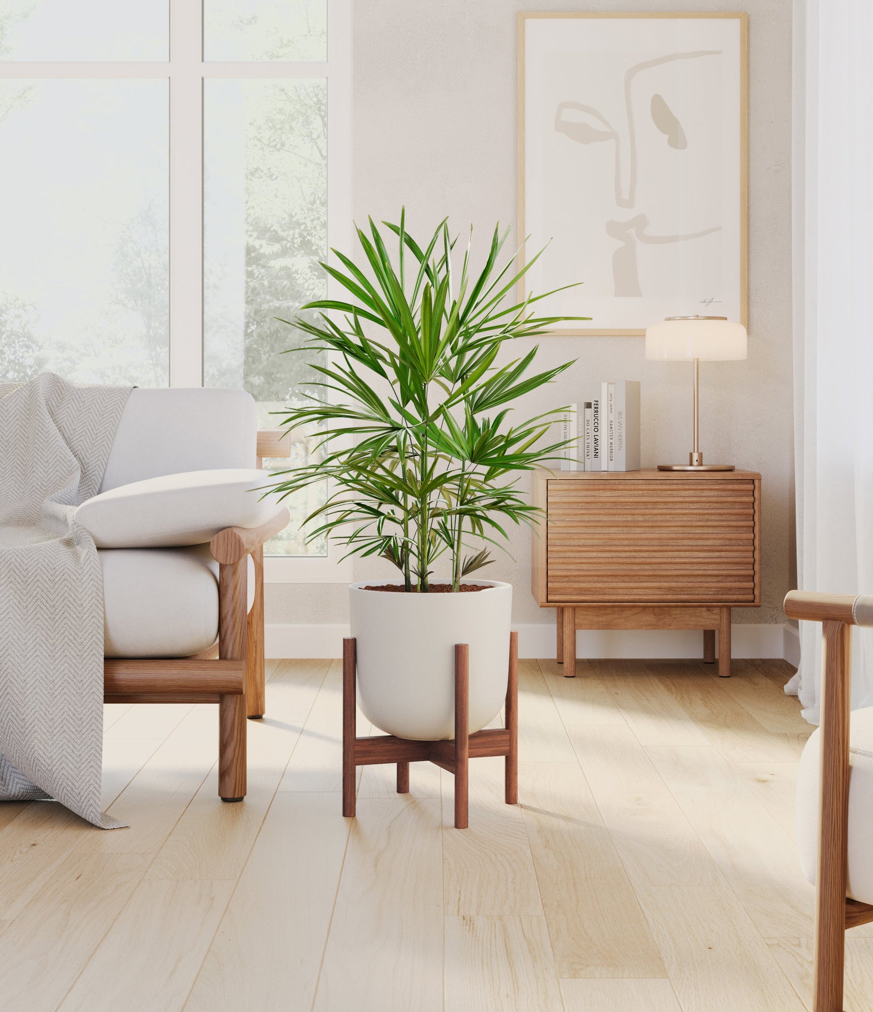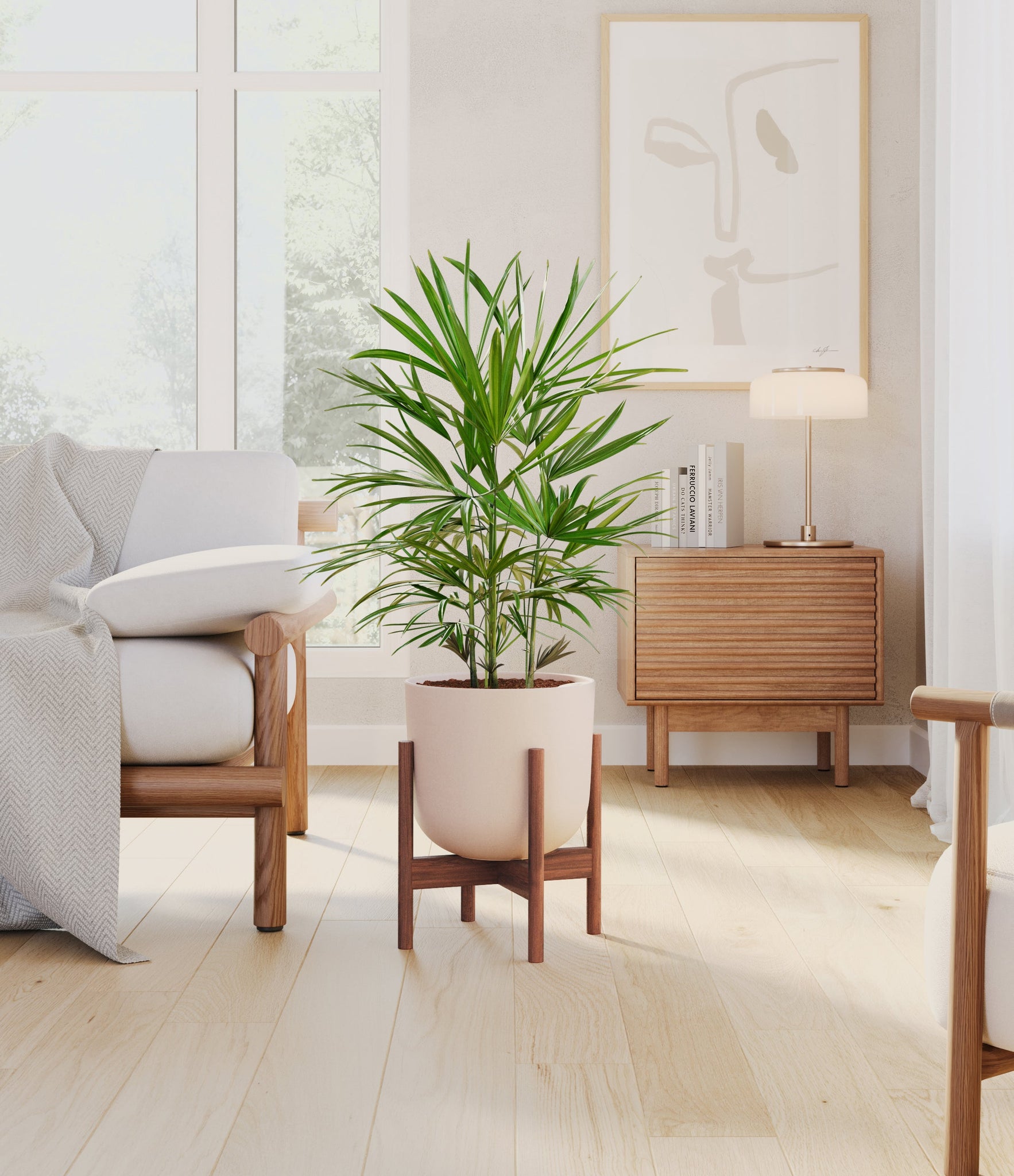 Native to the lush, shaded forests of Asia, the Lady Palm (Rhapis excelsa) is distinguished by its broad, fan-shaped foliage. Celebrated for its adaptability to various indoor environments and its exceptional air-purifying qualities, this palm introduces natural sophistication to home and office settings. Its broad, fan-shaped leaves elegantly adapt to any home or office settings. Each frond is divided into wide, glossy segments that emerge from multiple sturdy canes, creating a dense, lush appearance. This palm not only enhances indoor air quality but also adds a structural element to its surroundings, making it a favored plant among those who appreciate both its beauty and its functional benefits.