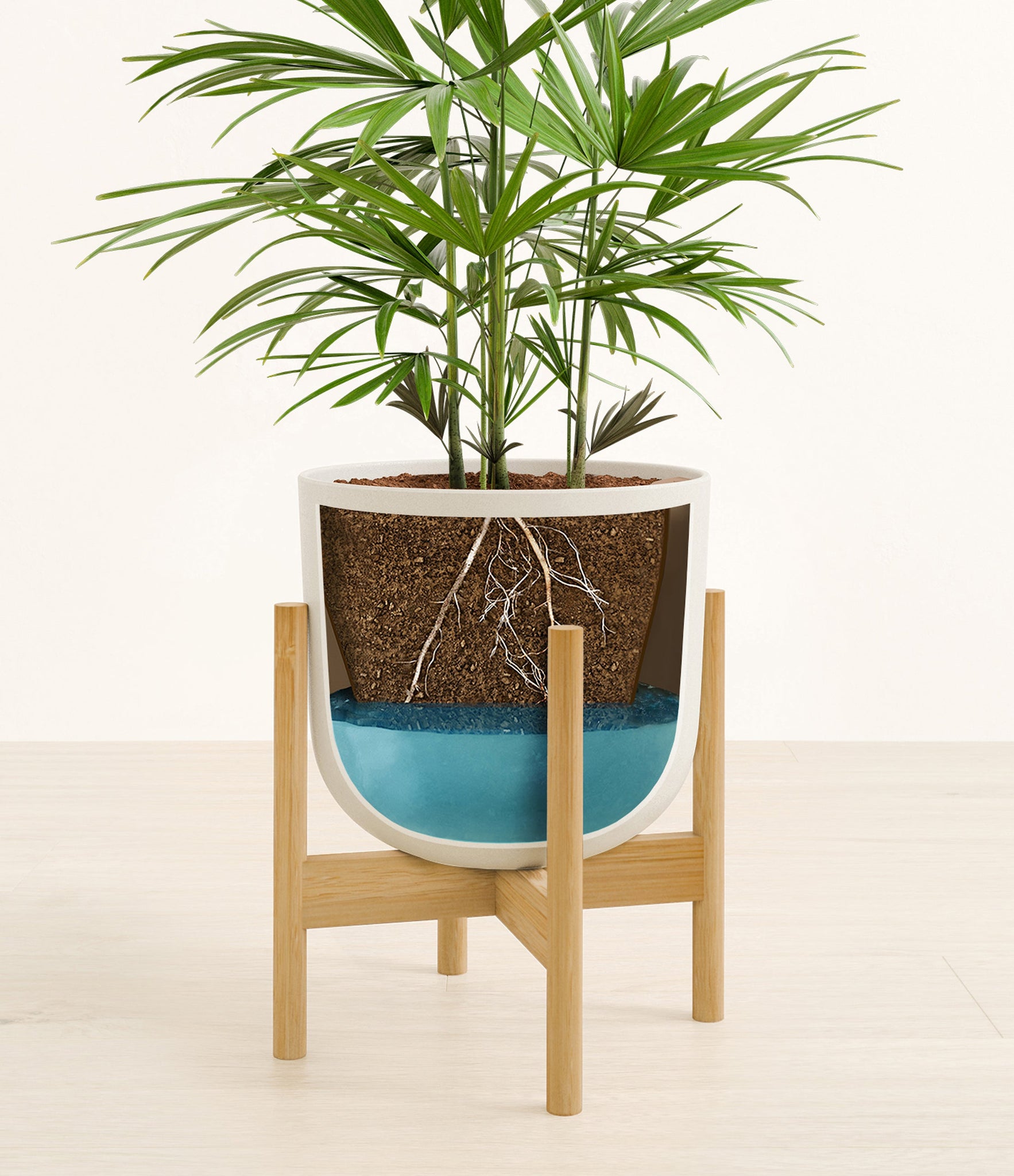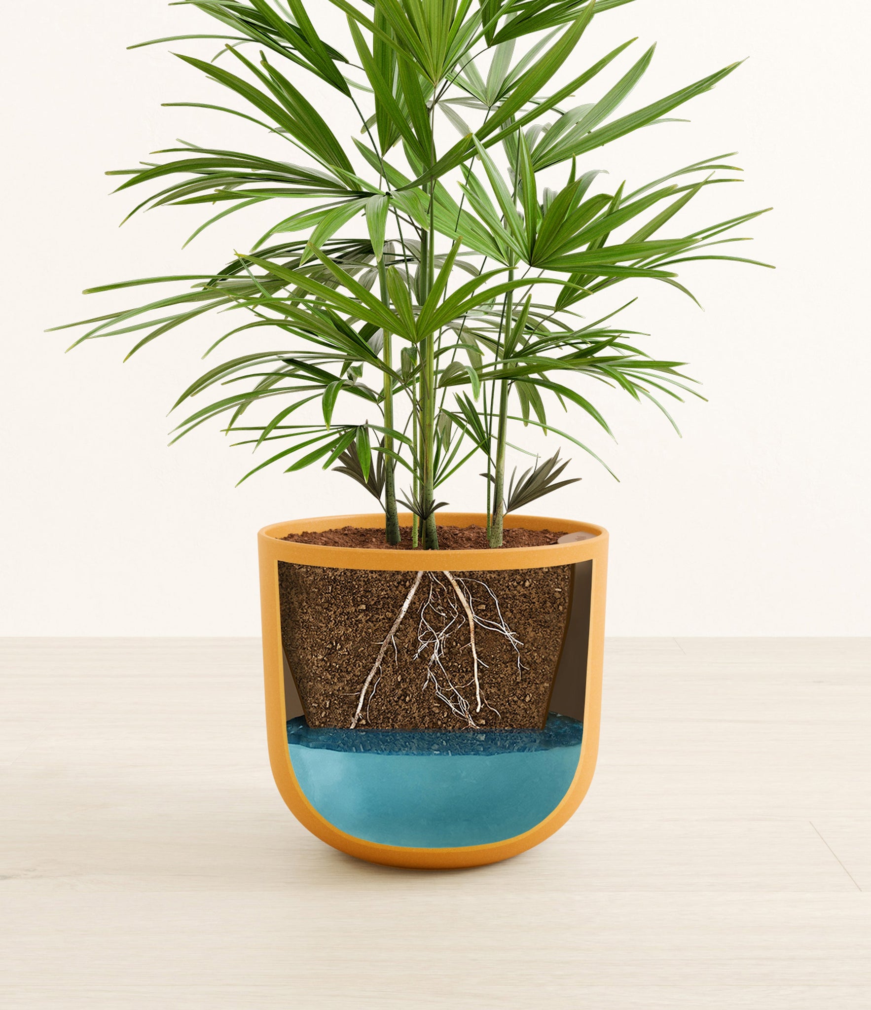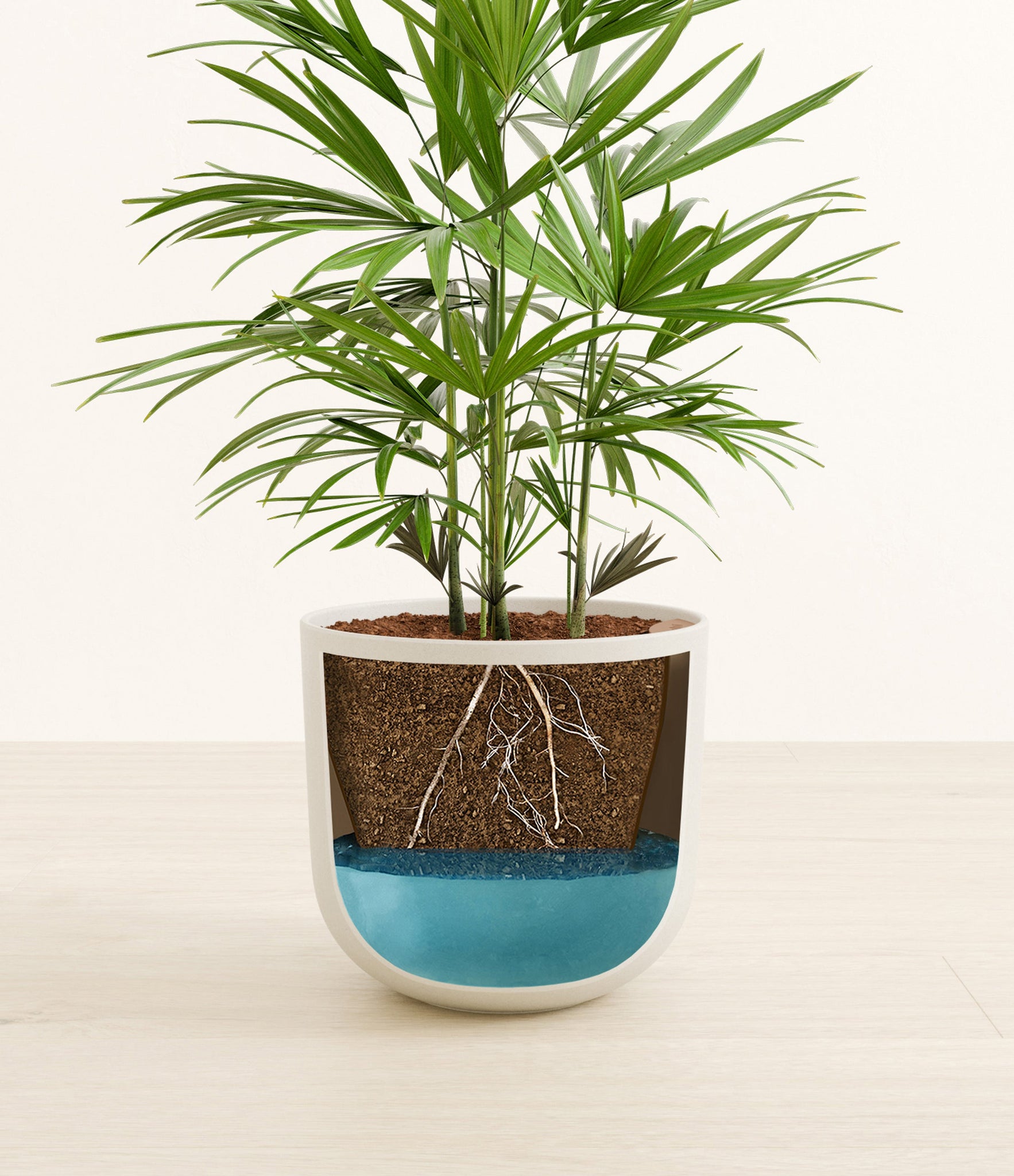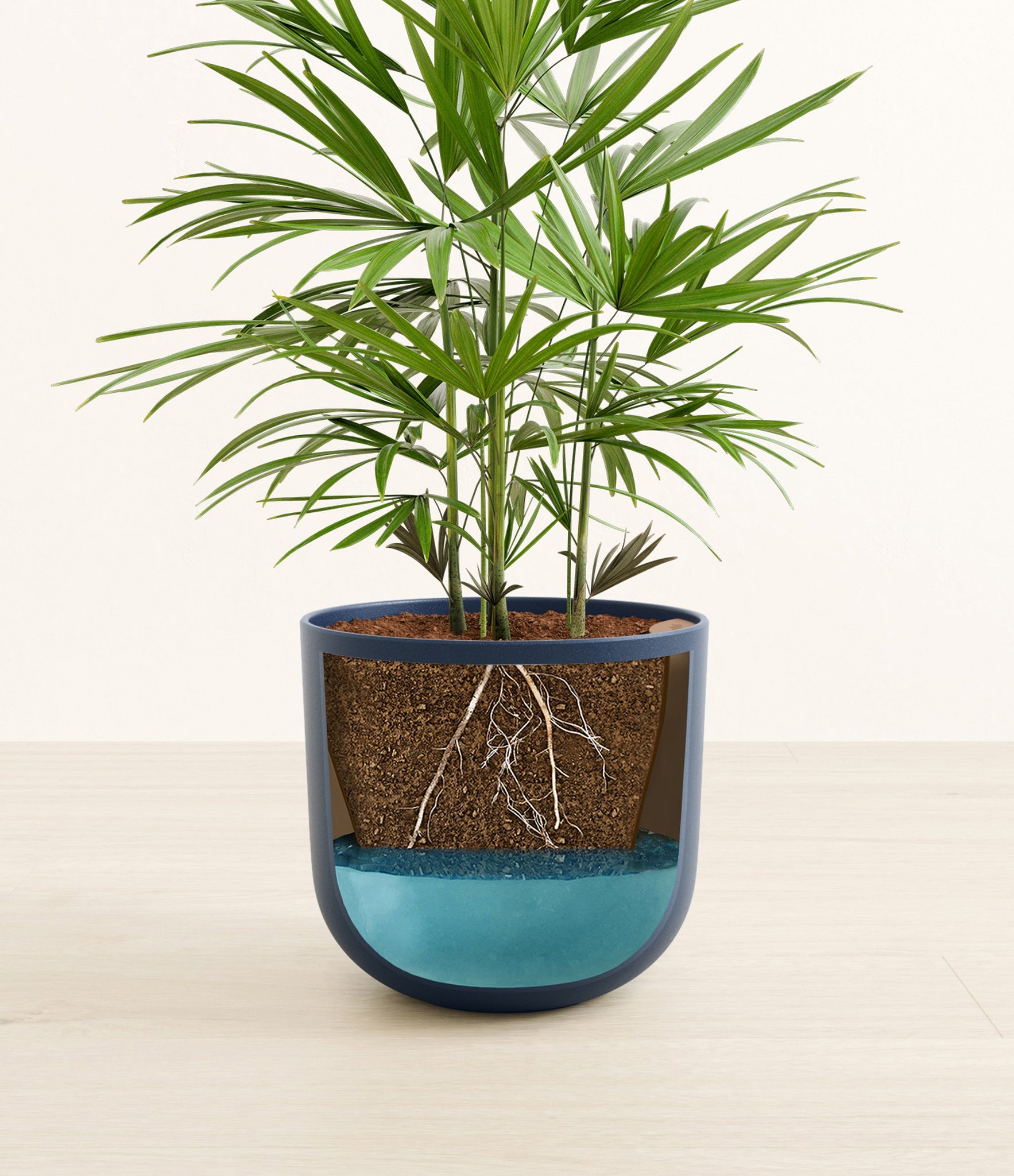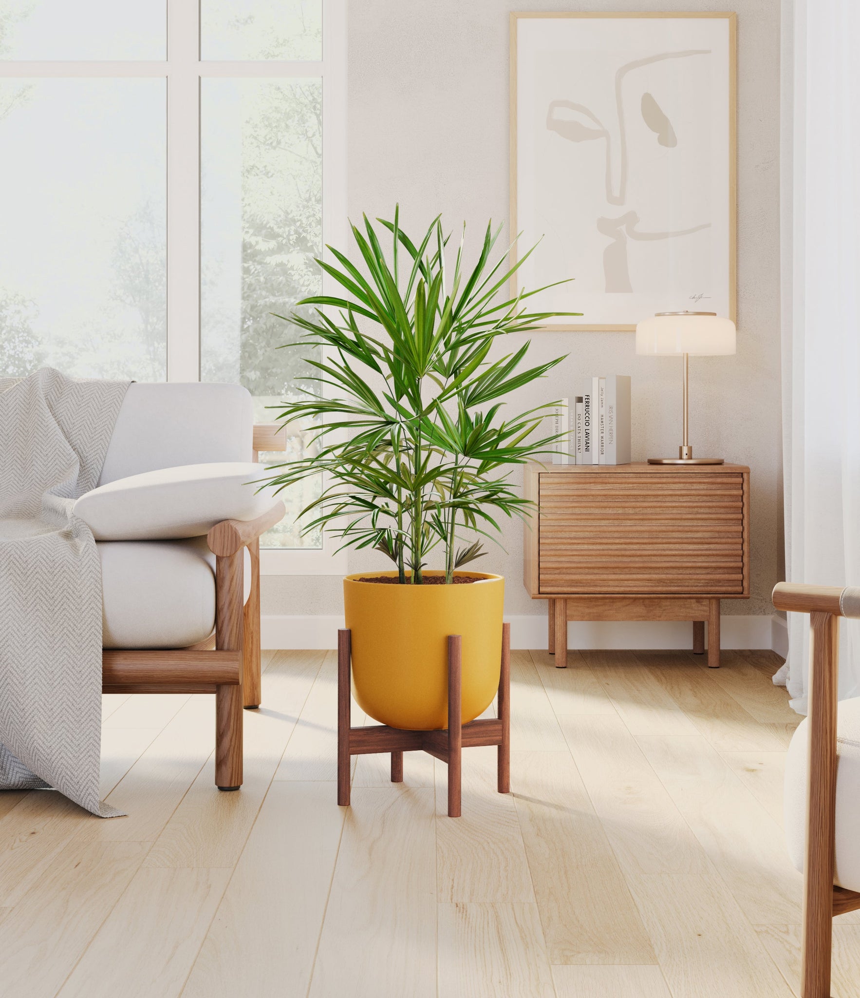 Native to the lush, shaded forests of Asia, the Lady Palm (Rhapis excelsa) is distinguished by its broad, fan-shaped foliage. Celebrated for its adaptability to various indoor environments and its exceptional air-purifying qualities, this palm introduces natural sophistication to home and office settings. Its broad, fan-shaped leaves elegantly adapt to any home or office settings. Each frond is divided into wide, glossy segments that emerge from multiple sturdy canes, creating a dense, lush appearance. This palm not only enhances indoor air quality but also adds a structural element to its surroundings, making it a favored plant among those who appreciate both its beauty and its functional benefits.