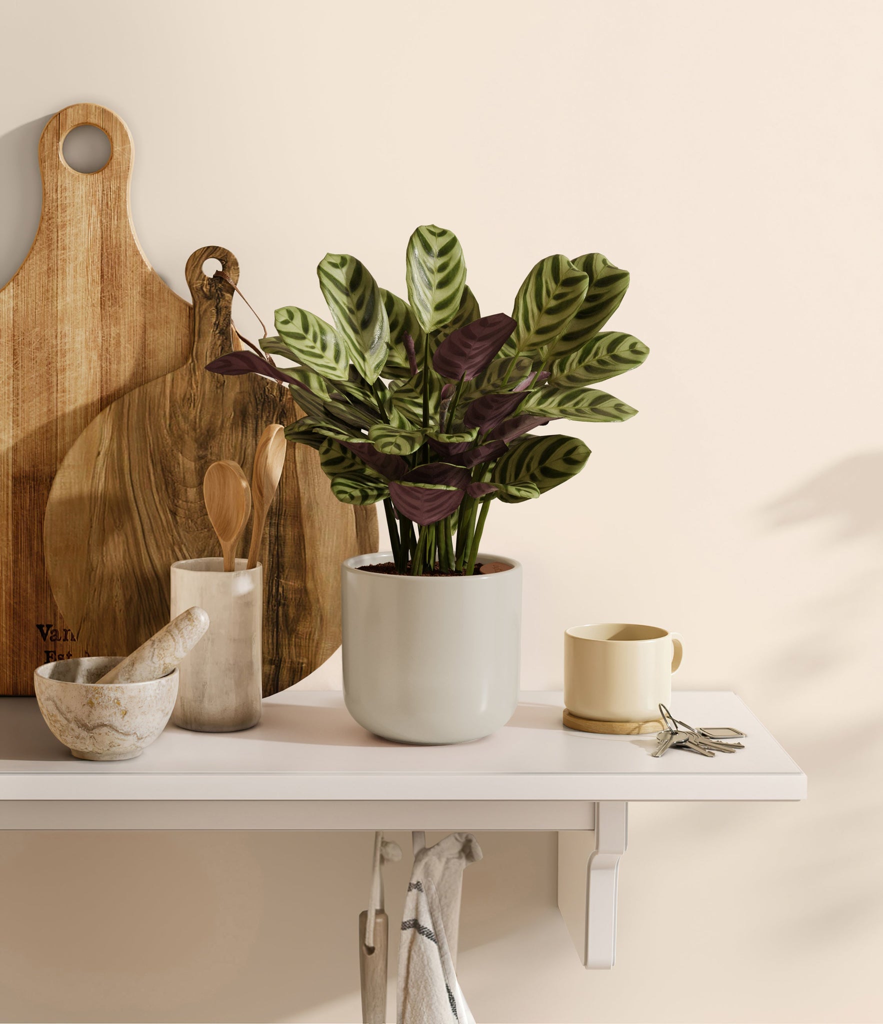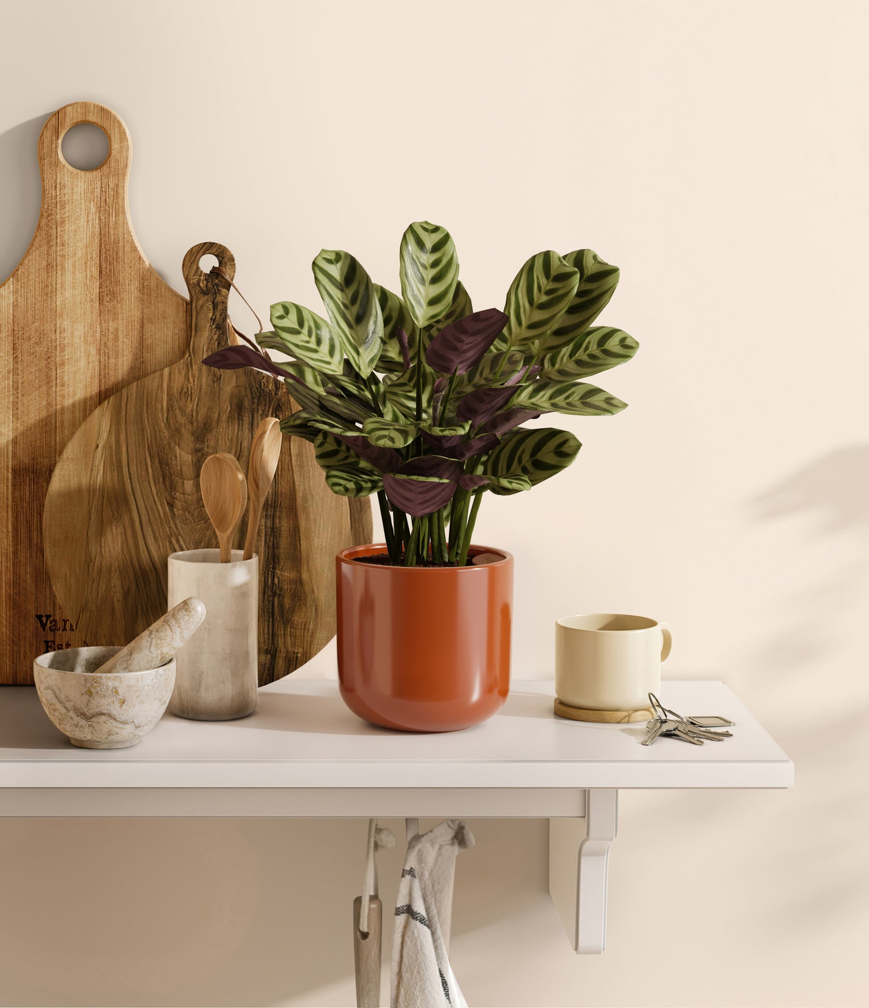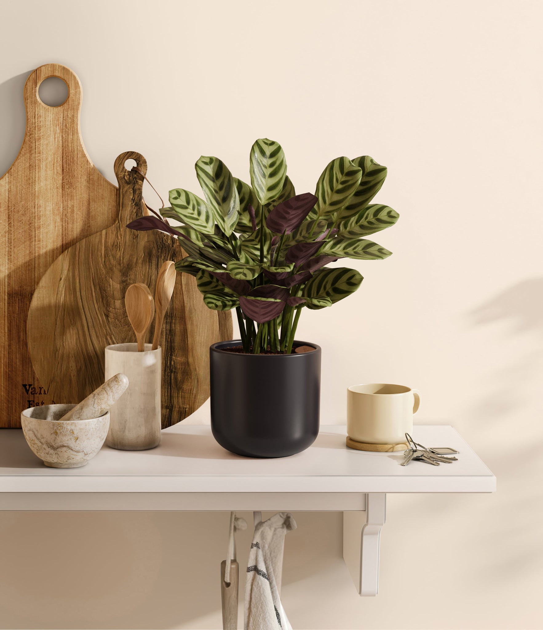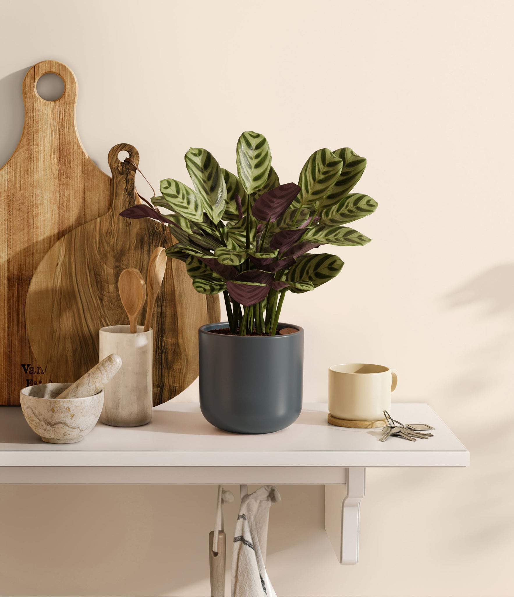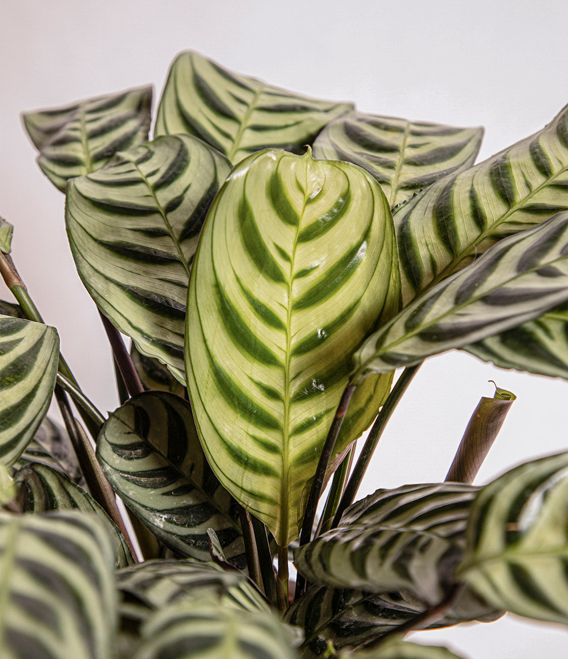 Native to the Amazonian jungles of South America, Calathea Marxii wears large emblem-shaped leaves, with bold strokes of forest green atop a deep burgundy underside. It belongs to the Marantaceae family, known as ‘Prayer Plants’, which much like humans and unlike most plants, have a wake-and-sleep cycle according to a circadian rhythm. This means the leaves move upwards during the night and downwards throughout the day in search of the sun.