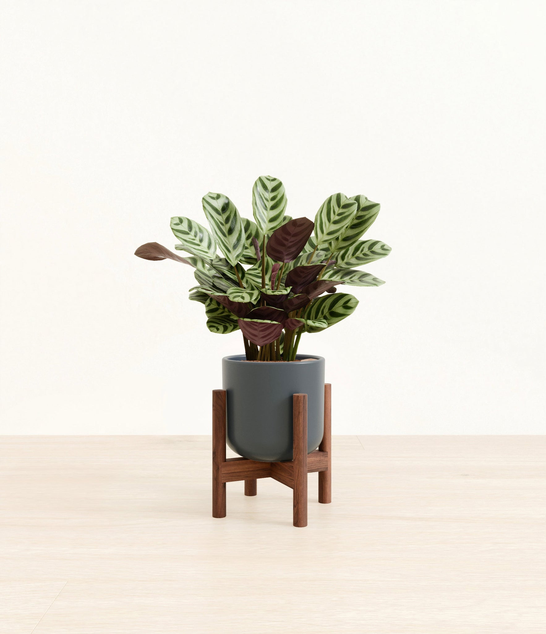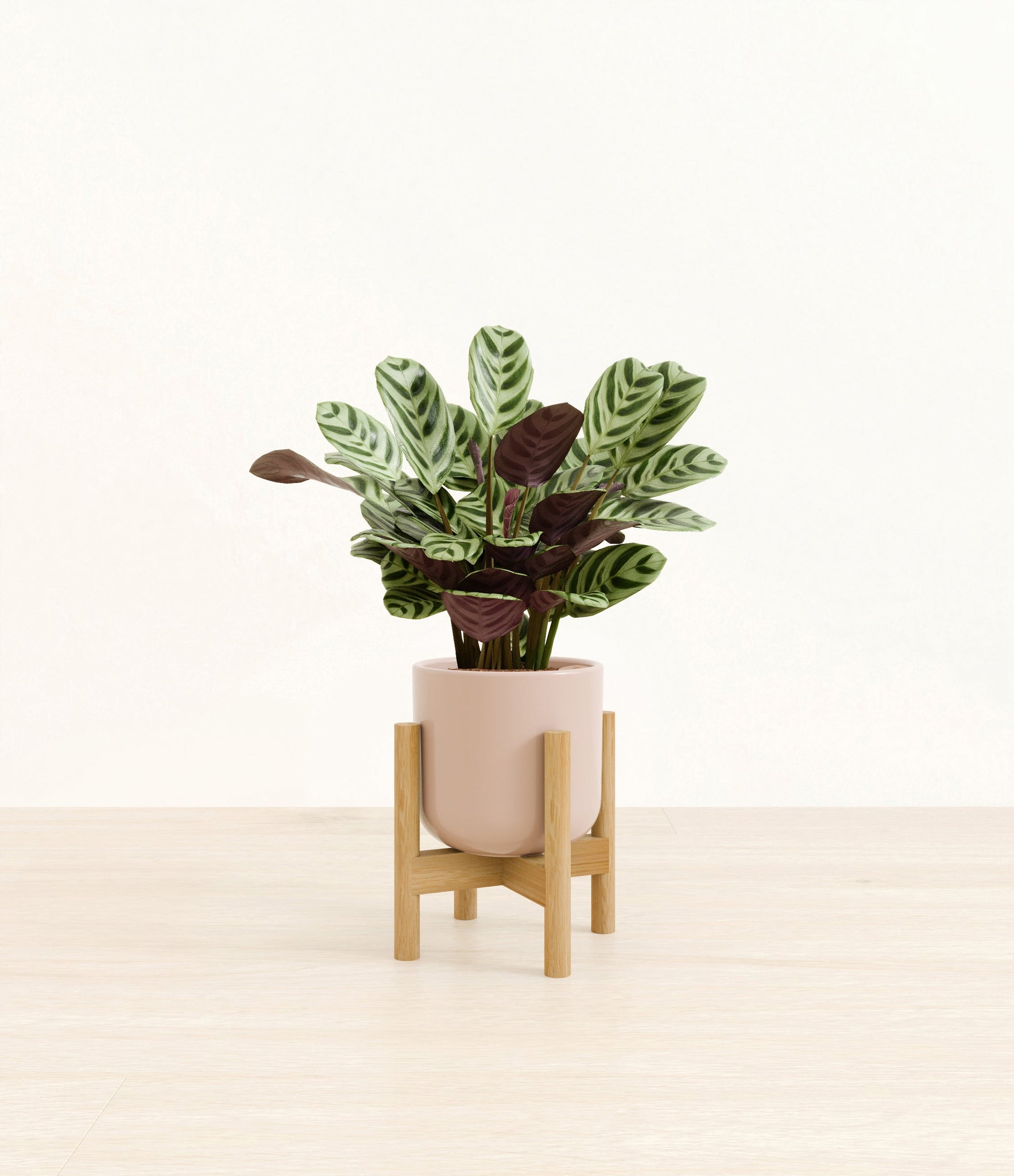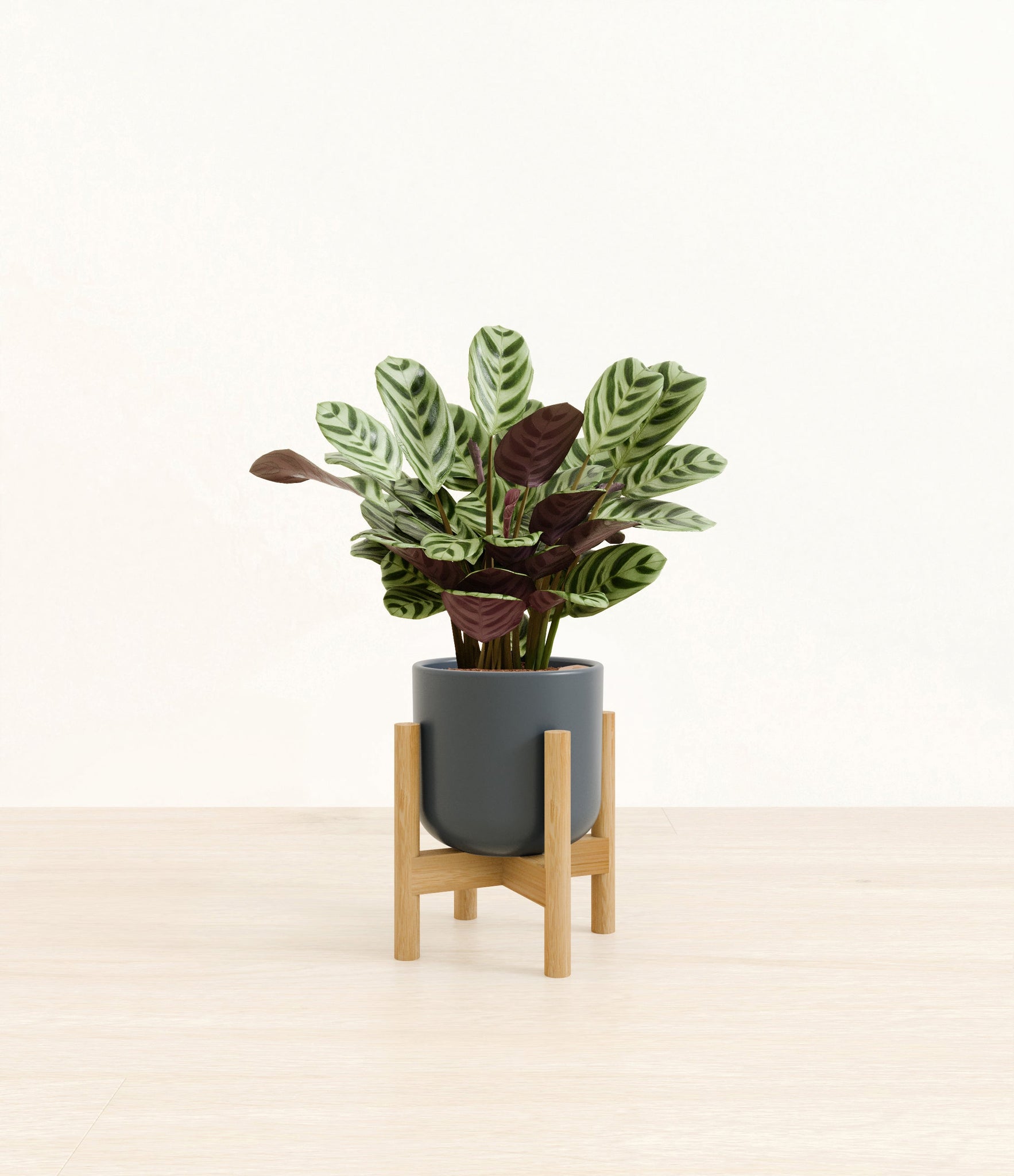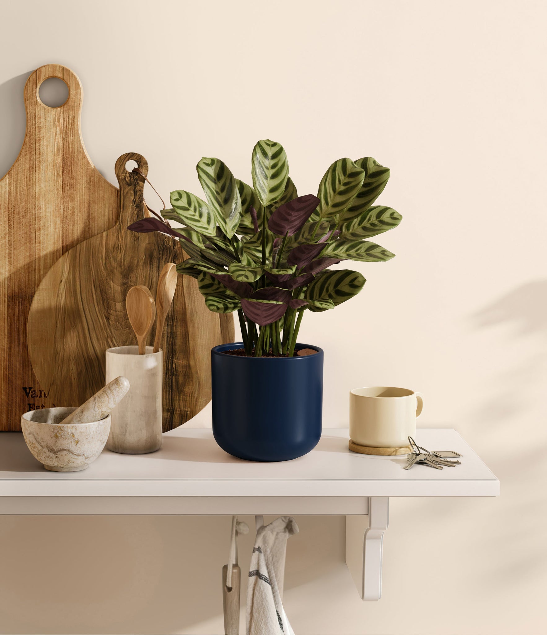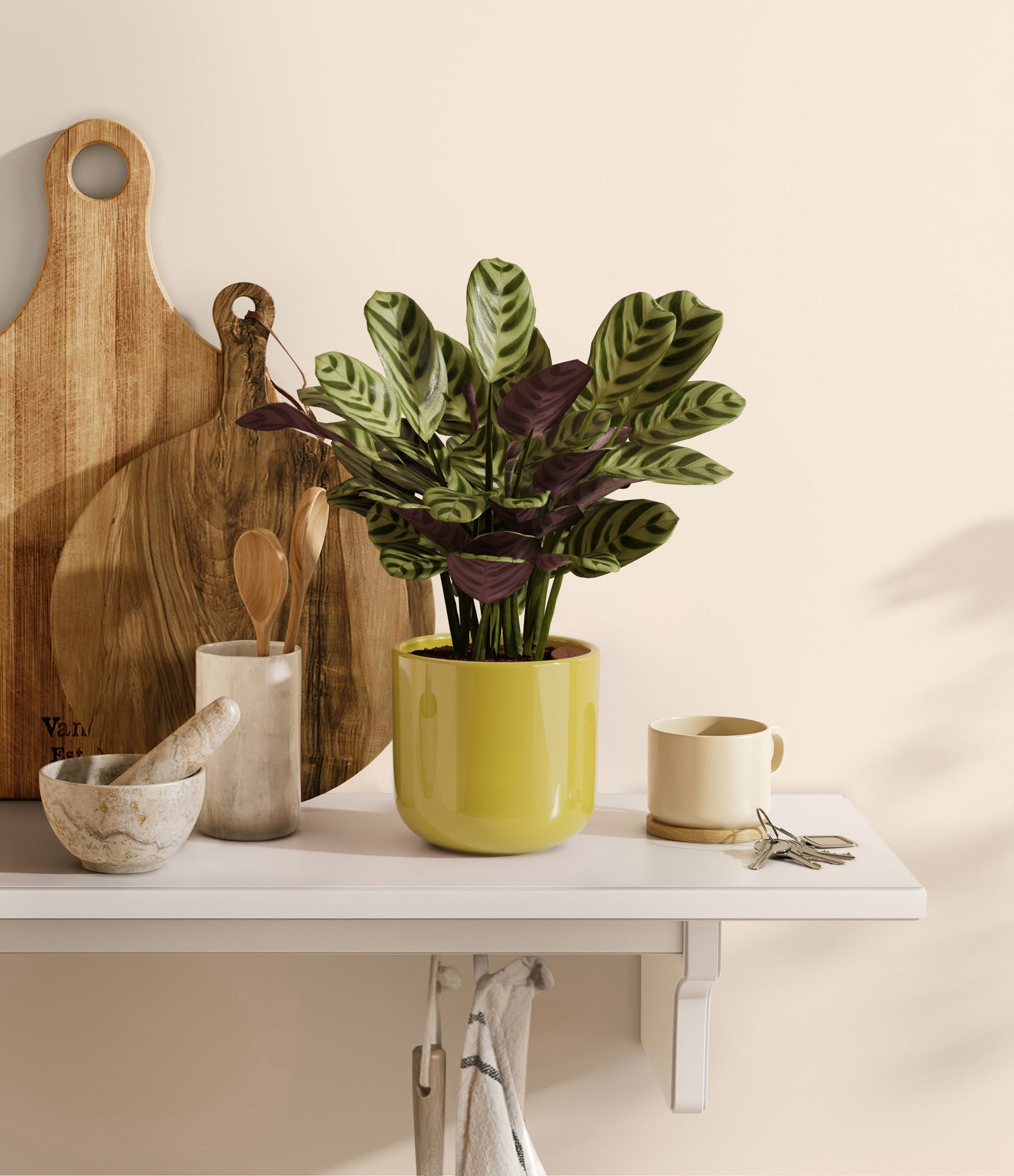 Native to the Amazonian jungles of South America, Calathea Marxii wears large emblem-shaped leaves, with bold strokes of forest green atop a deep burgundy underside. It belongs to the Marantaceae family, known as ‘Prayer Plants’, which much like humans and unlike most plants, have a wake-and-sleep cycle according to a circadian rhythm. This means the leaves move upwards during the night and downwards throughout the day in search of the sun.