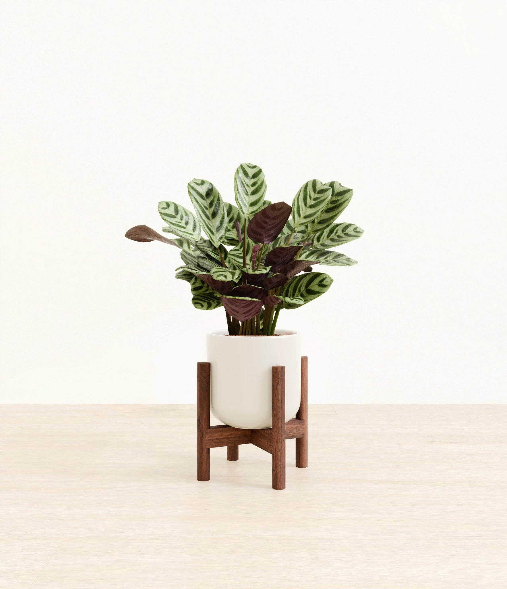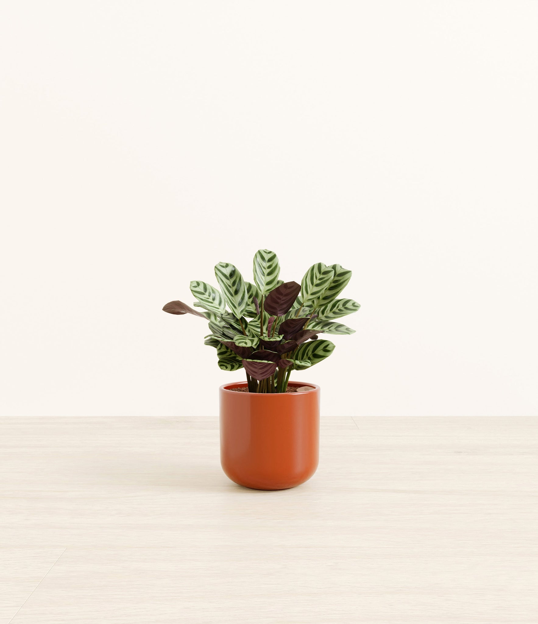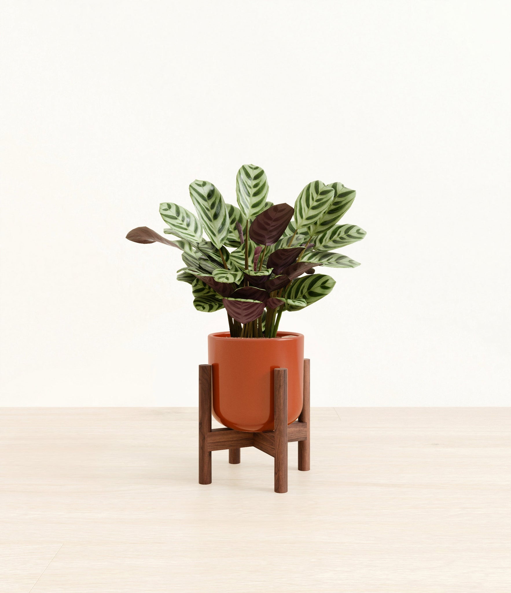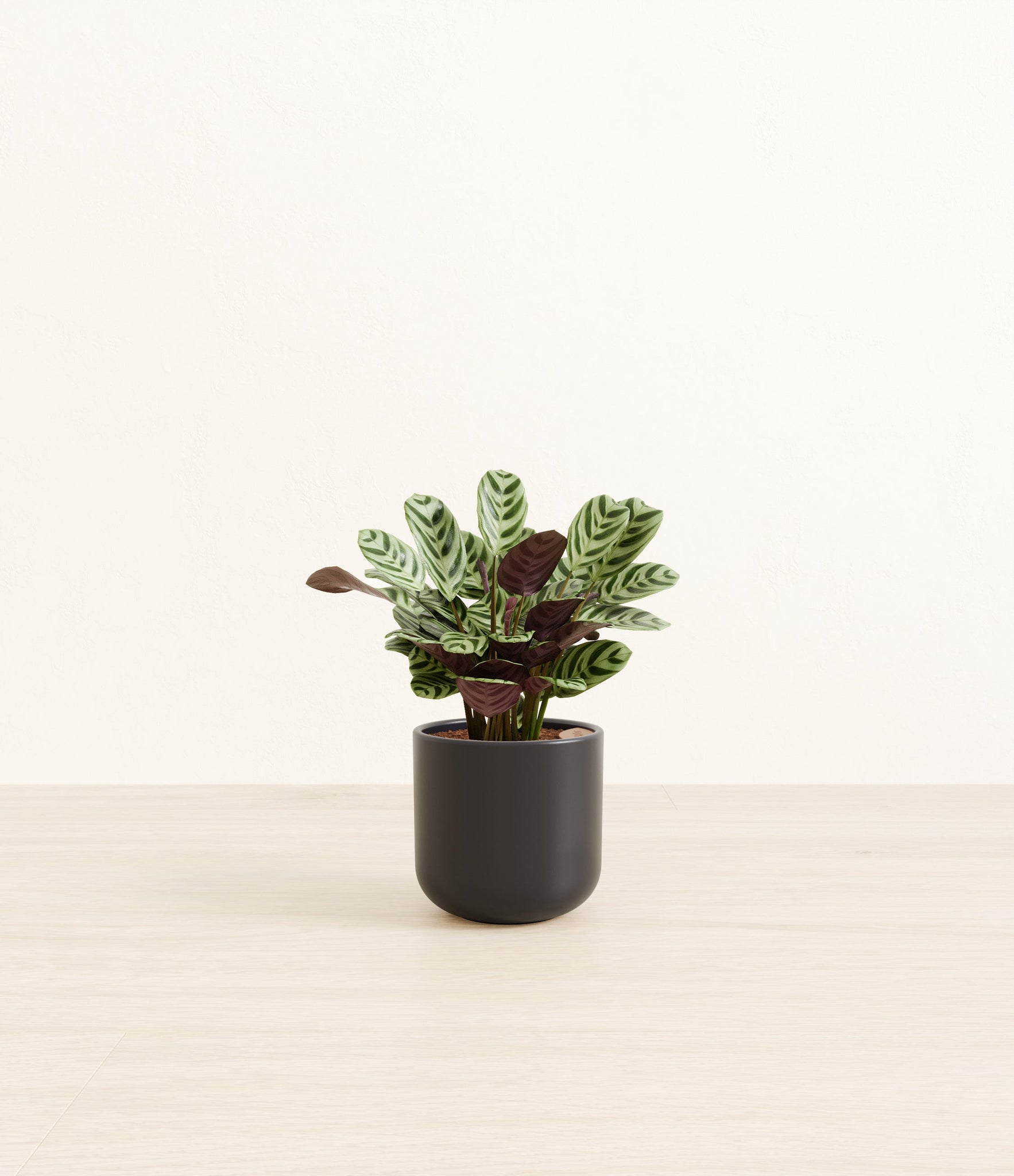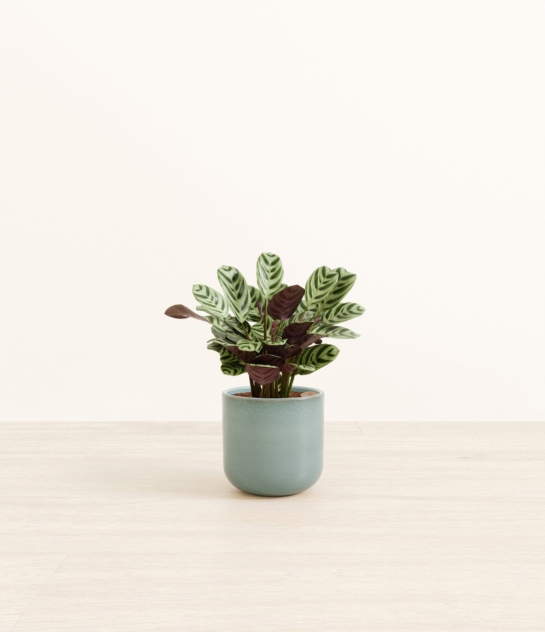 Native to the Amazonian jungles of South America, Calathea Marxii wears large emblem-shaped leaves, with bold strokes of forest green atop a deep burgundy underside. It belongs to the Marantaceae family, known as ‘Prayer Plants’, which much like humans and unlike most plants, have a wake-and-sleep cycle according to a circadian rhythm. This means the leaves move upwards during the night and downwards throughout the day in search of the sun.