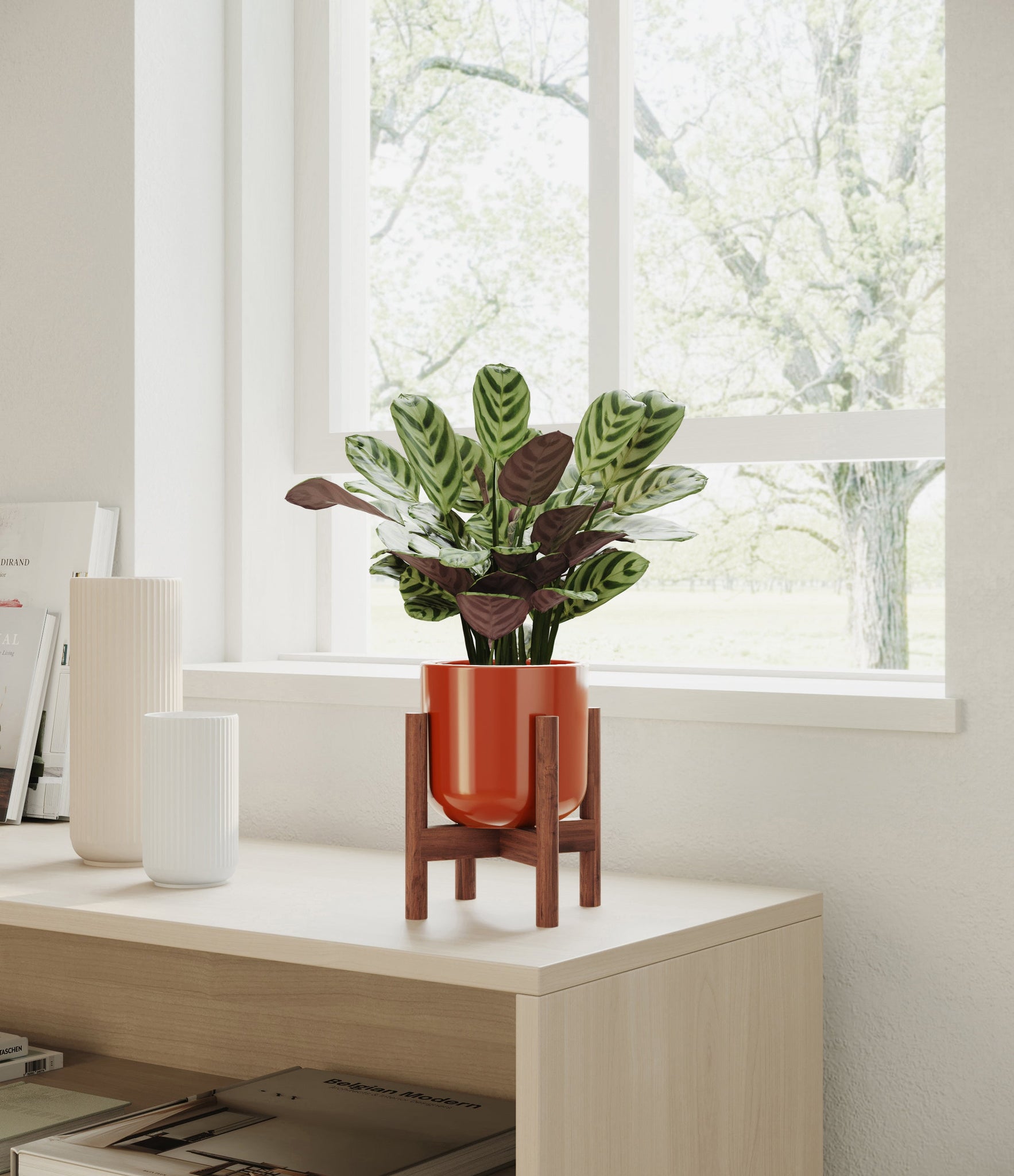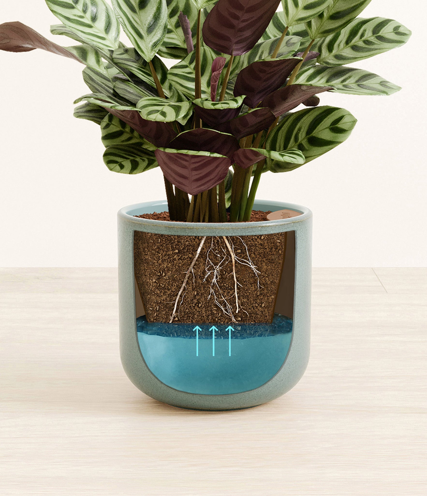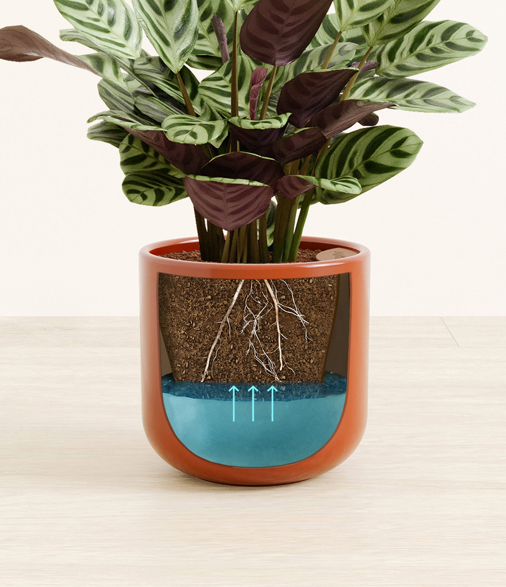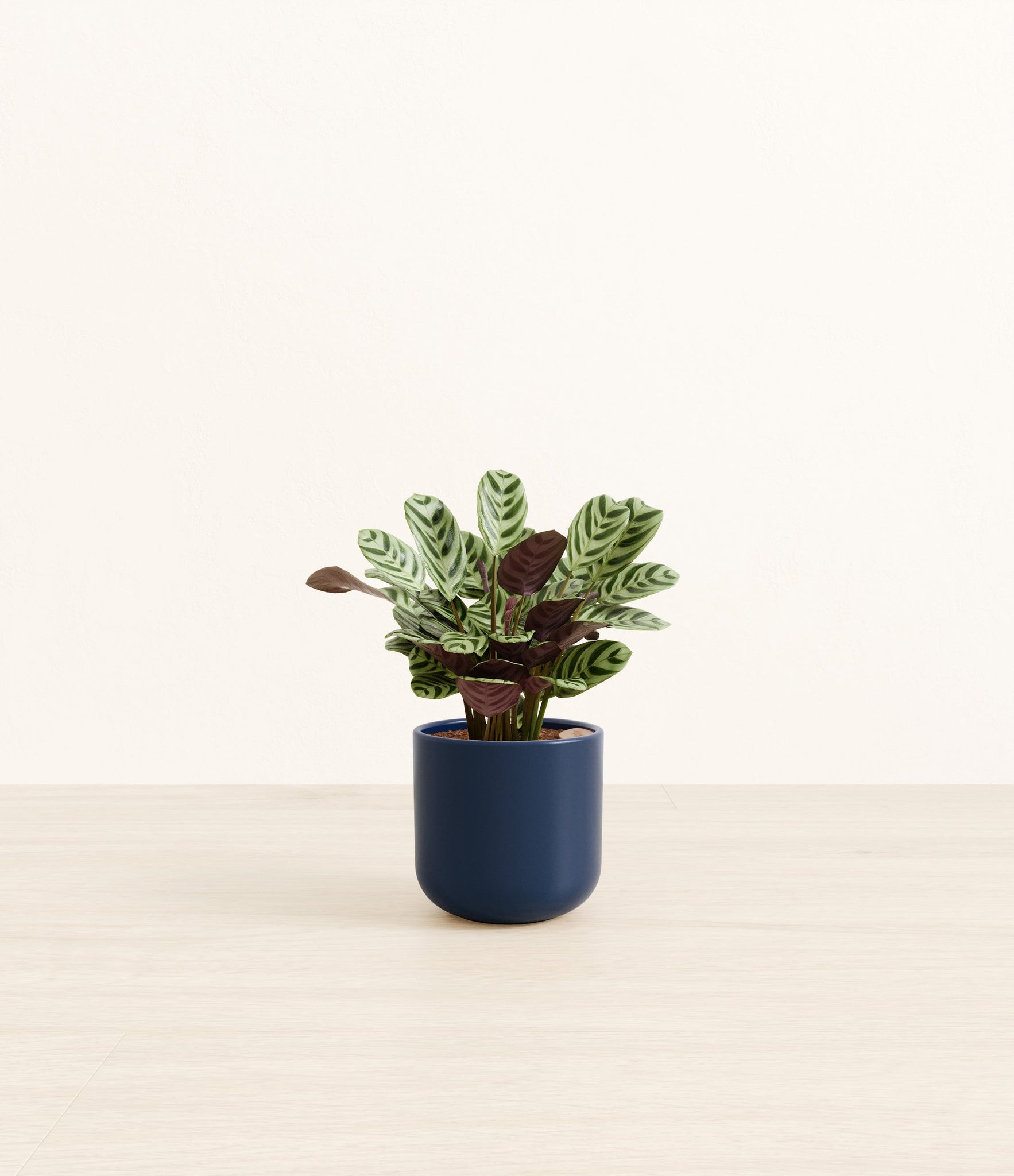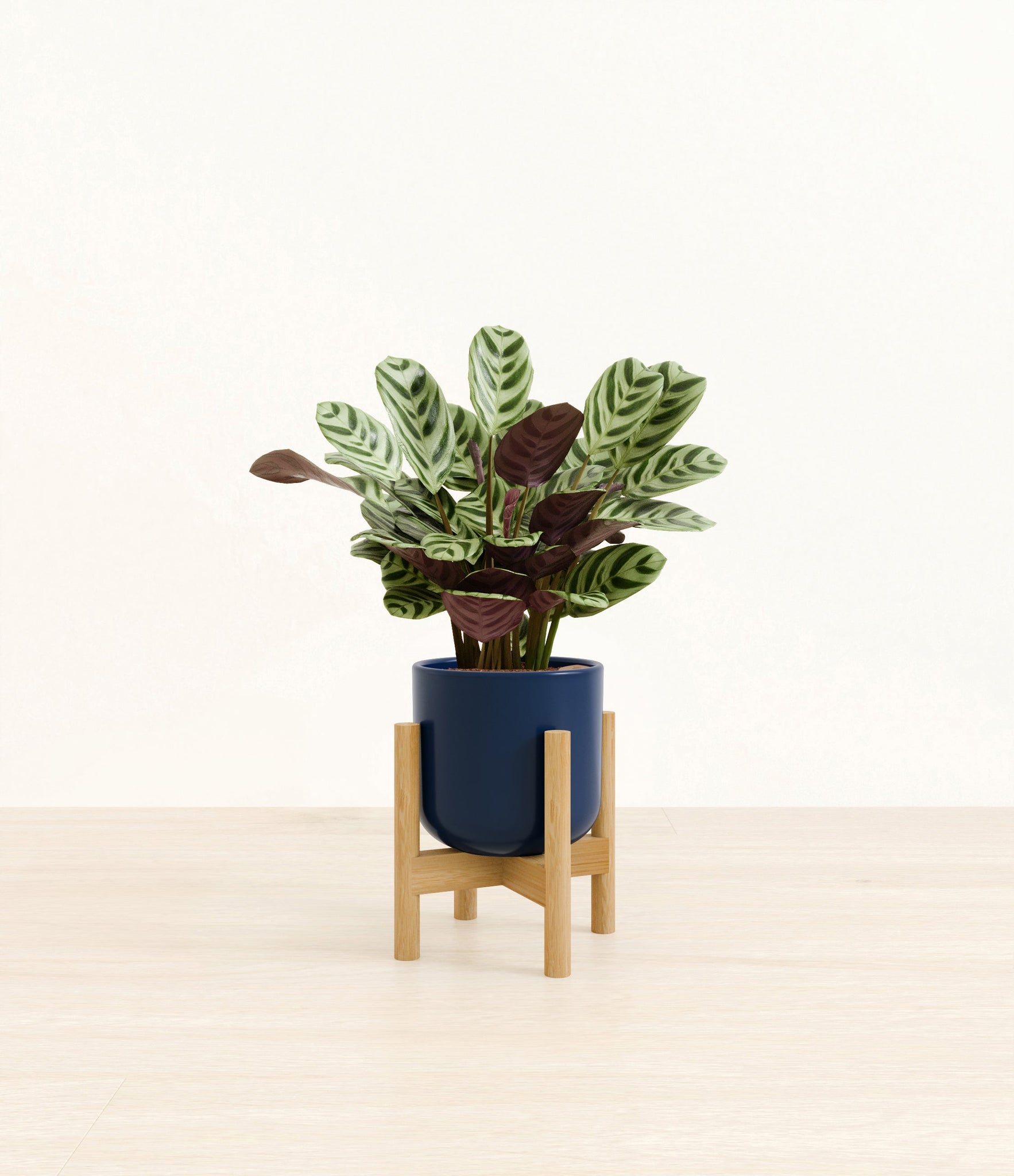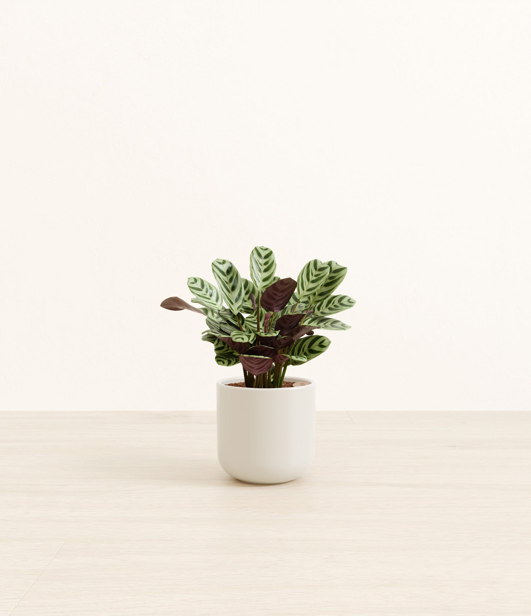 Native to the Amazonian jungles of South America, Calathea Marxii wears large emblem-shaped leaves, with bold strokes of forest green atop a deep burgundy underside. It belongs to the Marantaceae family, known as ‘Prayer Plants’, which much like humans and unlike most plants, have a wake-and-sleep cycle according to a circadian rhythm. This means the leaves move upwards during the night and downwards throughout the day in search of the sun.