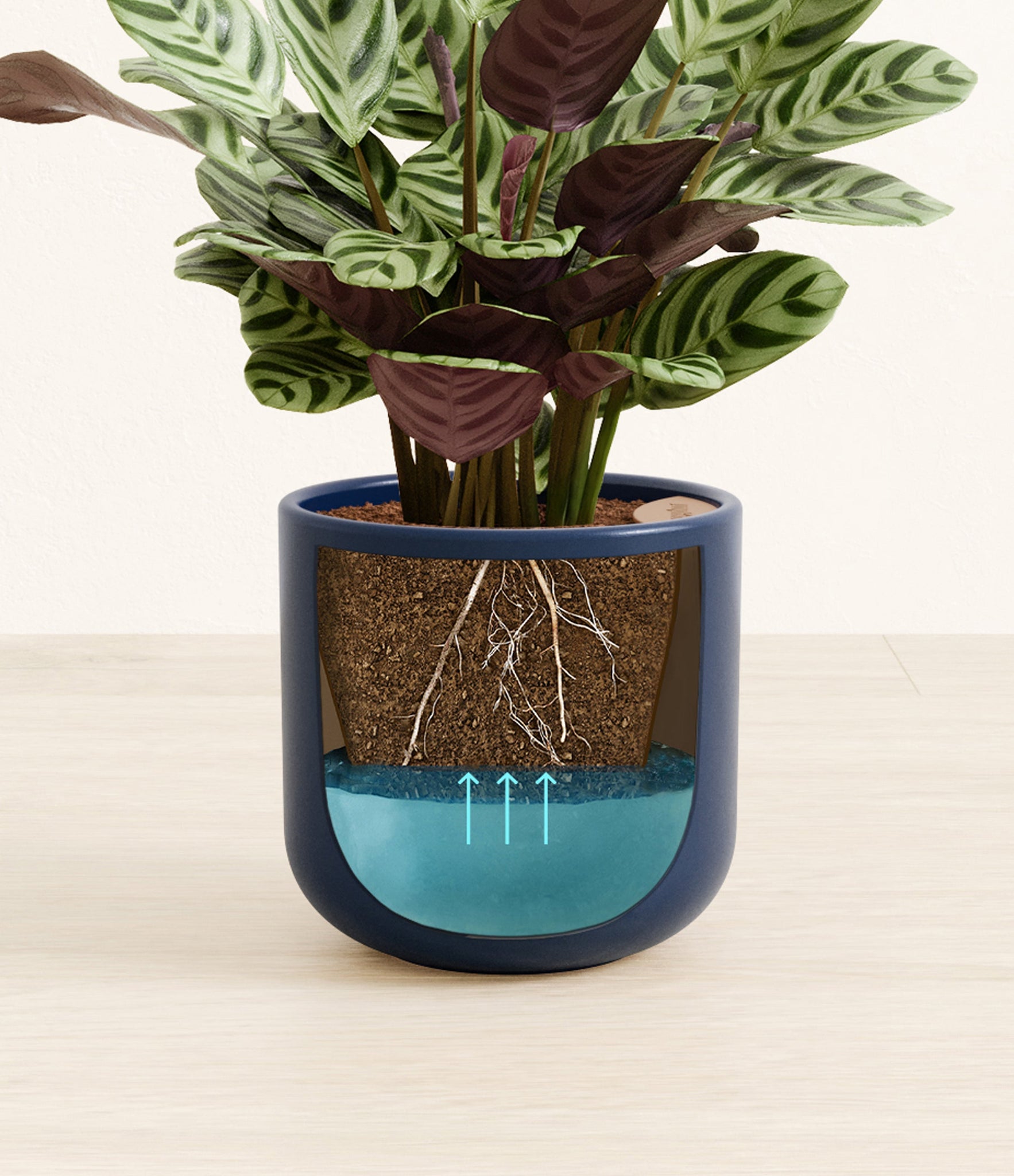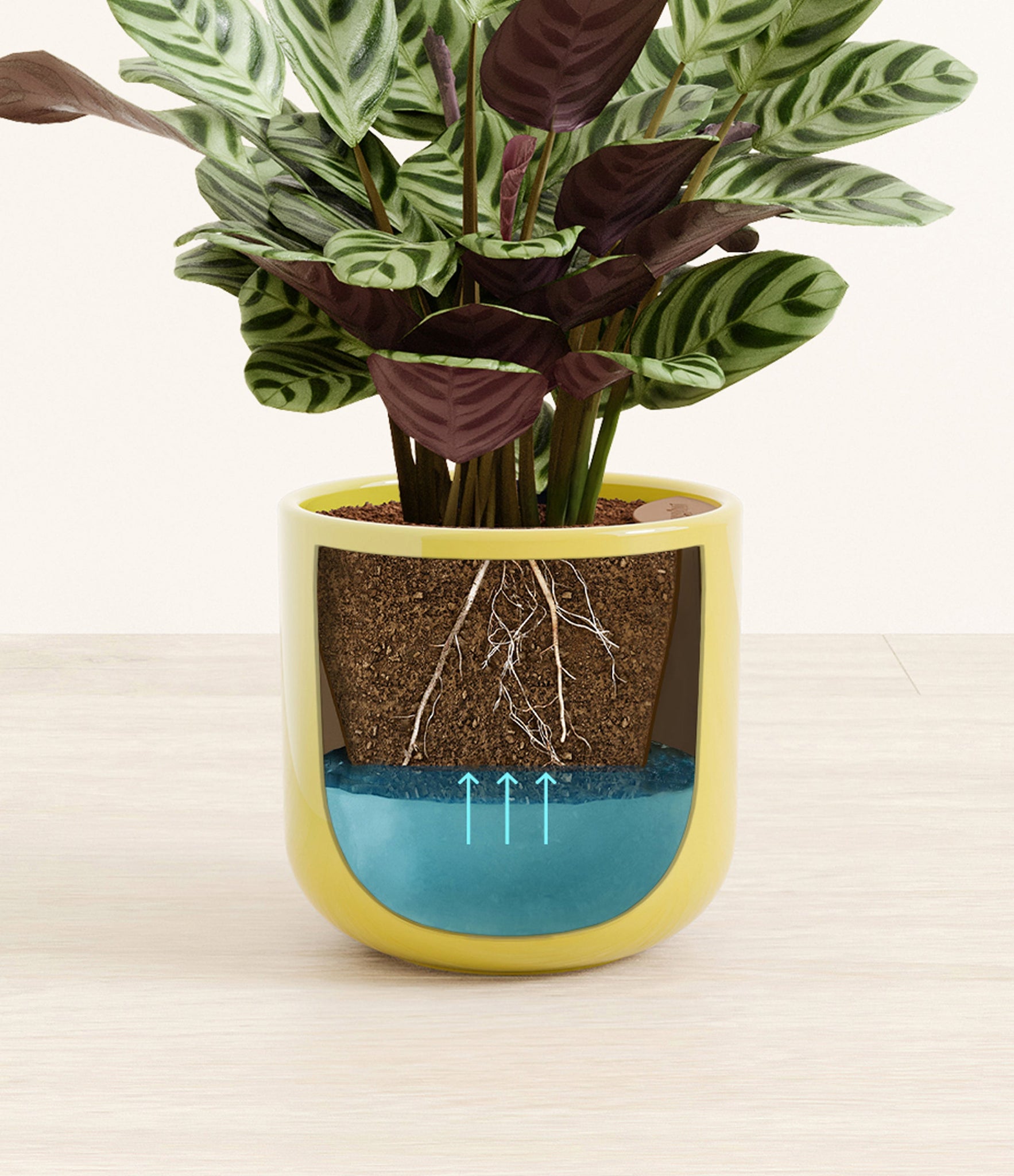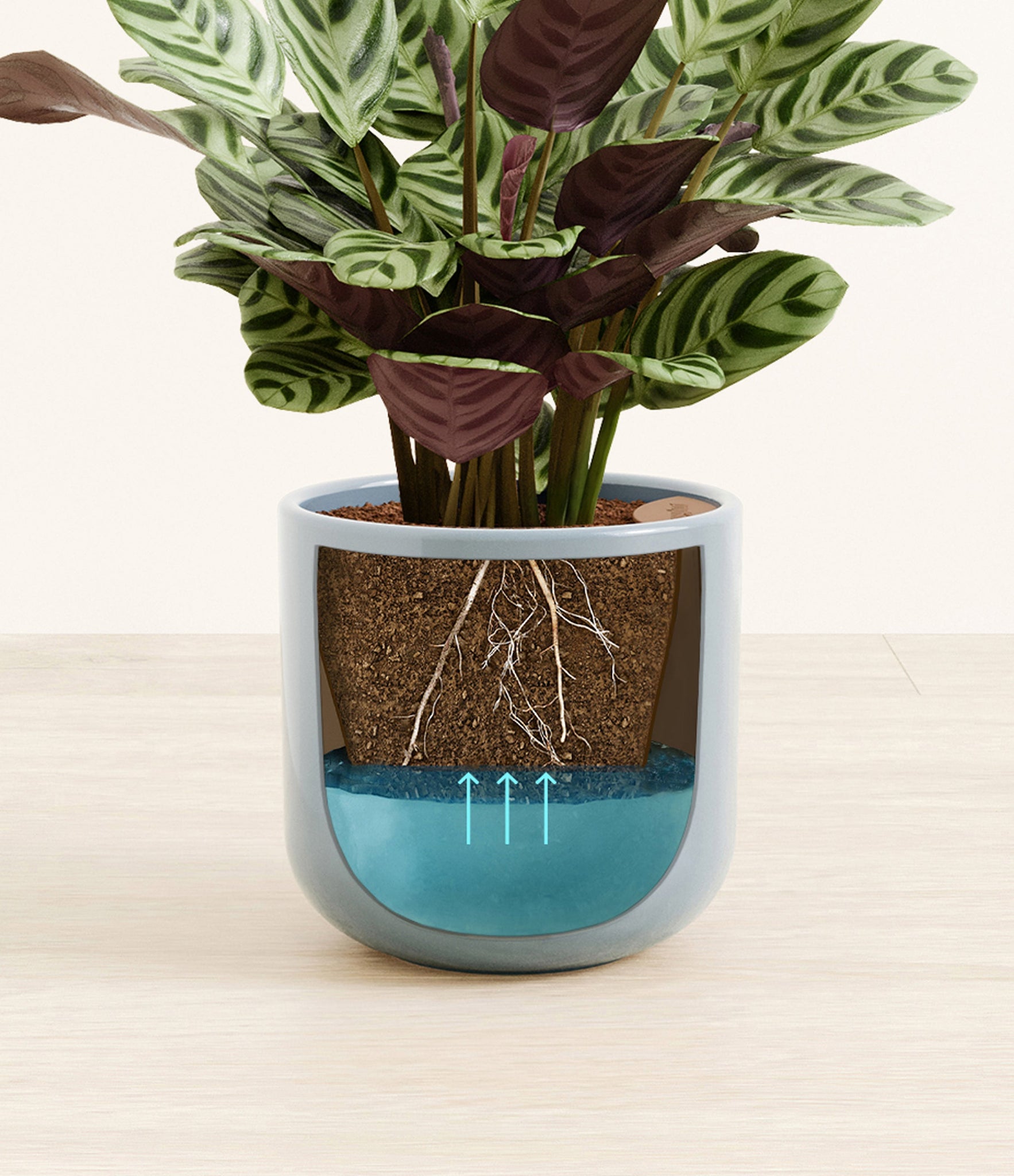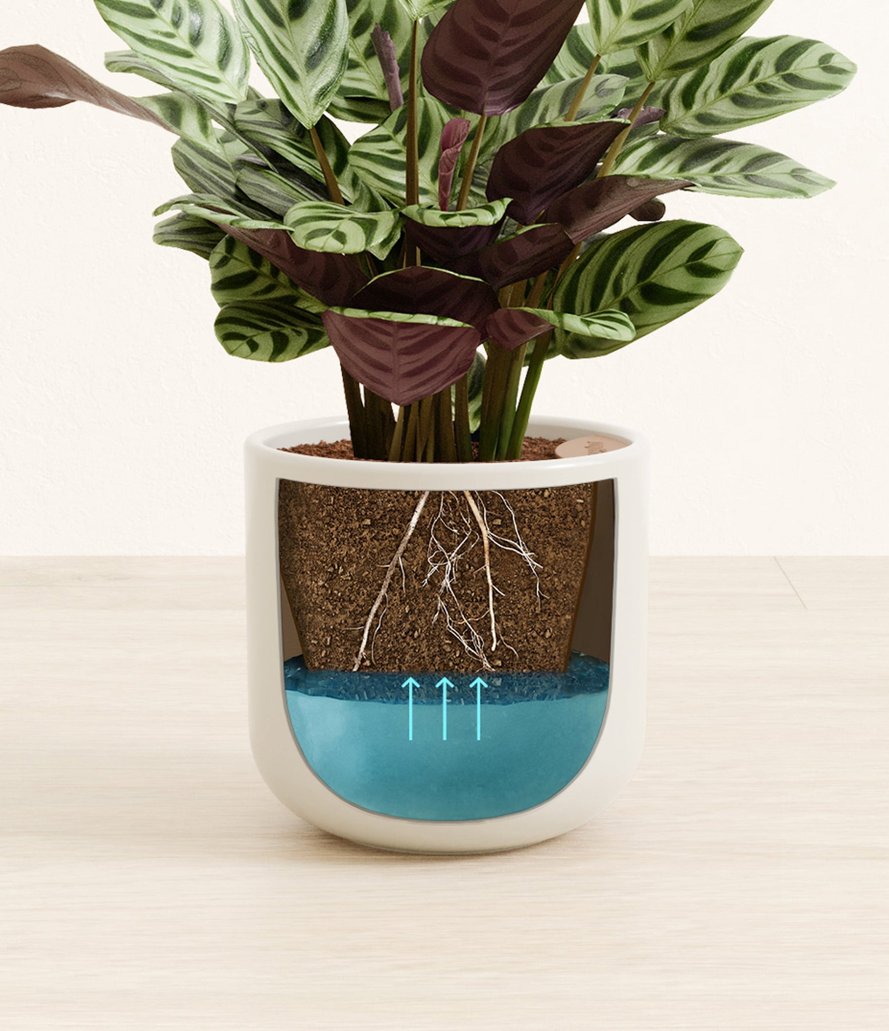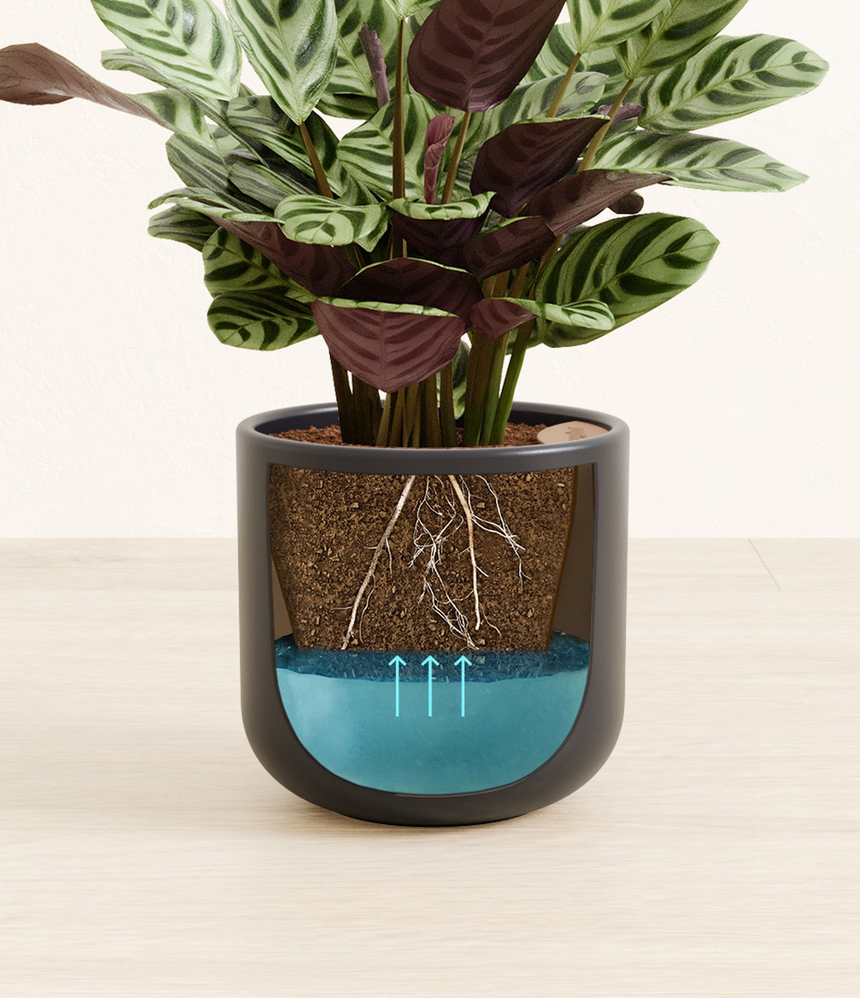 Native to the Amazonian jungles of South America, Calathea Marxii wears large emblem-shaped leaves, with bold strokes of forest green atop a deep burgundy underside. It belongs to the Marantaceae family, known as ‘Prayer Plants’, which much like humans and unlike most plants, have a wake-and-sleep cycle according to a circadian rhythm. This means the leaves move upwards during the night and downwards throughout the day in search of the sun.
