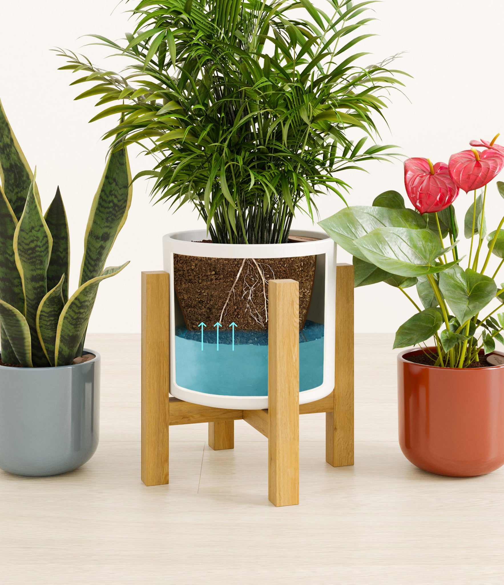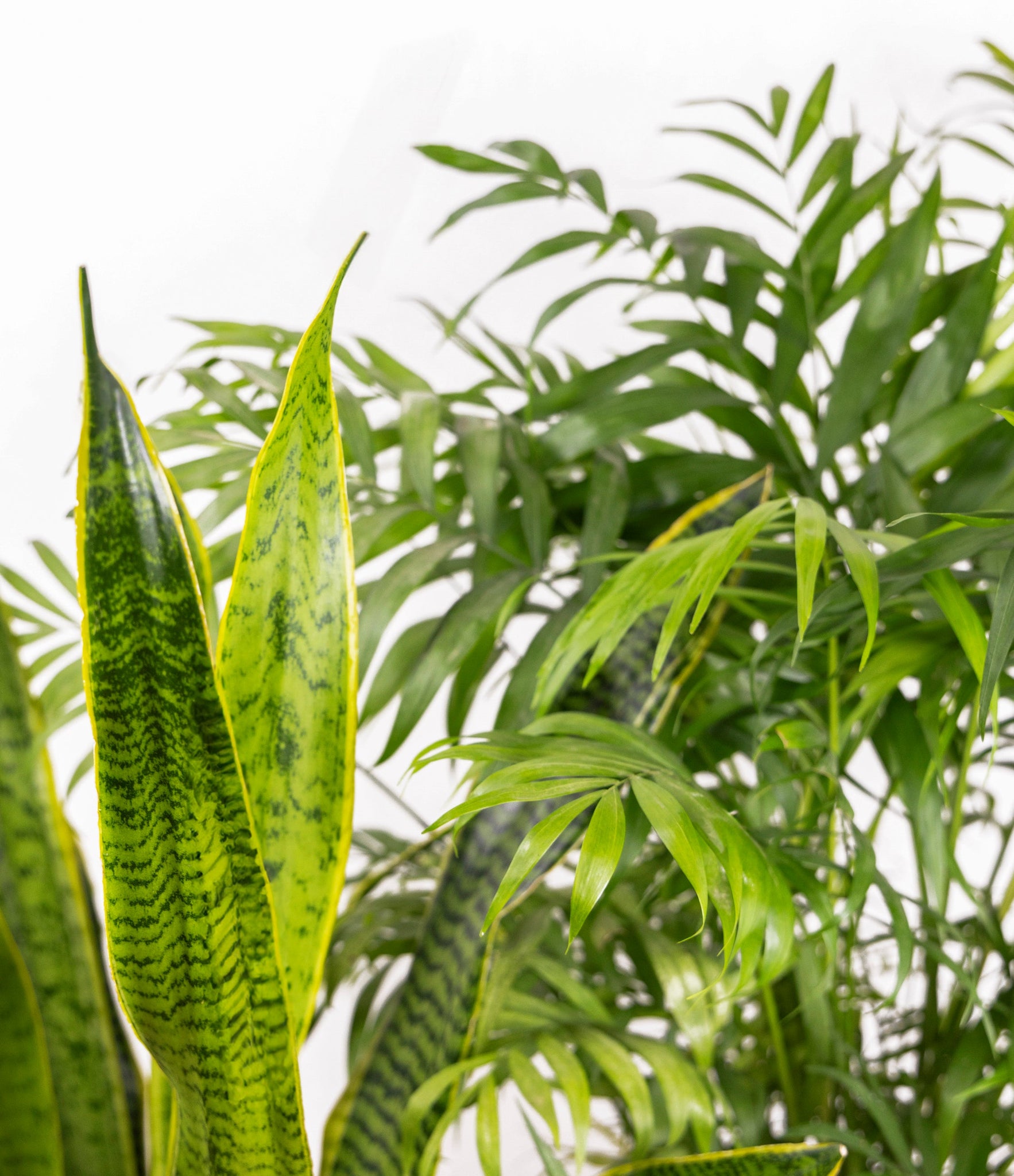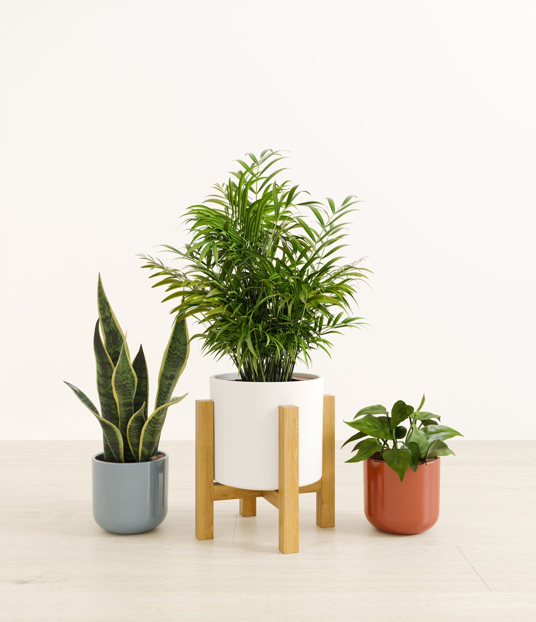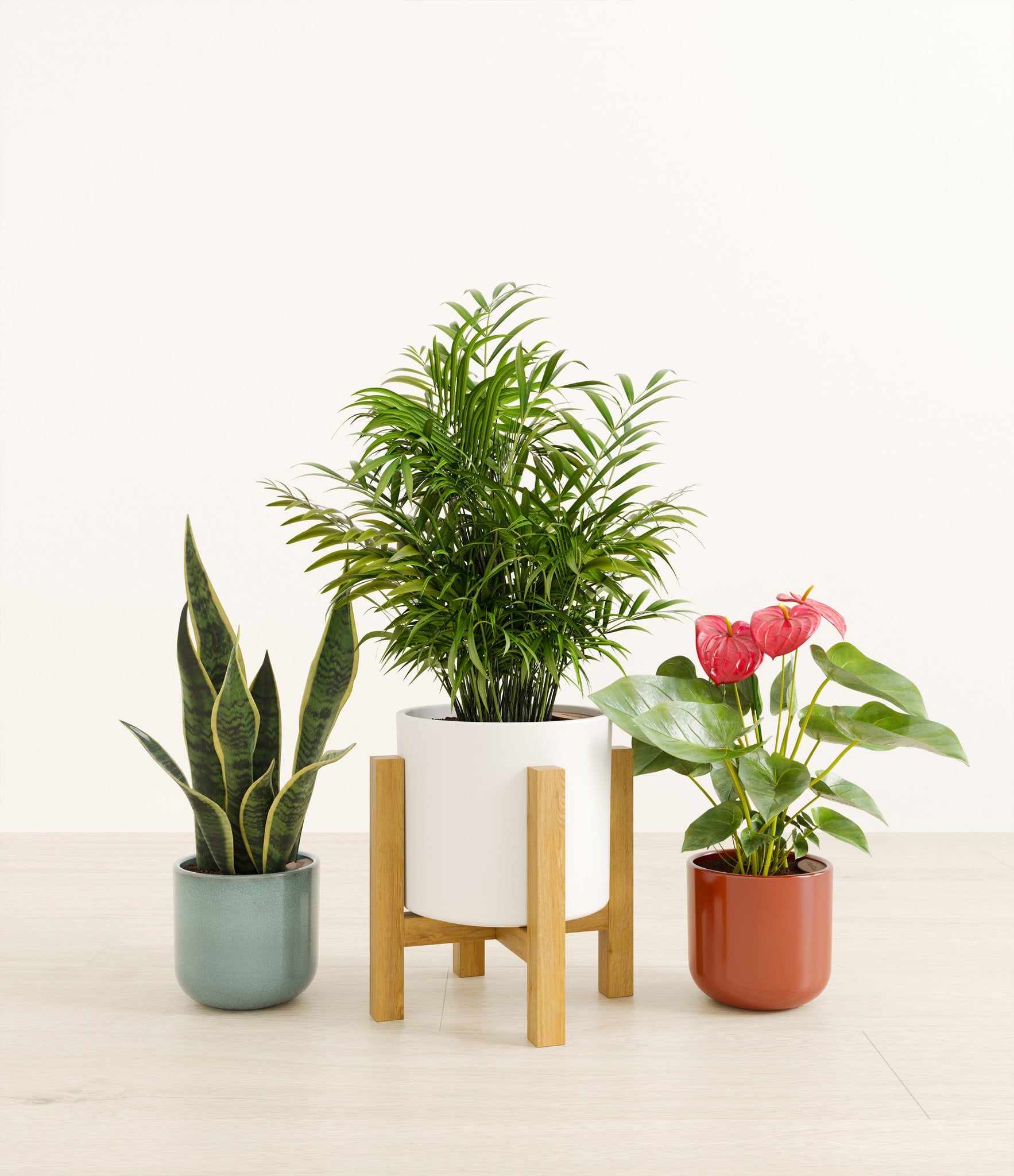 In this set, you'll receive three exceptional houseplants that harmonize beautifully within any space. A medium Parlor Palm, with its lush texture and delicate energy, is the perfect centerpiece for ultimate radiance. A small Anthurium Red, with its heart-shaped leaves, embodies generosity and kindness. Finally, a small Golden Snake Plant, resilient and striking with vibrant green leaves edged in gold, purifies the air and promotes well-being. Together, these plants create a balanced and radiant indoor garden, symbolizing health, love, and tranquility.