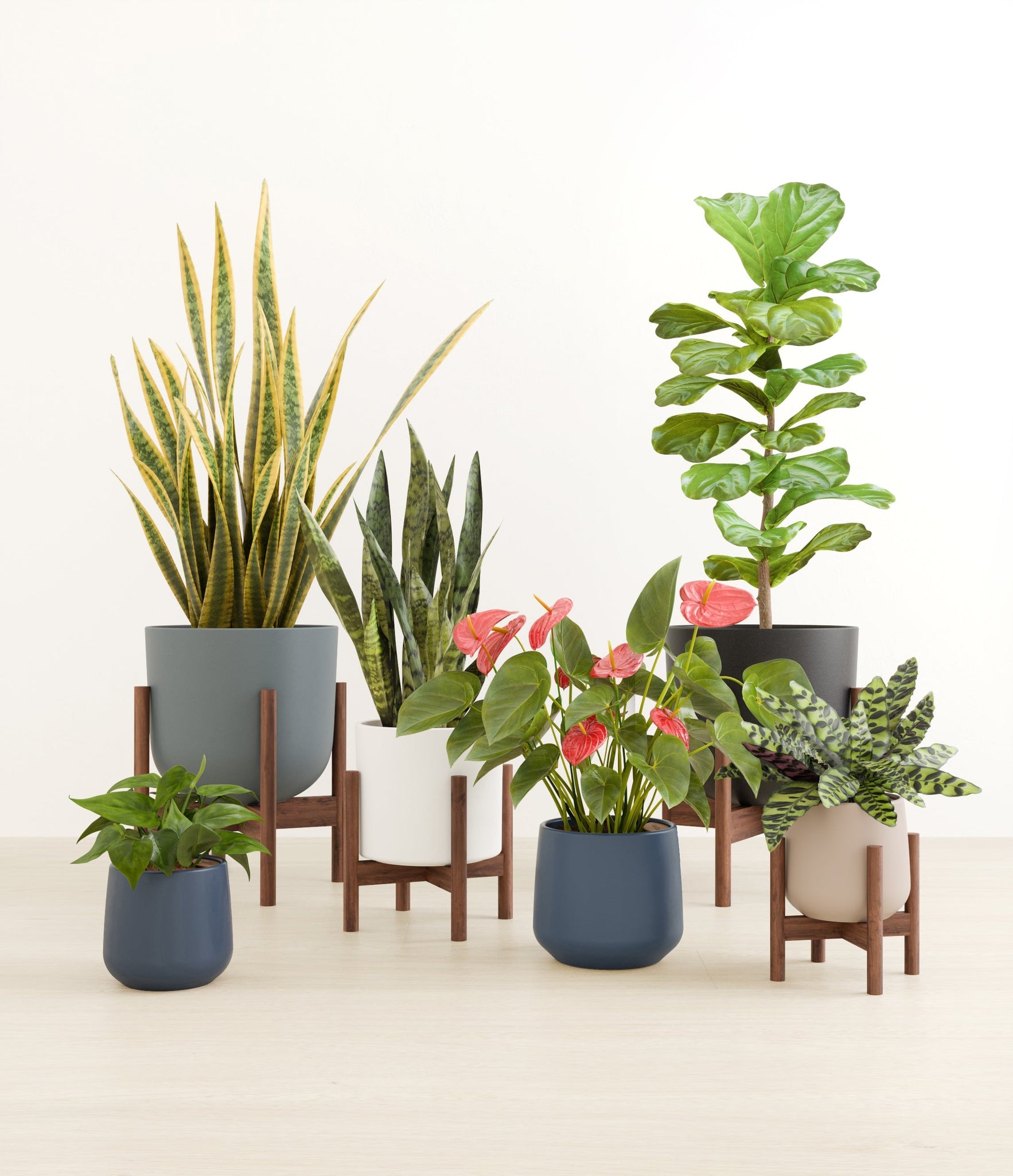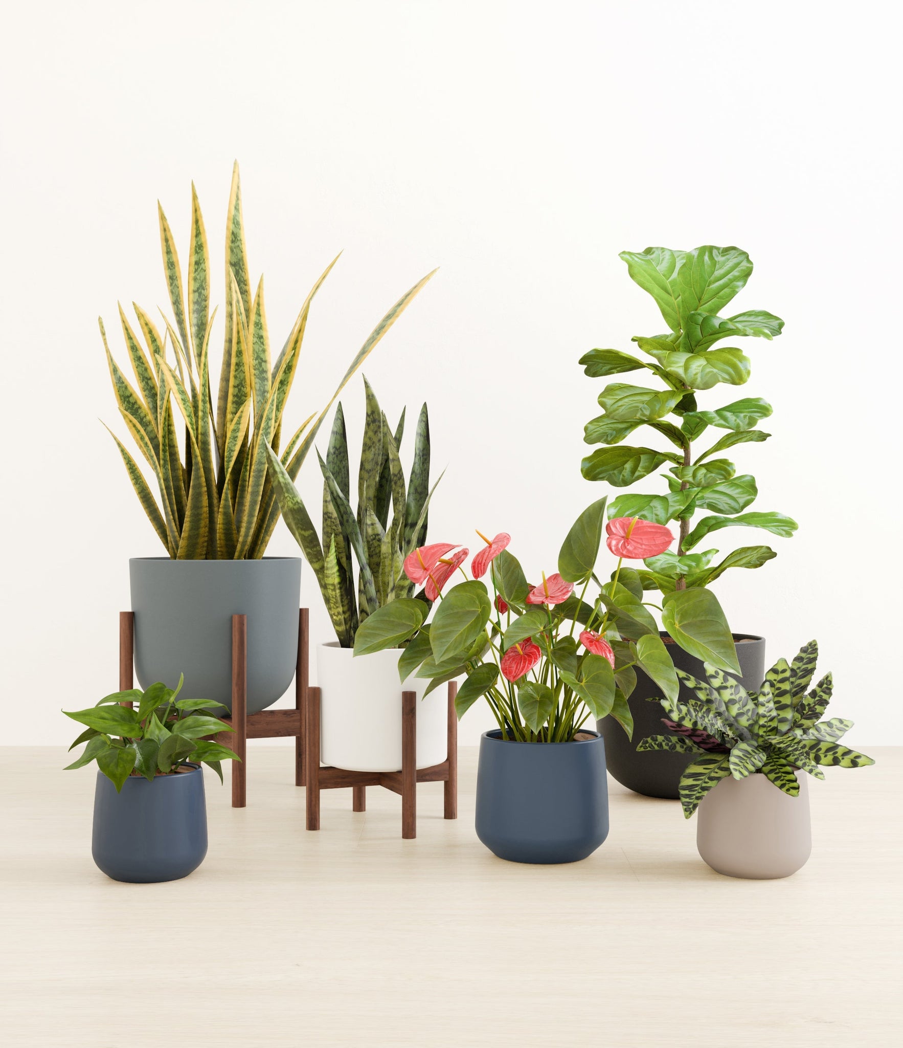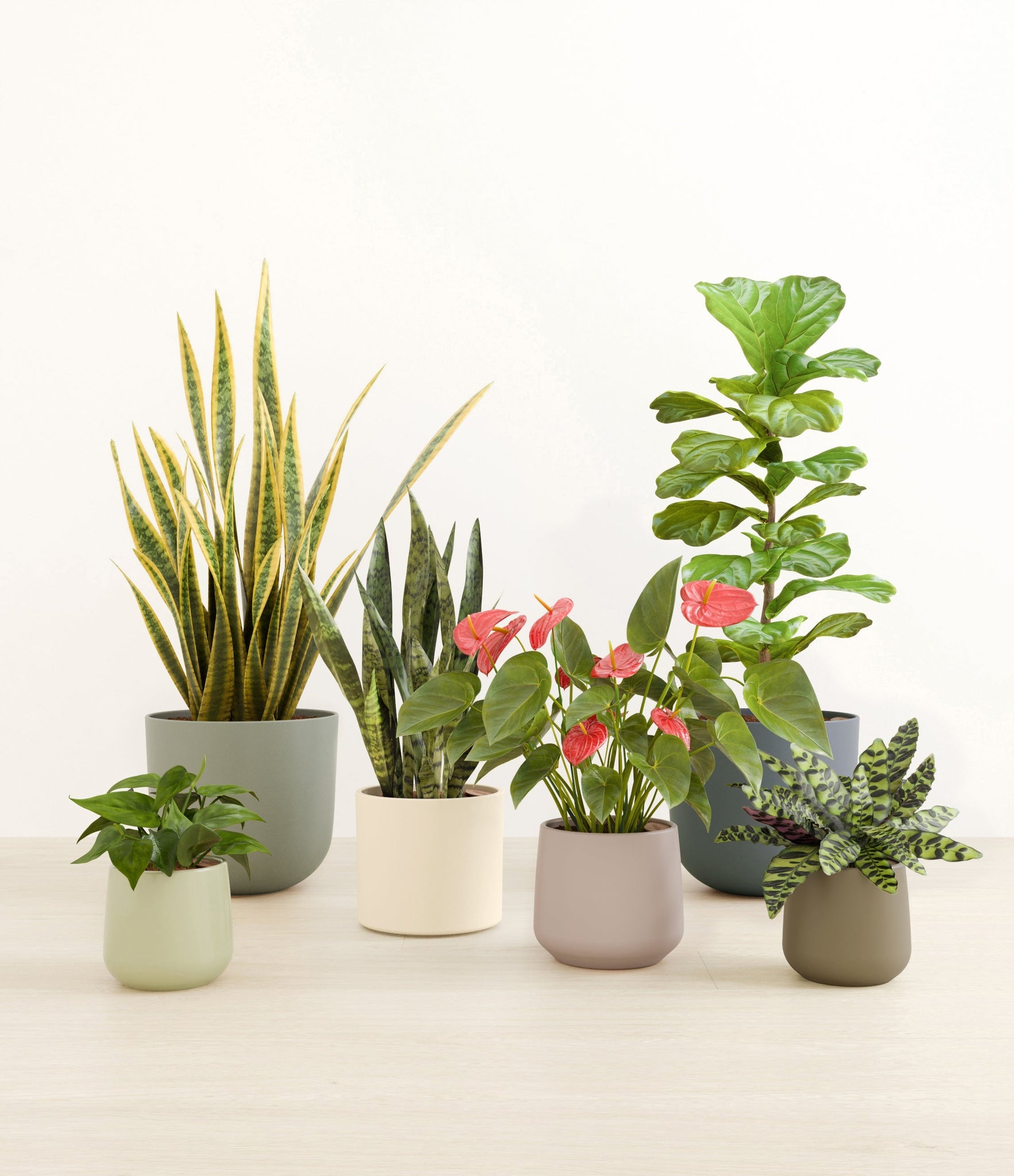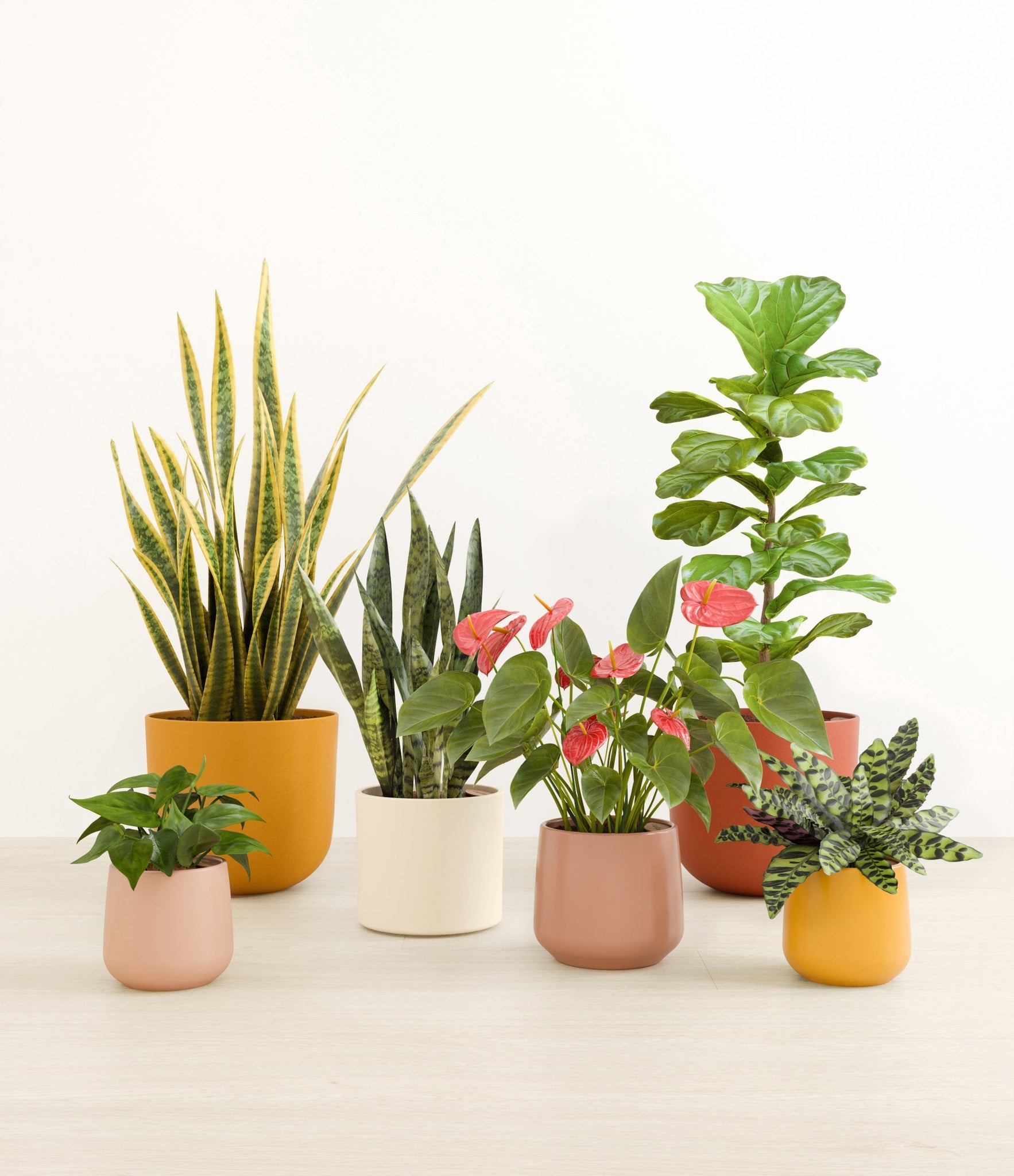 Welcome a touch of nature into your home with this carefully curated collection of six exquisite houseplants, each chosen to transform the look and feel of any indoor space with its unique beauty. This collection includes a small Heartleaf Philodendron with glossy, vibrant heart-shaped foliage; a small Rattlesnake Calathea with an eccentric reptilian pattern on its leaves; a medium Green Snake plant with mesmerizing swatches of silver and sage; a medium Red Anthurium that brings out the best and brightest in any space it inhabits; a large Golden Snake plant with tall vibrant green leaves edged with streaks of sunshine; and a large Fiddle Leaf Fig Bush with massive and vibrant lyre-shaped leaves.