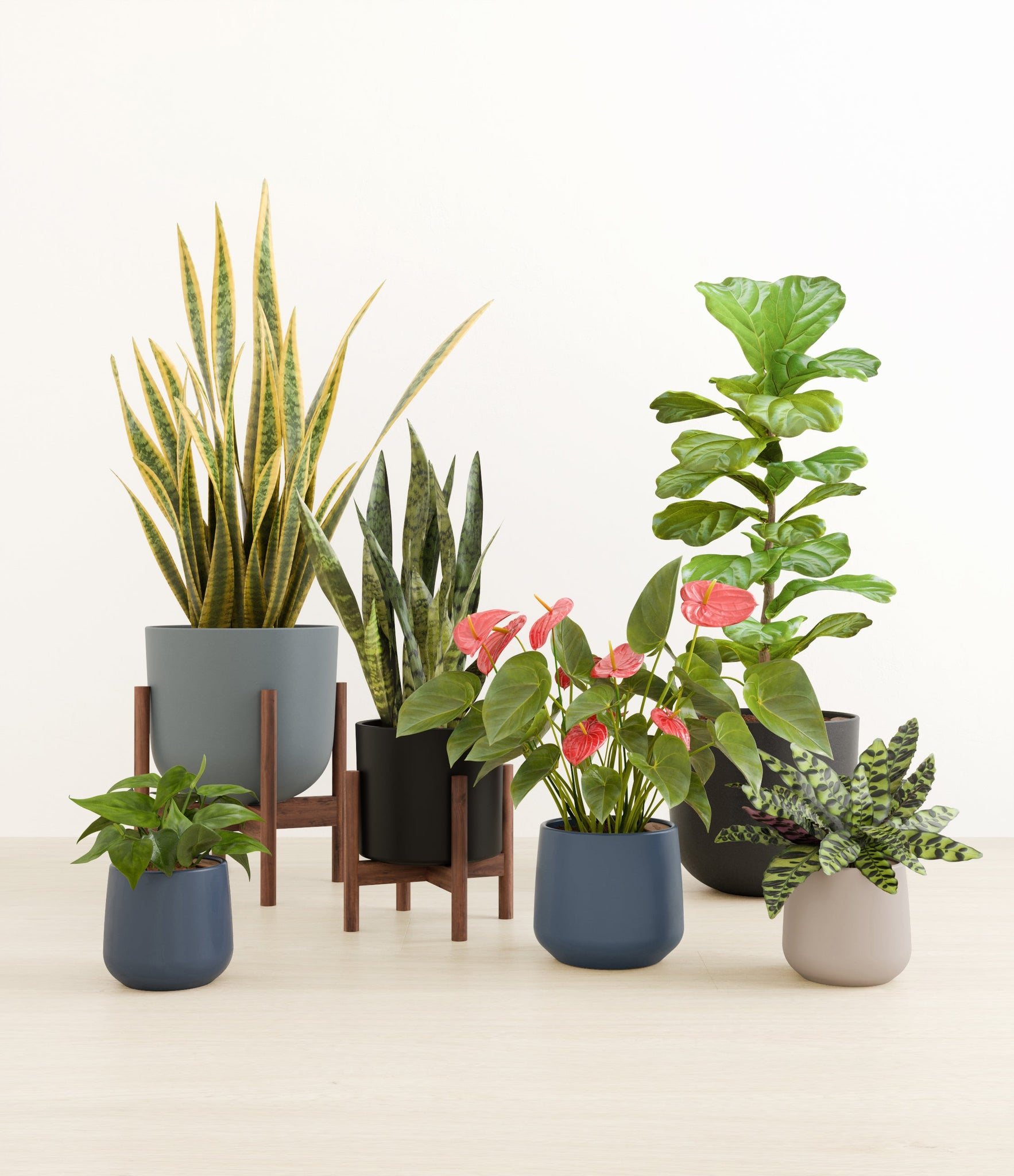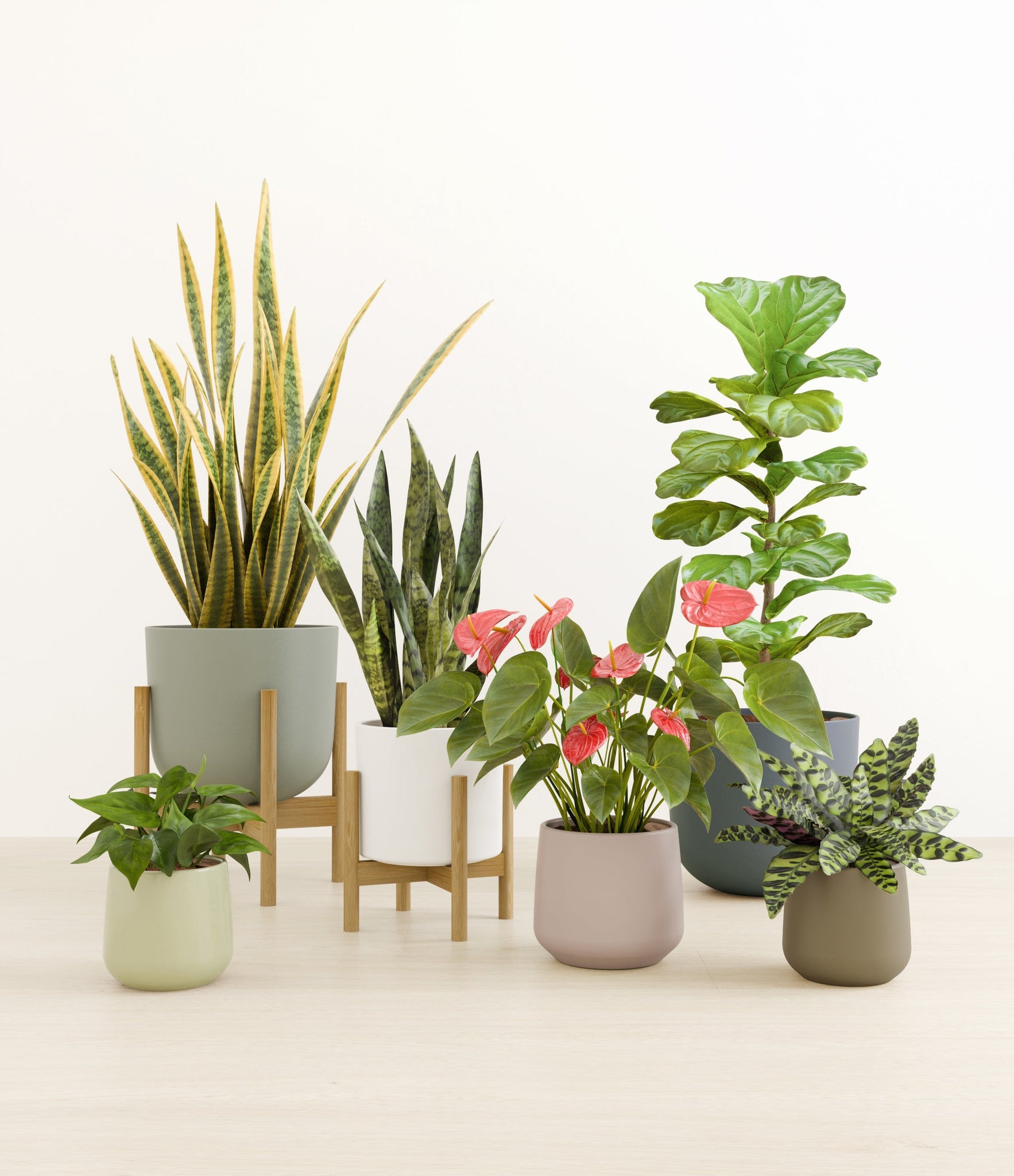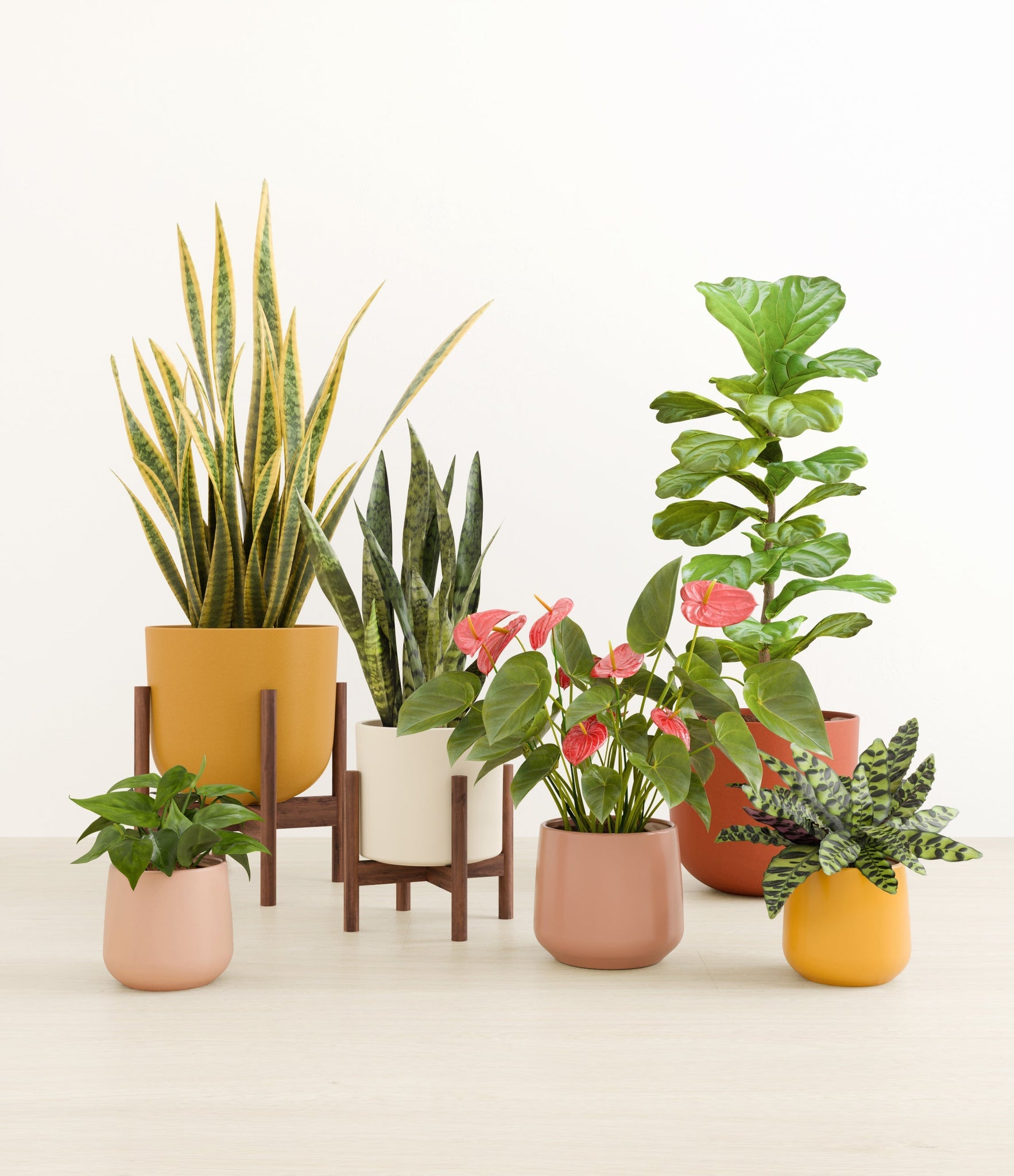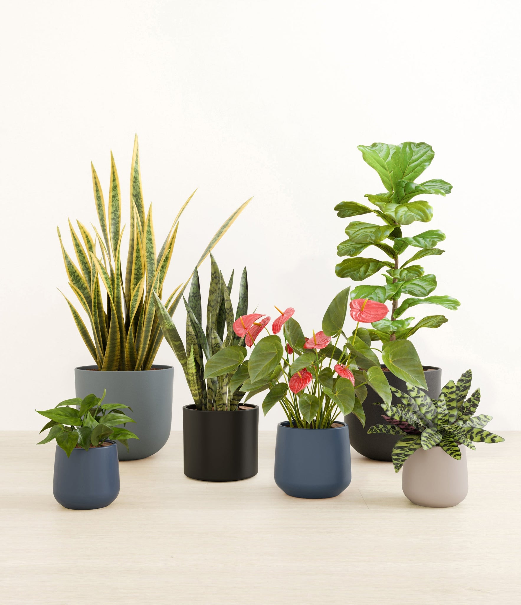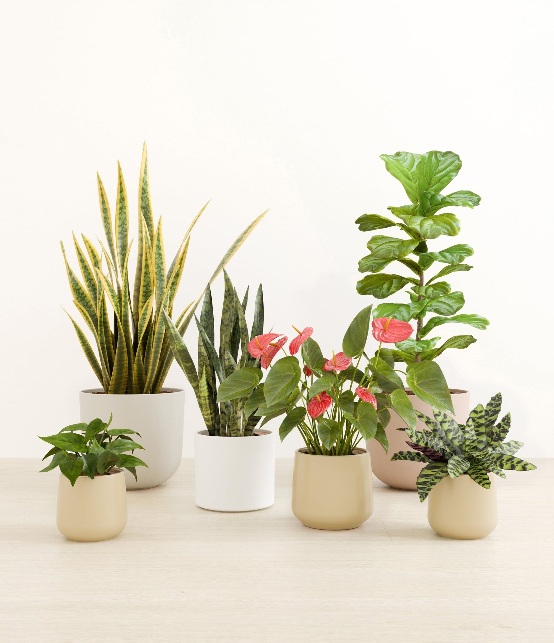 Welcome a touch of nature into your home with this carefully curated collection of six exquisite houseplants, each chosen to transform the look and feel of any indoor space with its unique beauty. This collection includes a small Heartleaf Philodendron with glossy, vibrant heart-shaped foliage; a small Rattlesnake Calathea with an eccentric reptilian pattern on its leaves; a medium Green Snake plant with mesmerizing swatches of silver and sage; a medium Red Anthurium that brings out the best and brightest in any space it inhabits; a large Golden Snake plant with tall vibrant green leaves edged with streaks of sunshine; and a large Fiddle Leaf Fig Bush with massive and vibrant lyre-shaped leaves.