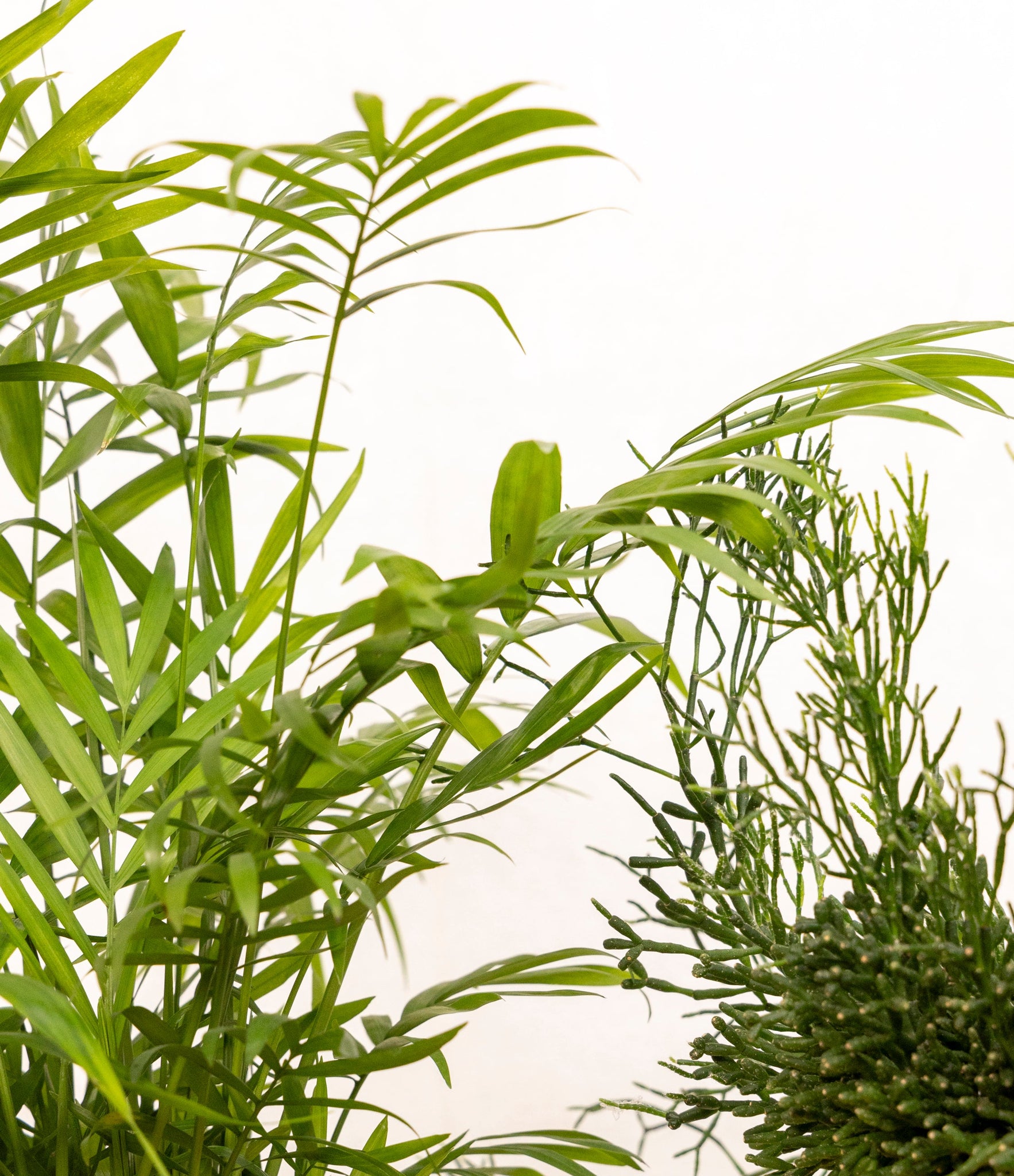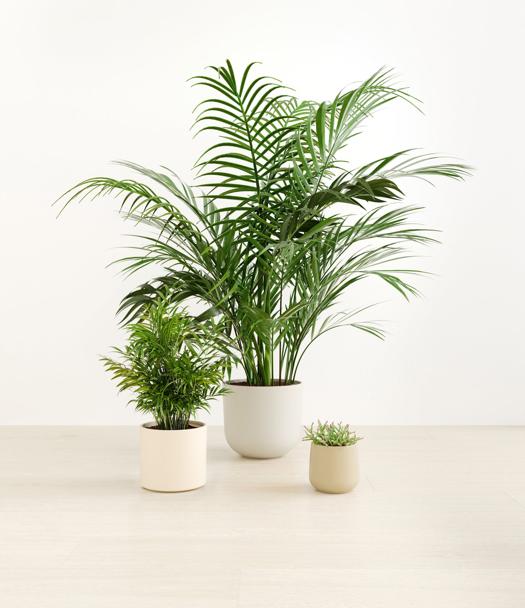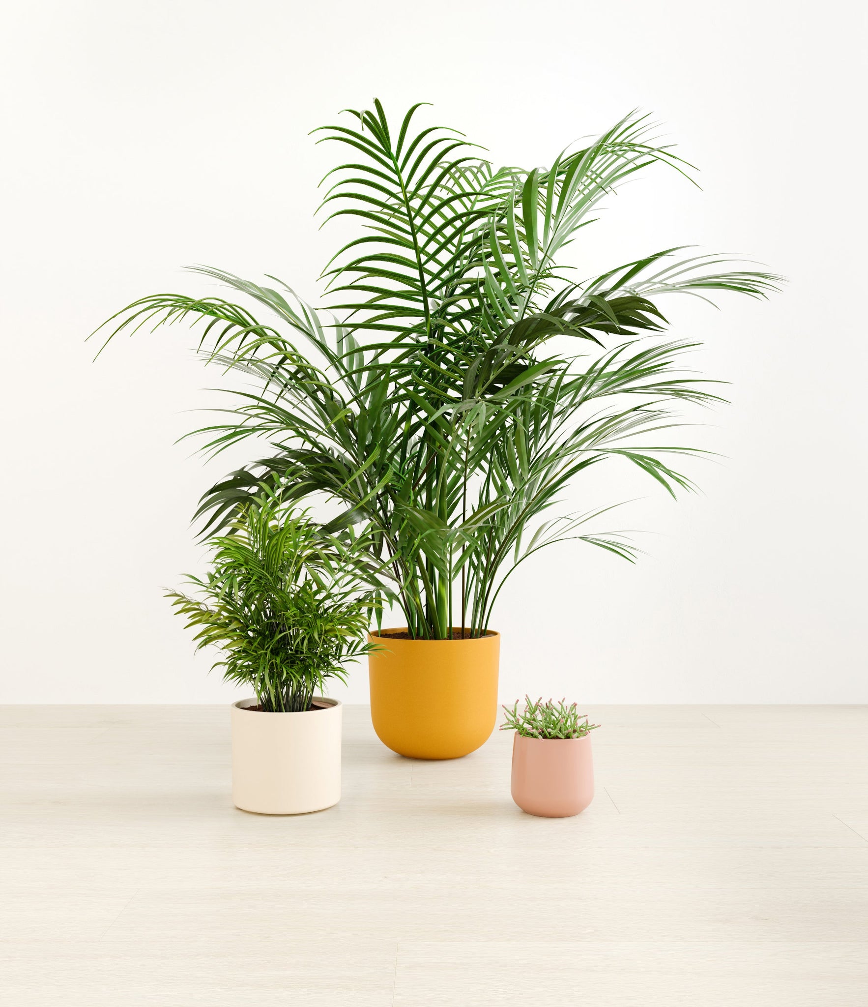 This collection curates a trio of pet-friendly and low-light tolerant houseplants that effortlessly bring an elegant touch of the tropics to your home. The assortment includes a small Mistletoe Cactus – known for its trailing pencil-thin foliage that adds texture to any space; a medium Parlor Palm – a classic indoor palm that brings a lush, tropical feel; and a huge Areca Palm – with its feathery, arching fronds, it's the perfect centerpiece for any room.