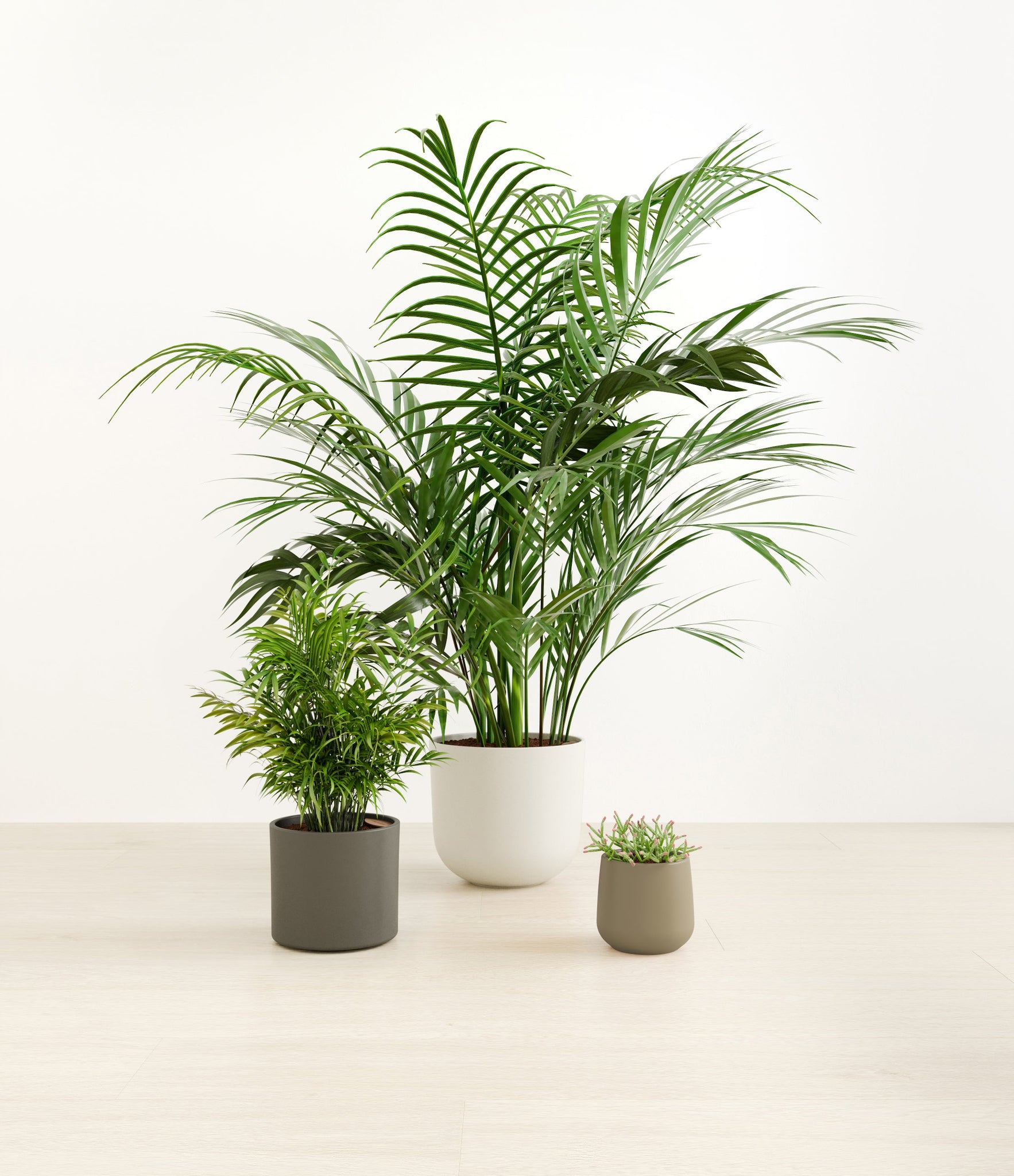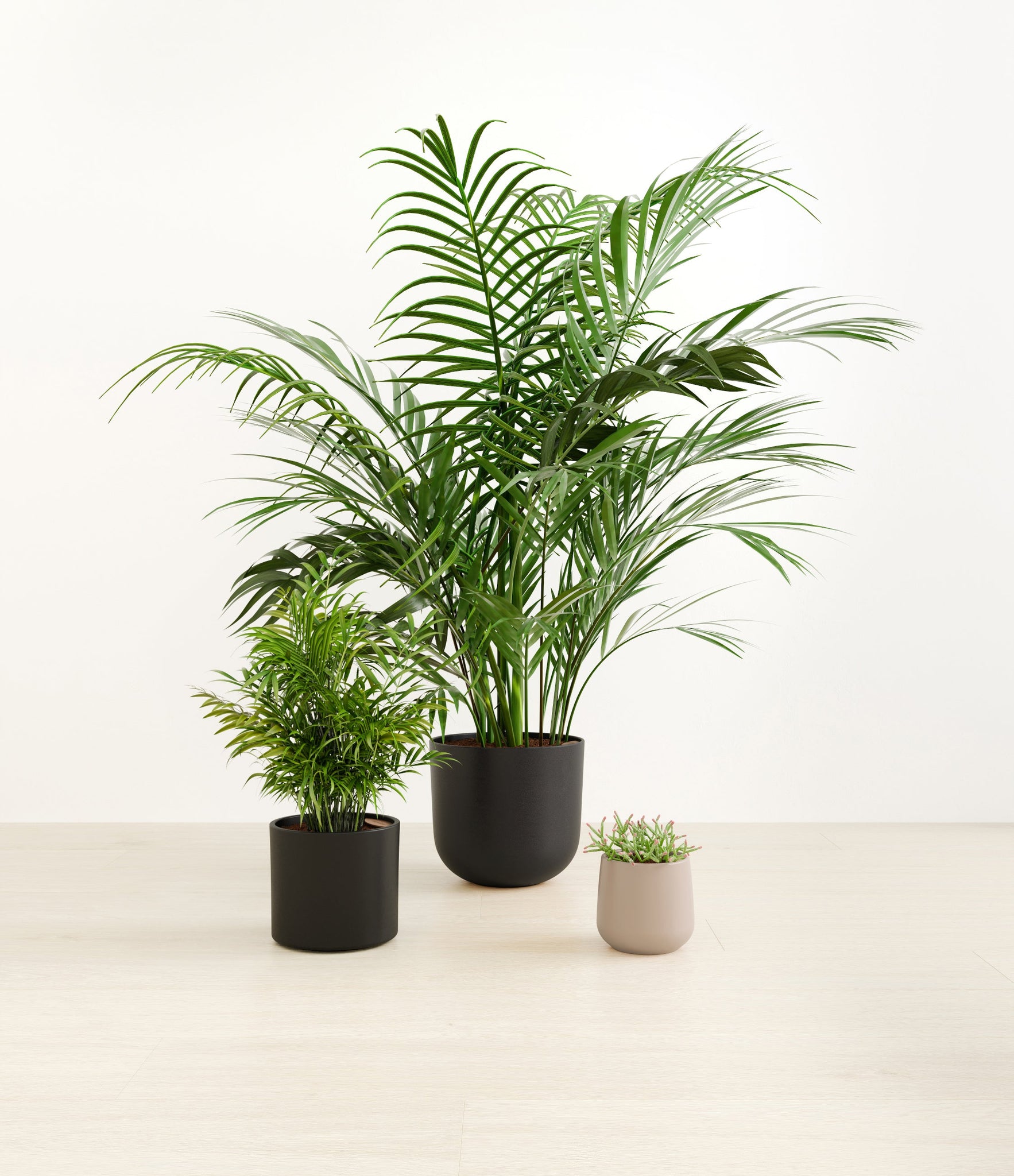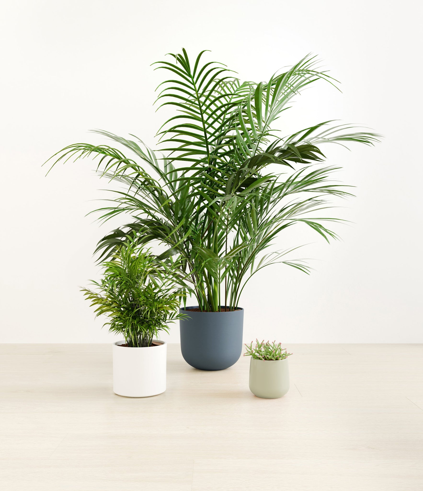 This collection curates a trio of pet-friendly and low-light tolerant houseplants that effortlessly bring an elegant touch of the tropics to your home. The assortment includes a small Mistletoe Cactus – known for its trailing pencil-thin foliage that adds texture to any space; a medium Parlor Palm – a classic indoor palm that brings a lush, tropical feel; and a huge Areca Palm – with its feathery, arching fronds, it's the perfect centerpiece for any room.