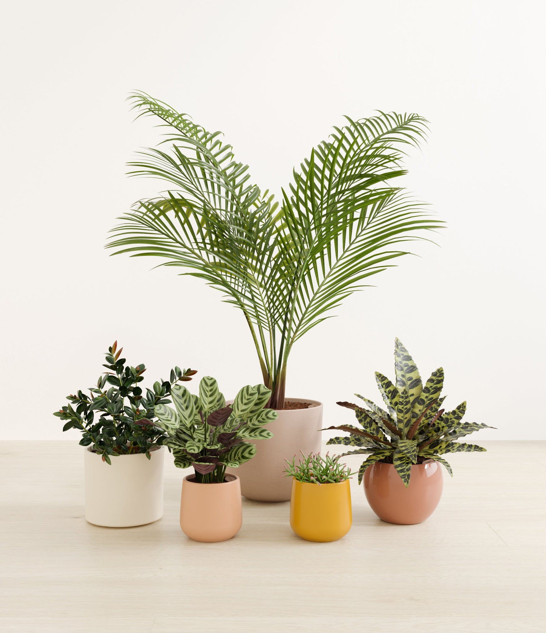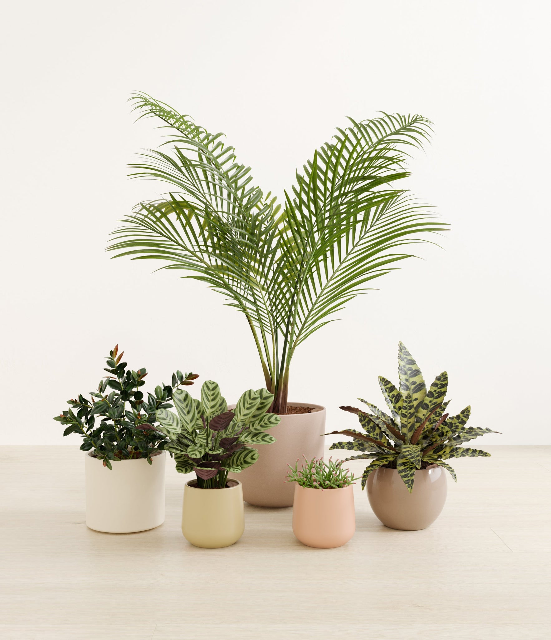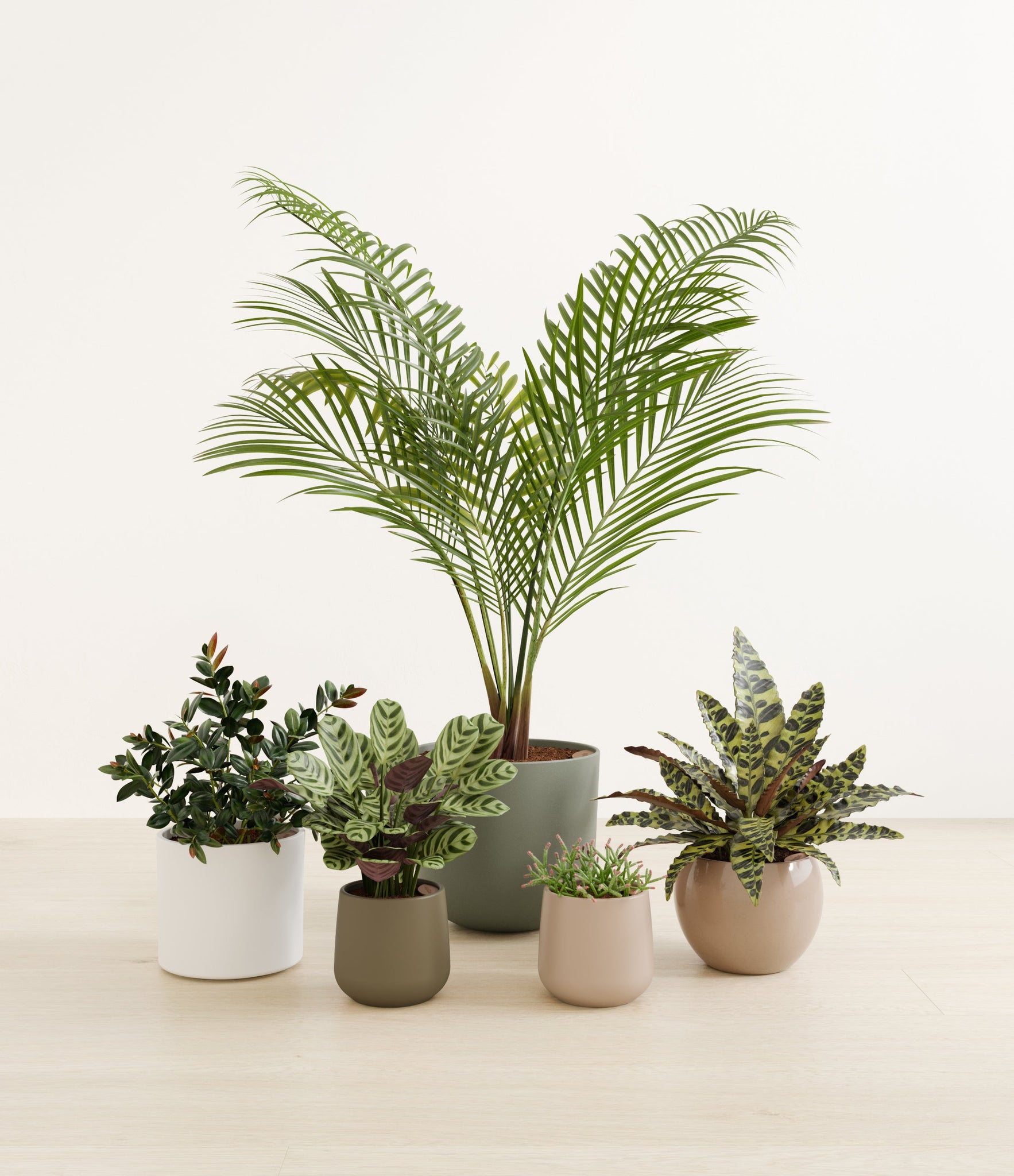 In this collection, you’ll receive five pet-friendly houseplants that bring softness, movement, and a splash of charm to any space. The set includes a small Mistletoe Cactus, with pencil-thin trailing foliage that adds quirky texture; a small Marxii Calathea, known for its emblem-shaped leaves marked with bold brushstroke patterns; a medium Rattlesnake Calathea, with eccentric reptilian foliage and a deep plum underside; a medium Goldfish Plant, adored for its glossy leaves and orange, fish-shaped blooms; and a huge Majesty Palm, a centerpiece with elegant fronds and graceful curves. Together, these plants create a playful and safe indoor oasis - perfect for pet lovers and design lovers alike.