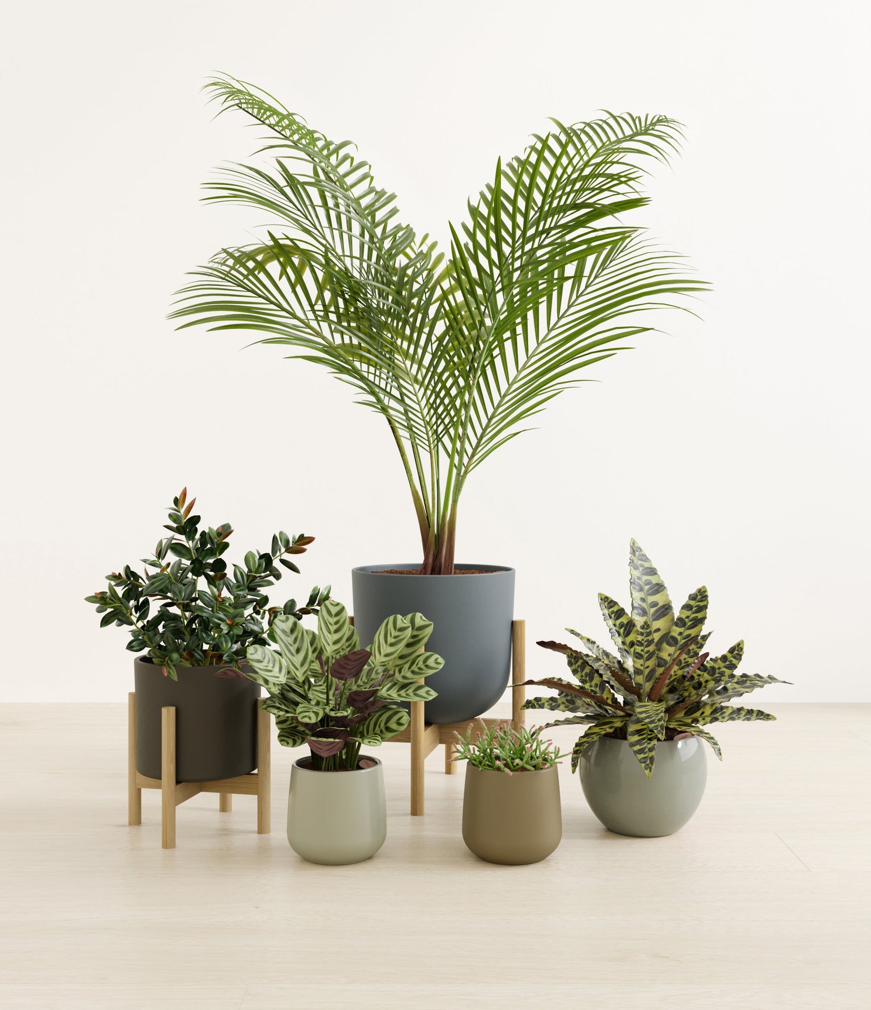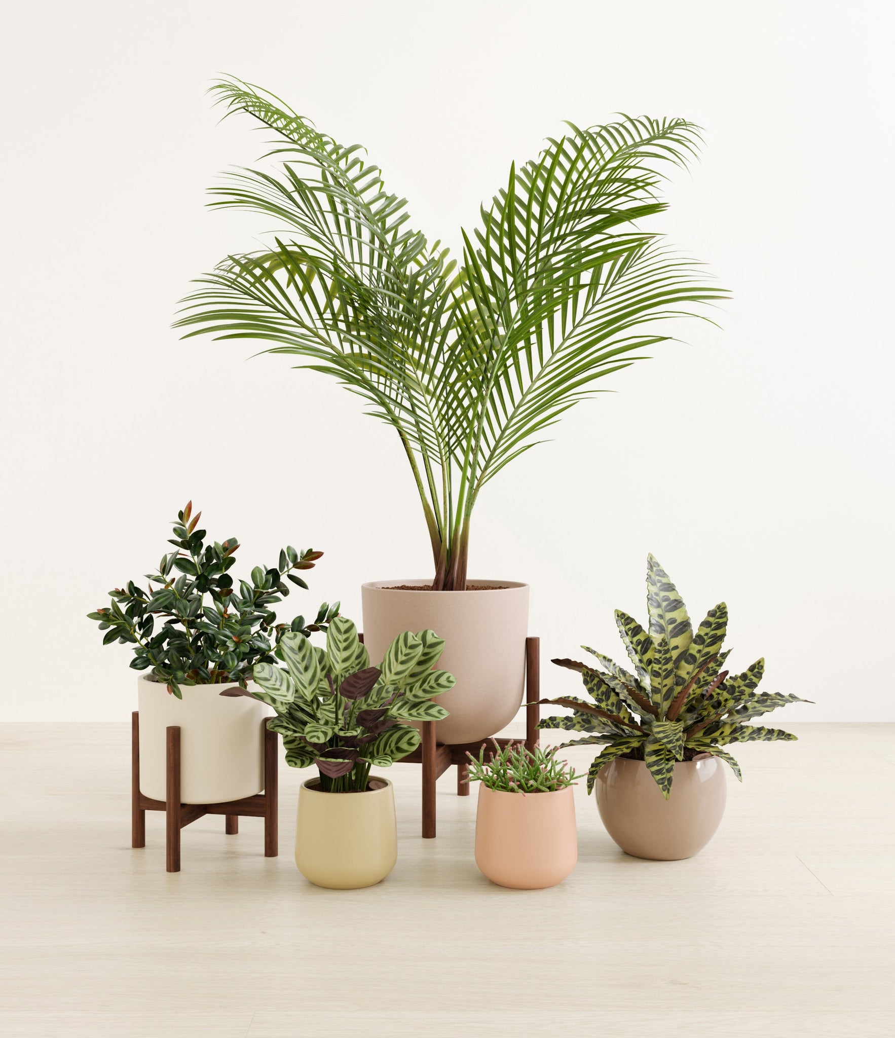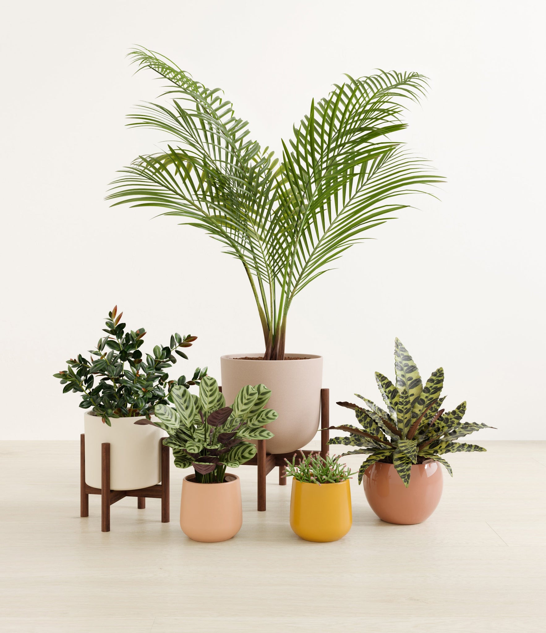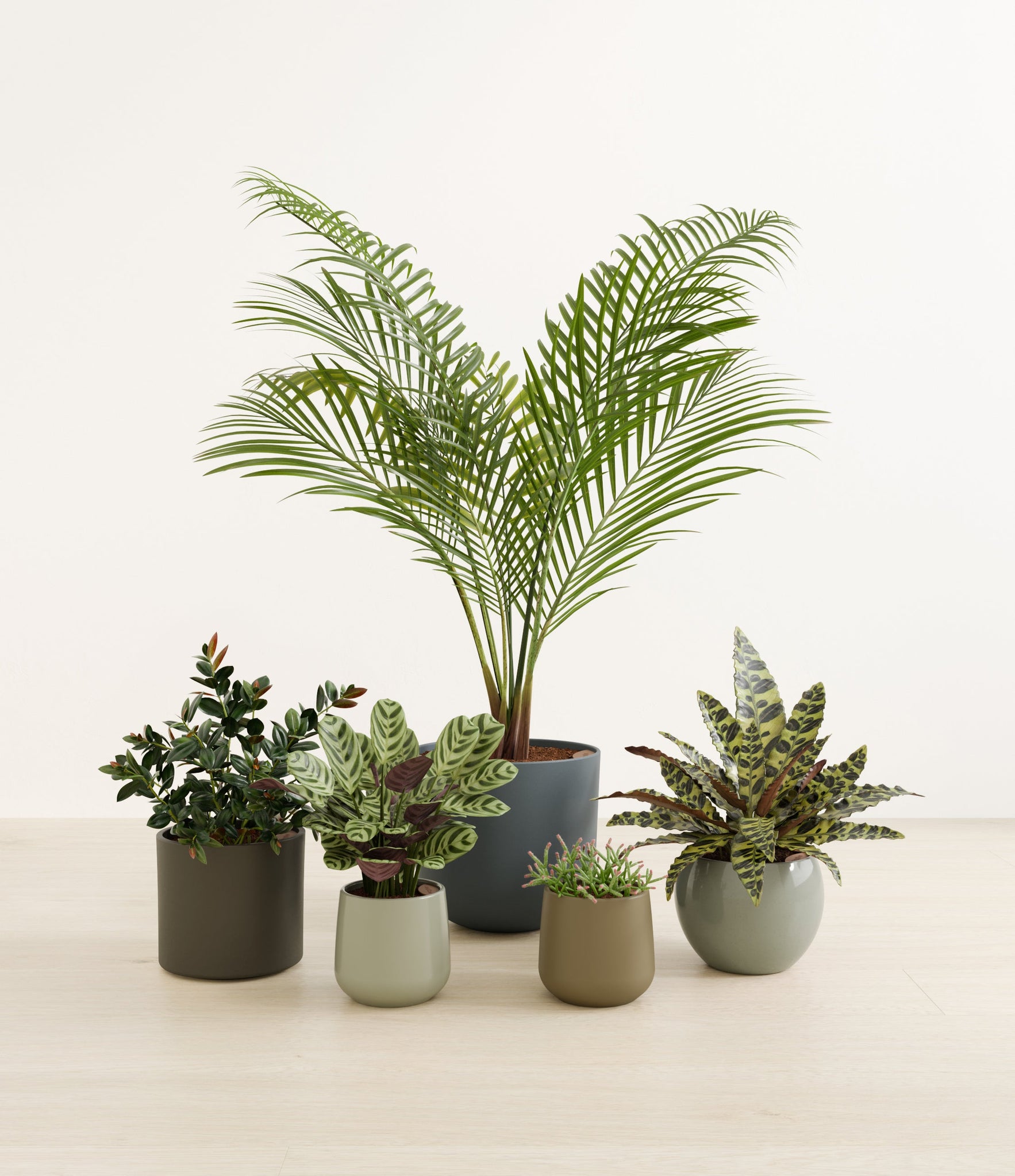 In this collection, you’ll receive five pet-friendly houseplants that bring softness, movement, and a splash of charm to any space. The set includes a small Mistletoe Cactus, with pencil-thin trailing foliage that adds quirky texture; a small Marxii Calathea, known for its emblem-shaped leaves marked with bold brushstroke patterns; a medium Rattlesnake Calathea, with eccentric reptilian foliage and a deep plum underside; a medium Goldfish Plant, adored for its glossy leaves and orange, fish-shaped blooms; and a huge Majesty Palm, a centerpiece with elegant fronds and graceful curves. Together, these plants create a playful and safe indoor oasis - perfect for pet lovers and design lovers alike.