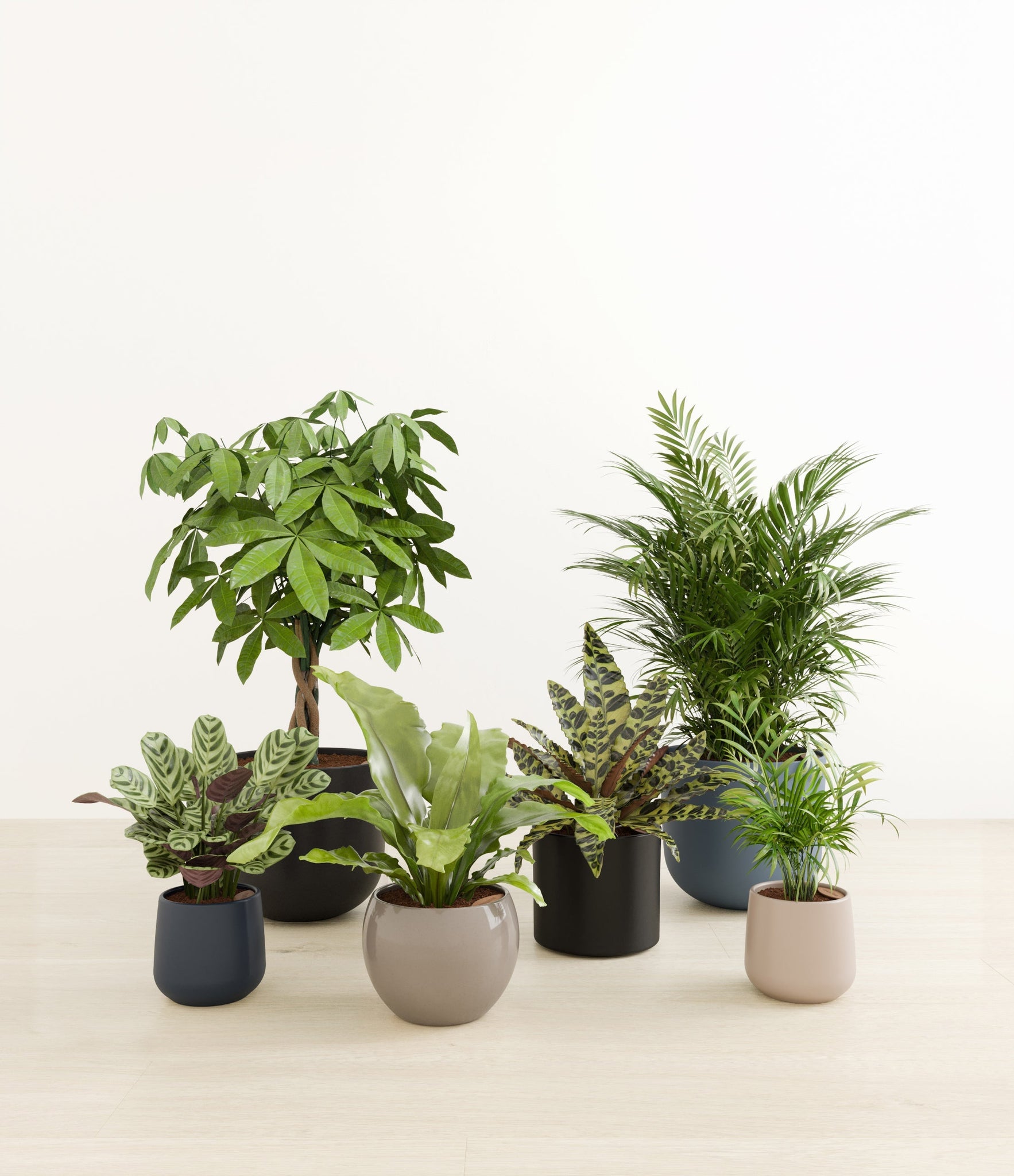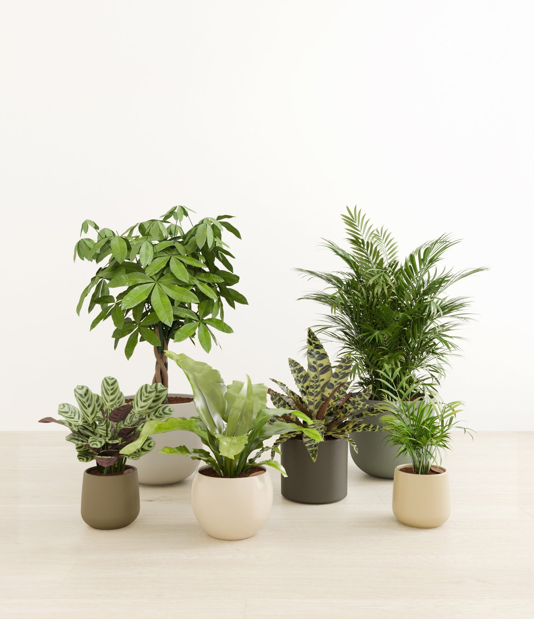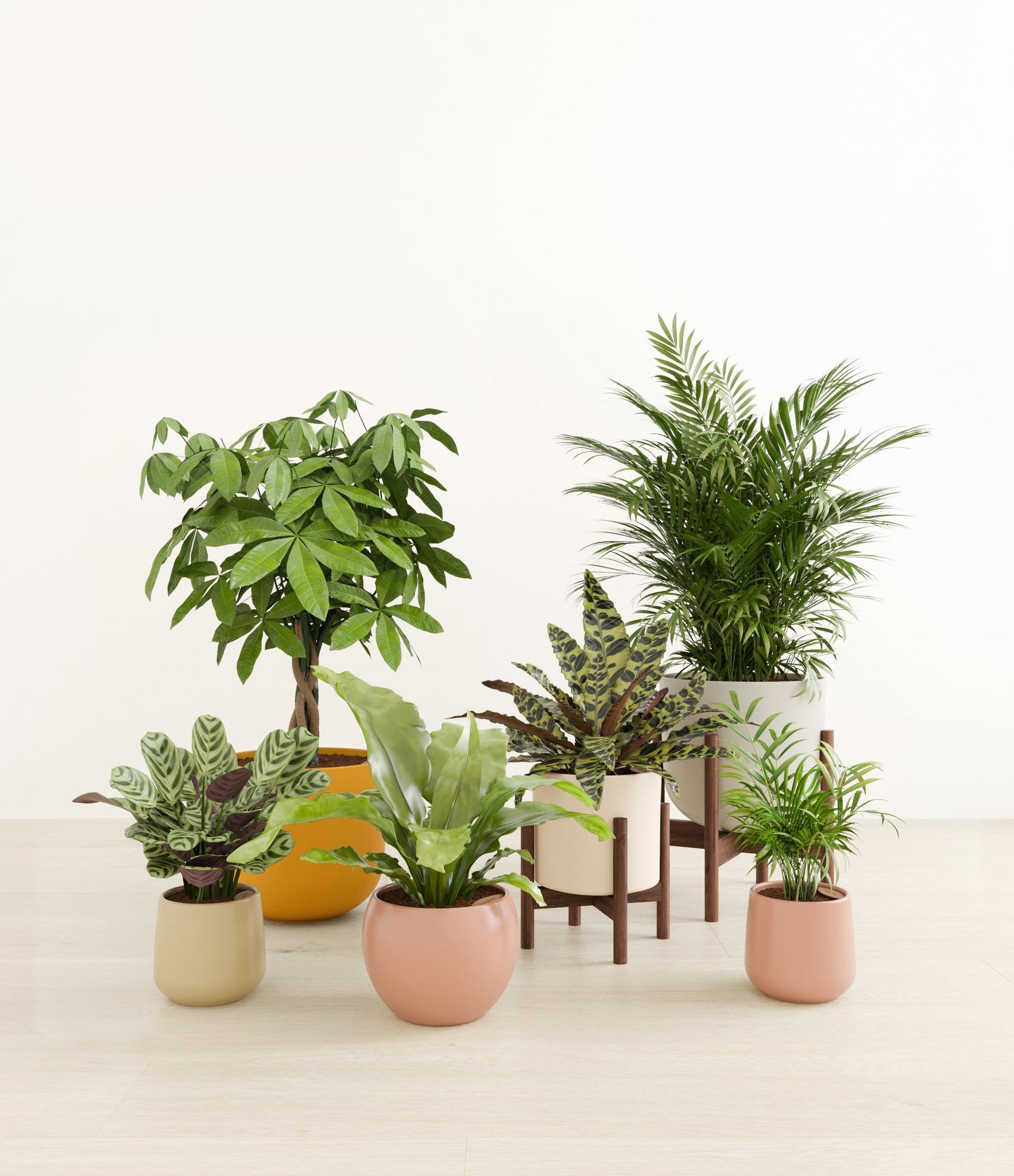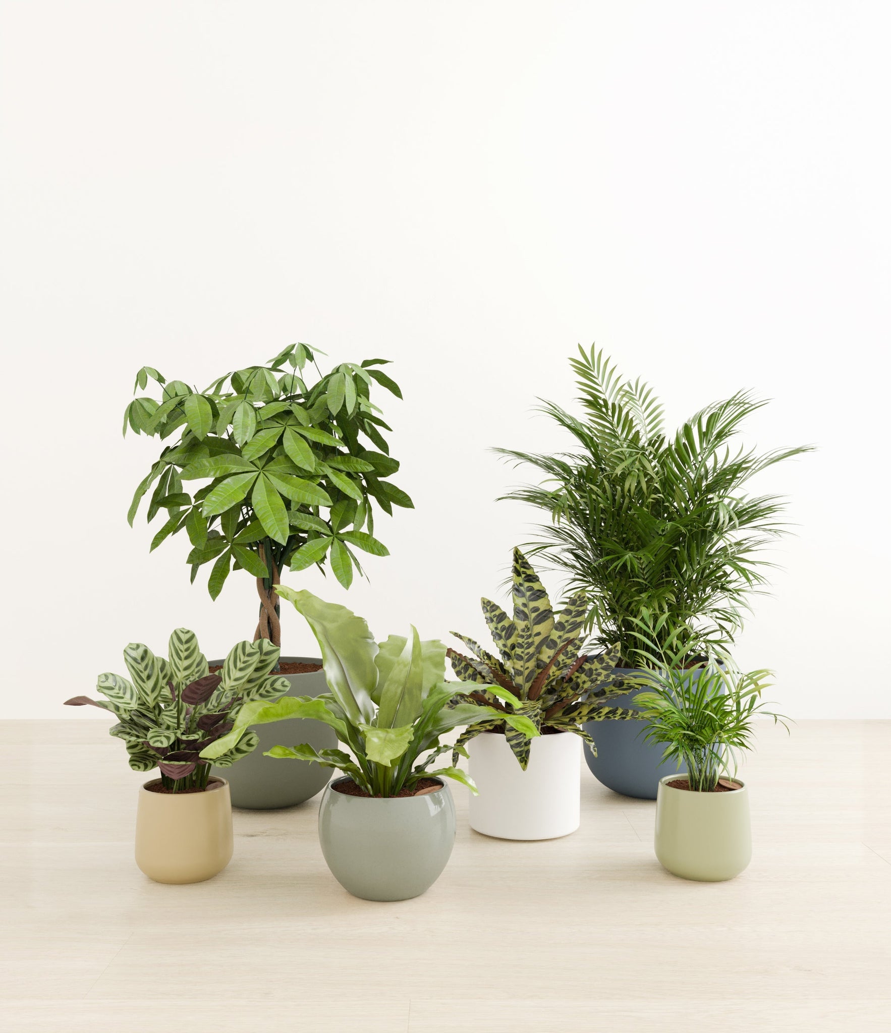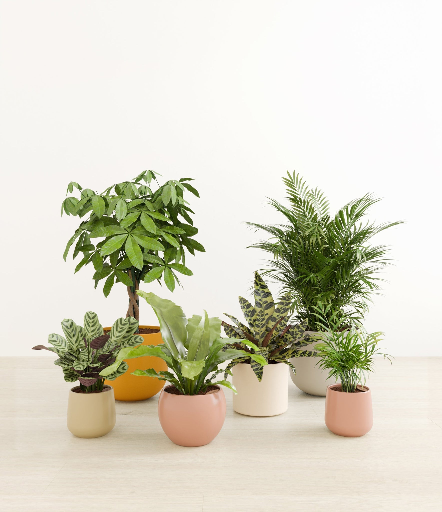In this collection, you’ll receive six elegant, pet-friendly houseplants that make any indoor space a natural sanctuary. This set includes a small Marxii Calathea – wearing an eccentric reptilian pattern on its leaves; a small and large Parlor Palms requiring little light to deliver absolute radiance; a medium Birds’ Nest Fern bursting with bright green, wavy fronds in a fluttering rosette; a medium Rattlesnake Calathea, wearing its signature reptilian pattern; and a large Money Tree with leaves and a trunk symbolizing good fortune and prosperity.