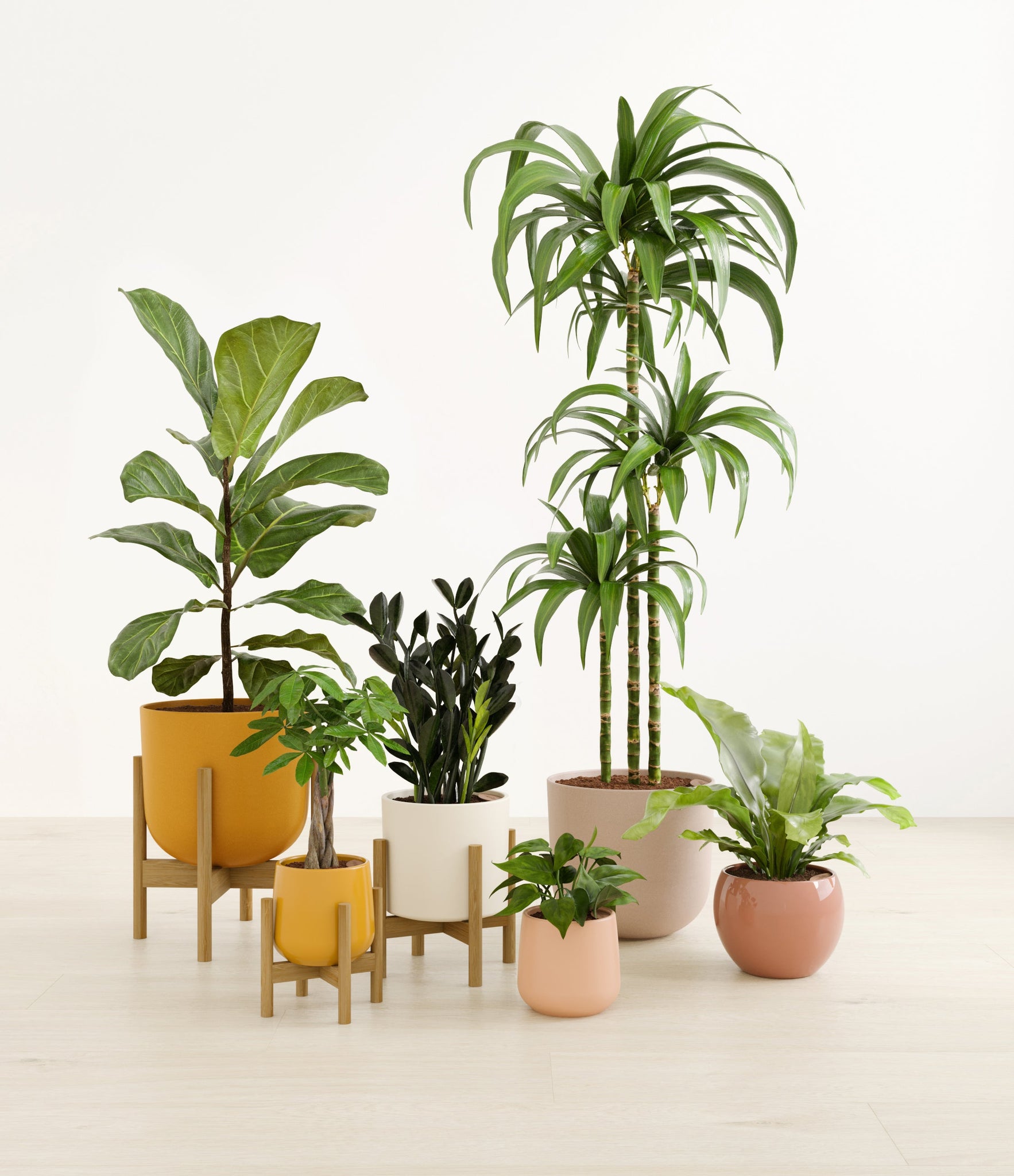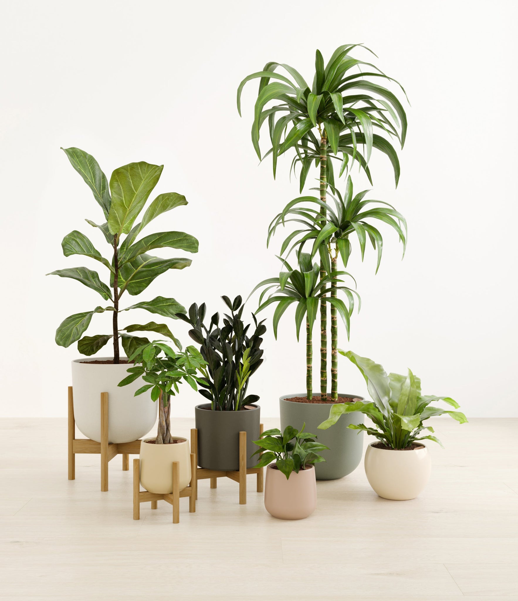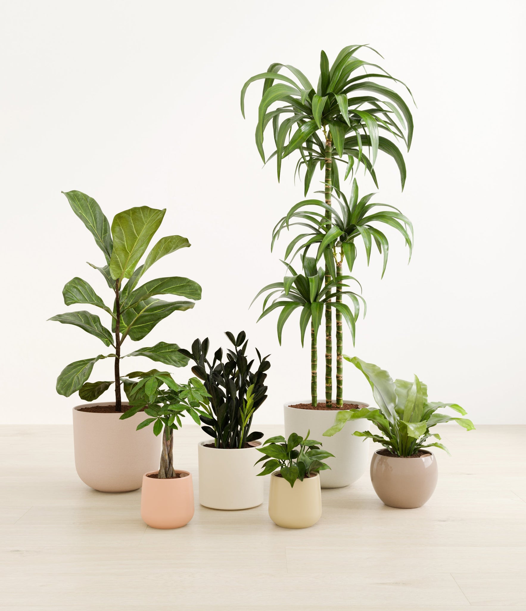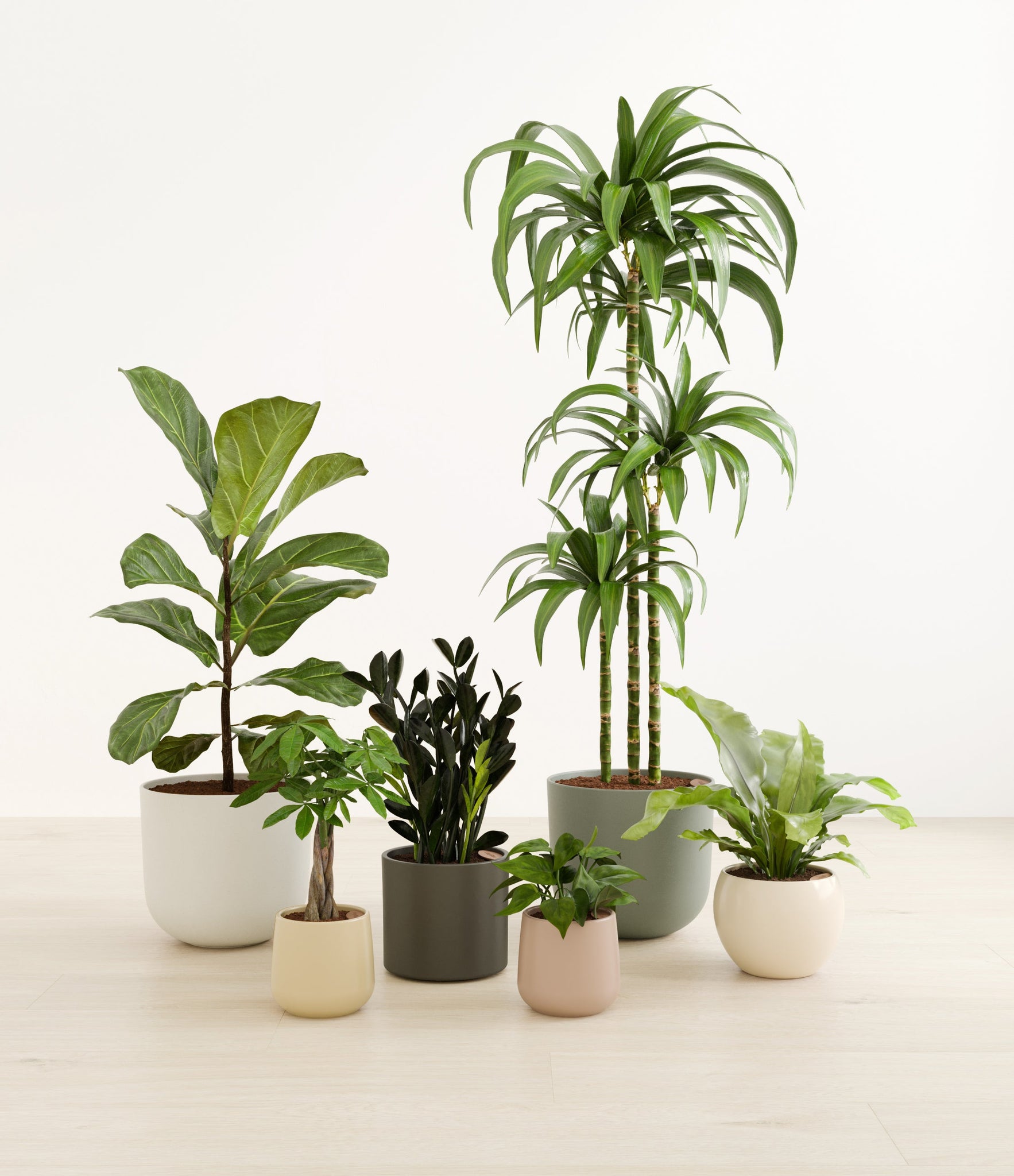 In this collection, you’ll receive six beloved houseplants that bring texture, depth, and timeless style to any space. The set includes a small Money Tree, long cherished as a symbol of good fortune and prosperity; a small Heartleaf Philodendron, with trailing, heart-shaped leaves that add a touch of softness and movement; a medium Black ZZ Plant, a sculptural beauty with dark, glossy foliage and unmatched resilience; a medium Birds’ Nest Fern, bursting with wavy, bright green fronds in a fluttering rosette; a large Fiddle Leaf Fig, a statement piece with bold, lyre-shaped leaves; and a huge Janet Craig, a hardy favorite known for its upright form and rich green color. Together, these six create a balanced, lush display, bringing both structure and flow to your indoor jungle.