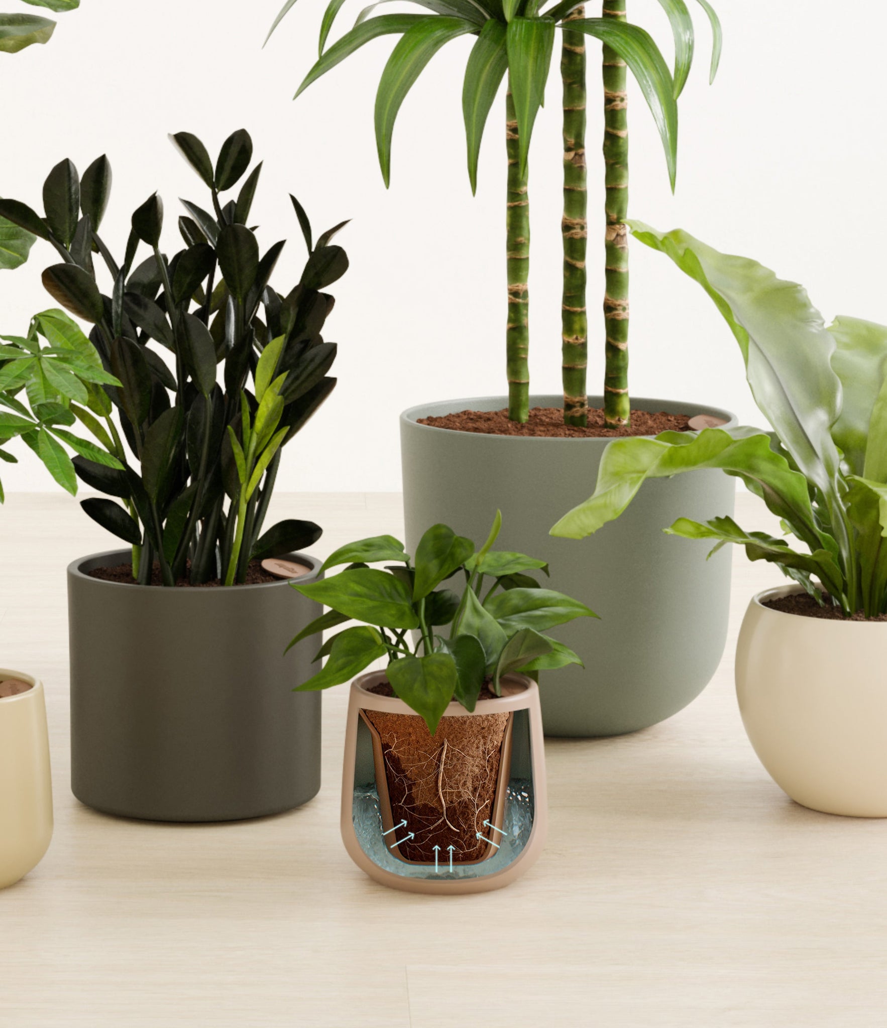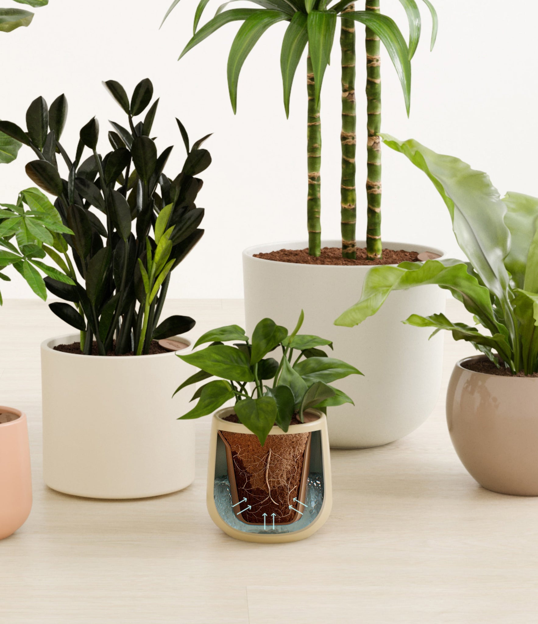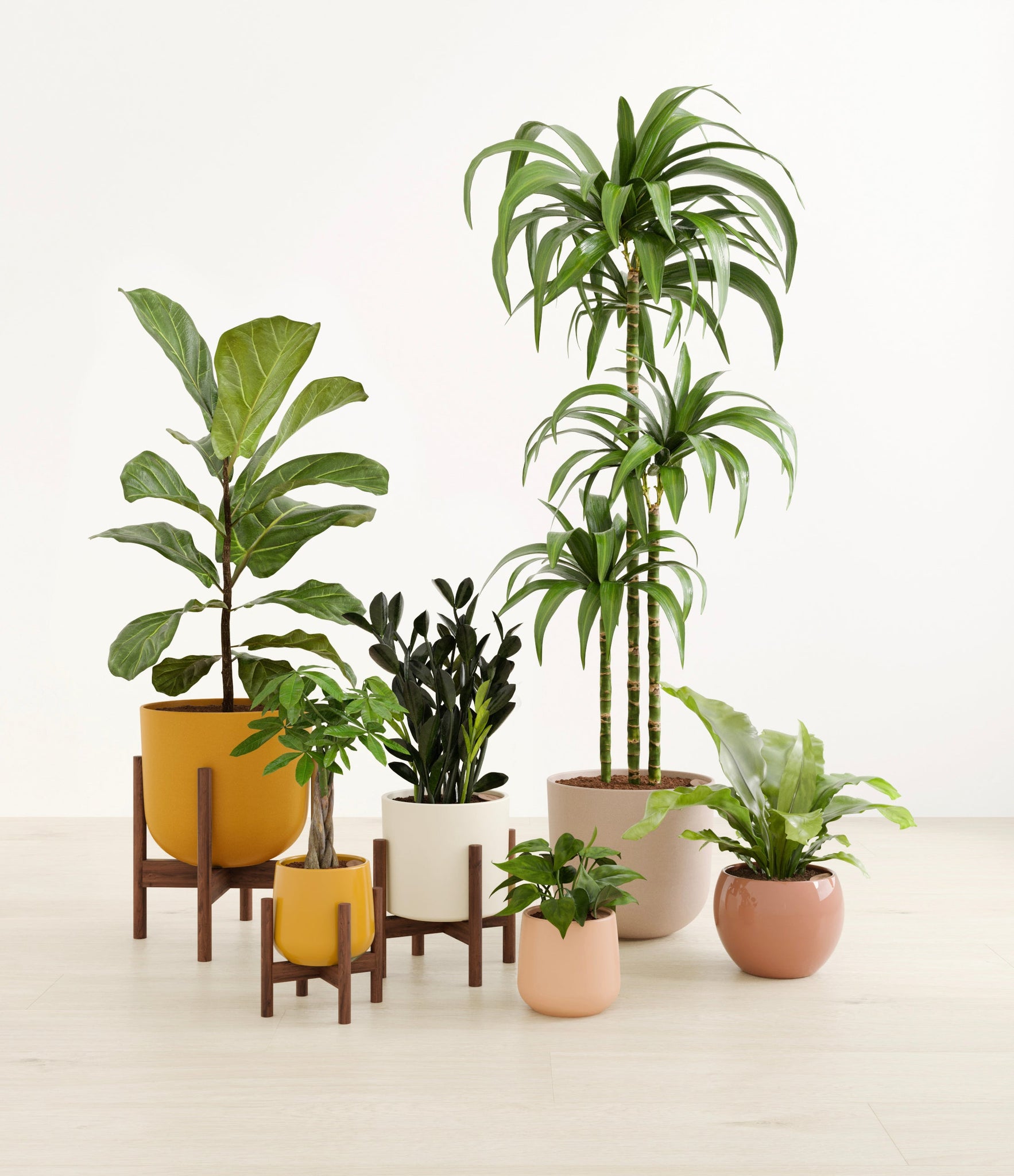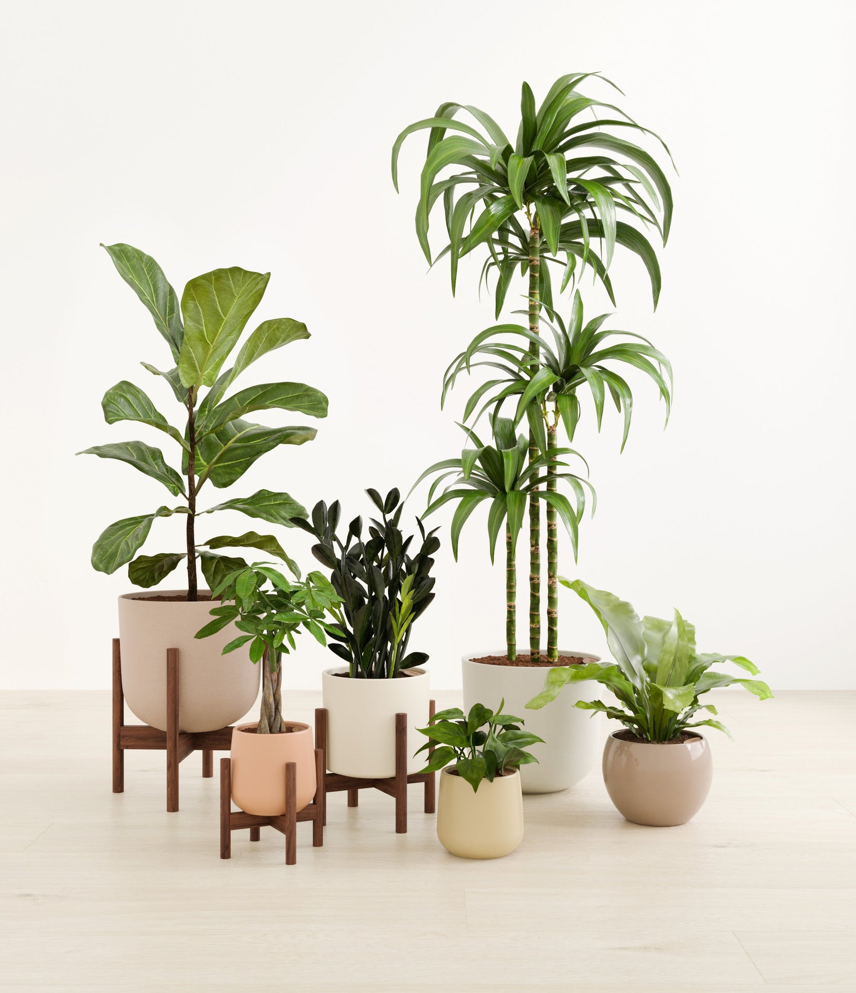 In this collection, you’ll receive six beloved houseplants that bring texture, depth, and timeless style to any space. The set includes a small Money Tree, long cherished as a symbol of good fortune and prosperity; a small Heartleaf Philodendron, with trailing, heart-shaped leaves that add a touch of softness and movement; a medium Black ZZ Plant, a sculptural beauty with dark, glossy foliage and unmatched resilience; a medium Birds’ Nest Fern, bursting with wavy, bright green fronds in a fluttering rosette; a large Fiddle Leaf Fig, a statement piece with bold, lyre-shaped leaves; and a huge Janet Craig, a hardy favorite known for its upright form and rich green color. Together, these six create a balanced, lush display, bringing both structure and flow to your indoor jungle.