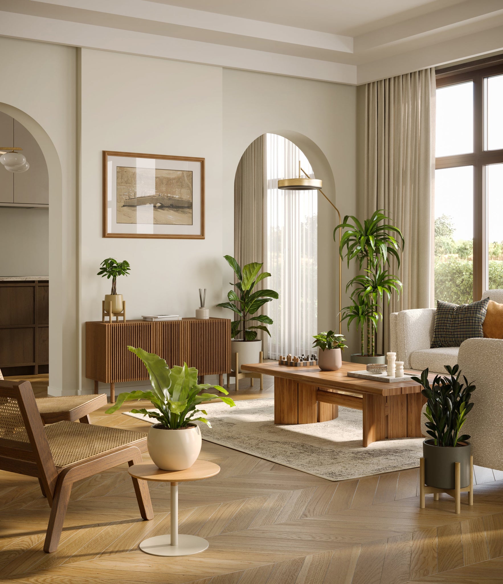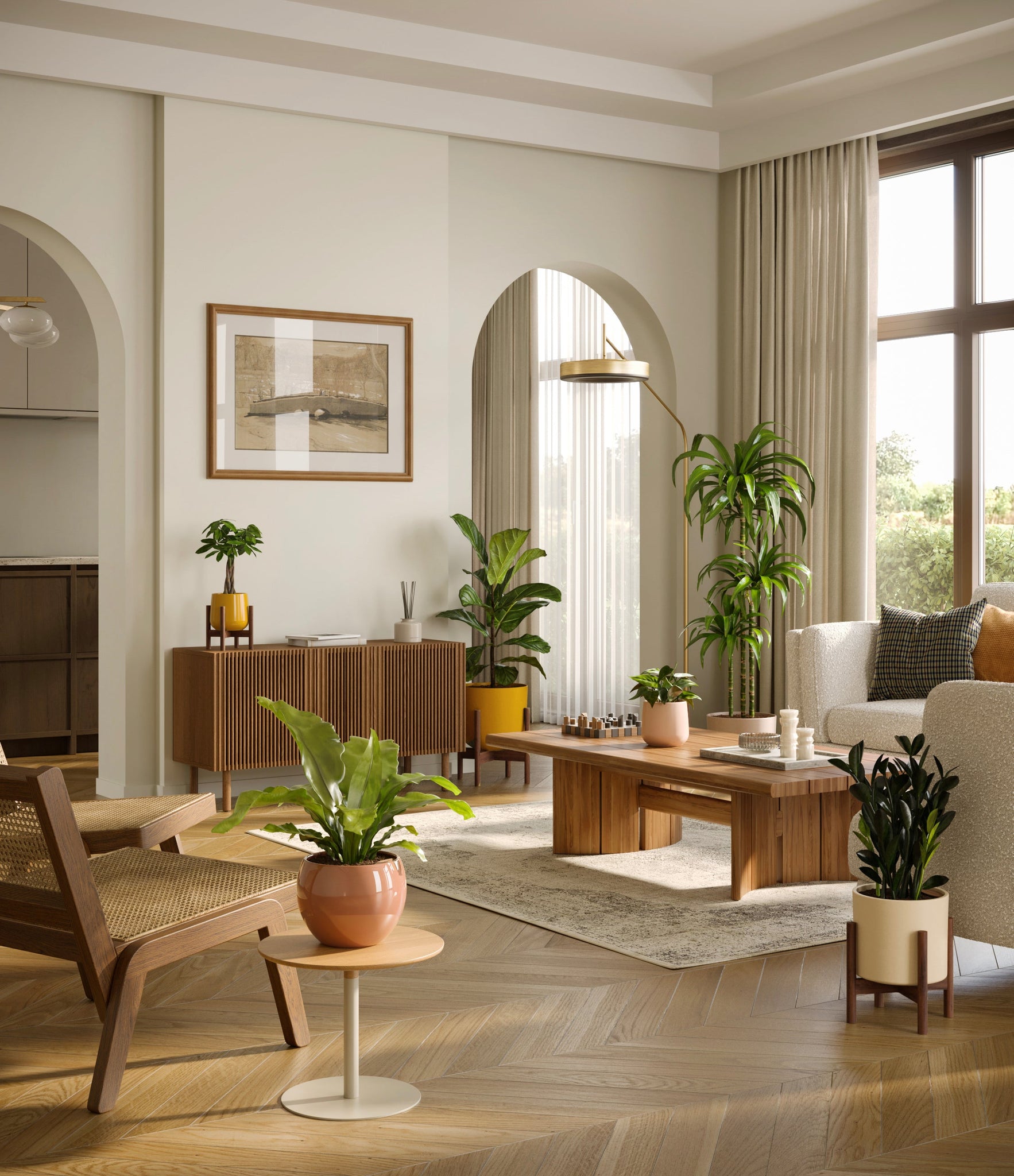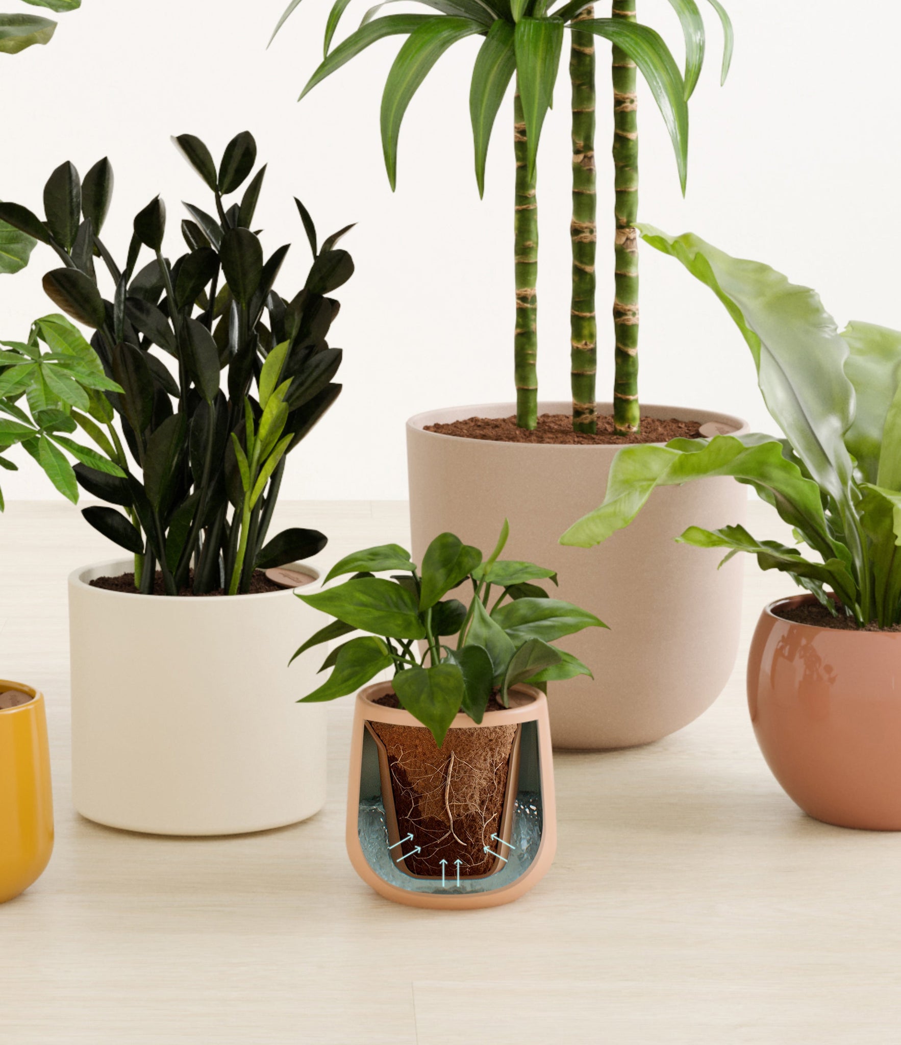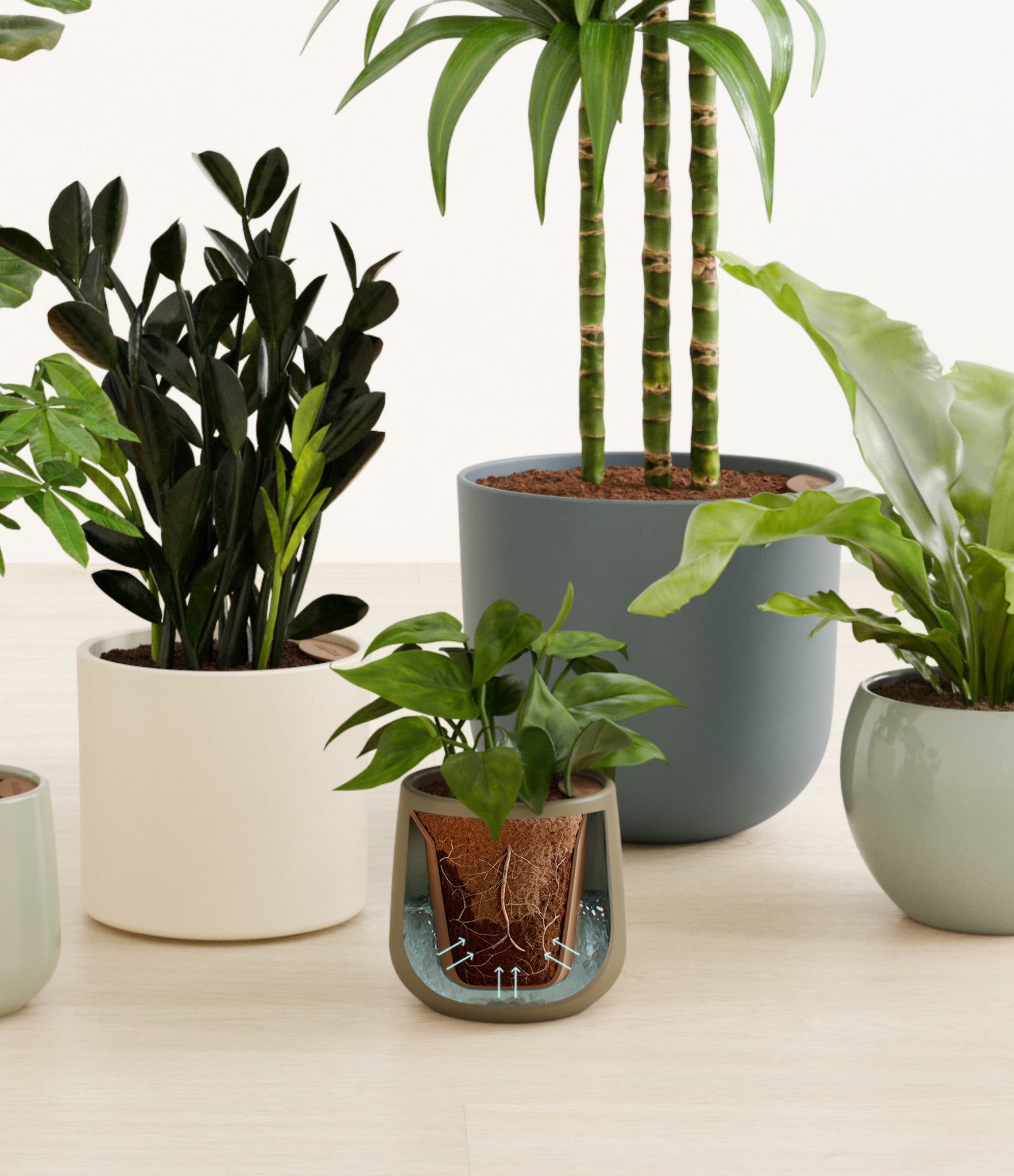 In this collection, you’ll receive six beloved houseplants that bring texture, depth, and timeless style to any space. The set includes a small Money Tree, long cherished as a symbol of good fortune and prosperity; a small Heartleaf Philodendron, with trailing, heart-shaped leaves that add a touch of softness and movement; a medium Black ZZ Plant, a sculptural beauty with dark, glossy foliage and unmatched resilience; a medium Birds’ Nest Fern, bursting with wavy, bright green fronds in a fluttering rosette; a large Fiddle Leaf Fig, a statement piece with bold, lyre-shaped leaves; and a huge Janet Craig, a hardy favorite known for its upright form and rich green color. Together, these six create a balanced, lush display, bringing both structure and flow to your indoor jungle.