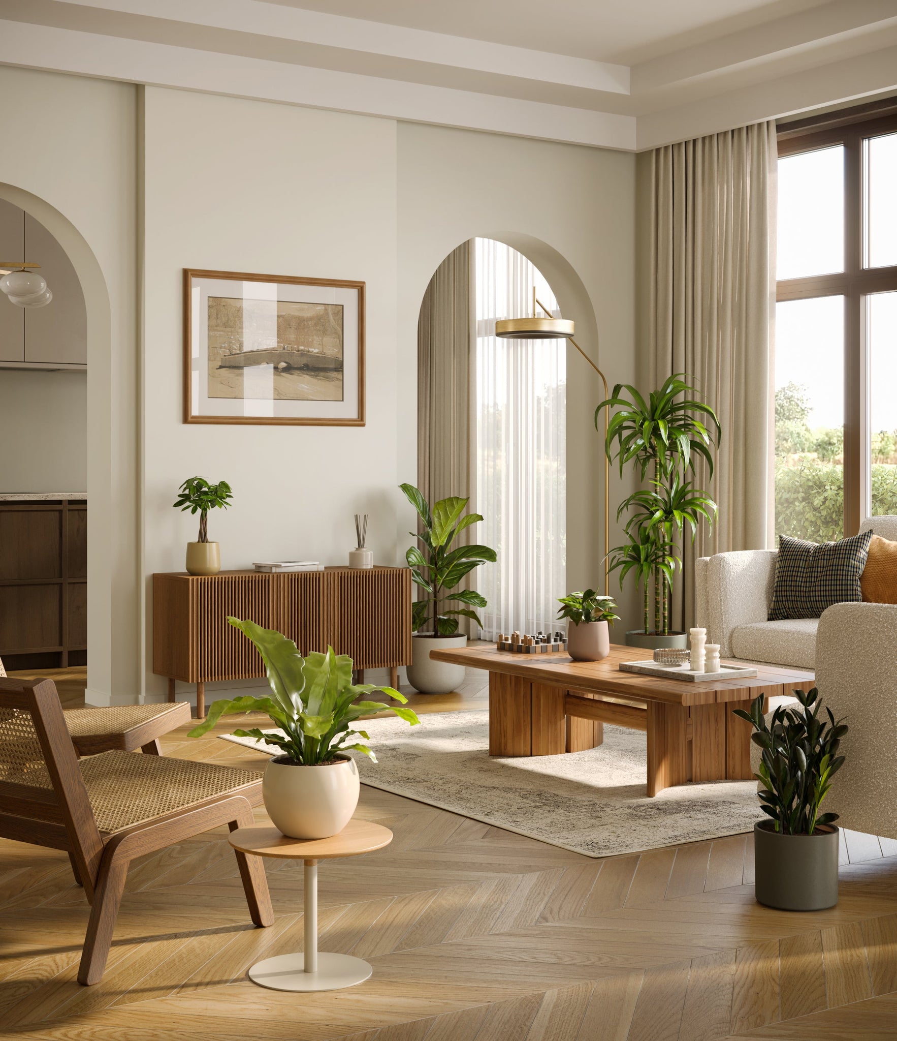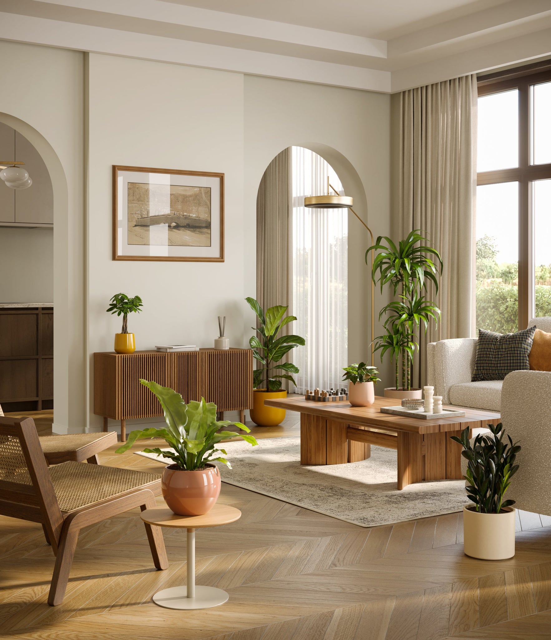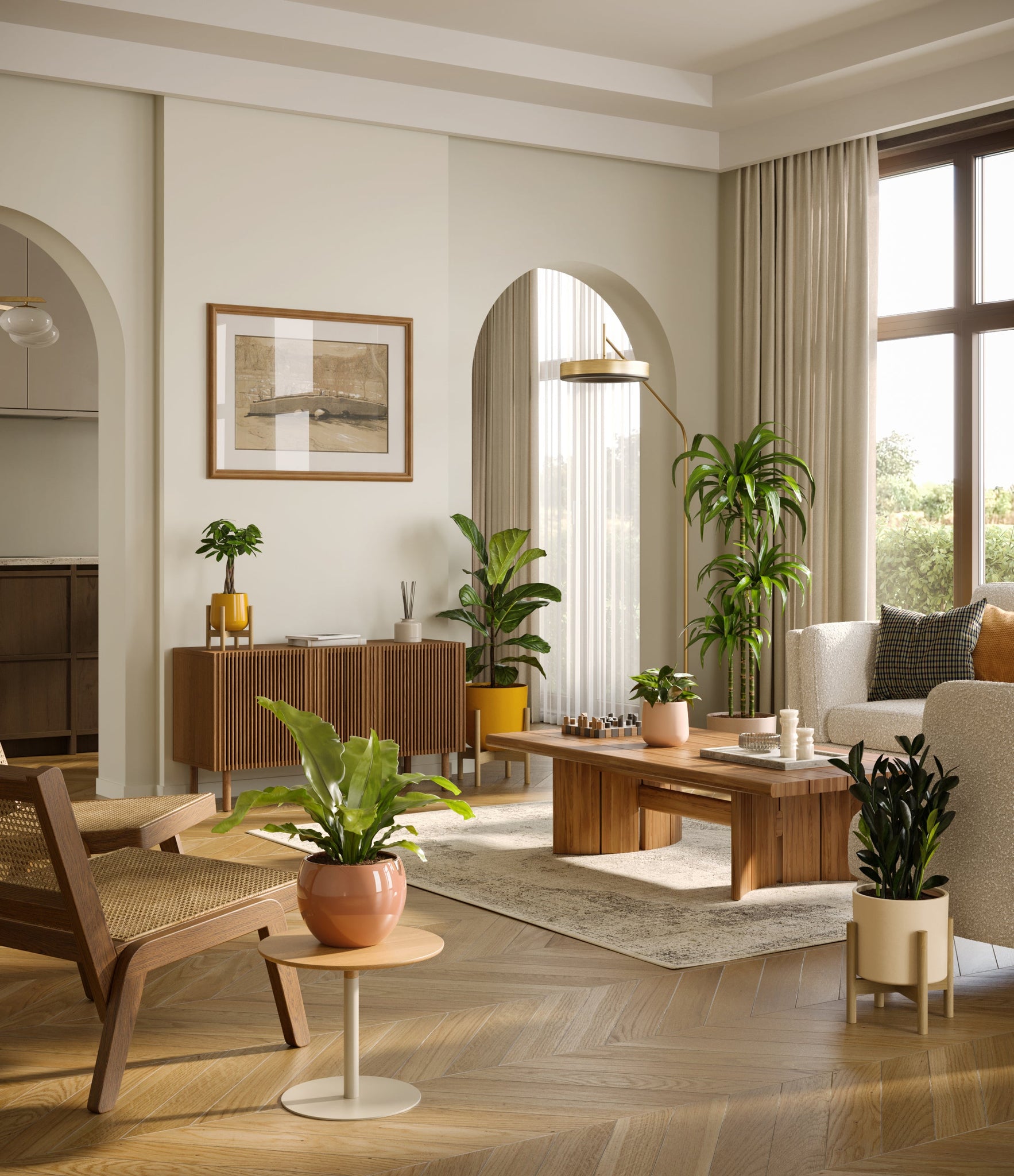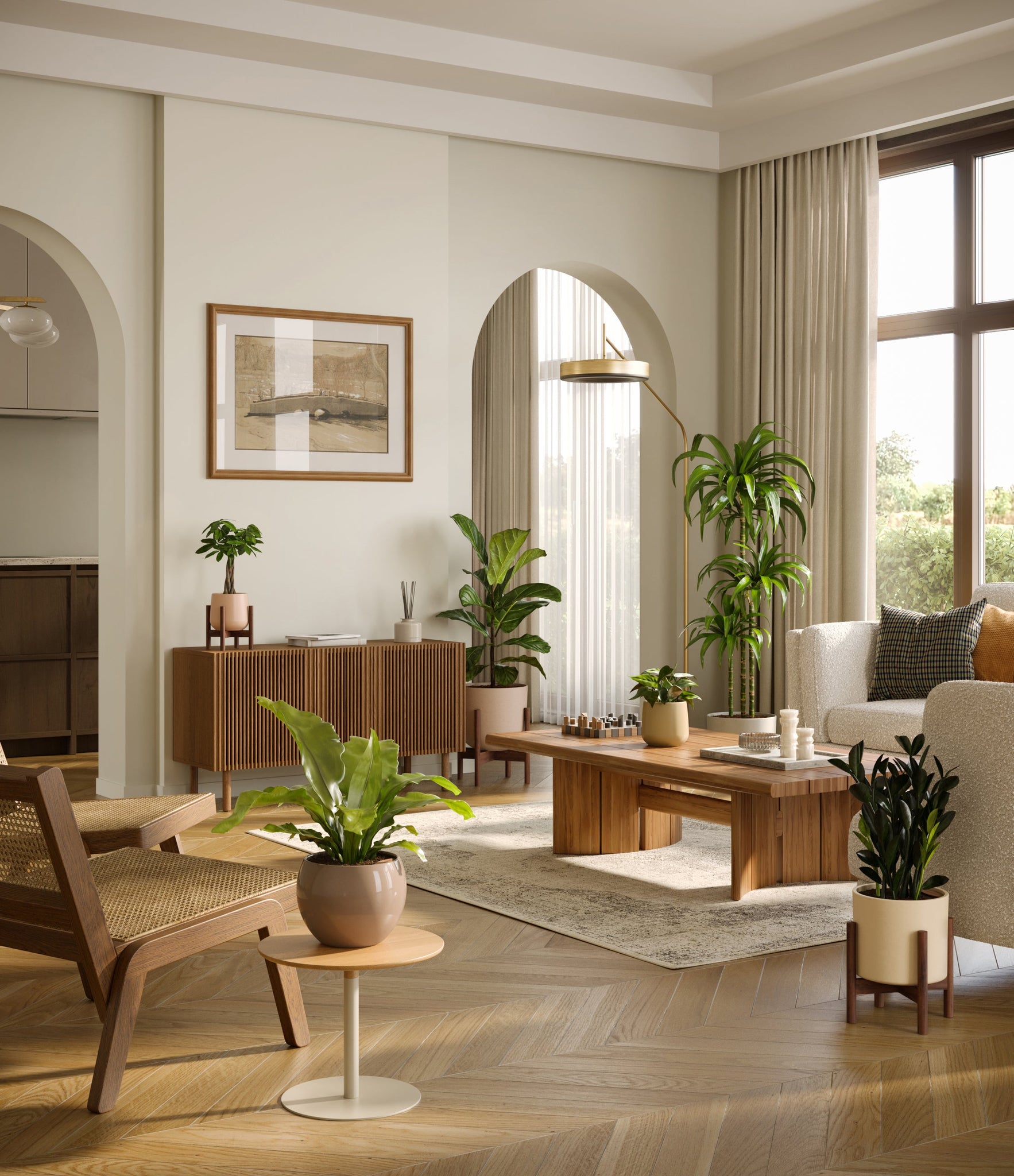 In this collection, you’ll receive six beloved houseplants that bring texture, depth, and timeless style to any space. The set includes a small Money Tree, long cherished as a symbol of good fortune and prosperity; a small Heartleaf Philodendron, with trailing, heart-shaped leaves that add a touch of softness and movement; a medium Black ZZ Plant, a sculptural beauty with dark, glossy foliage and unmatched resilience; a medium Birds’ Nest Fern, bursting with wavy, bright green fronds in a fluttering rosette; a large Fiddle Leaf Fig, a statement piece with bold, lyre-shaped leaves; and a huge Janet Craig, a hardy favorite known for its upright form and rich green color. Together, these six create a balanced, lush display, bringing both structure and flow to your indoor jungle.