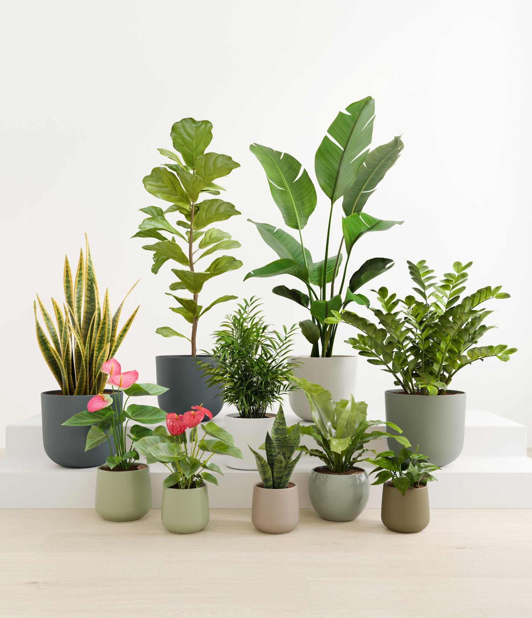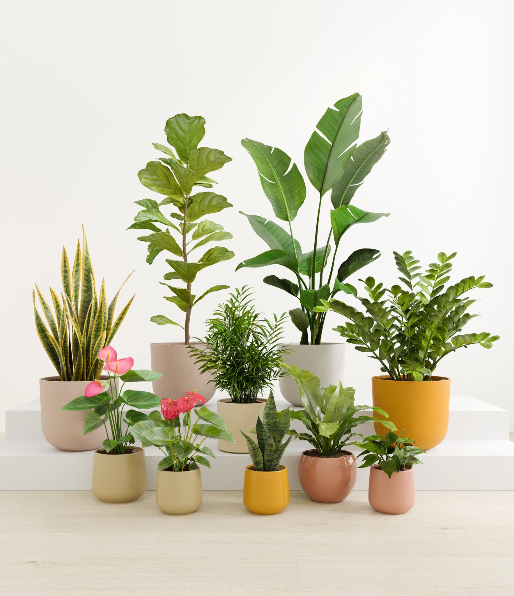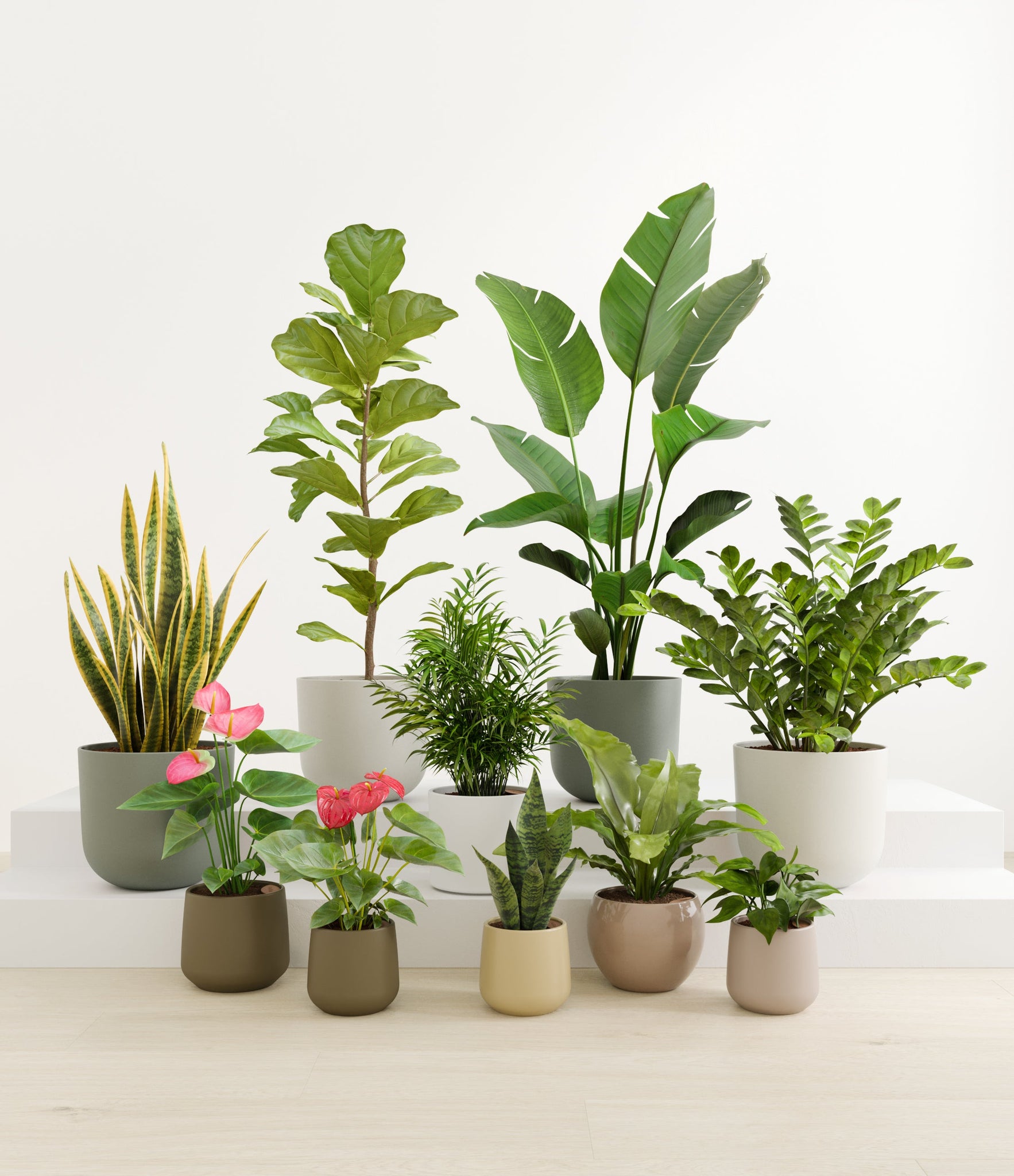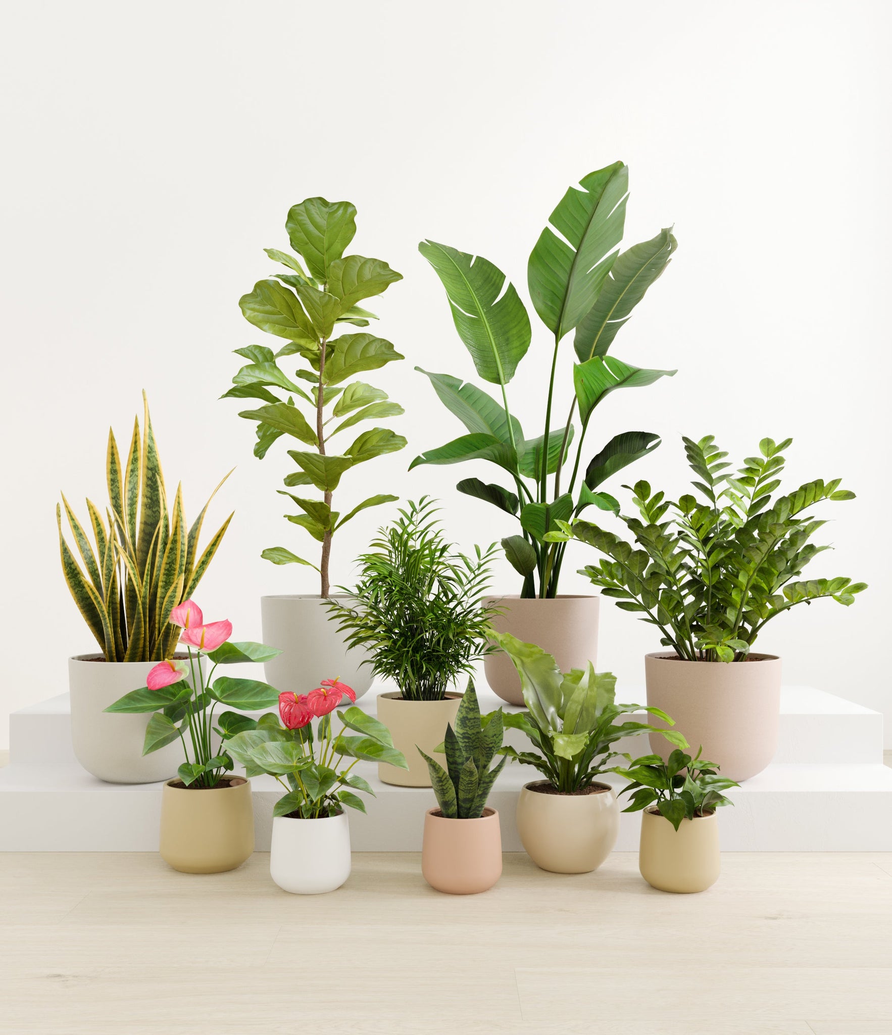 *****In this collection, you’ll receive ten beloved houseplants that blend structure, softness, and tropical flair in perfect harmony. The set includes a small Heartleaf Philodendron, trailing gently with soft, heart-shaped foliage; a small Anthurium Red, with heart-shaped waxy leaves that add a radiant pop of color; a small Green Snake Plant, known for its upright, sword-shaped leaves and effortless charm; a medium Birds’ Nest Fern, with bright, wavy fronds in a fluttering rosette; a medium Anthurium Sweet Dream, dressed in delicate pink spathes kissed with soft green; a medium Parlor Palm, a timeless classic with feathery fronds; a large Golden Snake Plant, offering resilience and vertical structure; a large ZZ Plant, loved for its glossy green leaves and tough nature; a huge Bird of Paradise, a striking centerpiece with long, arching fronds that bring height and movement; and a huge Fiddle Leaf Fig, with bold, lyre-shaped leaves that make any room feel styled and intentional. Together, these ten create a lush, layered indoor jungle, combining color, height, texture, and ease.