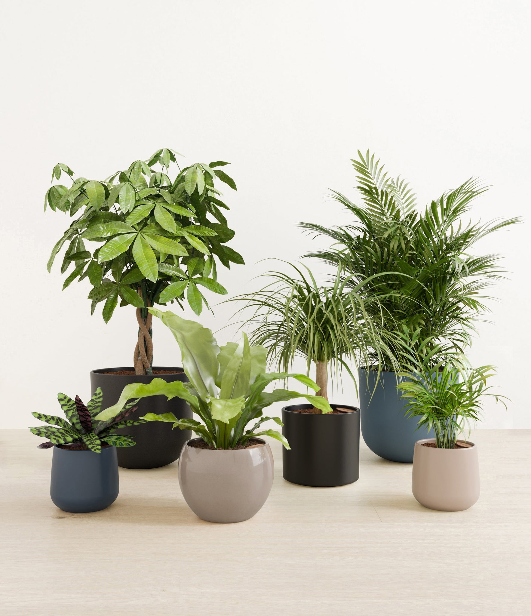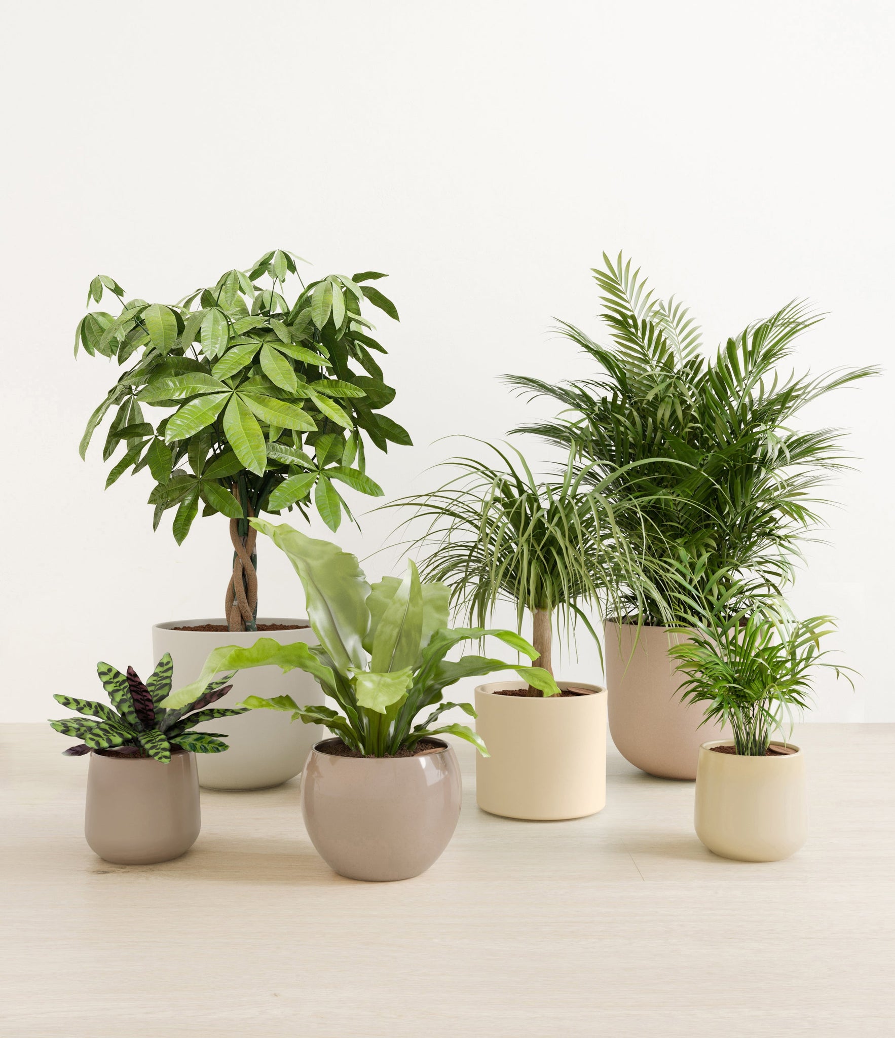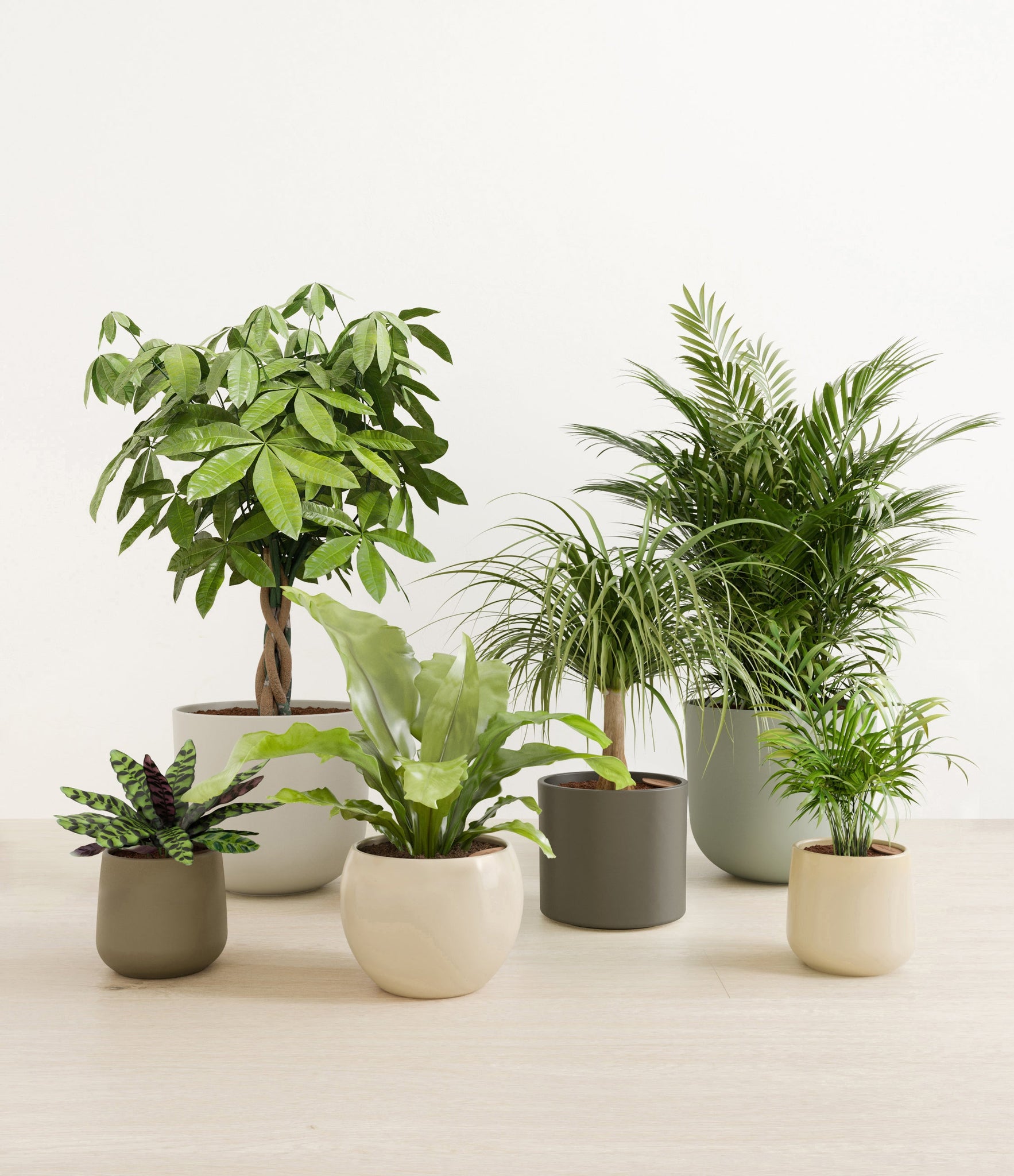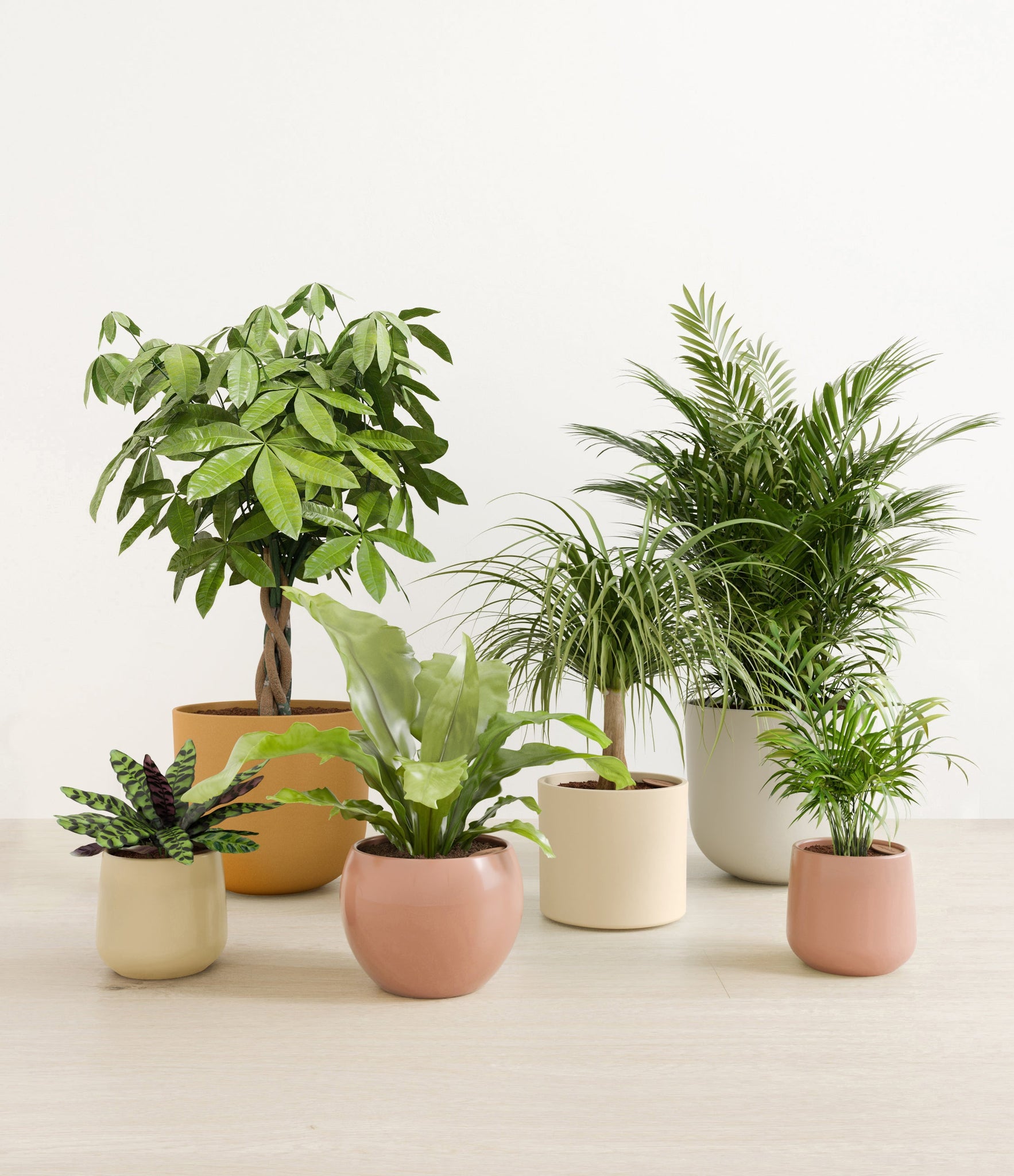 In this collection, you’ll receive six elegant, pet-friendly houseplants that make any indoor space a natural sanctuary. This set includes a small Rattlesnake Calathea – wearing an eccentric reptilian pattern on its leaves; a small and large Parlor Palms requiring little light to deliver absolute radiance; a medium Birds’ Nest Fern bursting with bright green, wavy fronds in a fluttering rosette; a medium Ponytail Palm - a resilient succulent with a flowing mane of leaves; and a large Money Tree with leaves and a trunk symbolizing good fortune and prosperity.