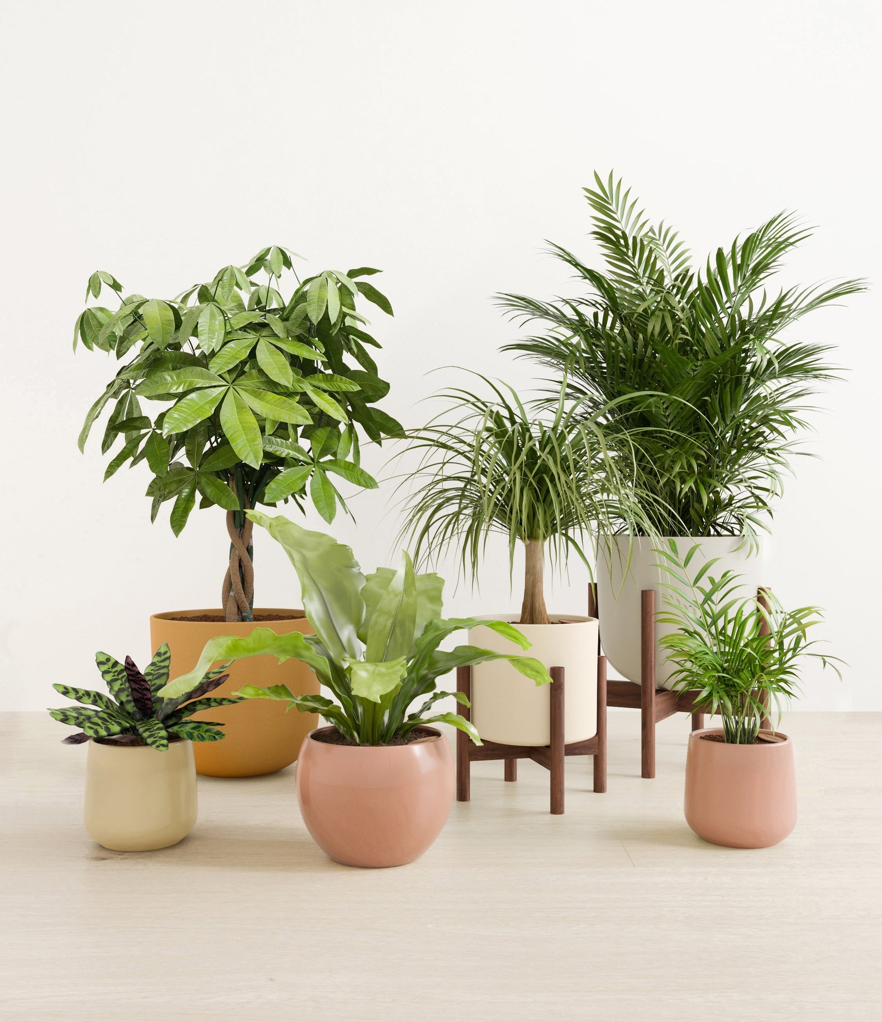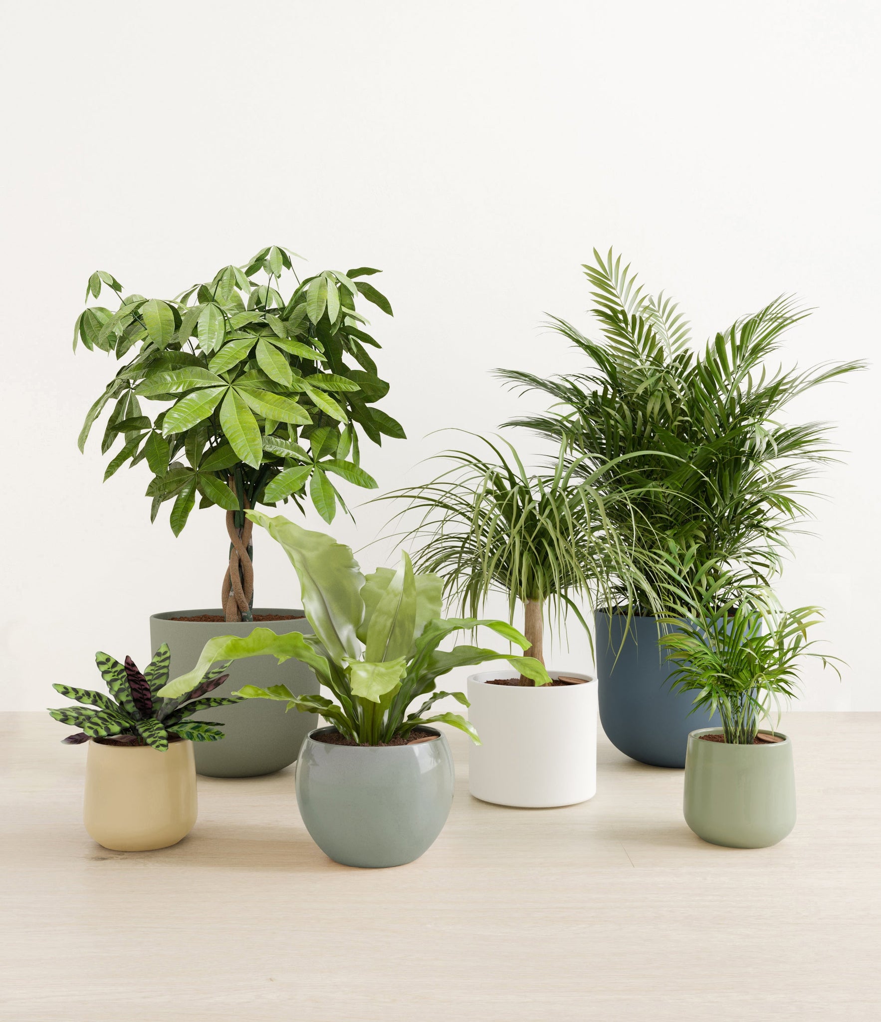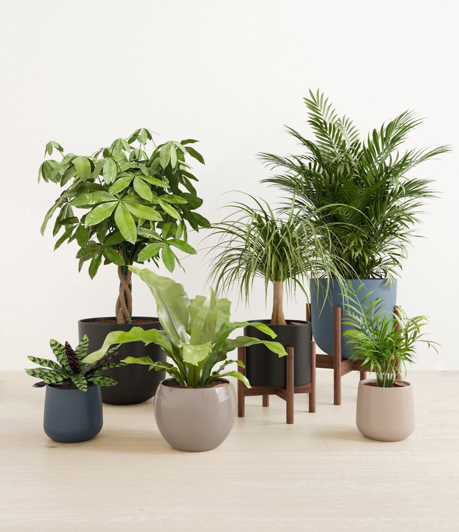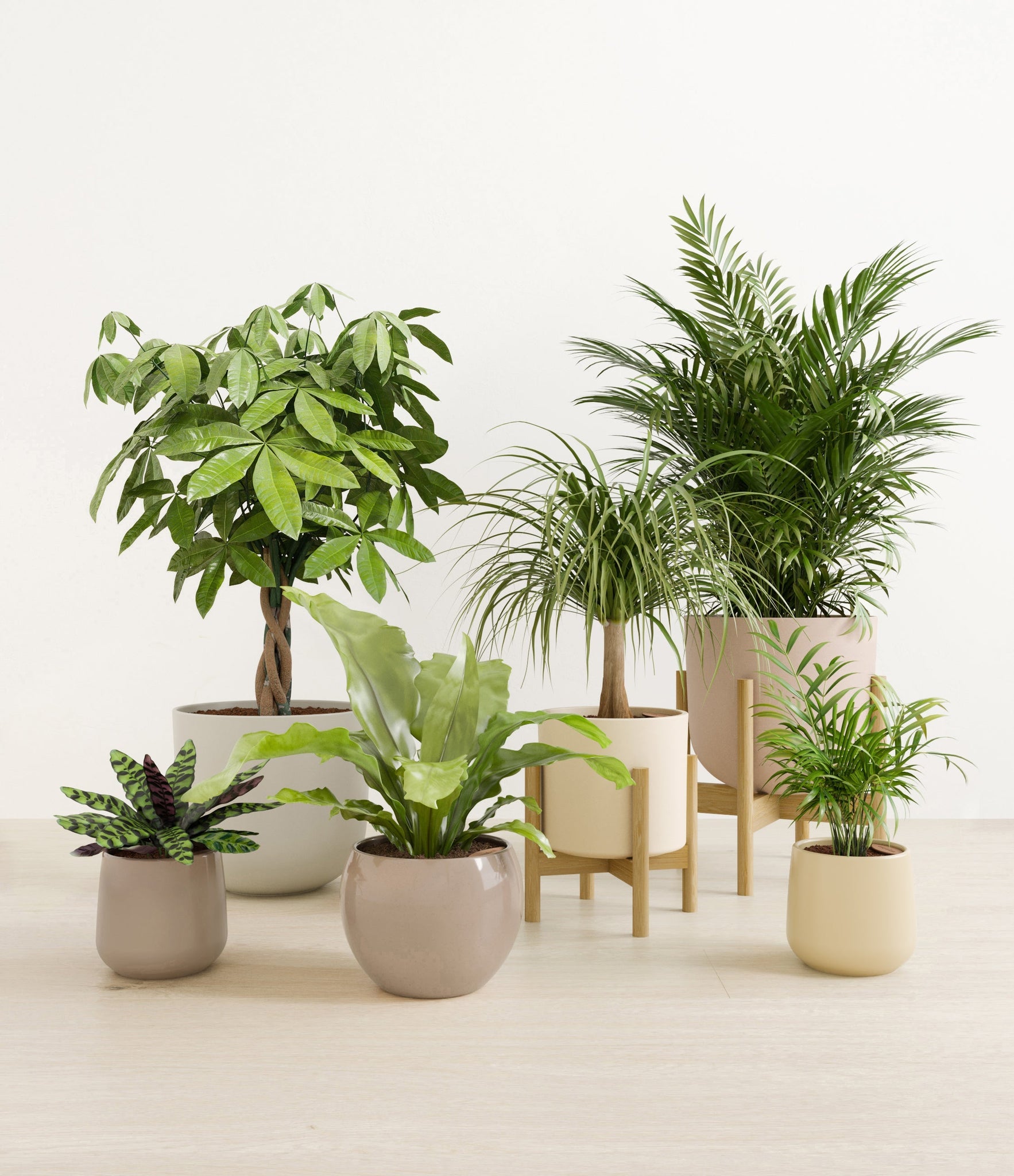 In this collection, you’ll receive six elegant, pet-friendly houseplants that make any indoor space a natural sanctuary. This set includes a small Rattlesnake Calathea – wearing an eccentric reptilian pattern on its leaves; a small and large Parlor Palms requiring little light to deliver absolute radiance; a medium Birds’ Nest Fern bursting with bright green, wavy fronds in a fluttering rosette; a medium Ponytail Palm - a resilient succulent with a flowing mane of leaves; and a large Money Tree with leaves and a trunk symbolizing good fortune and prosperity.