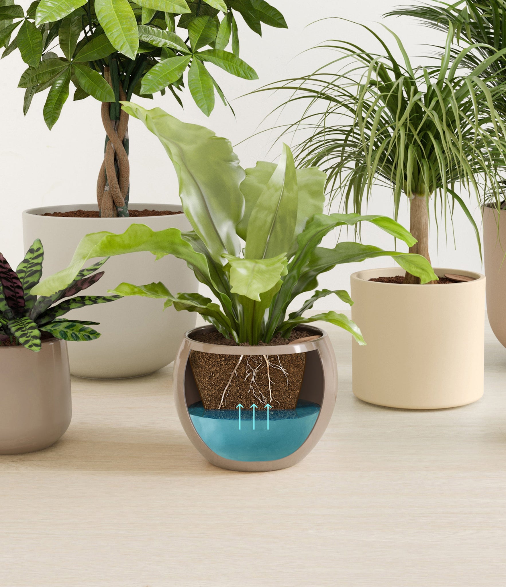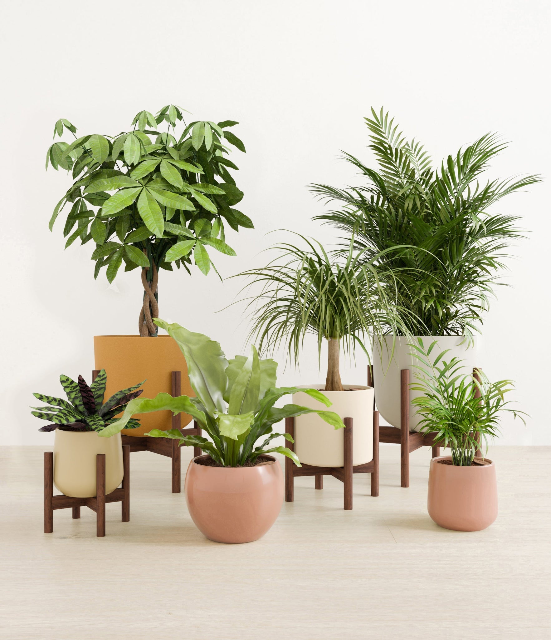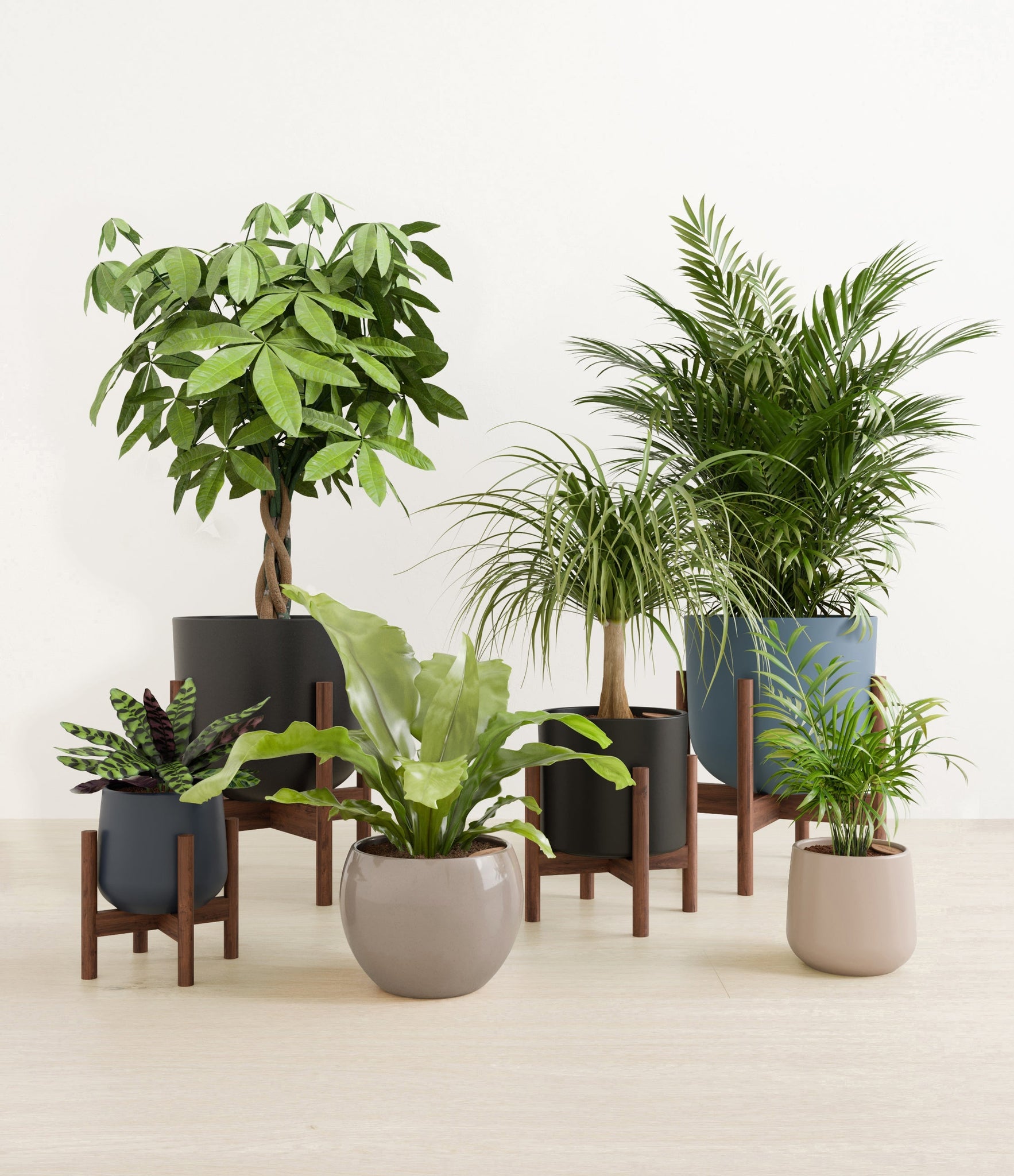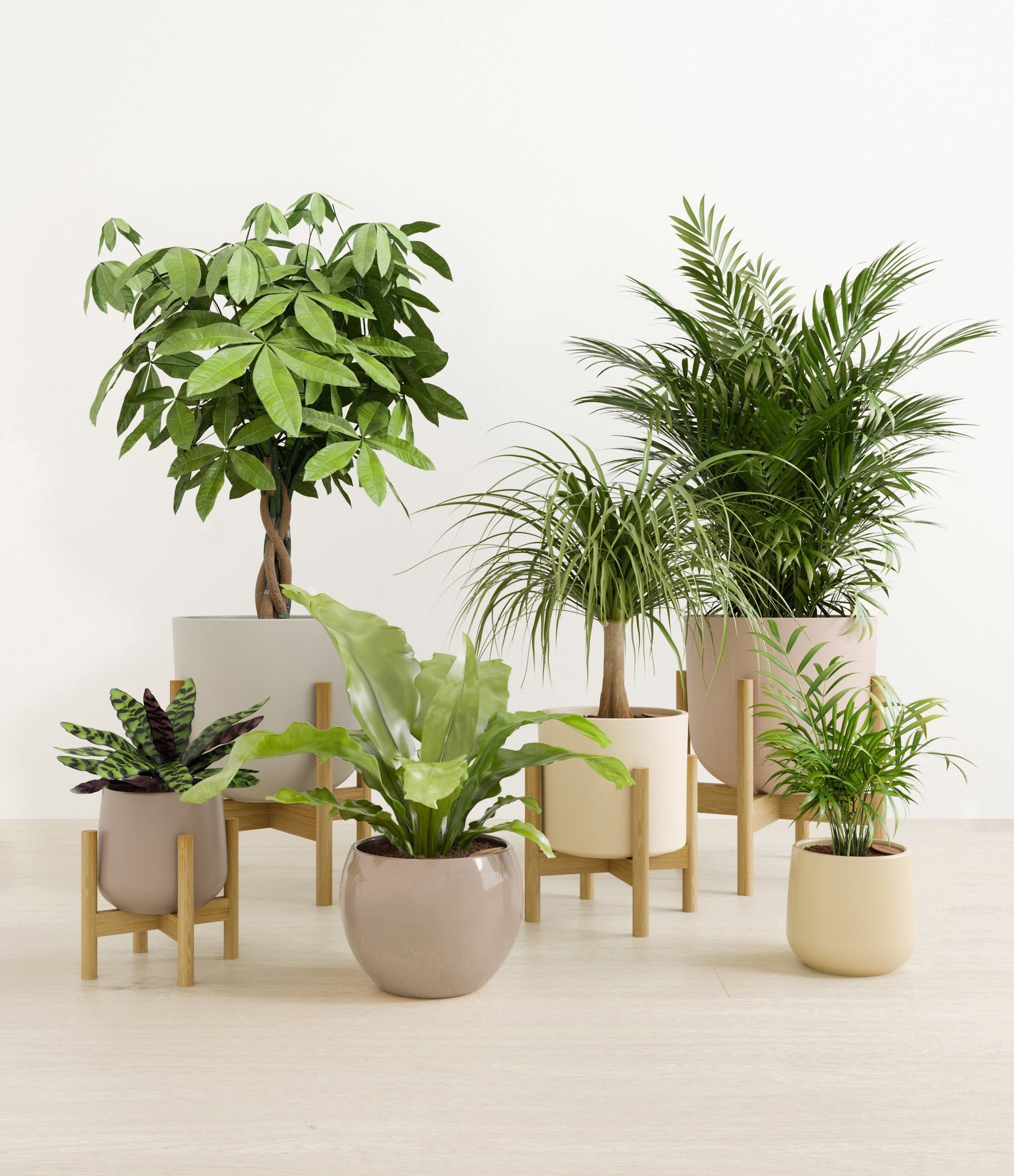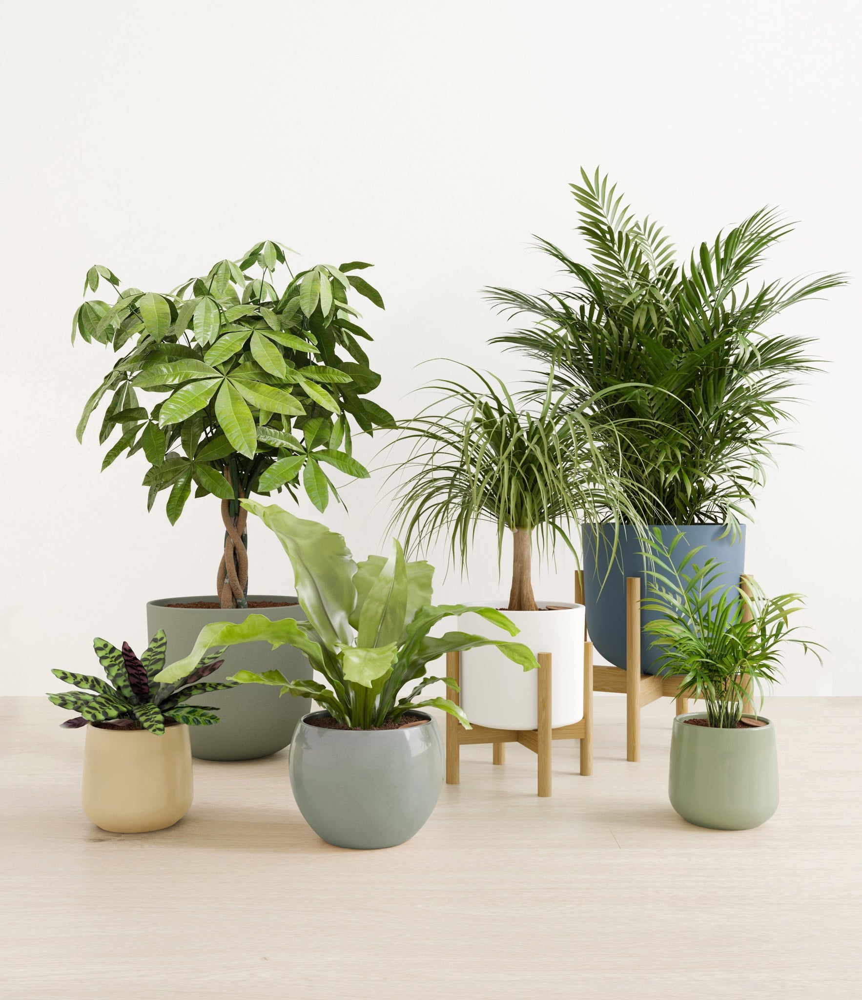 In this collection, you’ll receive six elegant, pet-friendly houseplants that make any indoor space a natural sanctuary. This set includes a small Rattlesnake Calathea – wearing an eccentric reptilian pattern on its leaves; a small and large Parlor Palms requiring little light to deliver absolute radiance; a medium Birds’ Nest Fern bursting with bright green, wavy fronds in a fluttering rosette; a medium Ponytail Palm - a resilient succulent with a flowing mane of leaves; and a large Money Tree with leaves and a trunk symbolizing good fortune and prosperity.
