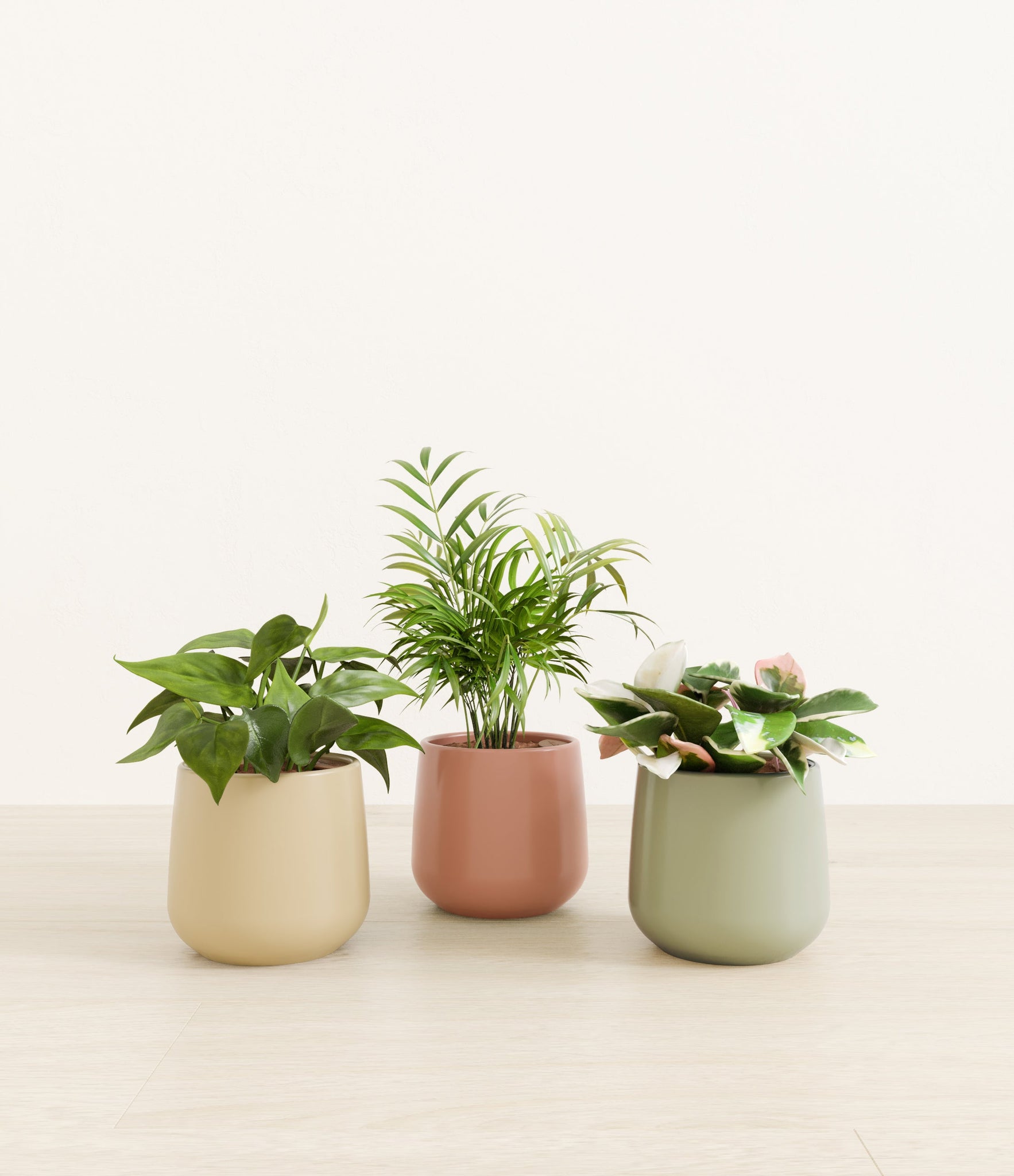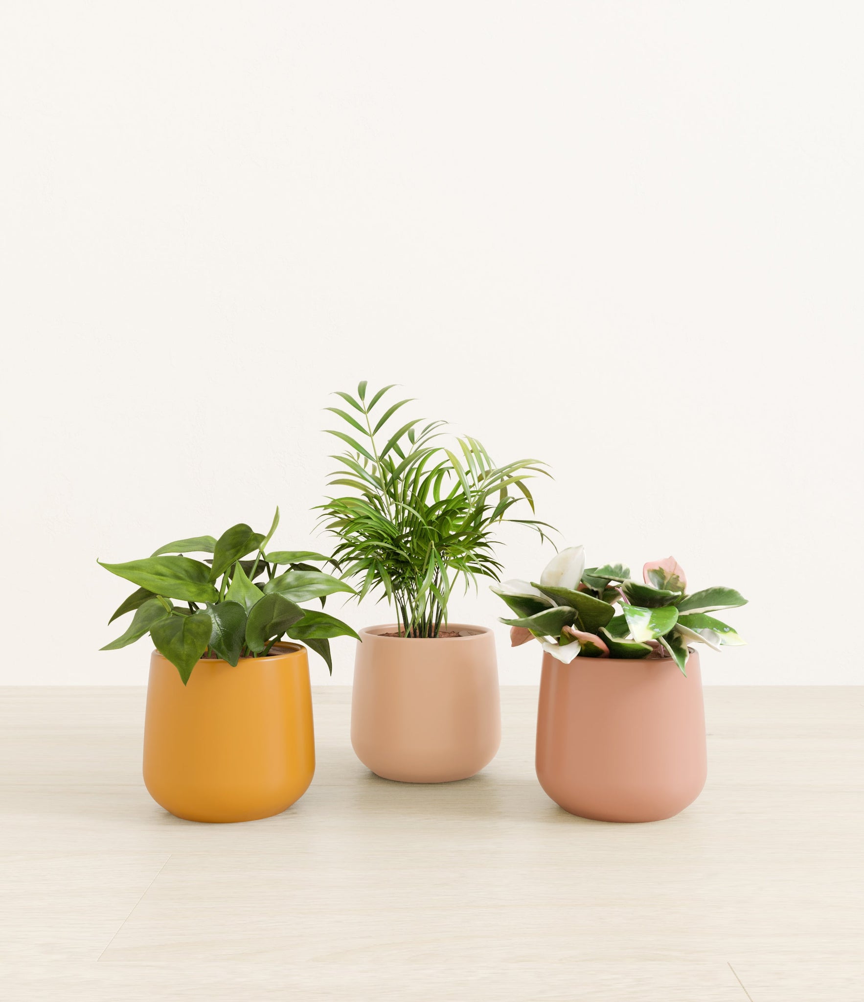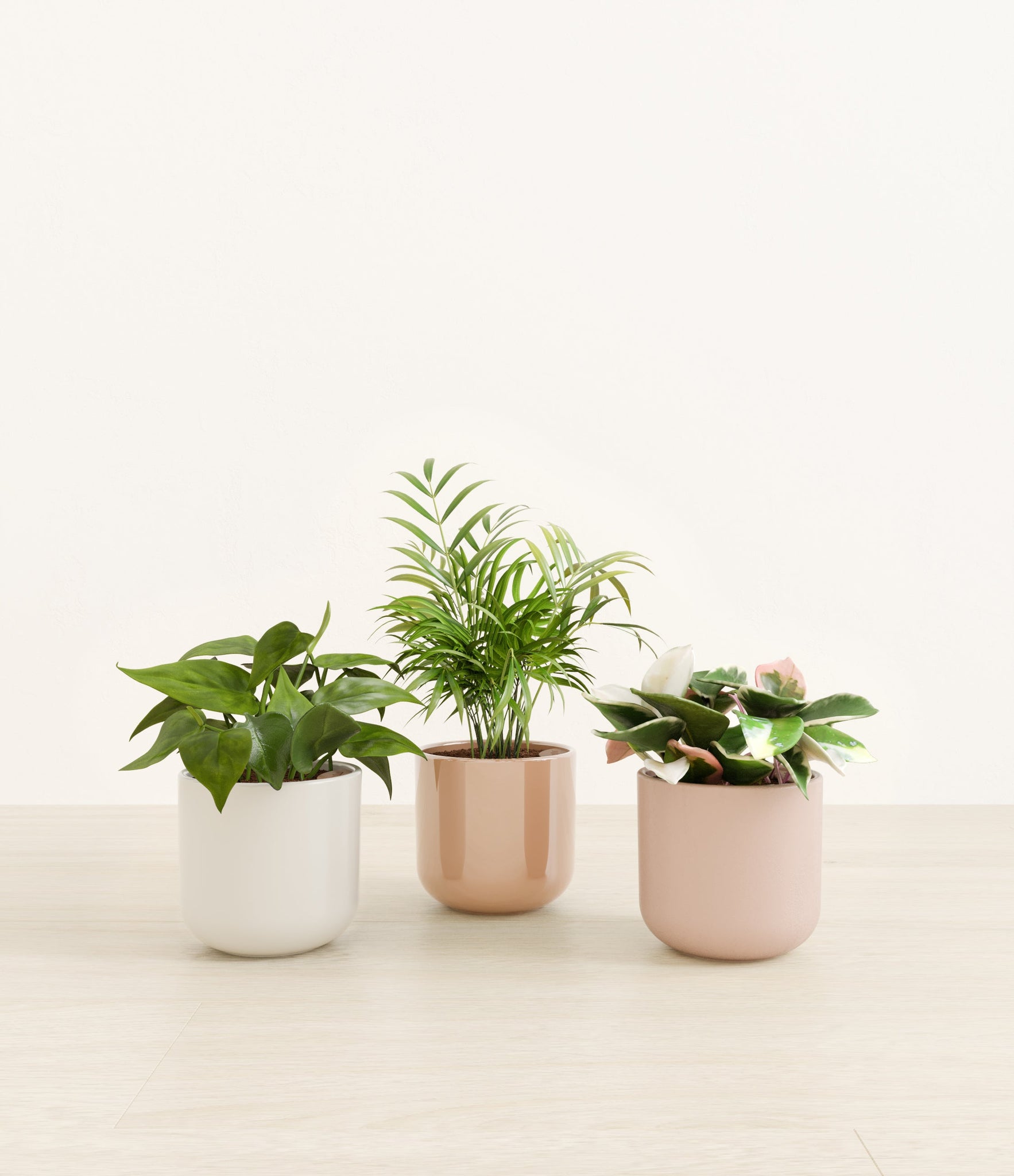 In this beautiful collection, you'll receive a carefully curated set of three small houseplants that instantly add a sense of joy and gratitude to any space. The assortment includes a Heartleaf Philodendron with glossy, vibrant heart-shaped foliage; a Hoya Tri-color, wearing variegations of pink and white on waxy, forest green leaves; and a Parlor Palm, known as the traditional centerpiece of the most impressive room in the house.