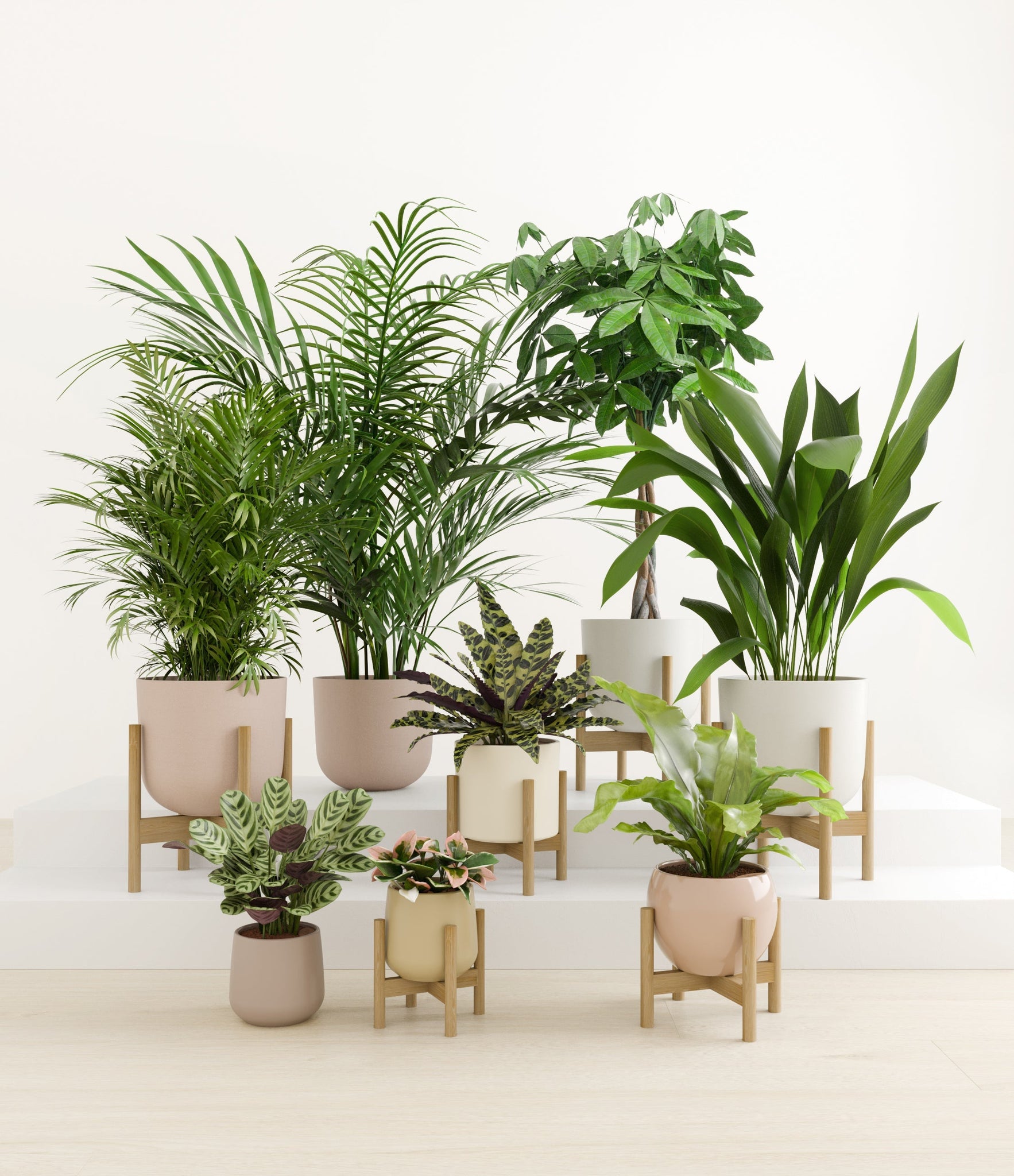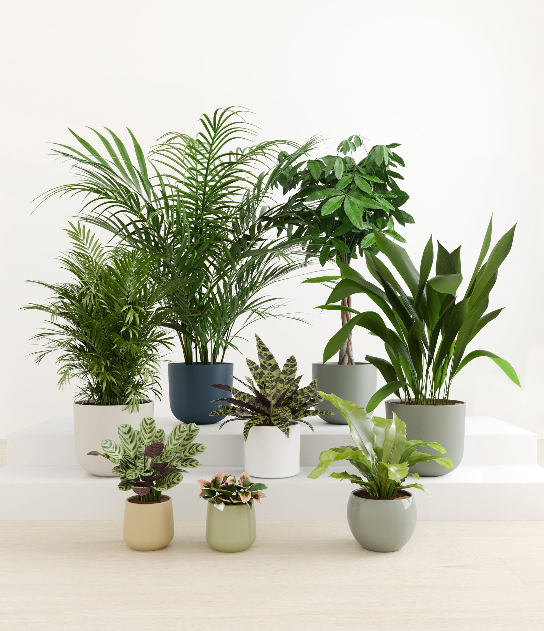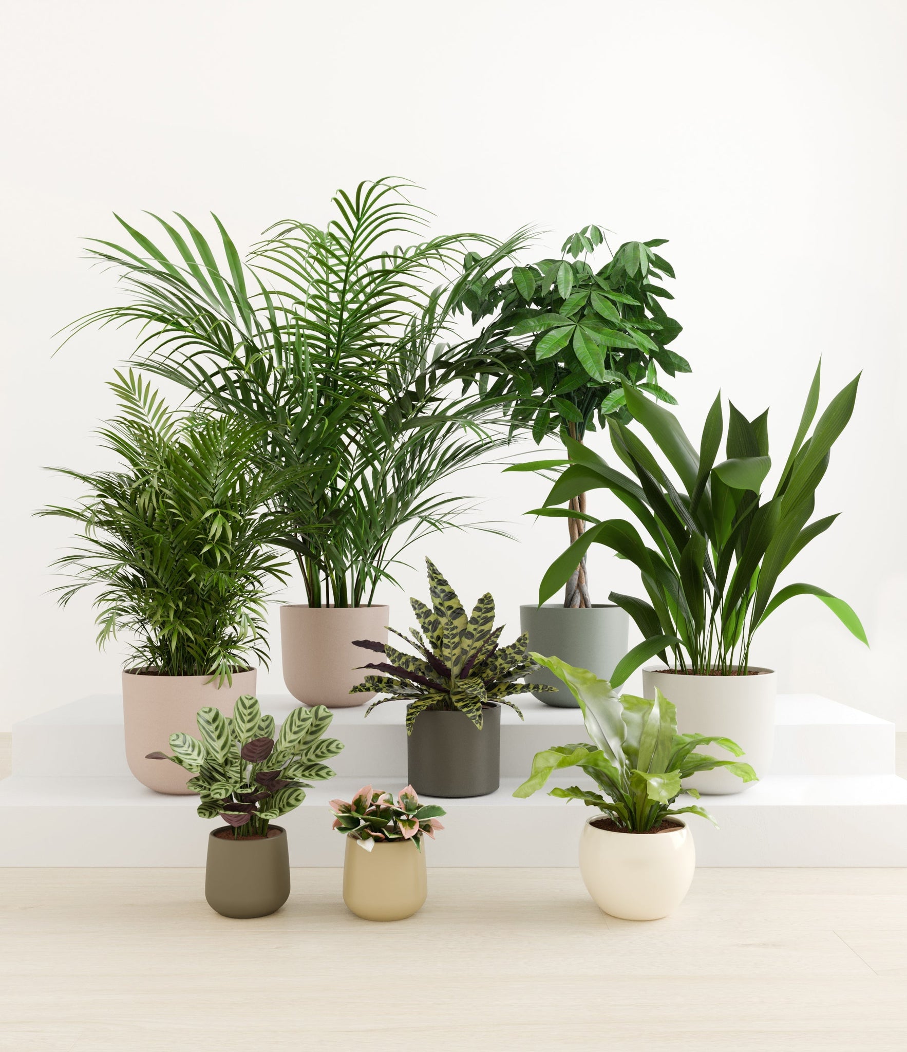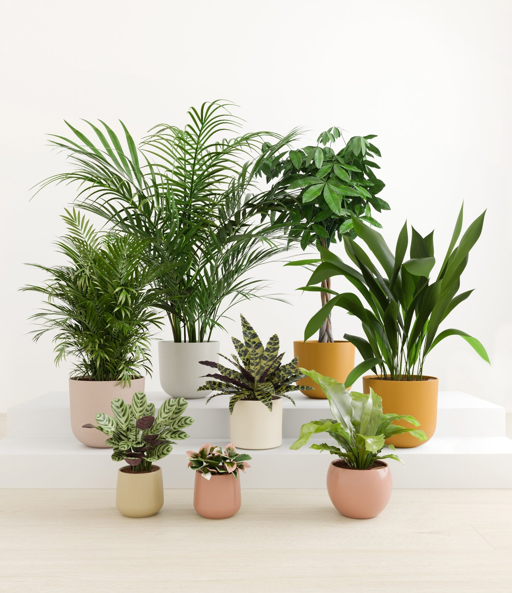 In this collection, you’ll receive eight tropical pet-friendly houseplants that make any space feel like a serene indoor jungle. The set includes a small Marxii Calathea, displaying intricate rippling foliage; a small Hoya Tricolor, with marvelous variegations of pink and white on deep green leaves; a medium Bird’s Nest Fern, bursting with bright green, wavy fronds; and a medium Rattlesnake Calathea, wearing its signature reptilian pattern. For the large plants, you'll receive a Cast Iron Plant, known for its incredible resilience, and a large Parlor Palm, offering a timeless touch of greenery. For the grand statement pieces, you'll enjoy a huge Money Tree, symbolizing good fortune and prosperity, and a huge Areca Palm, adding a dash of tropical elegance.