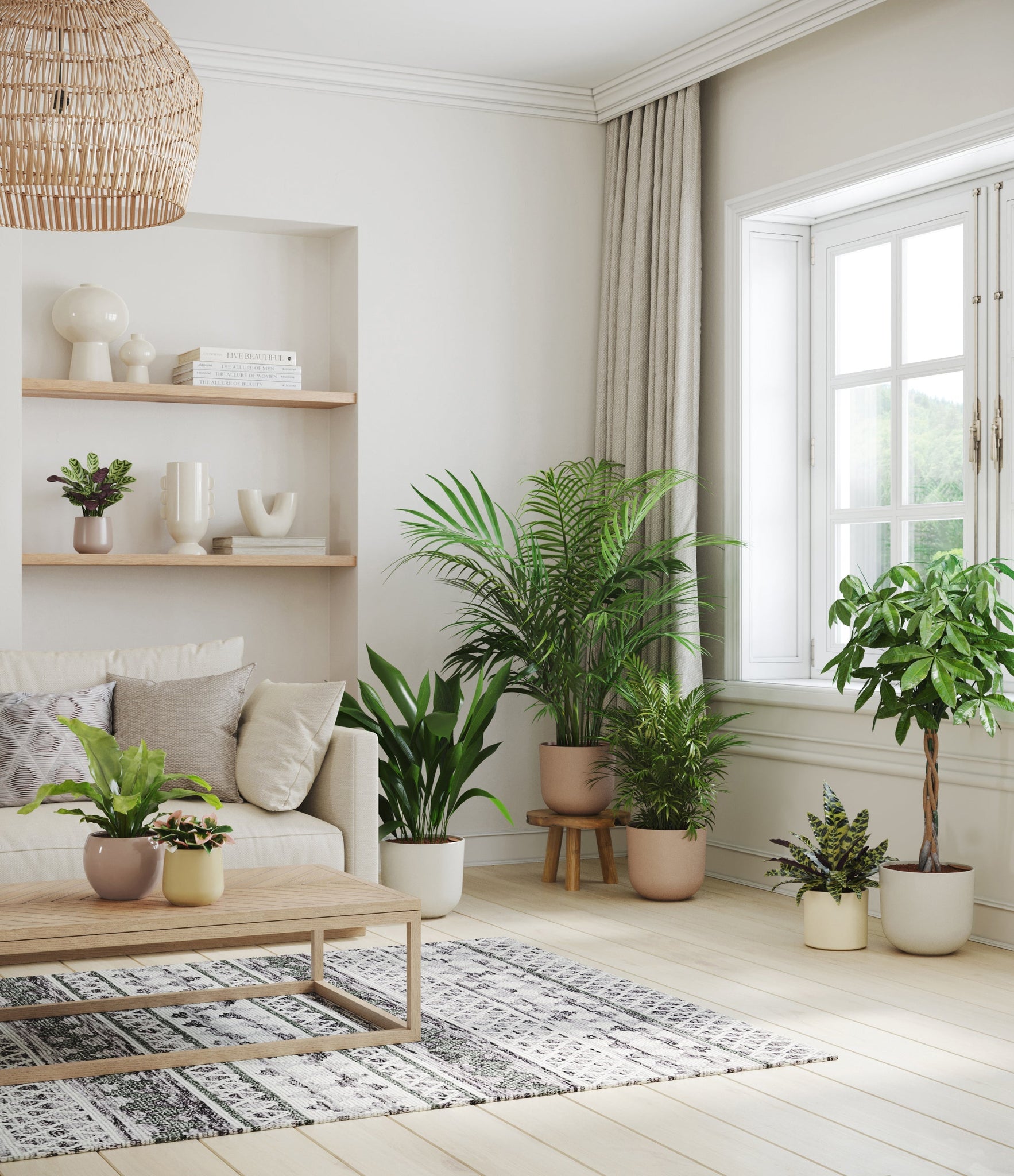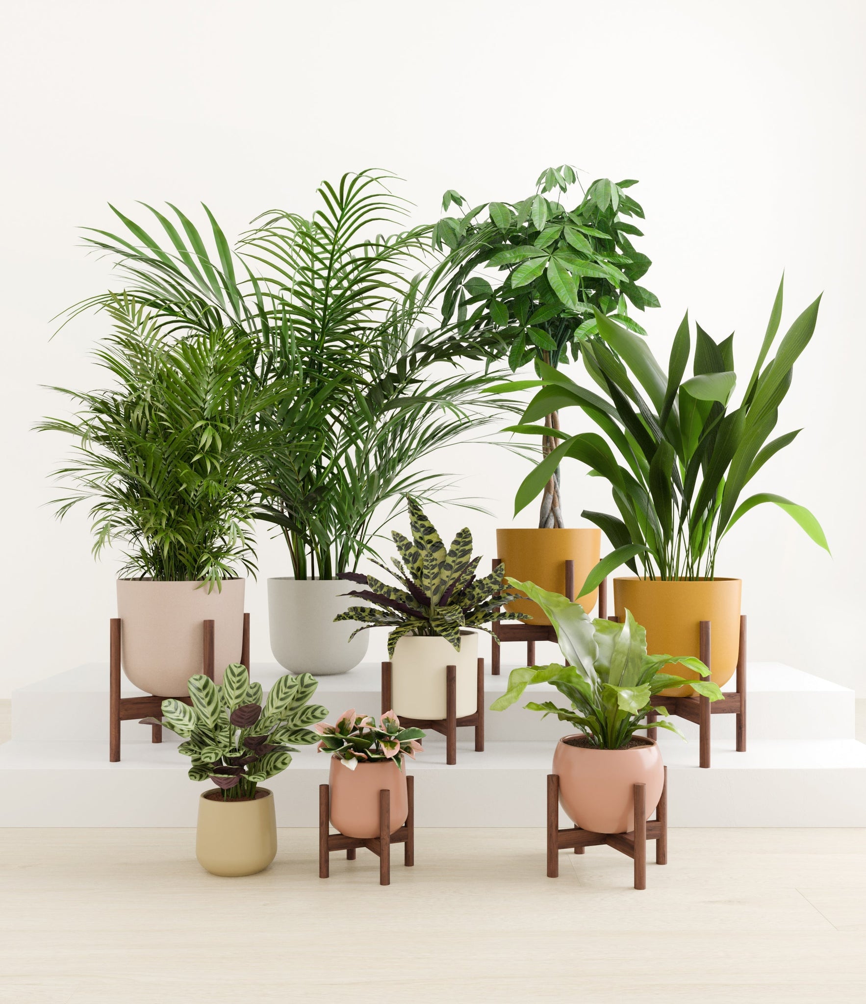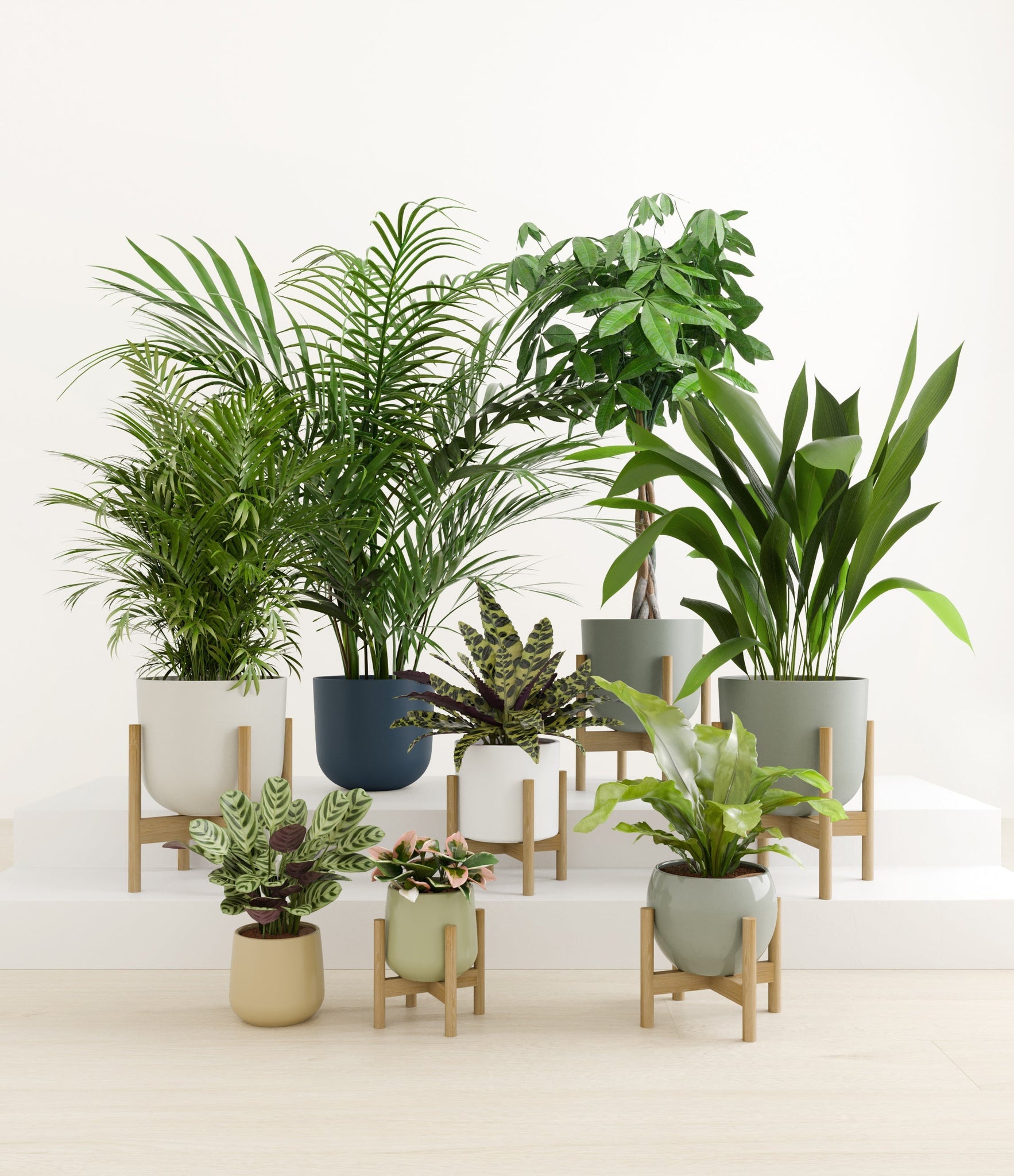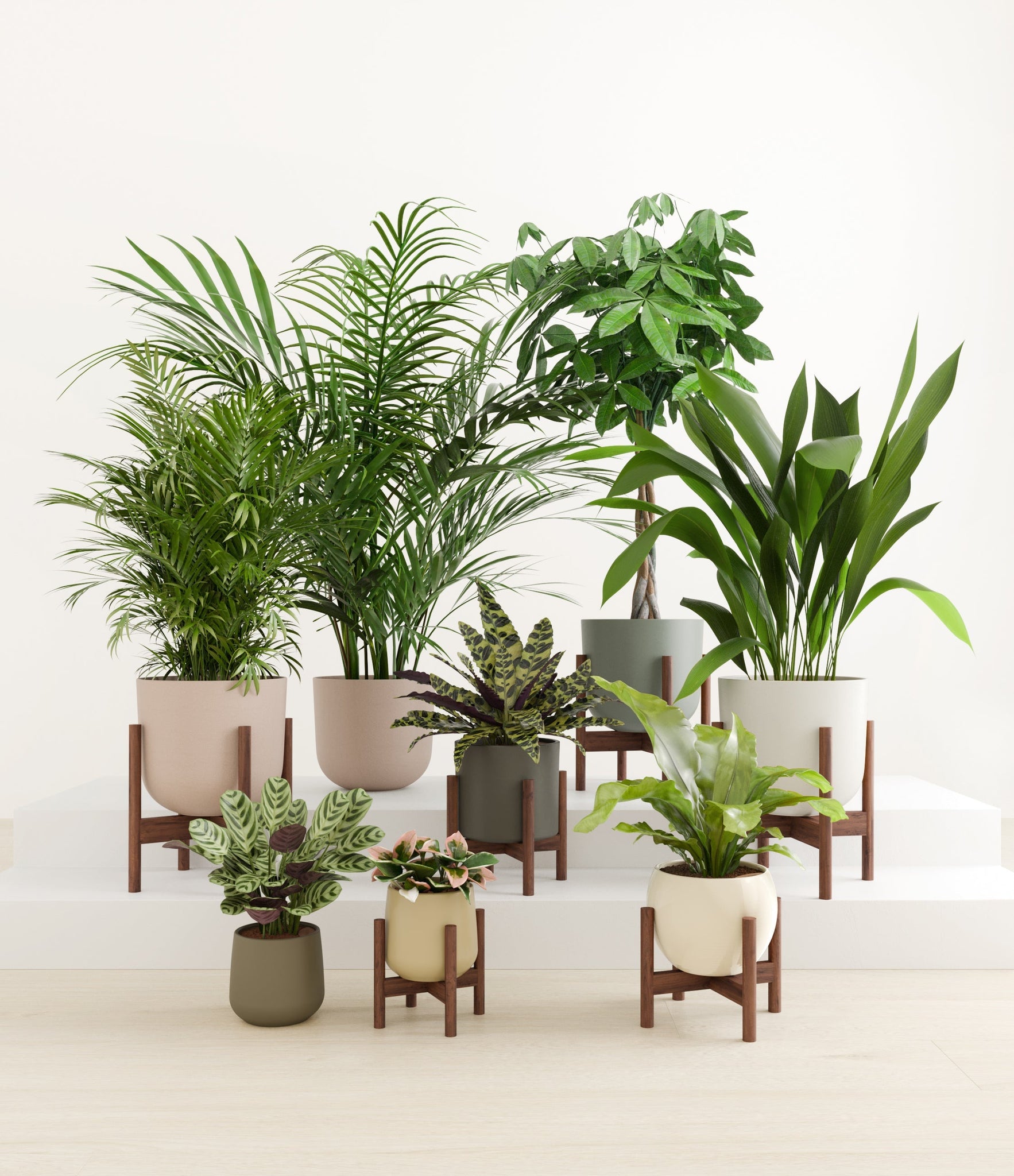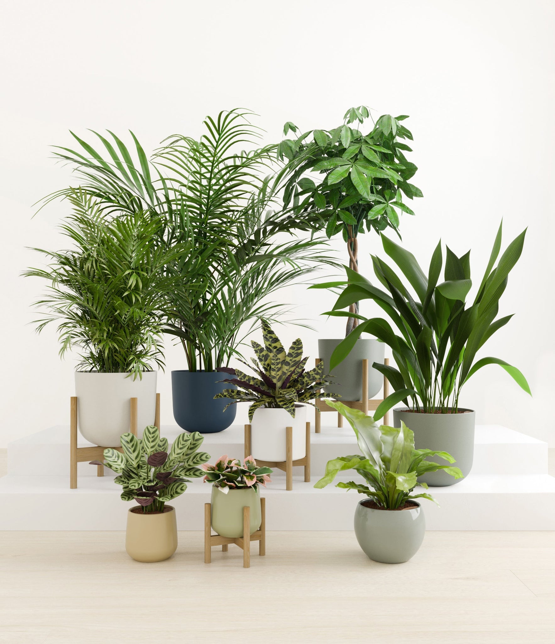 In this collection, you’ll receive eight tropical pet-friendly houseplants that make any space feel like a serene indoor jungle. The set includes a small Marxii Calathea, displaying intricate rippling foliage; a small Hoya Tricolor, with marvelous variegations of pink and white on deep green leaves; a medium Bird’s Nest Fern, bursting with bright green, wavy fronds; and a medium Rattlesnake Calathea, wearing its signature reptilian pattern. For the large plants, you'll receive a Cast Iron Plant, known for its incredible resilience, and a large Parlor Palm, offering a timeless touch of greenery. For the grand statement pieces, you'll enjoy a huge Money Tree, symbolizing good fortune and prosperity, and a huge Areca Palm, adding a dash of tropical elegance.
