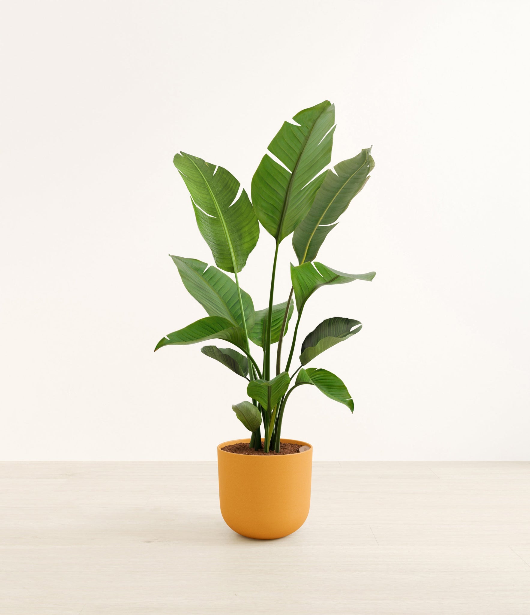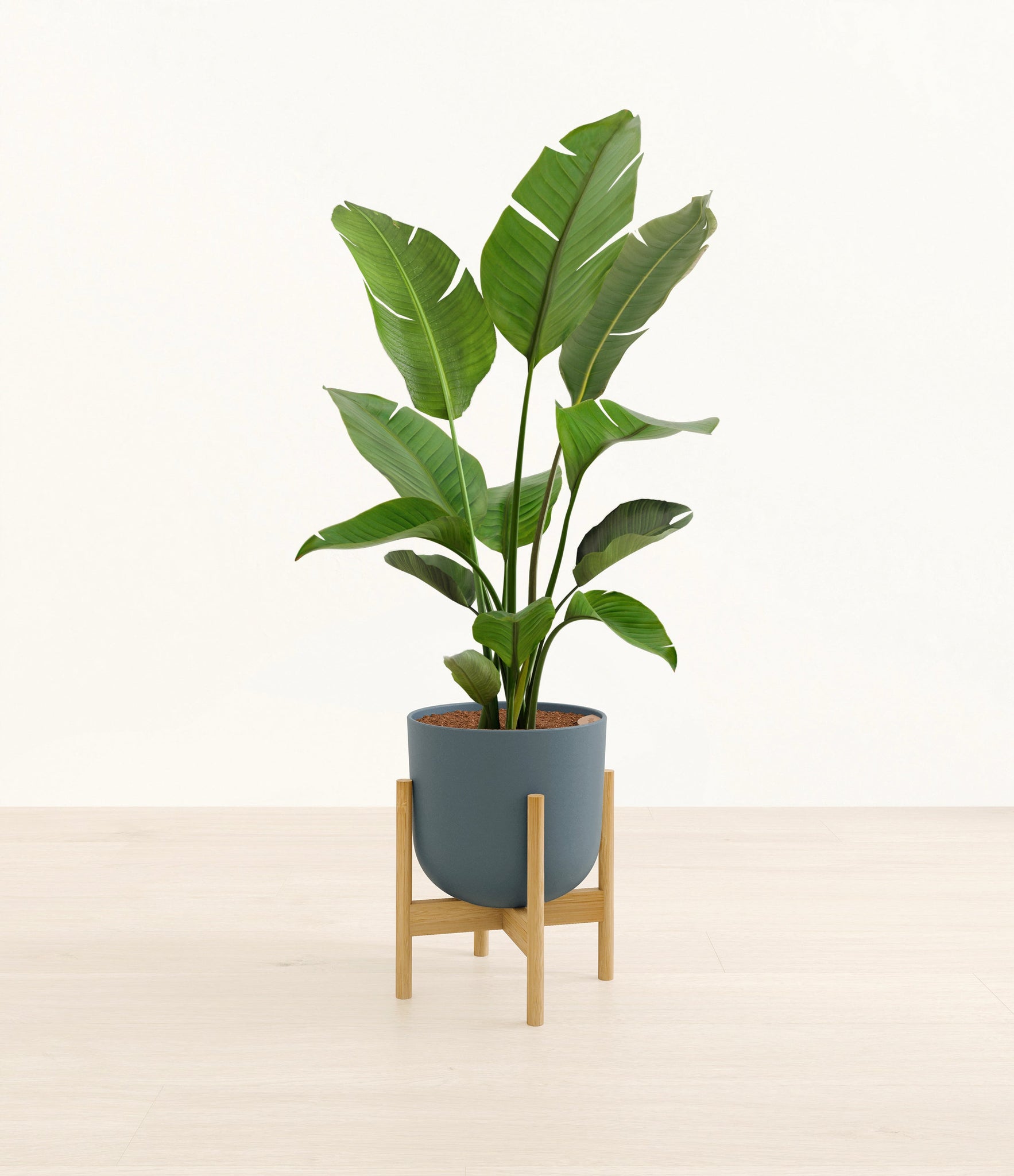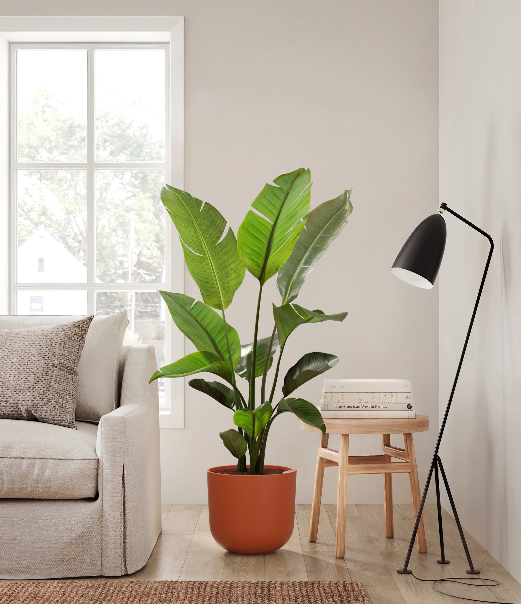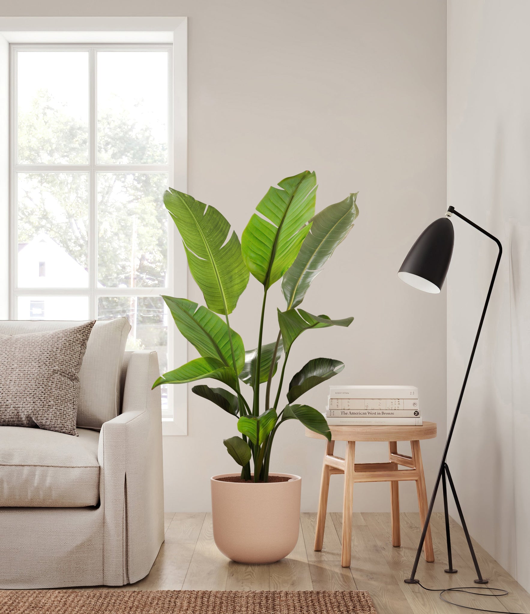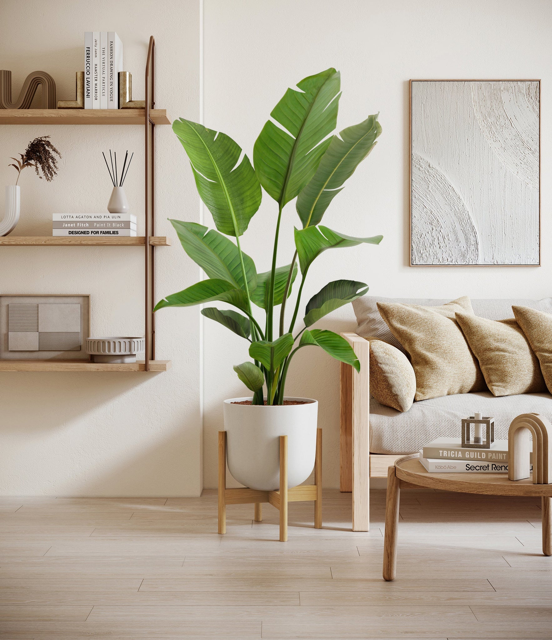 Native to tropical South Africa, White Bird of Paradise graces our spaces while towering to great heights.Playfully hanging like birds in flight, its long and broad leaves naturally split so to allow wind to pass through in the wild. A royal plant if there ever was one, it received its scientific name, Strelitzia nicolai, from Her Highness Queen Charlotte of Mecklenburg-Strelitz of England - lover of botany and the arts.