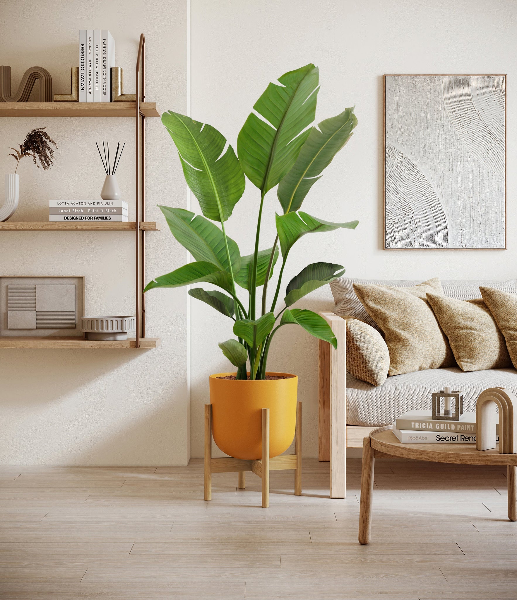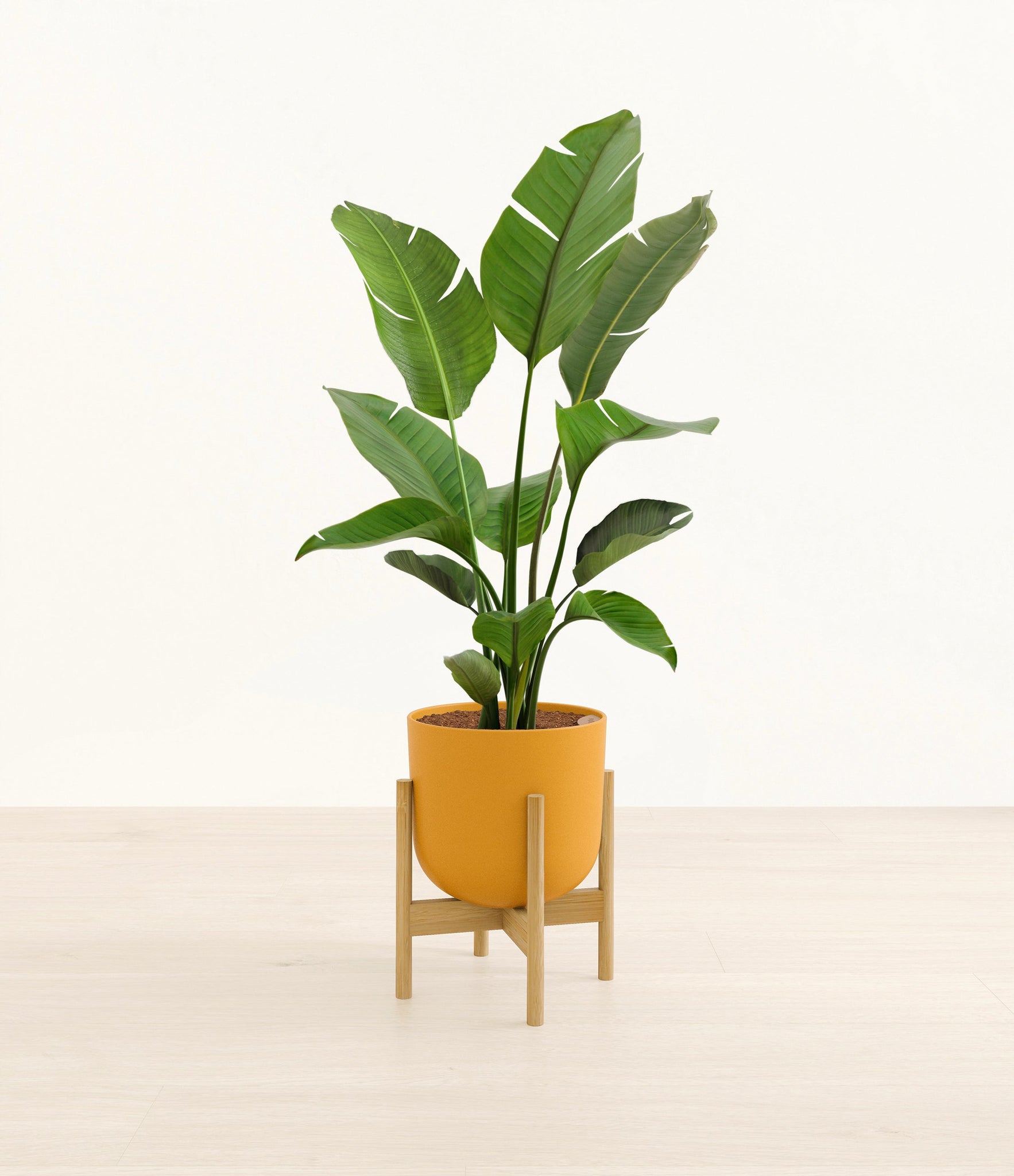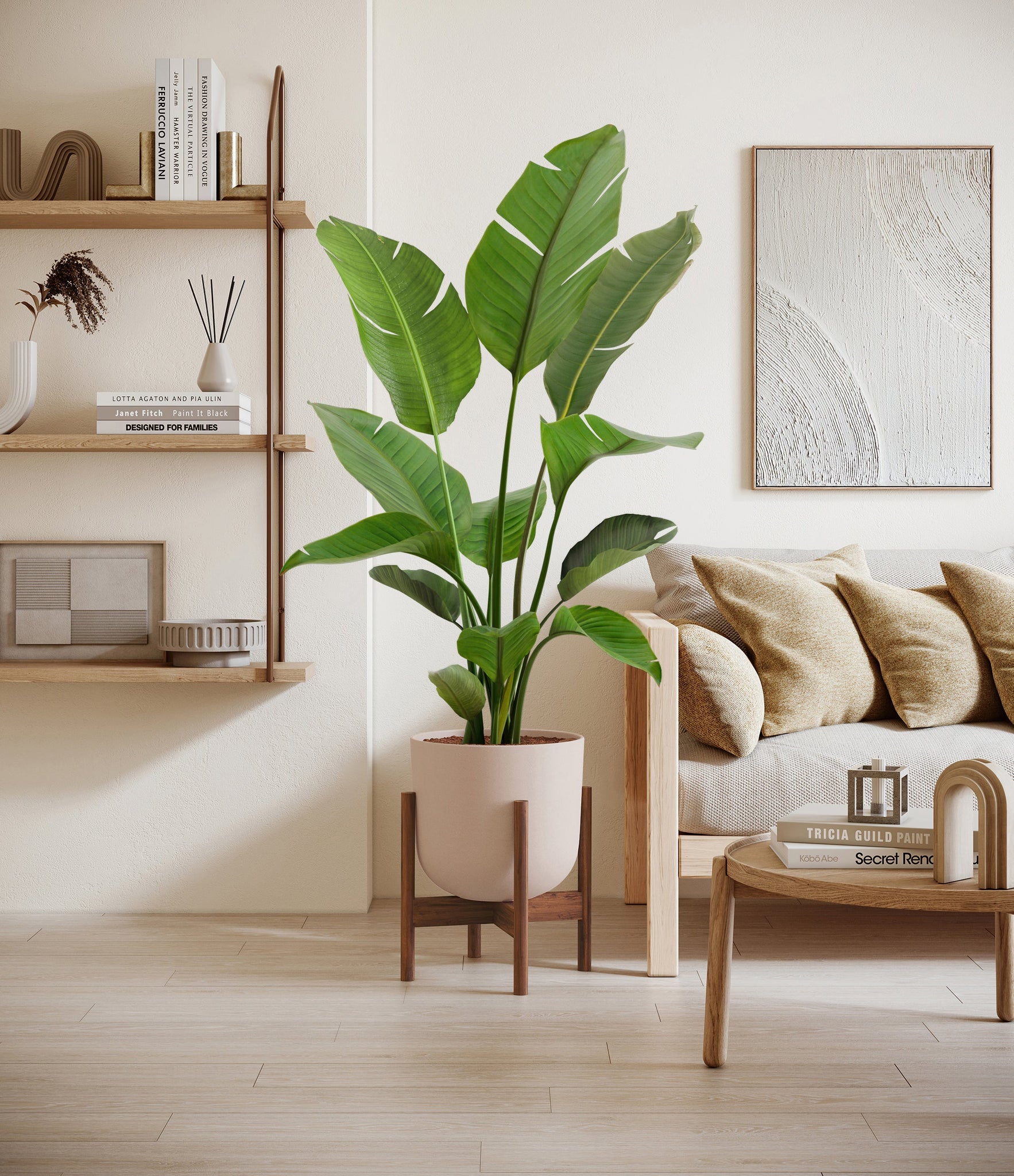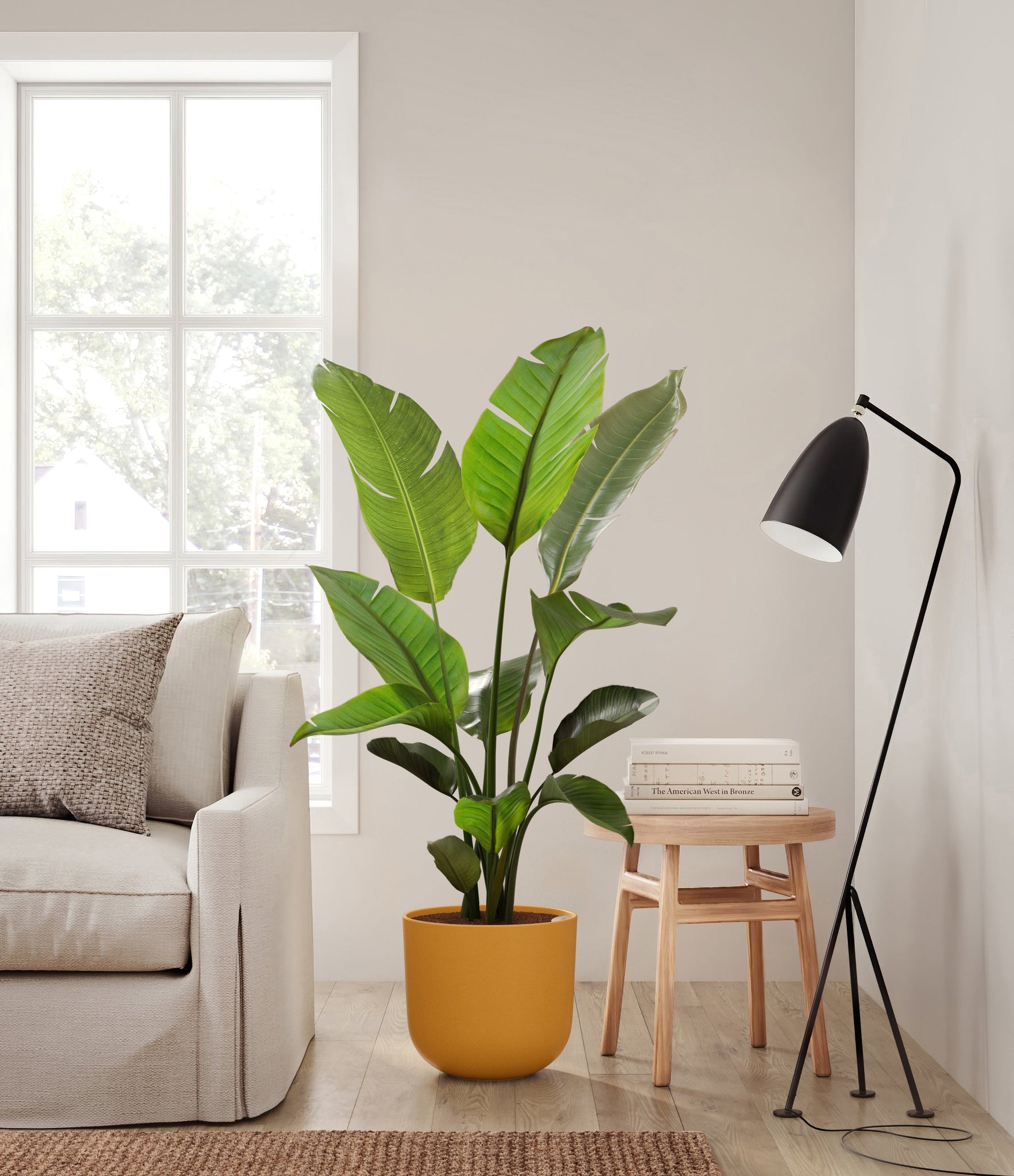 Native to tropical South Africa, White Bird of Paradise graces our spaces while towering to great heights.Playfully hanging like birds in flight, its long and broad leaves naturally split so to allow wind to pass through in the wild. A royal plant if there ever was one, it received its scientific name, Strelitzia nicolai, from Her Highness Queen Charlotte of Mecklenburg-Strelitz of England - lover of botany and the arts.