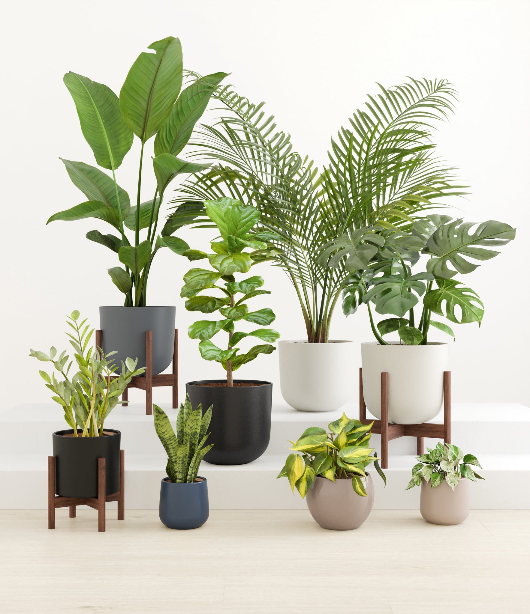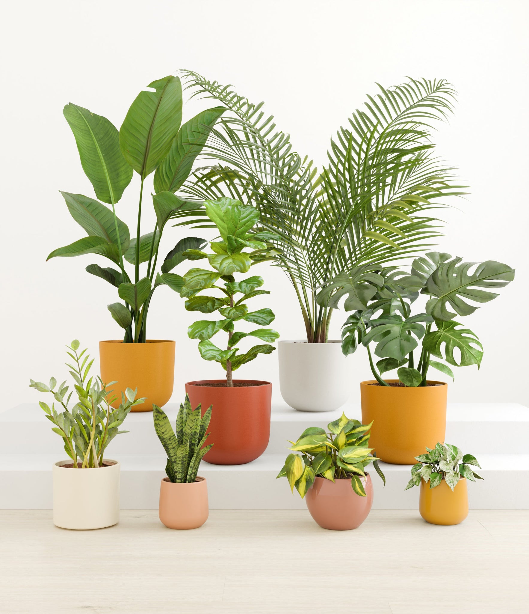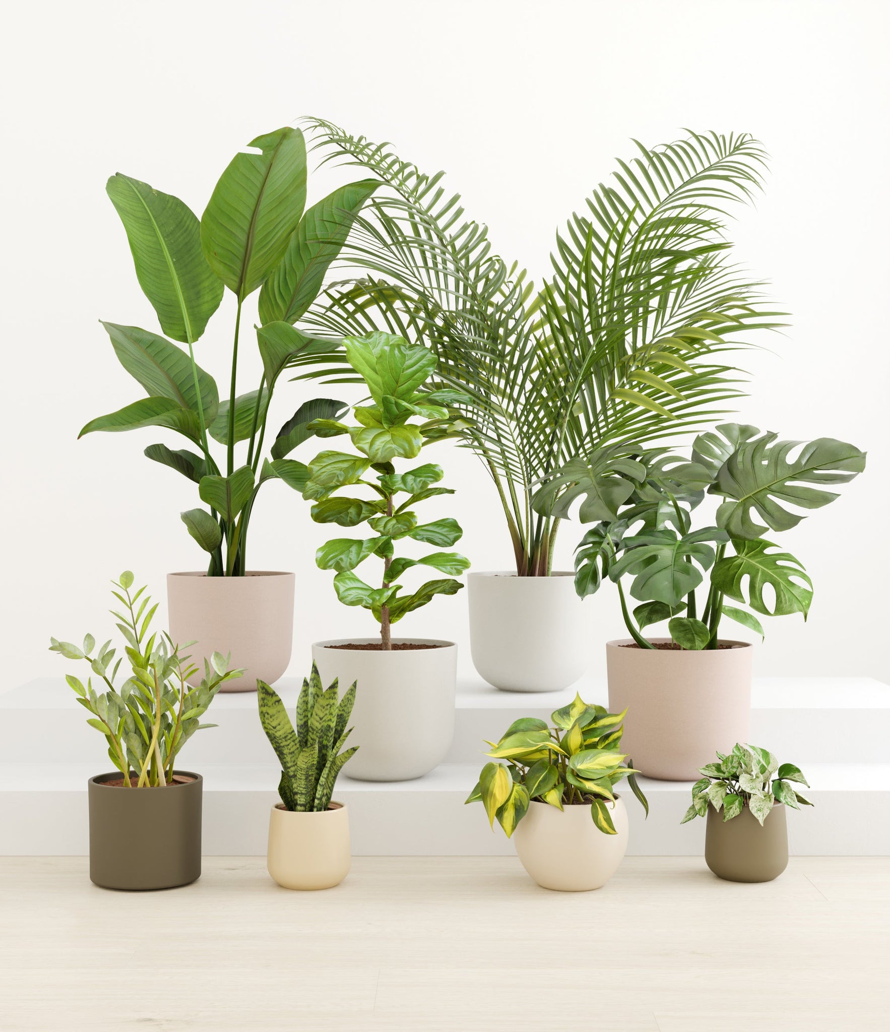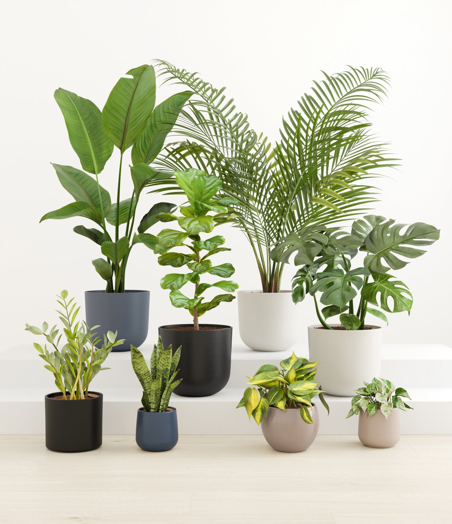 In this collection, you’ll receive eight houseplants that transform any space into a spectacular jungle. The set includes a small Marble Pothos patterned with marbled minty green; a small Green Snake Plant with mesmerizing swatches of silver and sage; a medium Philodendron Brazil with lime-colored variegation on heart-shaped foliage; a medium ZZ plant – which thrives under almost any condition, making it a favorite in every plant collection; a large Fiddle Leaf Fig Bush with massive and vibrant lyre-shaped leaves; a large Monstera Deliciosa with breathtaking foliage; a huge Majesty Palm with elegant fronds and graceful curves; and a huge White Bird of Paradise that playfully hangs like birds in flight.