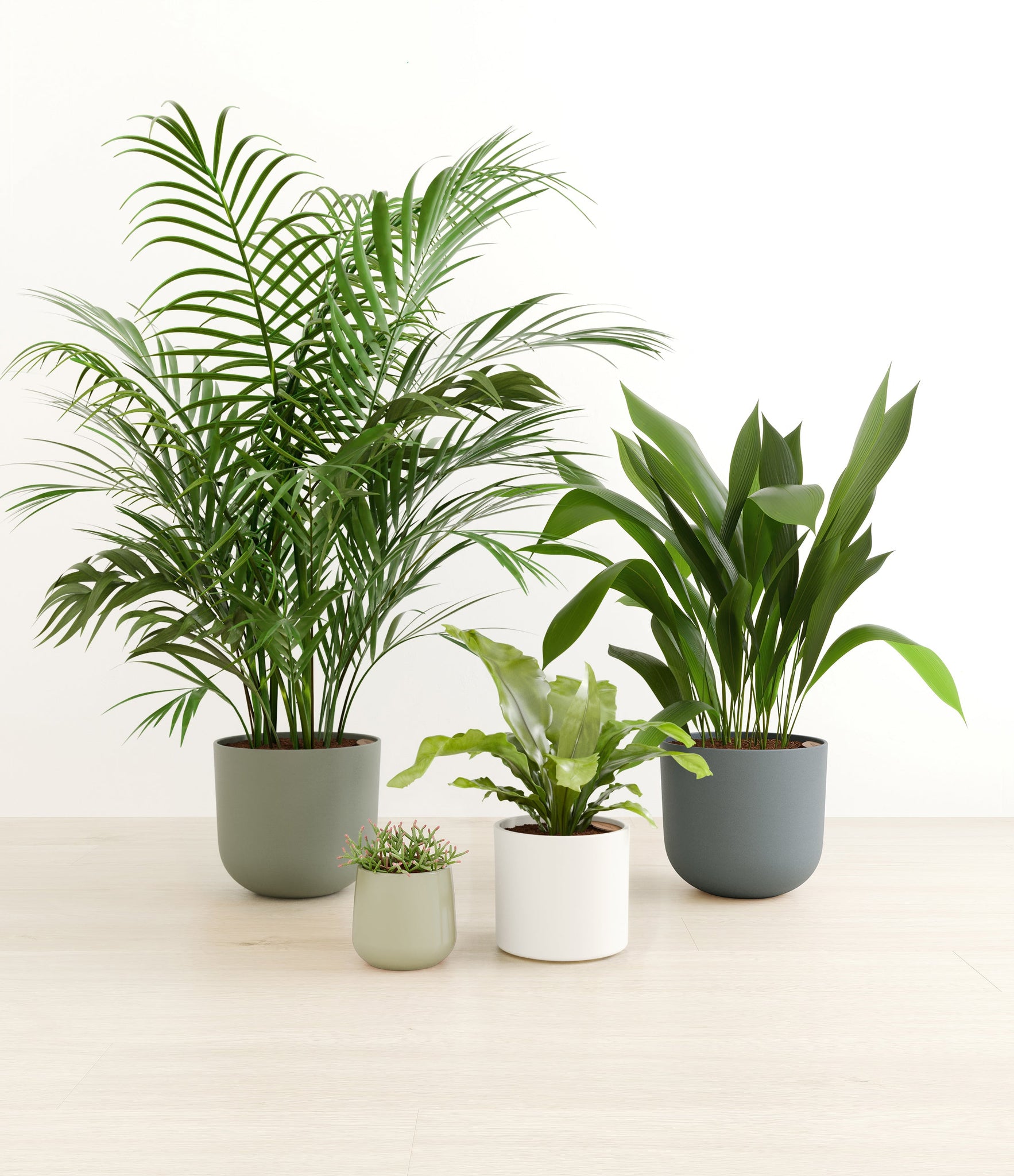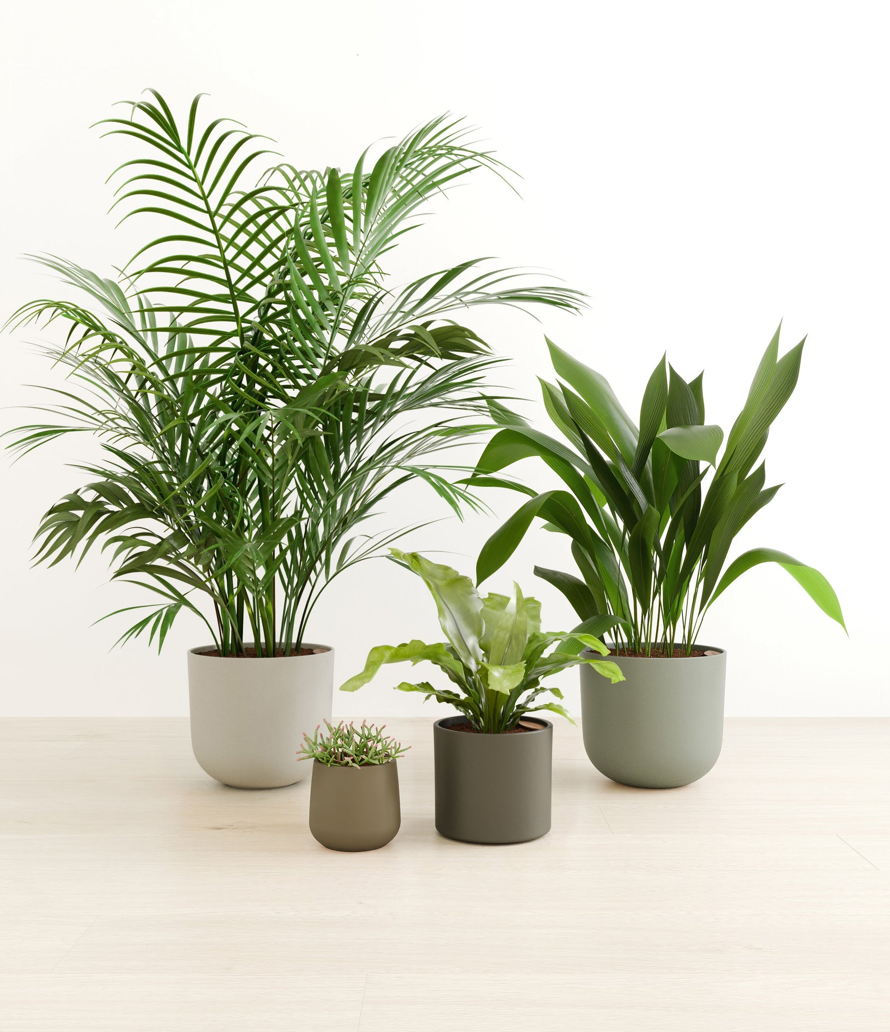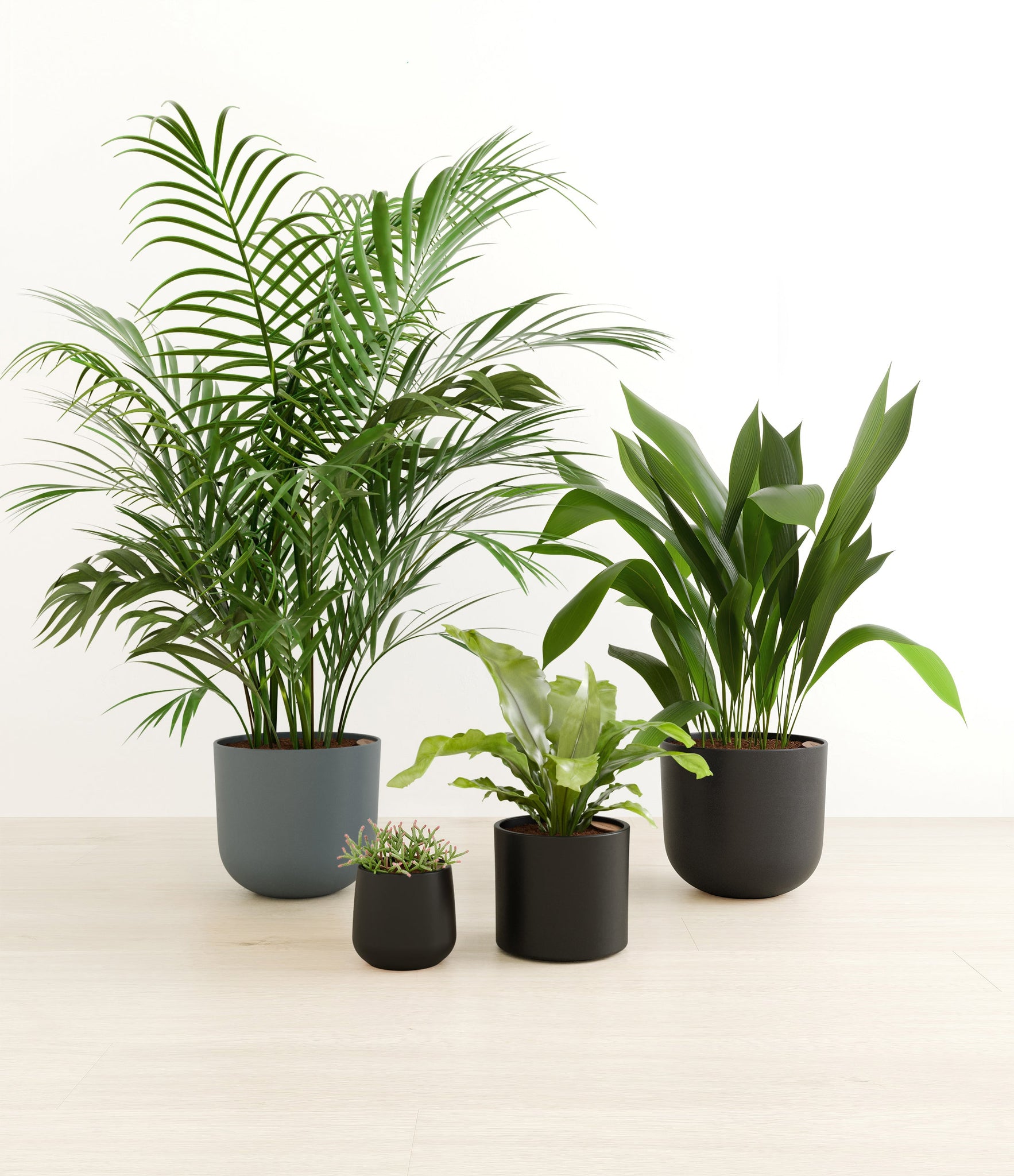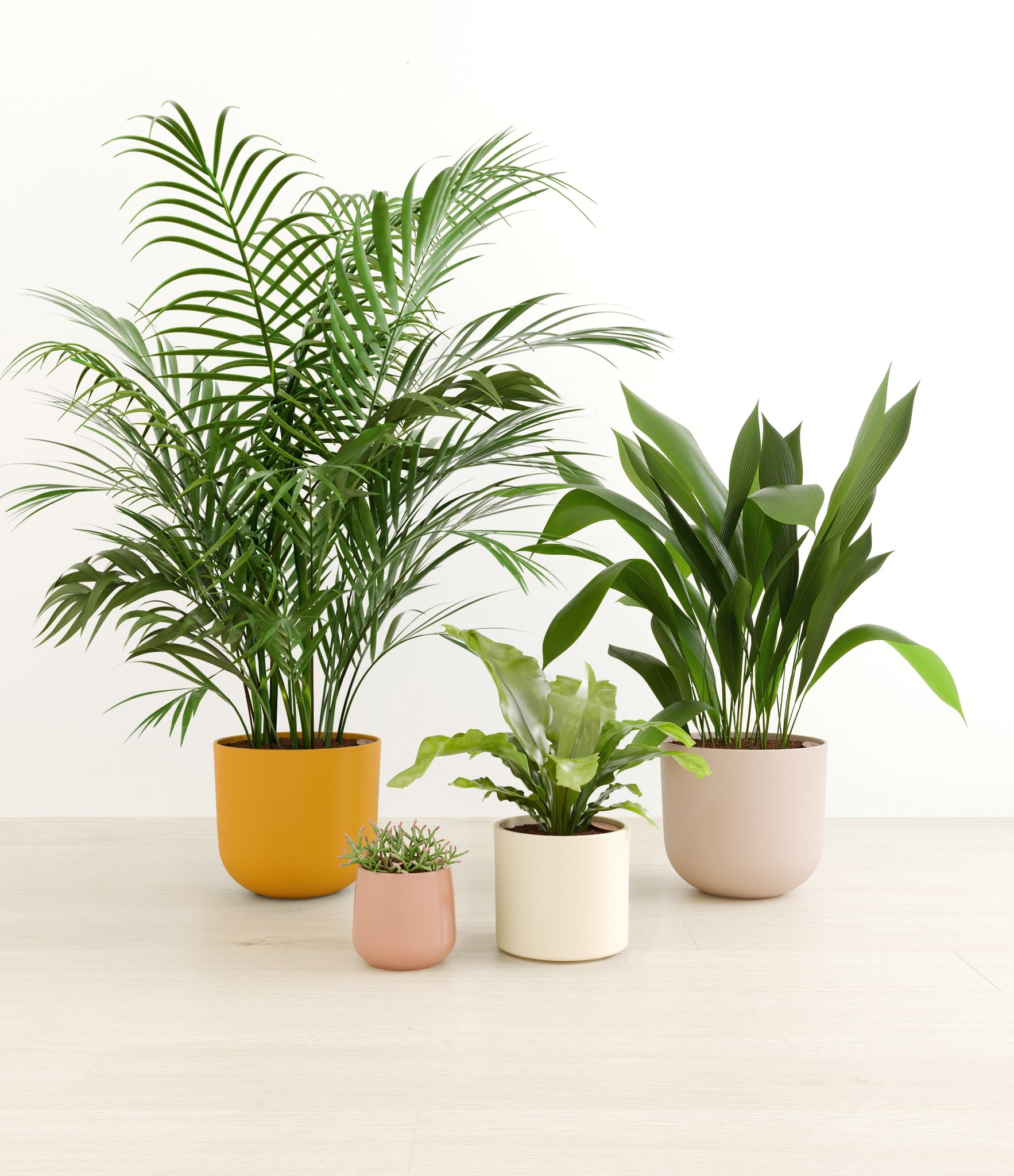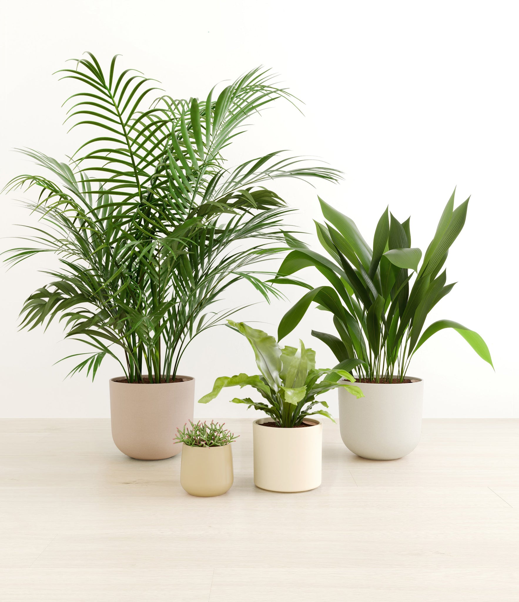 This collection brings together four easy-care houseplants that are both pet-friendly and low-light tolerant. The assortment includes a small Mistletoe Cactus – with its trailing bright green pencil-thin foliage that instantly livens any space; a medium Birds Nest Fern – its bright green, wavy fronds bring a touch of the wild indoors; a large Cast Iron Plant – a hardy and resilient plant that thrives in low-light conditions; and a huge Areca Palm – with its feathery, arching fronds that add an element of elegance to any room.