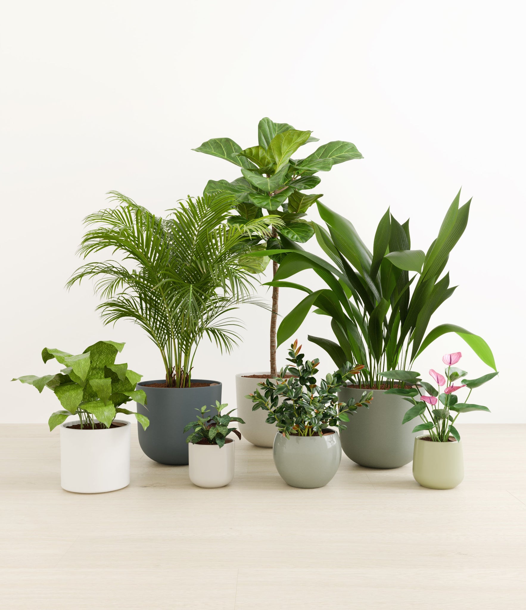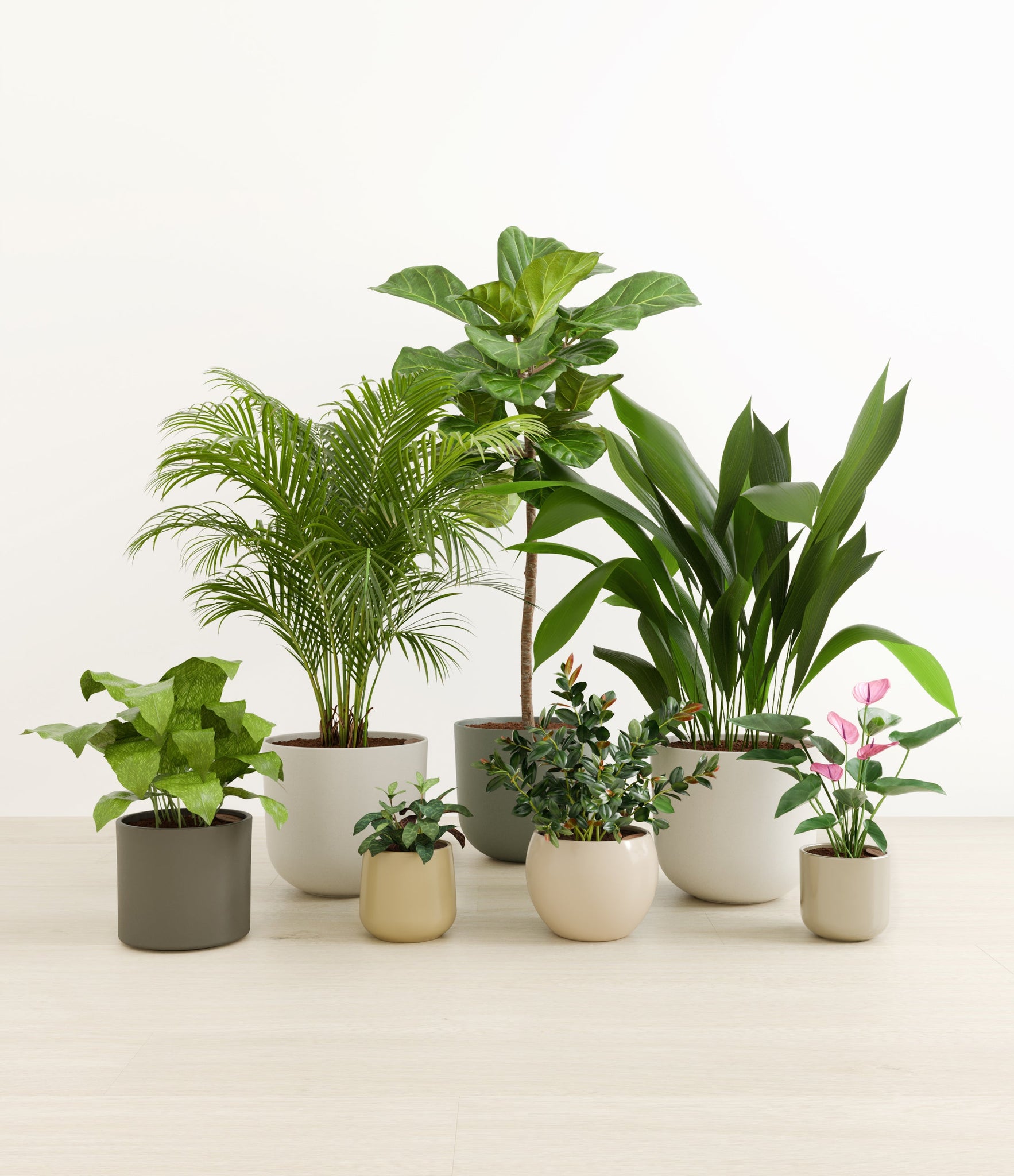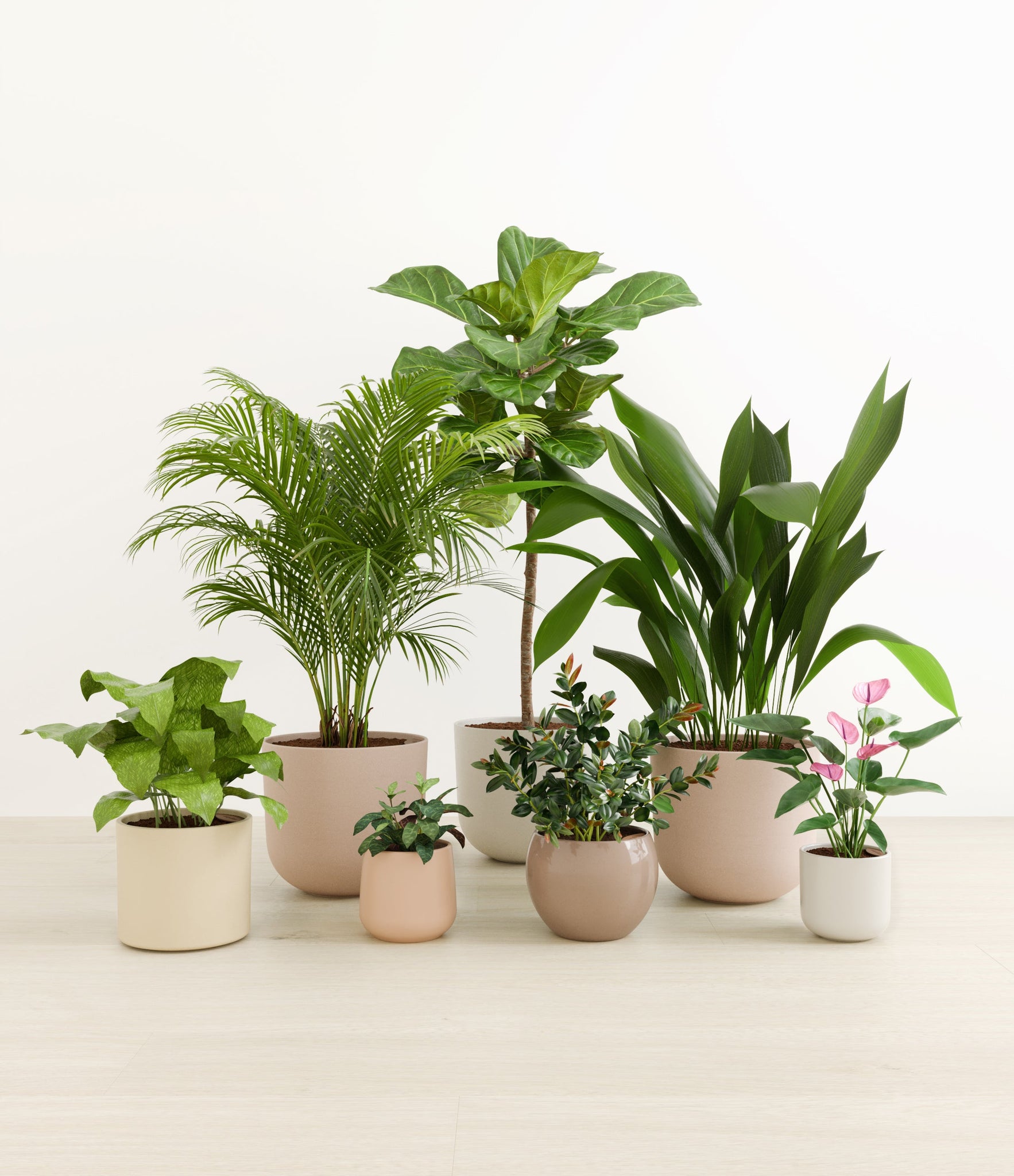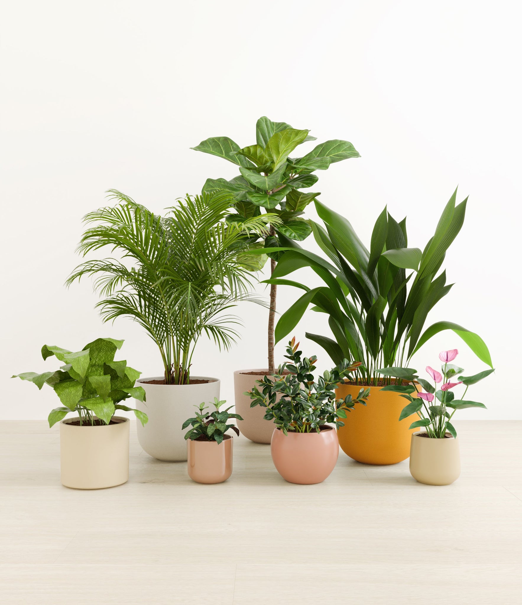 Embrace the essence of fall with 'Autumn Accents', a thoughtfully selected array of seven plants. In this collection, you'll receive seven distinctive, easy-to-care-for houseplants that each bring a unique aspect of autumn's charm to your indoor spaces. The set includes a small Black Pagoda Plant, whose darkly patterned leaves introduce a mysterious depth to the ensemble; a small Anthurium Purple, celebrated for its vibrant purple spathes that echo the rich tones of the season; a medium Calathea Network, known for its intricate leaf patterns; a medium Goldfish Plant, adored for its vibrant, playful blooms; a large Cast Iron Plant, prized for its robust and enduring foliage; a large Areca Palm, providing a dash of tropical elegance; and a majestic huge Fiddle Leaf Fig, offering dramatic, broad leaves. Together, these selections promise to transform any space with a burst of fall's best colors.