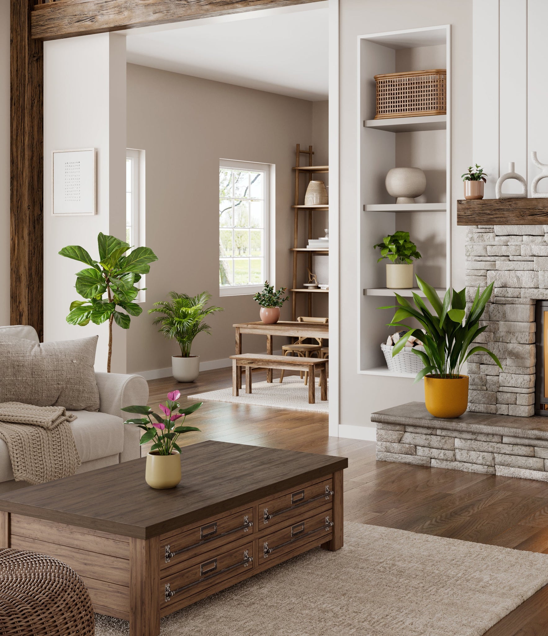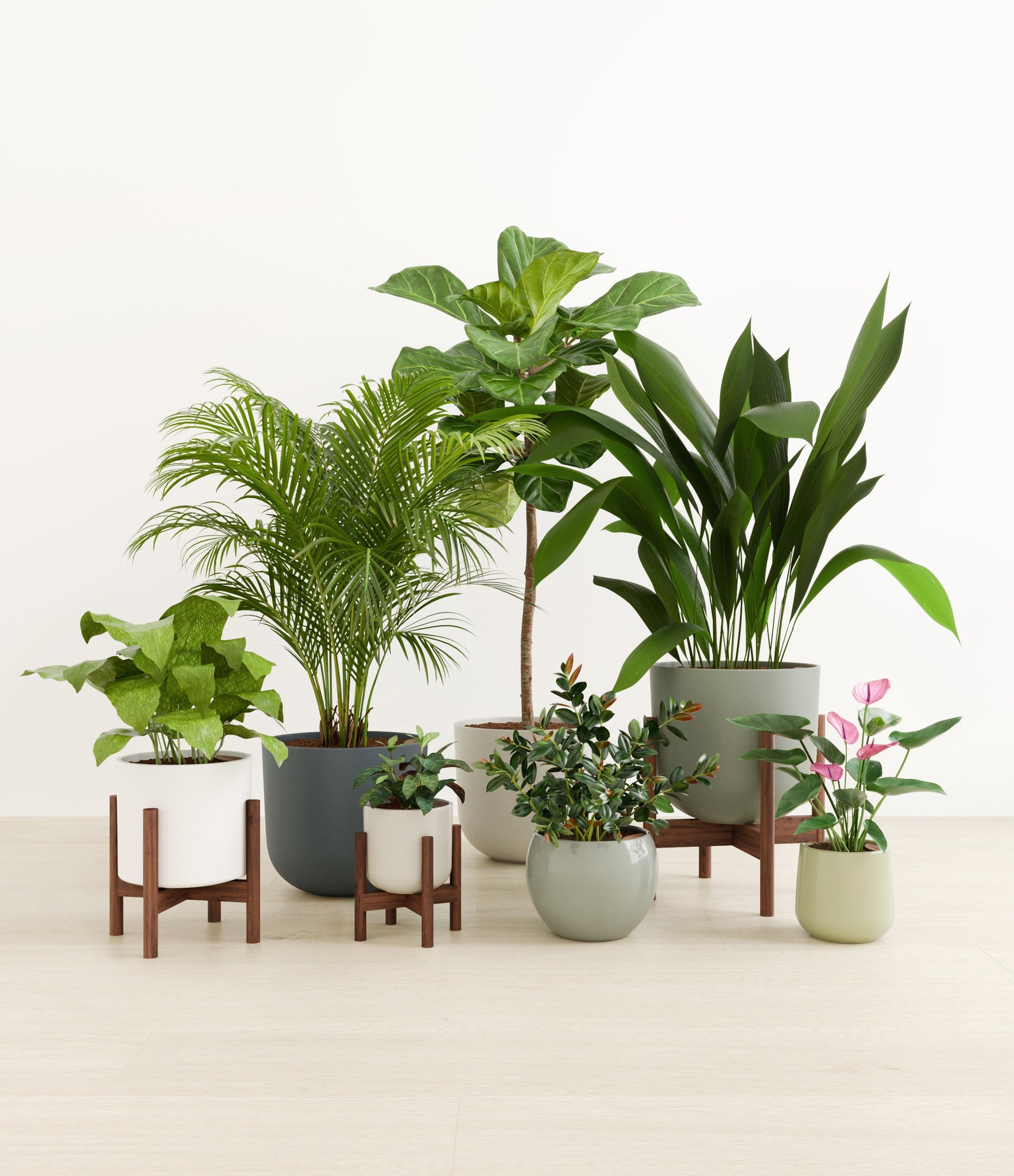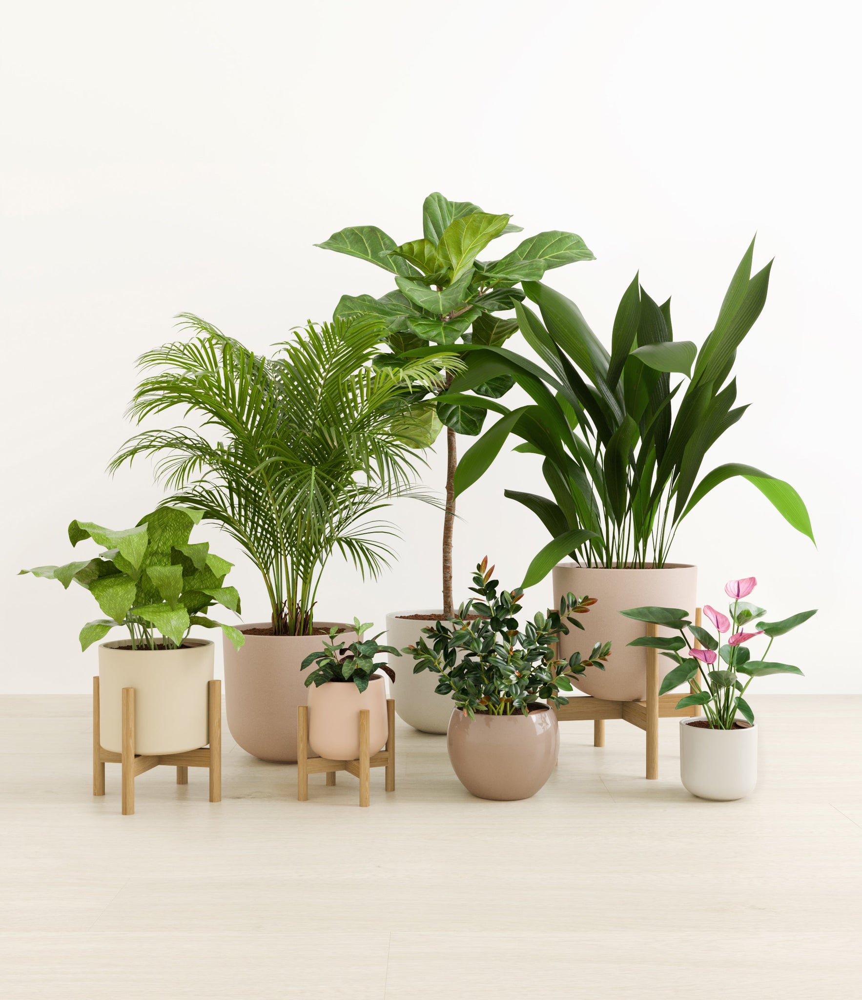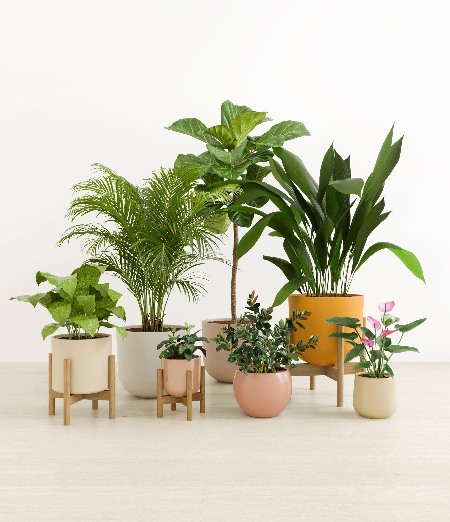 Embrace the essence of fall with 'Autumn Accents', a thoughtfully selected array of seven plants. In this collection, you'll receive seven distinctive, easy-to-care-for houseplants that each bring a unique aspect of autumn's charm to your indoor spaces. The set includes a small Black Pagoda Plant, whose darkly patterned leaves introduce a mysterious depth to the ensemble; a small Anthurium Purple, celebrated for its vibrant purple spathes that echo the rich tones of the season; a medium Calathea Network, known for its intricate leaf patterns; a medium Goldfish Plant, adored for its vibrant, playful blooms; a large Cast Iron Plant, prized for its robust and enduring foliage; a large Areca Palm, providing a dash of tropical elegance; and a majestic huge Fiddle Leaf Fig, offering dramatic, broad leaves. Together, these selections promise to transform any space with a burst of fall's best colors.